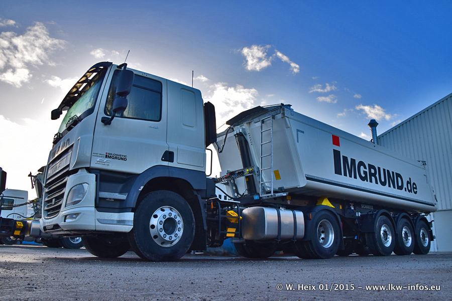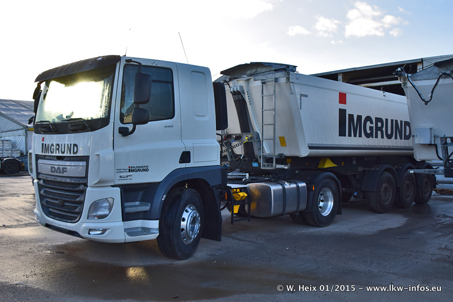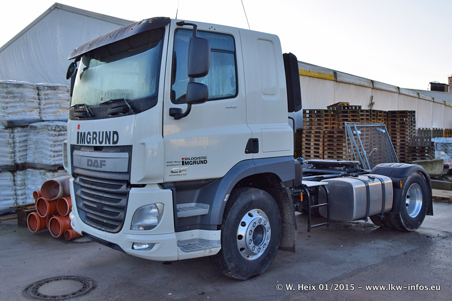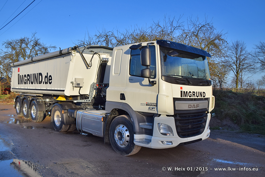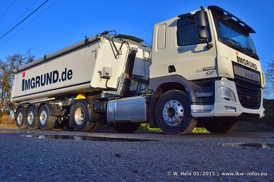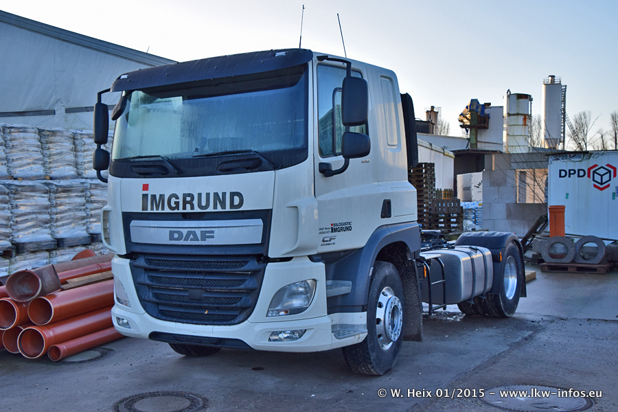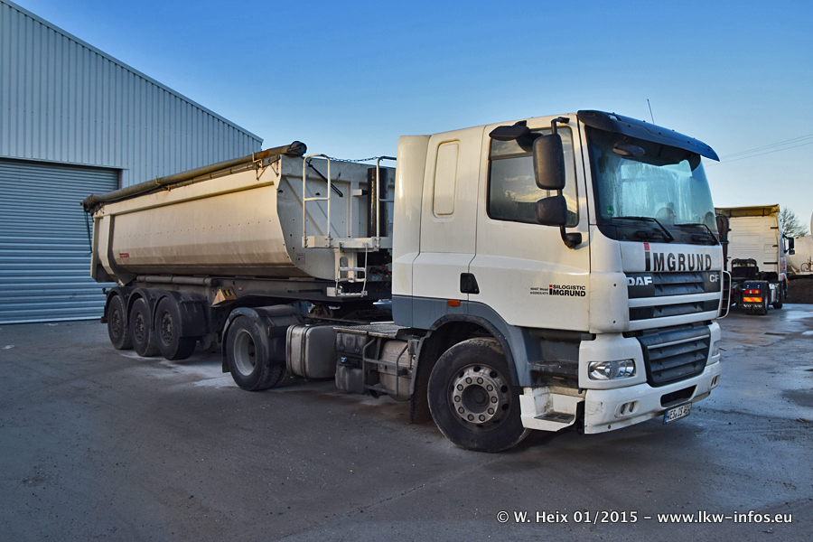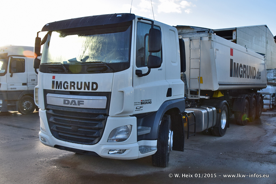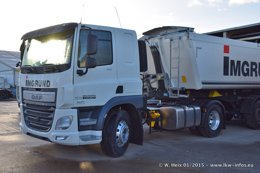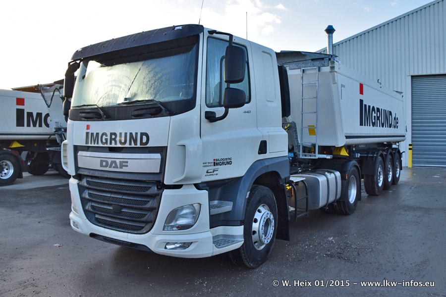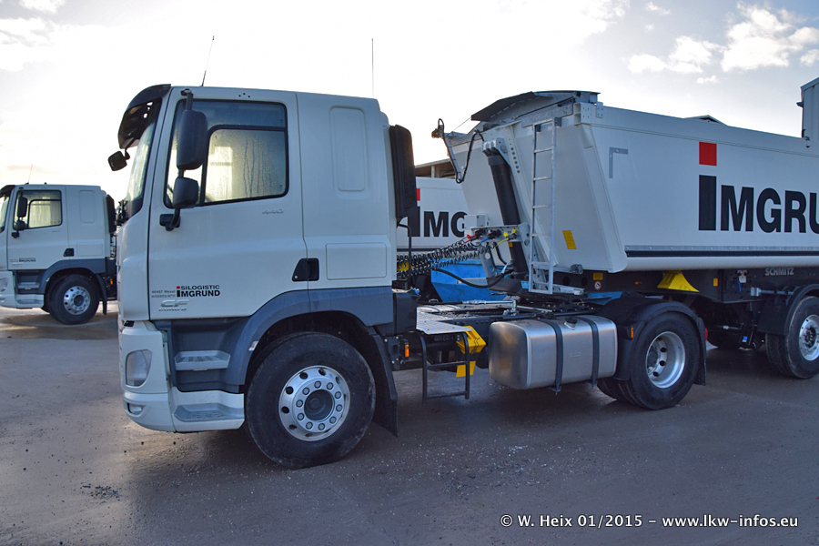 Ich war rund 2 Jahre nicht mehr bei Imgrnd. Entsprechend gibt es einige neue Fahrzeuge. Neben weiteren Mercedes-Benz Actros 4 sind seit eingen Tagen die ersten DAF New CF Euro 6 im Fuhrpark. Die Zugmaschinen ohne Kennzeichen werden in den nächsten Tagen die ersten Neuzulassungen 2015 sein. Neu sind auch die Kippauflieger, die mit den neuen DAF-Zugmaschinen eingesetzt werden.