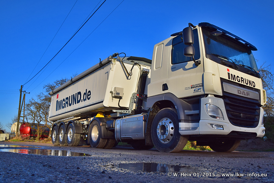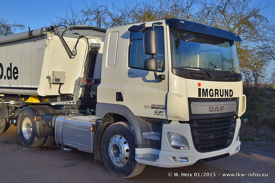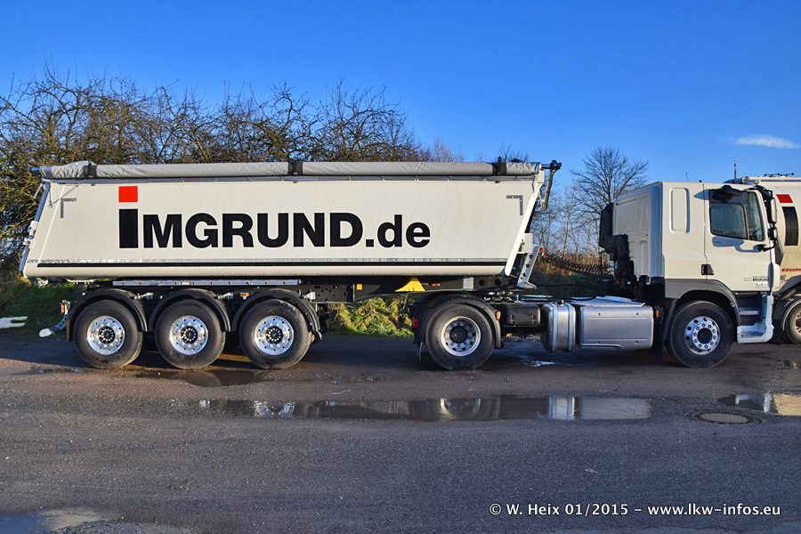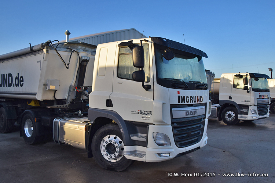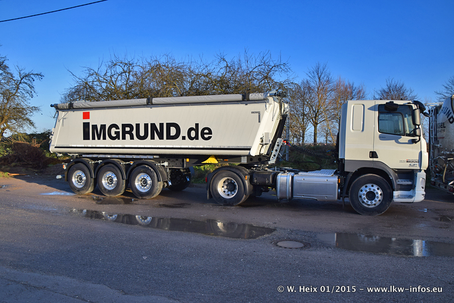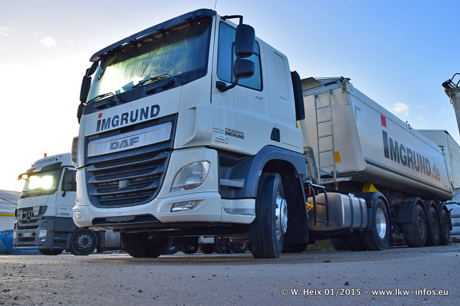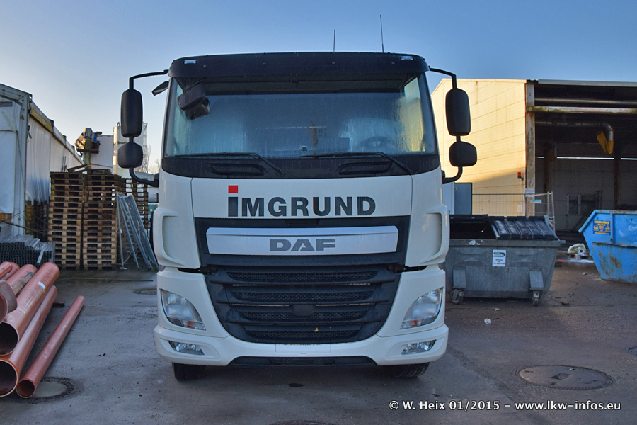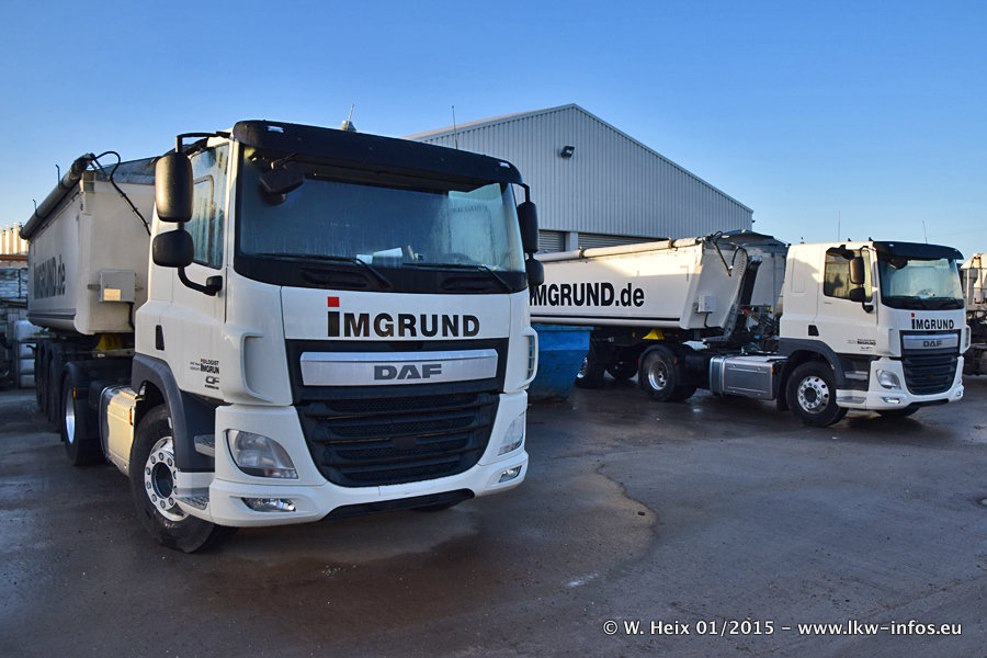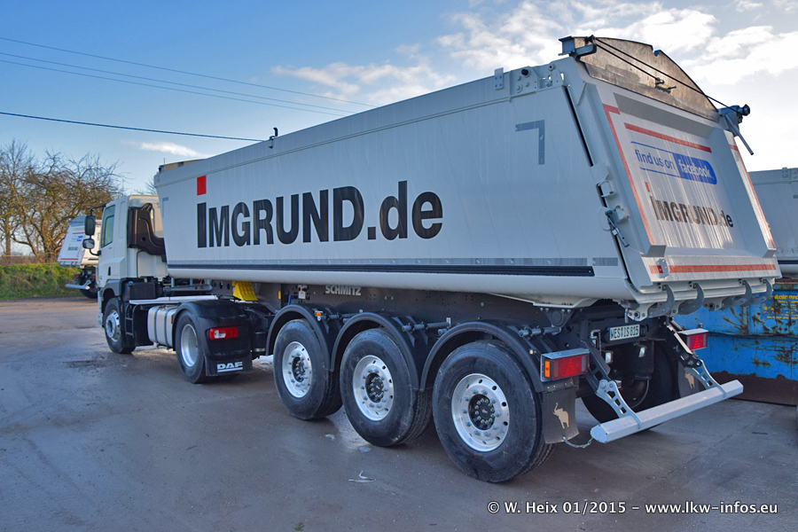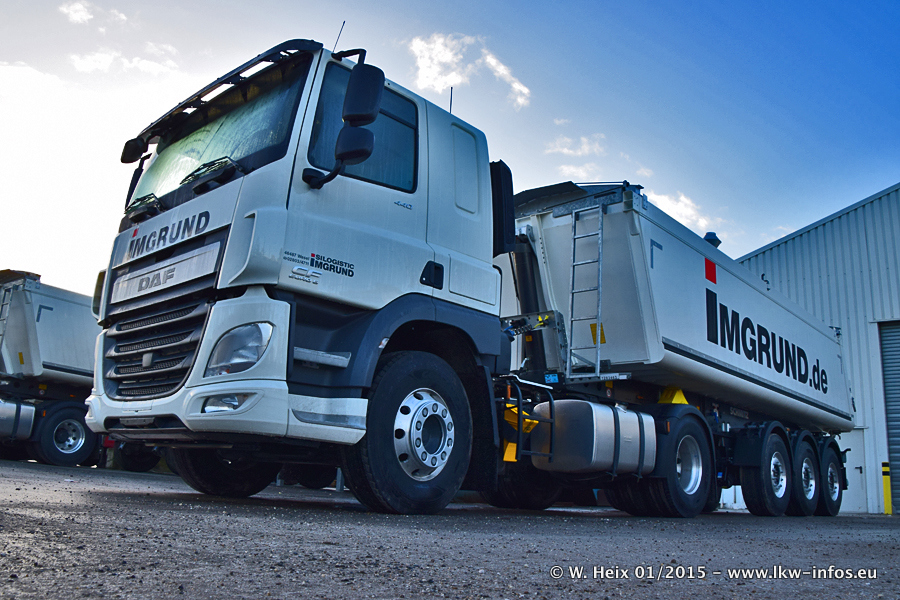 Ich war rund 2 Jahre nicht mehr bei Imgrnd. Entsprechend gibt es einige neue Fahrzeuge. Neben weiteren Mercedes-Benz Actros 4 sind seit eingen Tagen die ersten DAF New CF Euro 6 im Fuhrpark. Die Zugmaschinen ohne Kennzeichen werden in den nächsten Tagen die ersten Neuzulassungen 2015 sein. Neu sind auch die Kippauflieger, die mit den neuen DAF-Zugmaschinen eingesetzt werden.