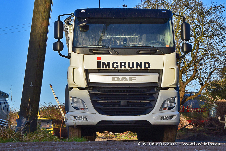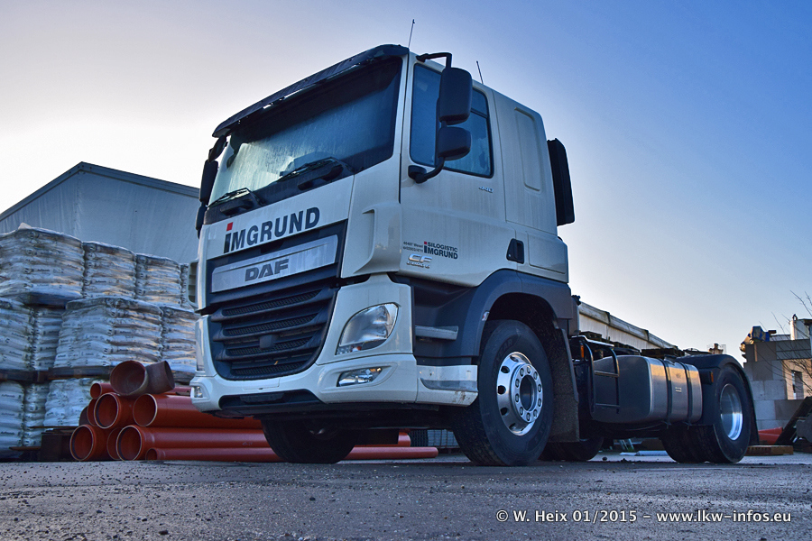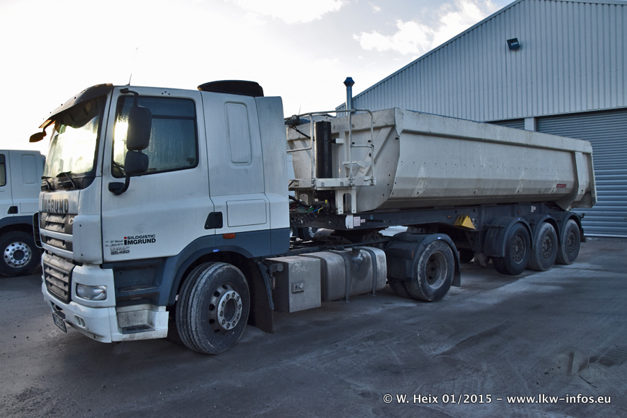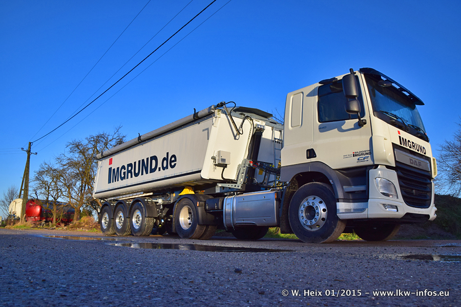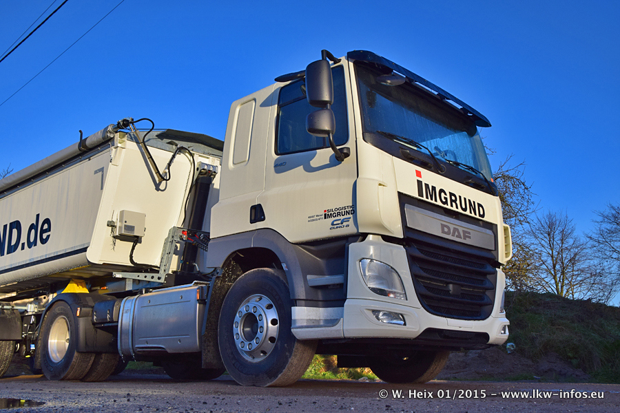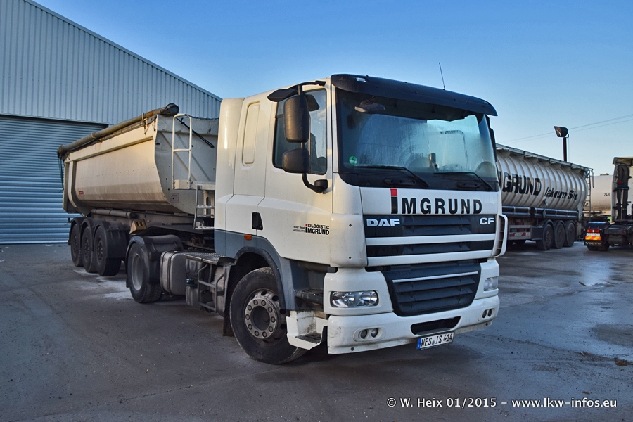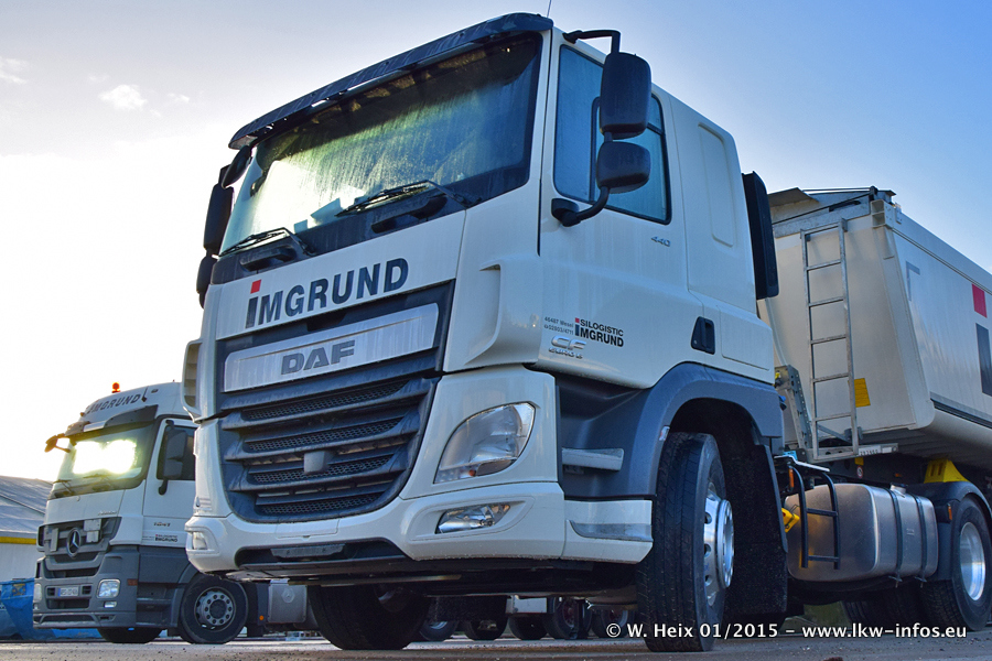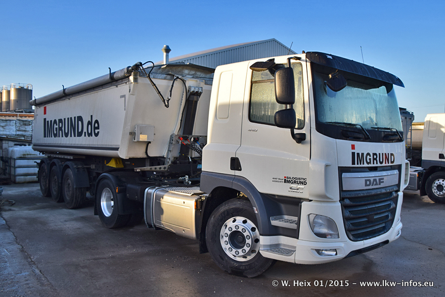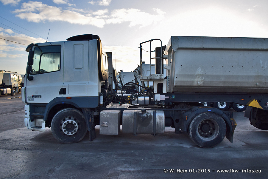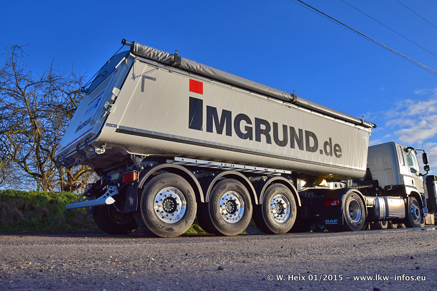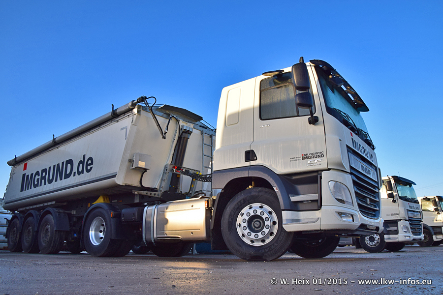 Ich war rund 2 Jahre nicht mehr bei Imgrnd. Entsprechend gibt es einige neue Fahrzeuge. Neben weiteren Mercedes-Benz Actros 4 sind seit eingen Tagen die ersten DAF New CF Euro 6 im Fuhrpark. Die Zugmaschinen ohne Kennzeichen werden in den nächsten Tagen die ersten Neuzulassungen 2015 sein. Neu sind auch die Kippauflieger, die mit den neuen DAF-Zugmaschinen eingesetzt werden.