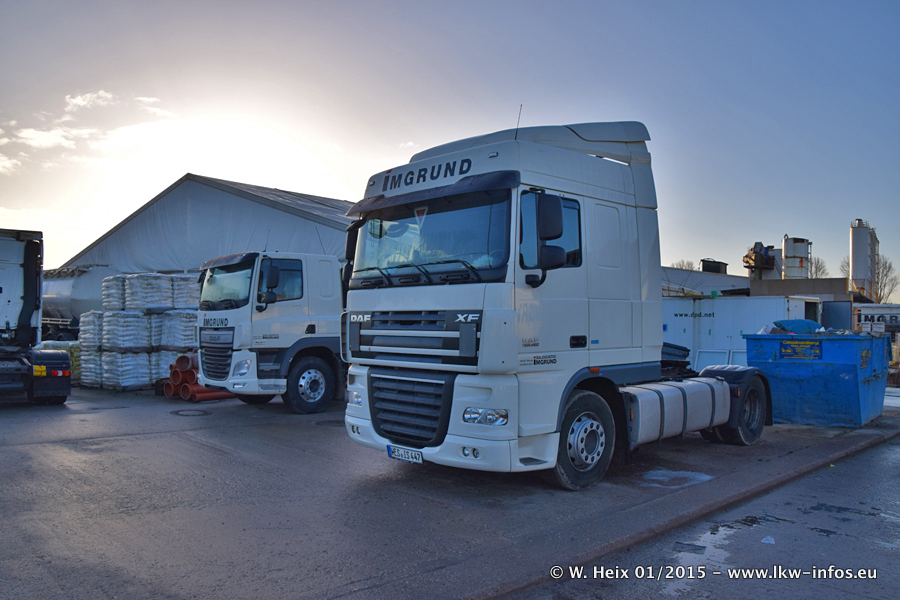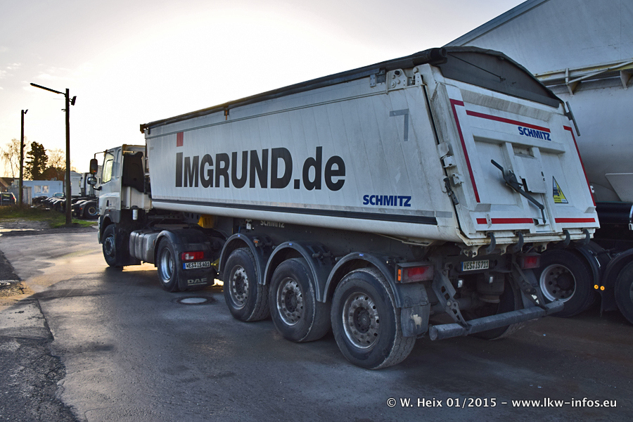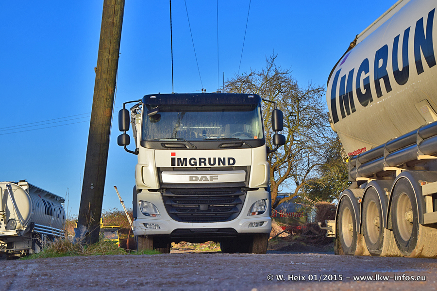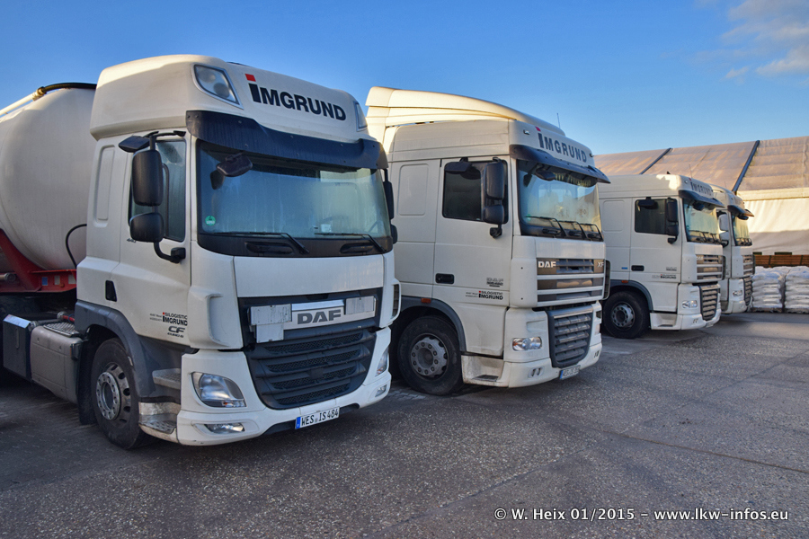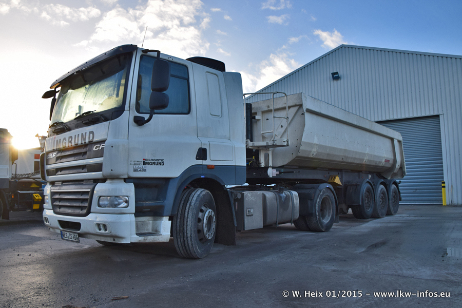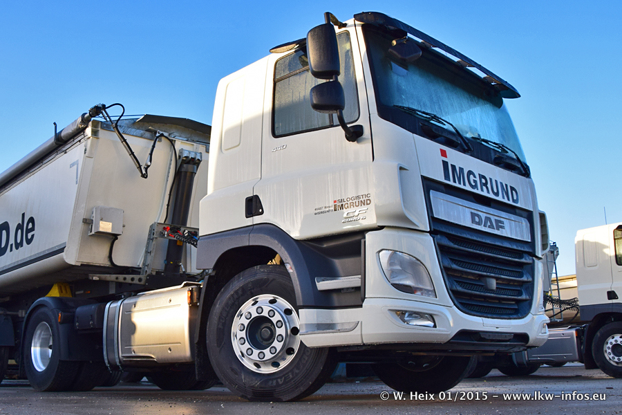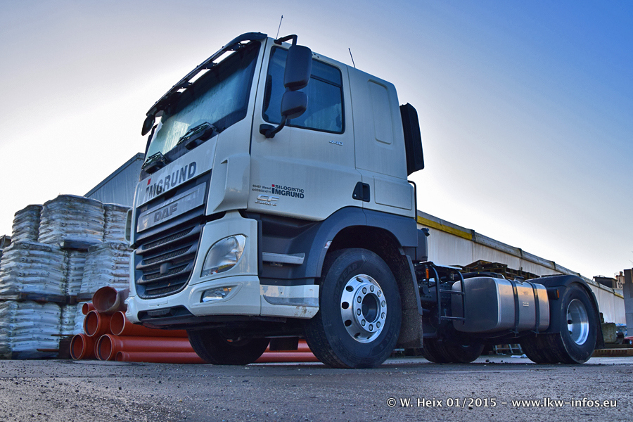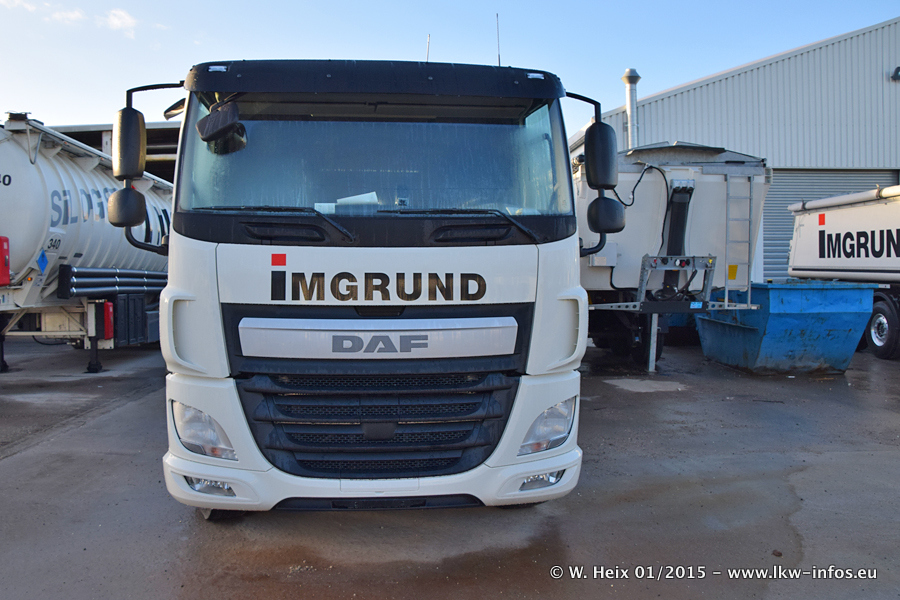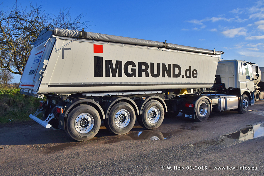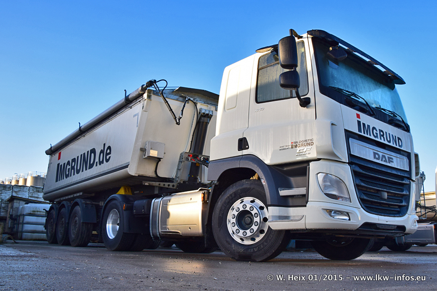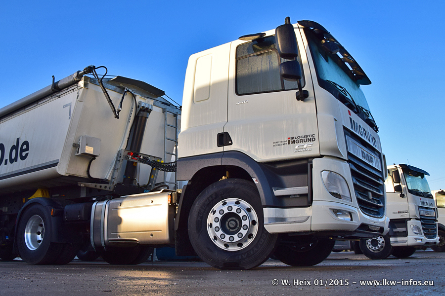 Ich war rund 2 Jahre nicht mehr bei Imgrnd. Entsprechend gibt es einige neue Fahrzeuge. Neben weiteren Mercedes-Benz Actros 4 sind seit eingen Tagen die ersten DAF New CF Euro 6 im Fuhrpark. Die Zugmaschinen ohne Kennzeichen werden in den nächsten Tagen die ersten Neuzulassungen 2015 sein. Neu sind auch die Kippauflieger, die mit den neuen DAF-Zugmaschinen eingesetzt werden.