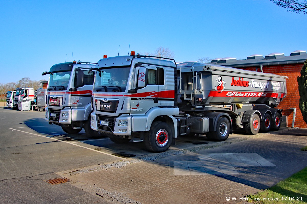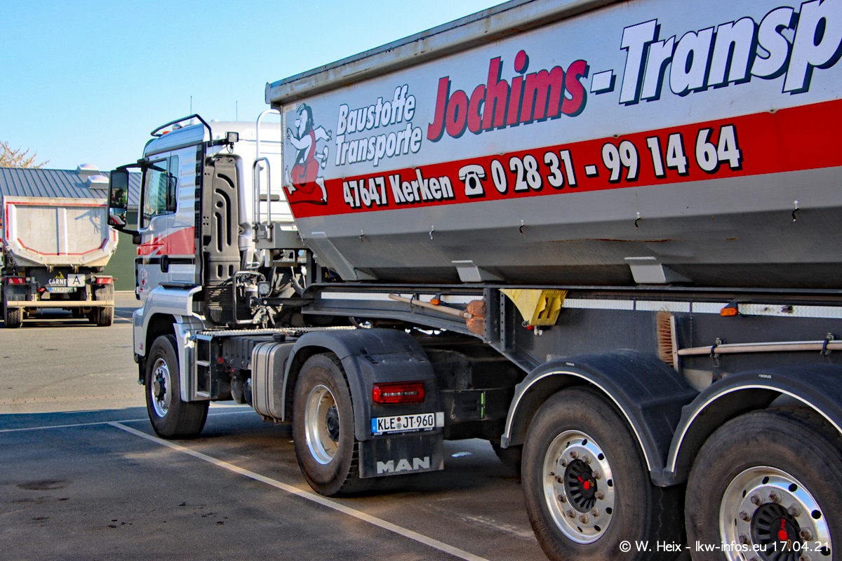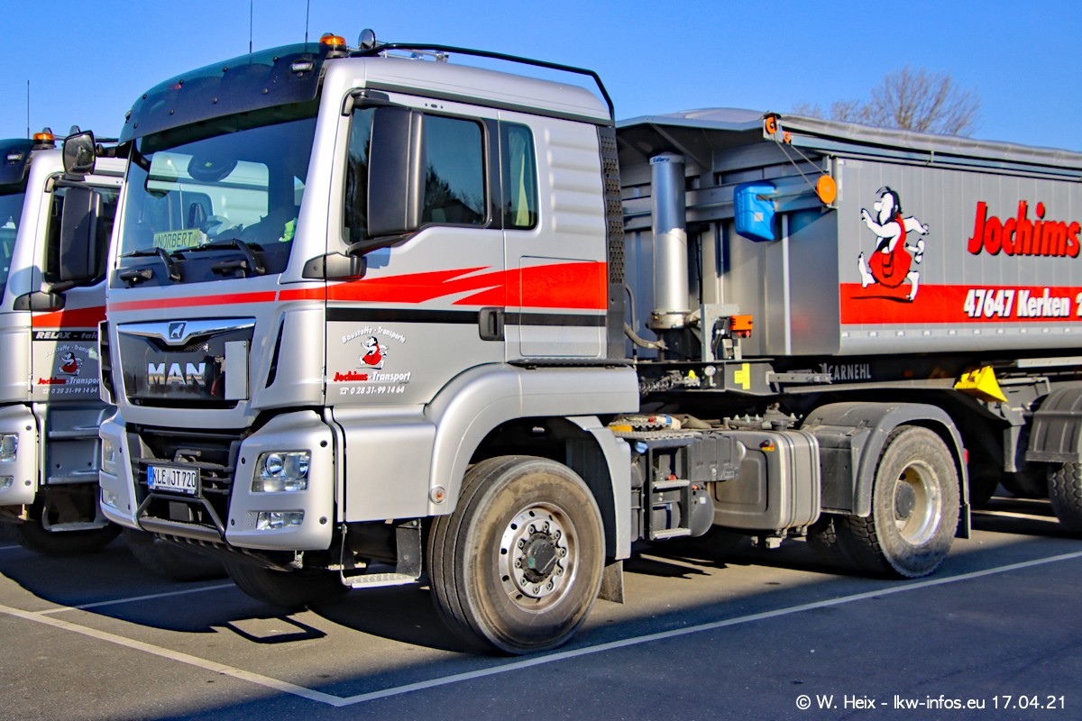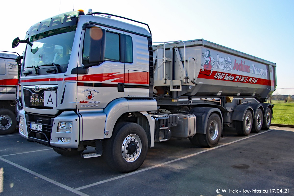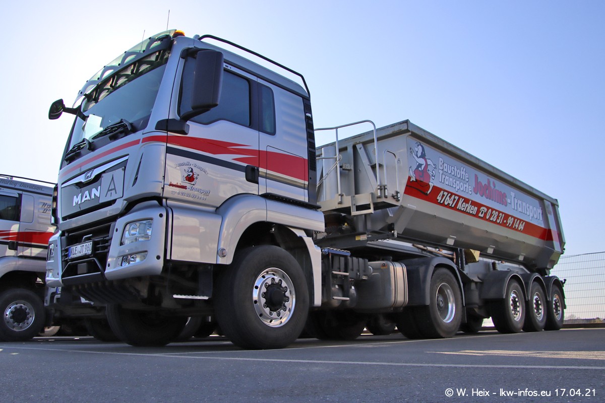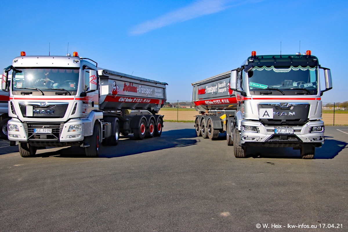 Es sind schon wieder fast 1,5 Jahre vergangen, seit ich zuletzt bei Jochims zu Besuch war. Entsprechend gibt es viele neue LKW. Das sind meines Wissens alles Zugmaschinen von MAN, zu erkennen an den jetzt geänderten Kennzeichen mit der Kombination "KLE JT" und nicht mehr "KLE PJ". Jochims hat in der letzten Zeit noch viele MAN TGS der jetzt alten Baureihe gekauft, aber jetzt ist auch seit einigen Wochen der erste neue MAN TGS im Fuhrpark. Wir haben ein kleines Fotoshooting auf den Gelände gemacht und den alten und den neuen MAN nebeneinander gestellt. Im Sommer kommen voraussichtlich weitere neue LKW. Alle Bilder sind vom Hauptsitz in Kerken, wo ungefähr die Hälfe der Fahrzeuge steht.