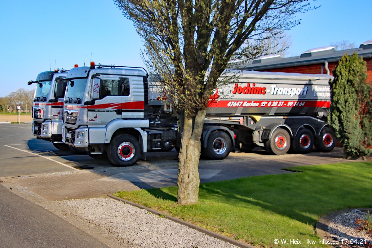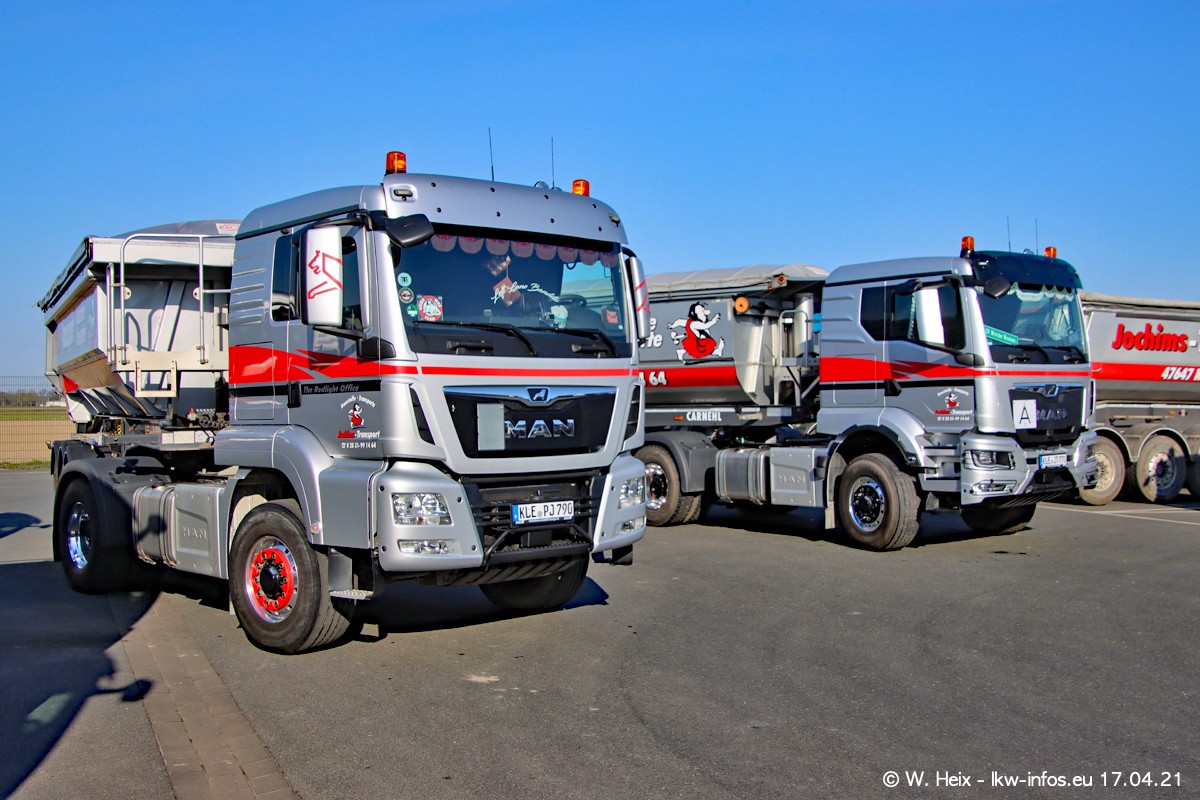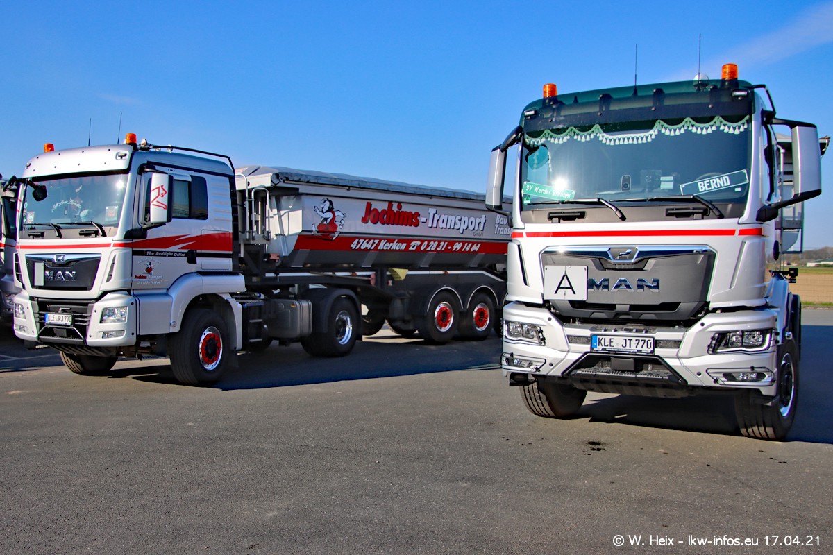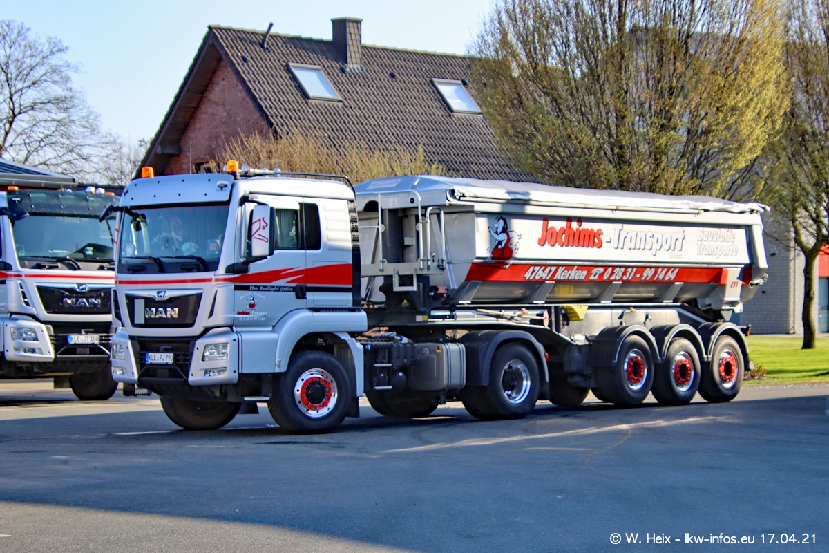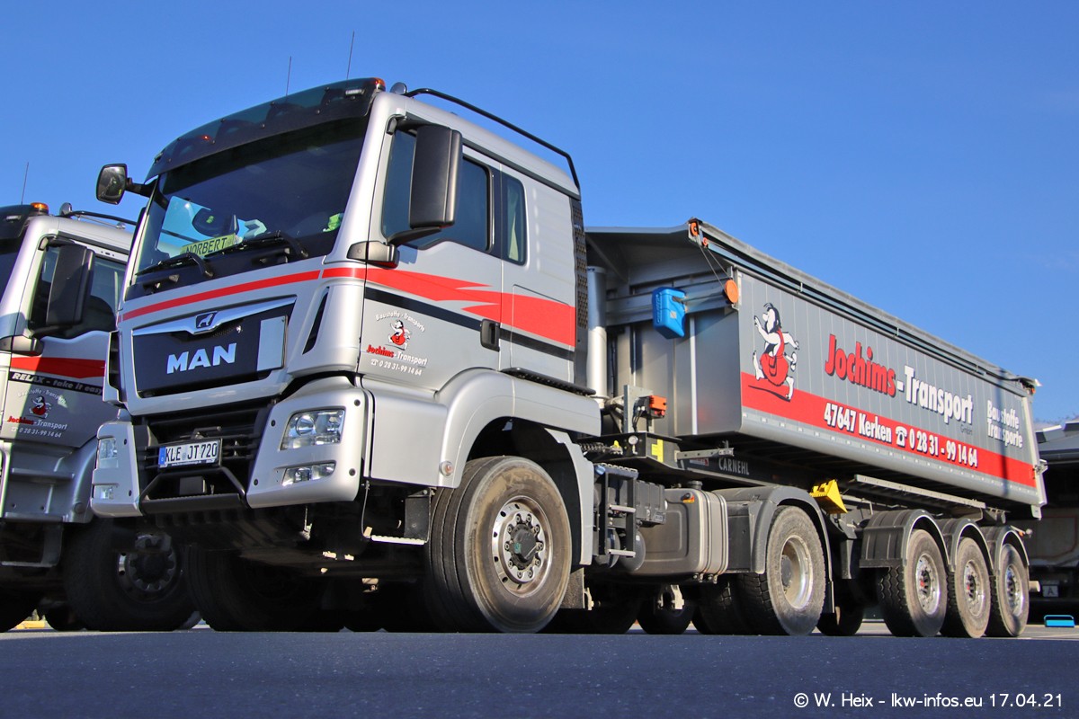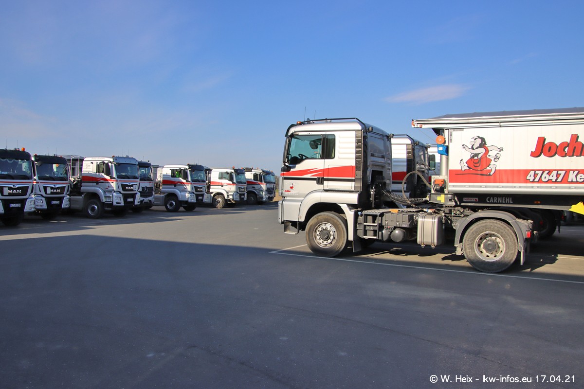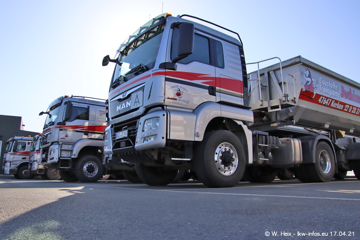 Es sind schon wieder fast 1,5 Jahre vergangen, seit ich zuletzt bei Jochims zu Besuch war. Entsprechend gibt es viele neue LKW. Das sind meines Wissens alles Zugmaschinen von MAN, zu erkennen an den jetzt geänderten Kennzeichen mit der Kombination "KLE JT" und nicht mehr "KLE PJ". Jochims hat in der letzten Zeit noch viele MAN TGS der jetzt alten Baureihe gekauft, aber jetzt ist auch seit einigen Wochen der erste neue MAN TGS im Fuhrpark. Wir haben ein kleines Fotoshooting auf den Gelände gemacht und den alten und den neuen MAN nebeneinander gestellt. Im Sommer kommen voraussichtlich weitere neue LKW. Alle Bilder sind vom Hauptsitz in Kerken, wo ungefähr die Hälfe der Fahrzeuge steht.