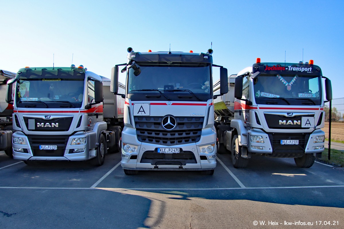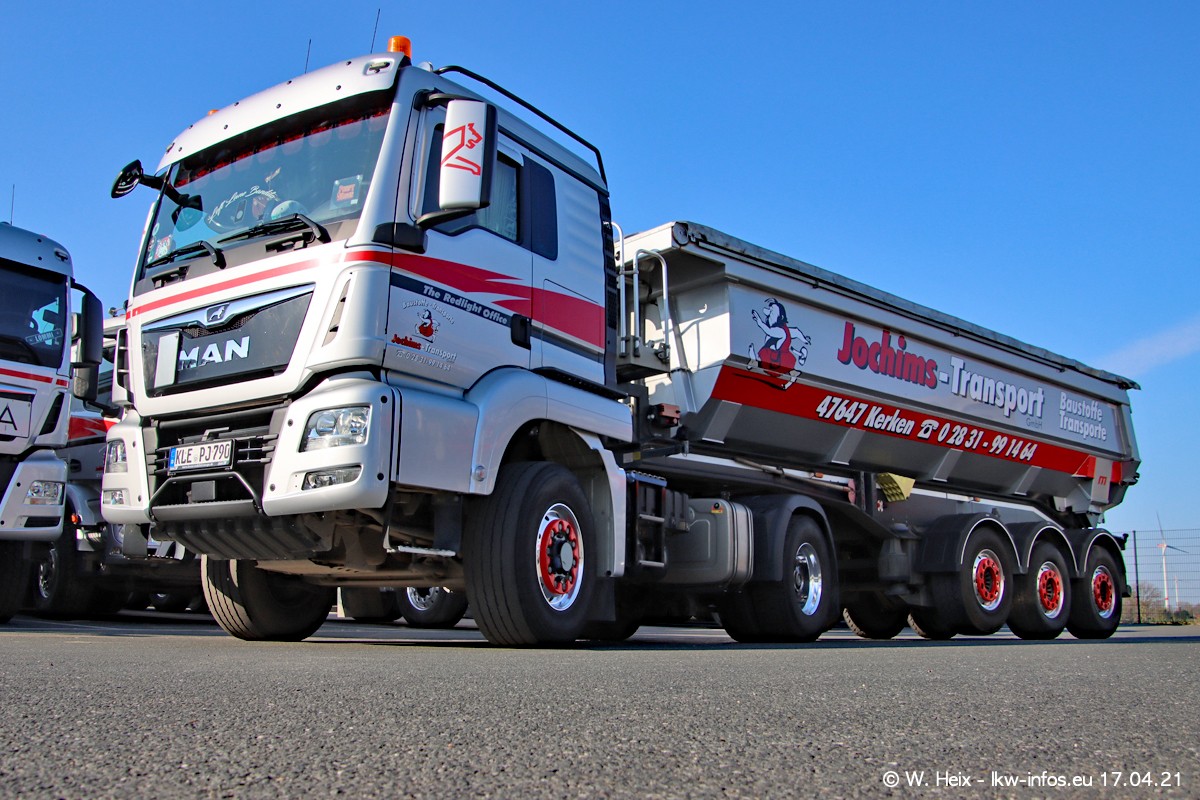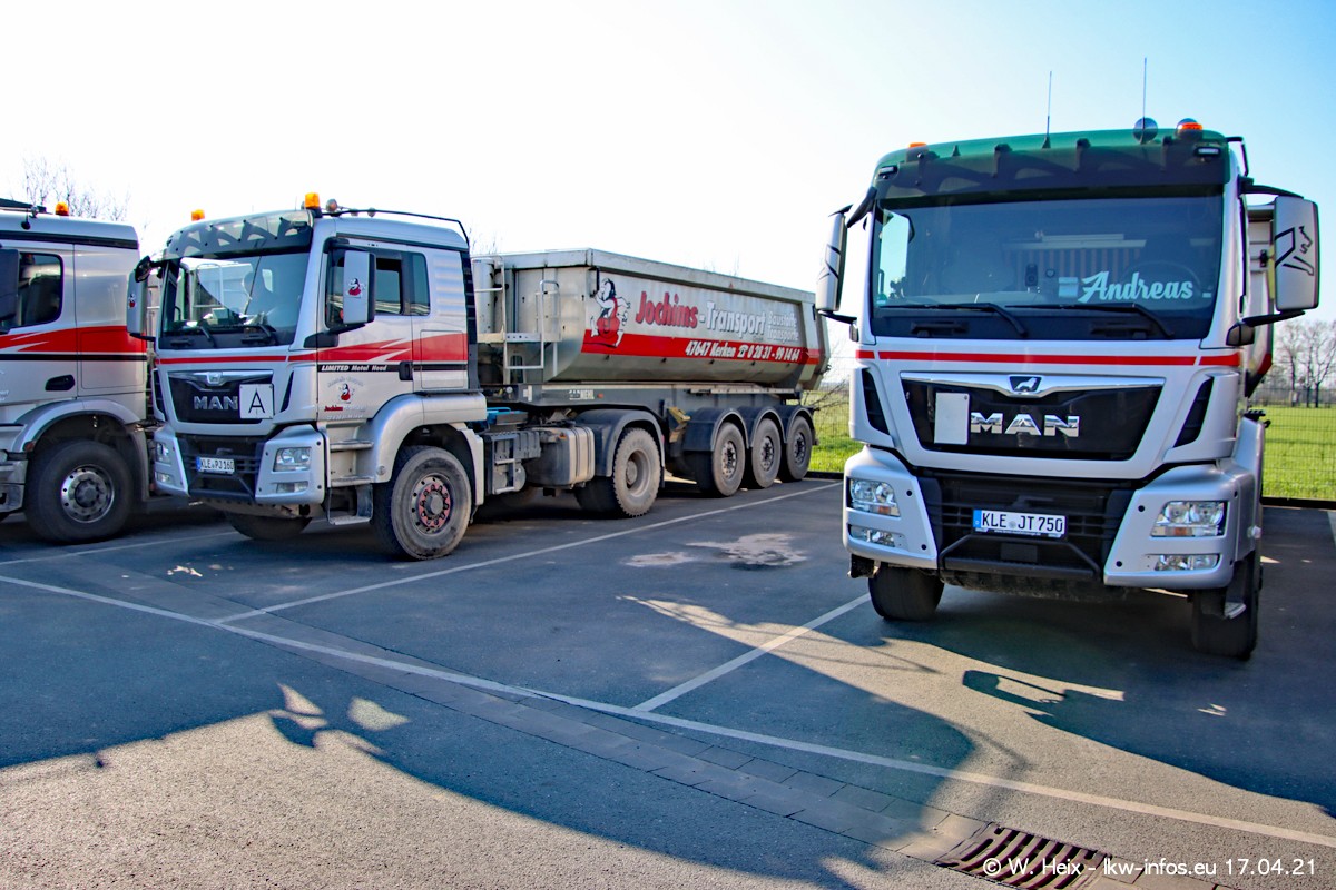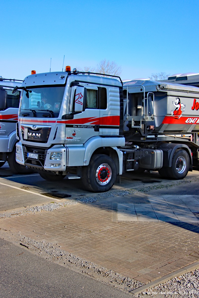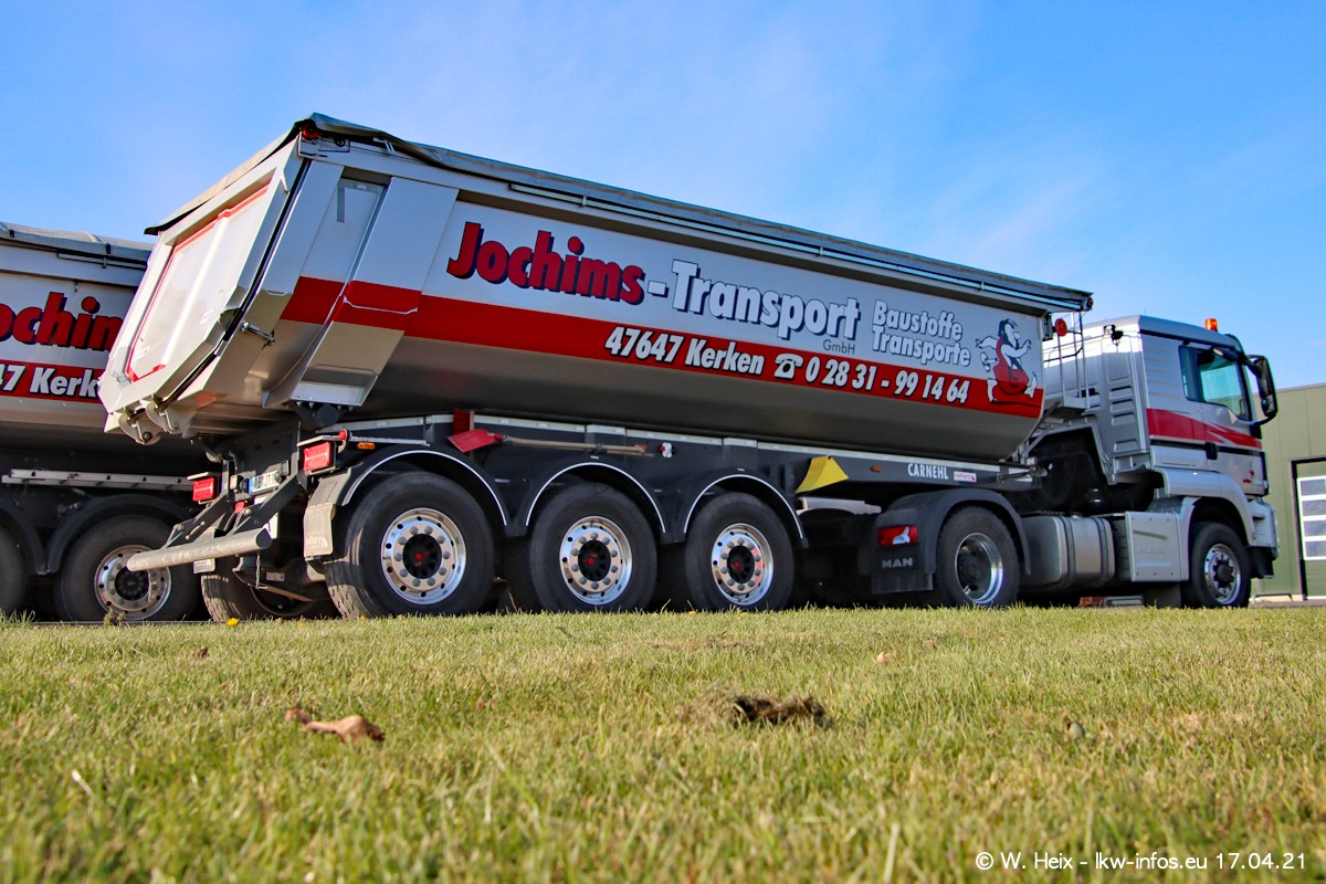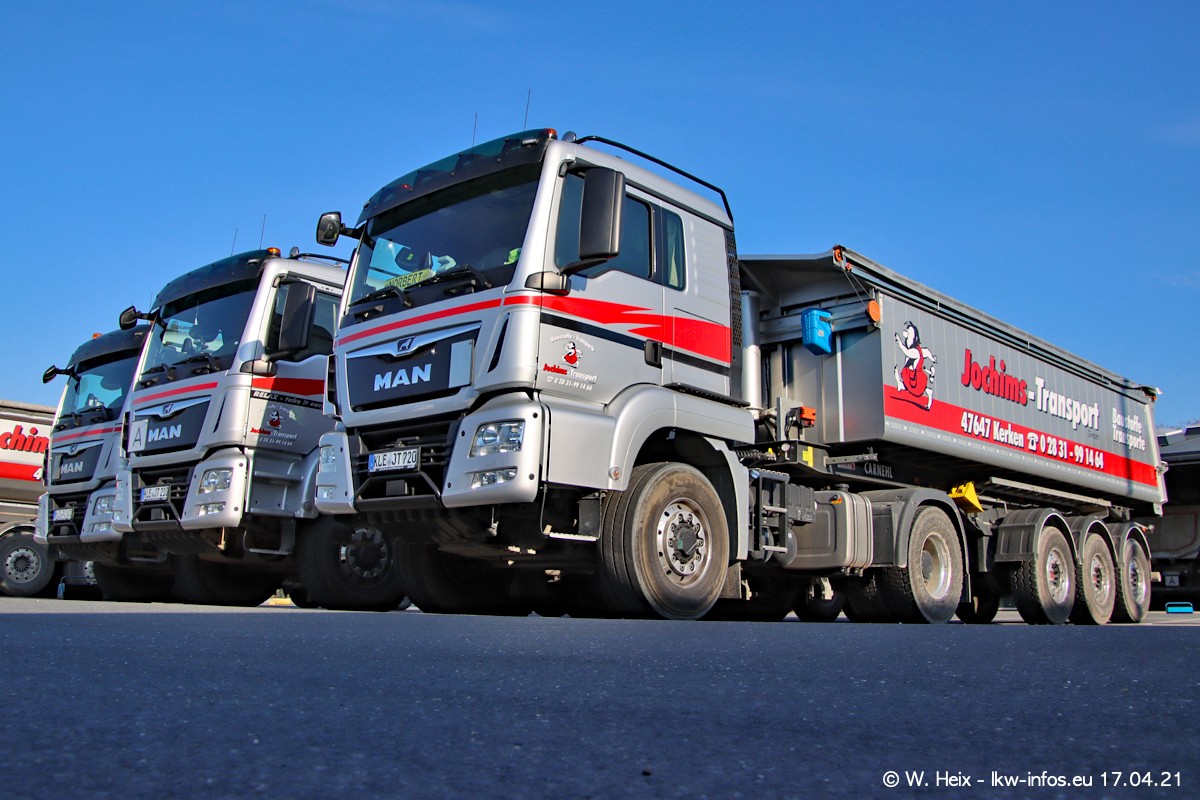 Es sind schon wieder fast 1,5 Jahre vergangen, seit ich zuletzt bei Jochims zu Besuch war. Entsprechend gibt es viele neue LKW. Das sind meines Wissens alles Zugmaschinen von MAN, zu erkennen an den jetzt geänderten Kennzeichen mit der Kombination "KLE JT" und nicht mehr "KLE PJ". Jochims hat in der letzten Zeit noch viele MAN TGS der jetzt alten Baureihe gekauft, aber jetzt ist auch seit einigen Wochen der erste neue MAN TGS im Fuhrpark. Wir haben ein kleines Fotoshooting auf den Gelände gemacht und den alten und den neuen MAN nebeneinander gestellt. Im Sommer kommen voraussichtlich weitere neue LKW. Alle Bilder sind vom Hauptsitz in Kerken, wo ungefähr die Hälfe der Fahrzeuge steht.
