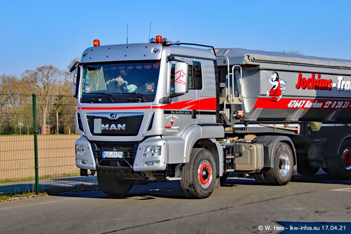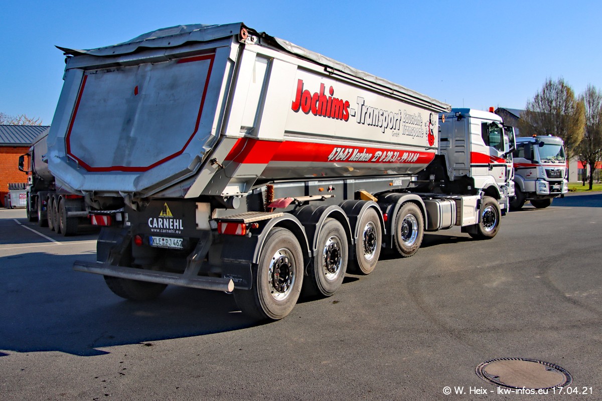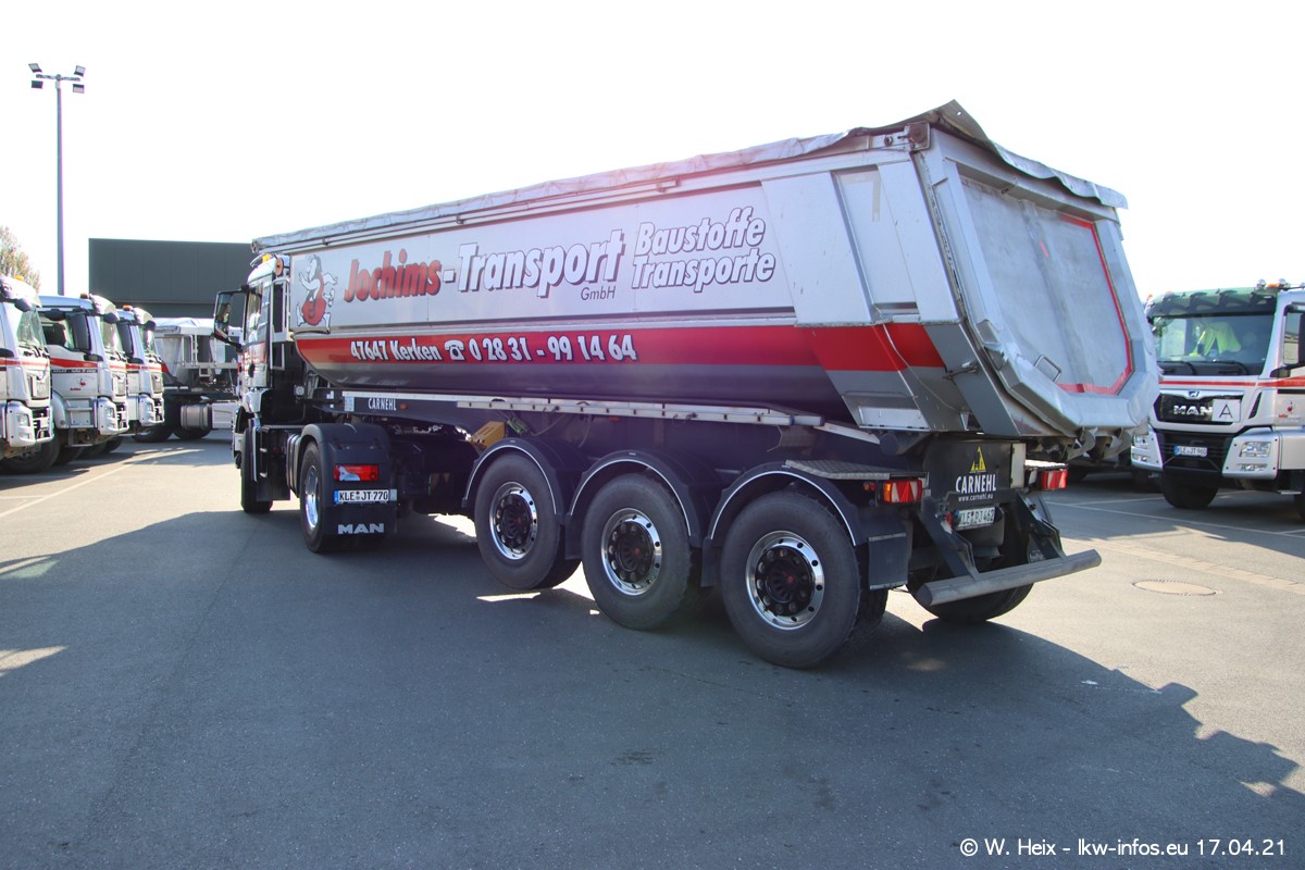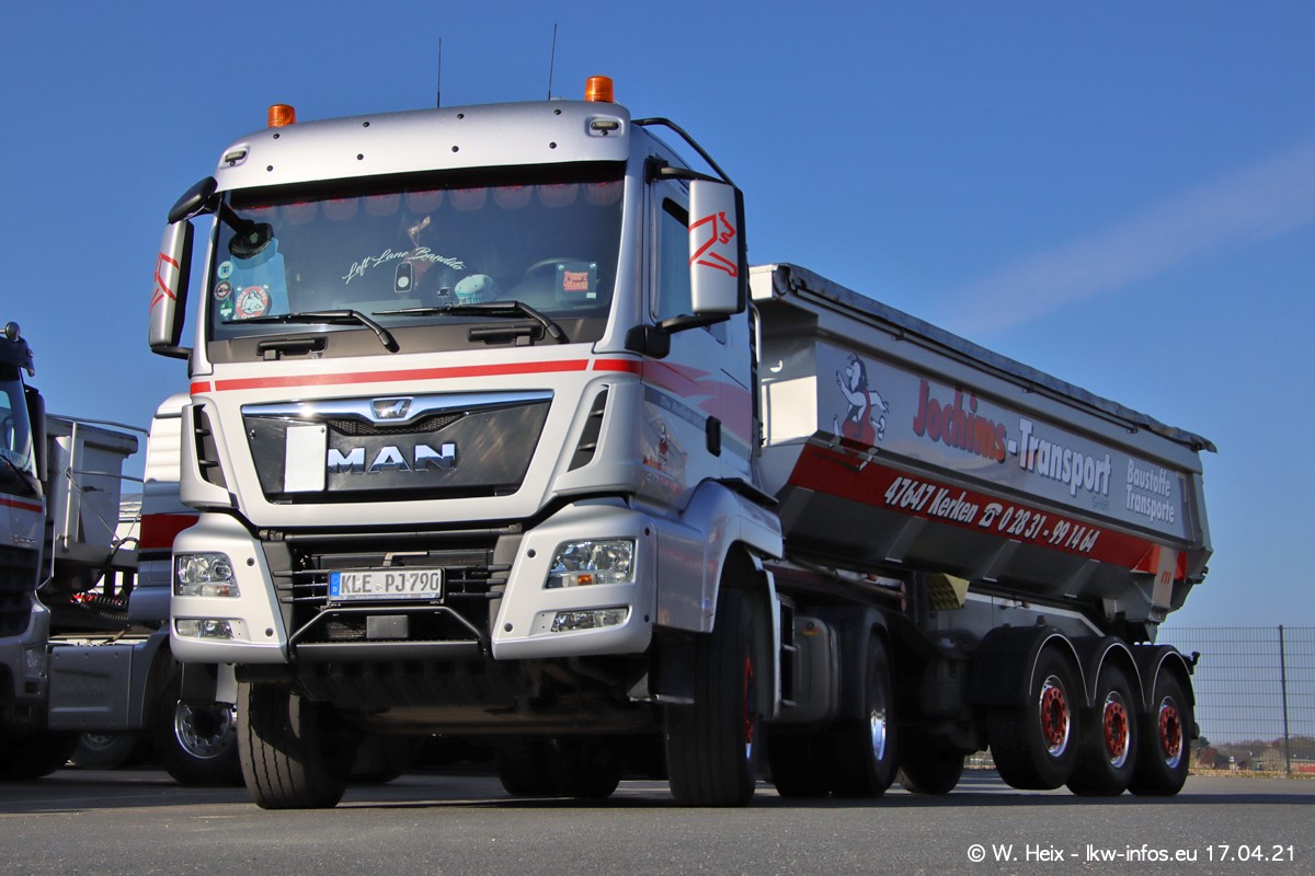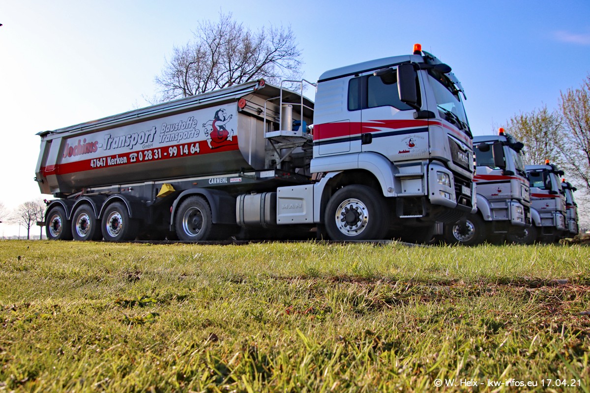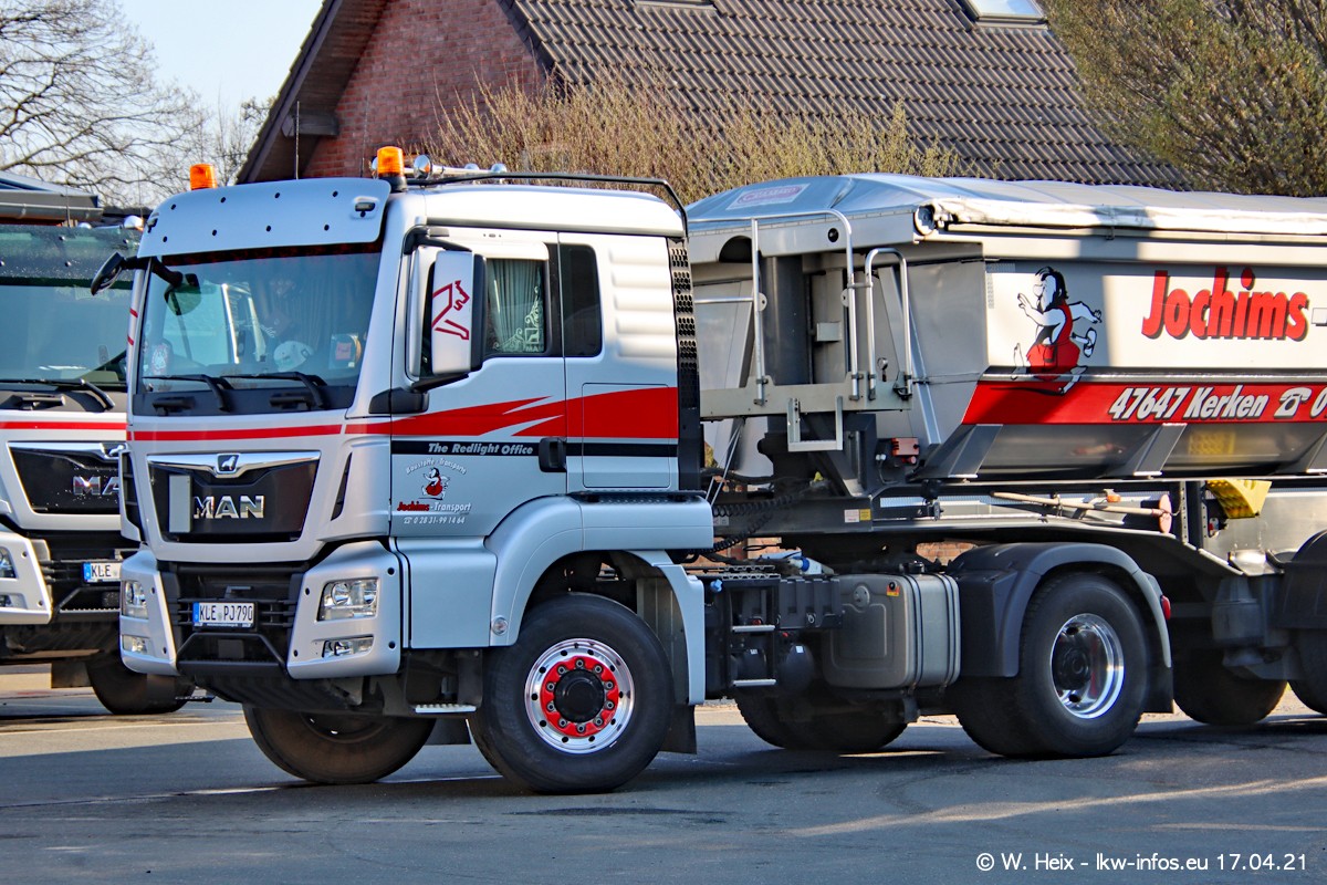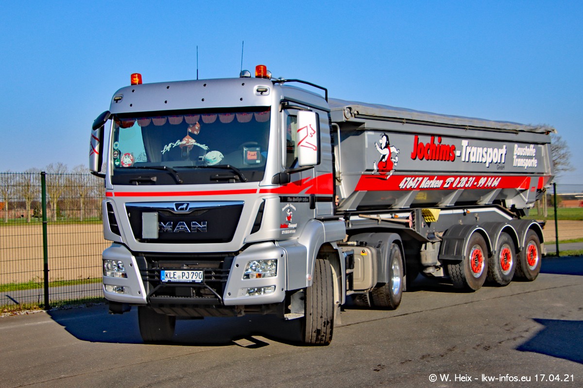 Es sind schon wieder fast 1,5 Jahre vergangen, seit ich zuletzt bei Jochims zu Besuch war. Entsprechend gibt es viele neue LKW. Das sind meines Wissens alles Zugmaschinen von MAN, zu erkennen an den jetzt geänderten Kennzeichen mit der Kombination "KLE JT" und nicht mehr "KLE PJ". Jochims hat in der letzten Zeit noch viele MAN TGS der jetzt alten Baureihe gekauft, aber jetzt ist auch seit einigen Wochen der erste neue MAN TGS im Fuhrpark. Wir haben ein kleines Fotoshooting auf den Gelände gemacht und den alten und den neuen MAN nebeneinander gestellt. Im Sommer kommen voraussichtlich weitere neue LKW. Alle Bilder sind vom Hauptsitz in Kerken, wo ungefähr die Hälfe der Fahrzeuge steht.