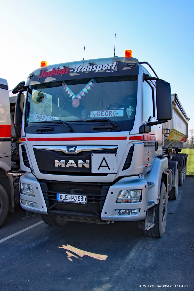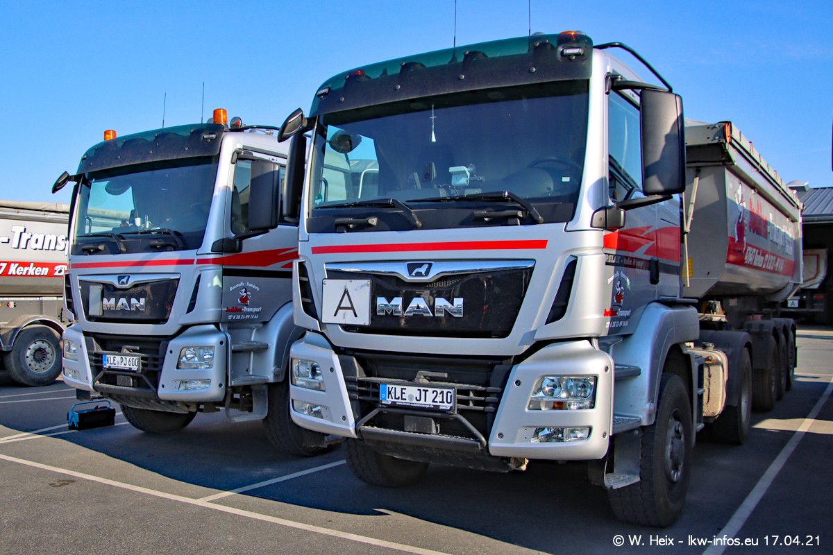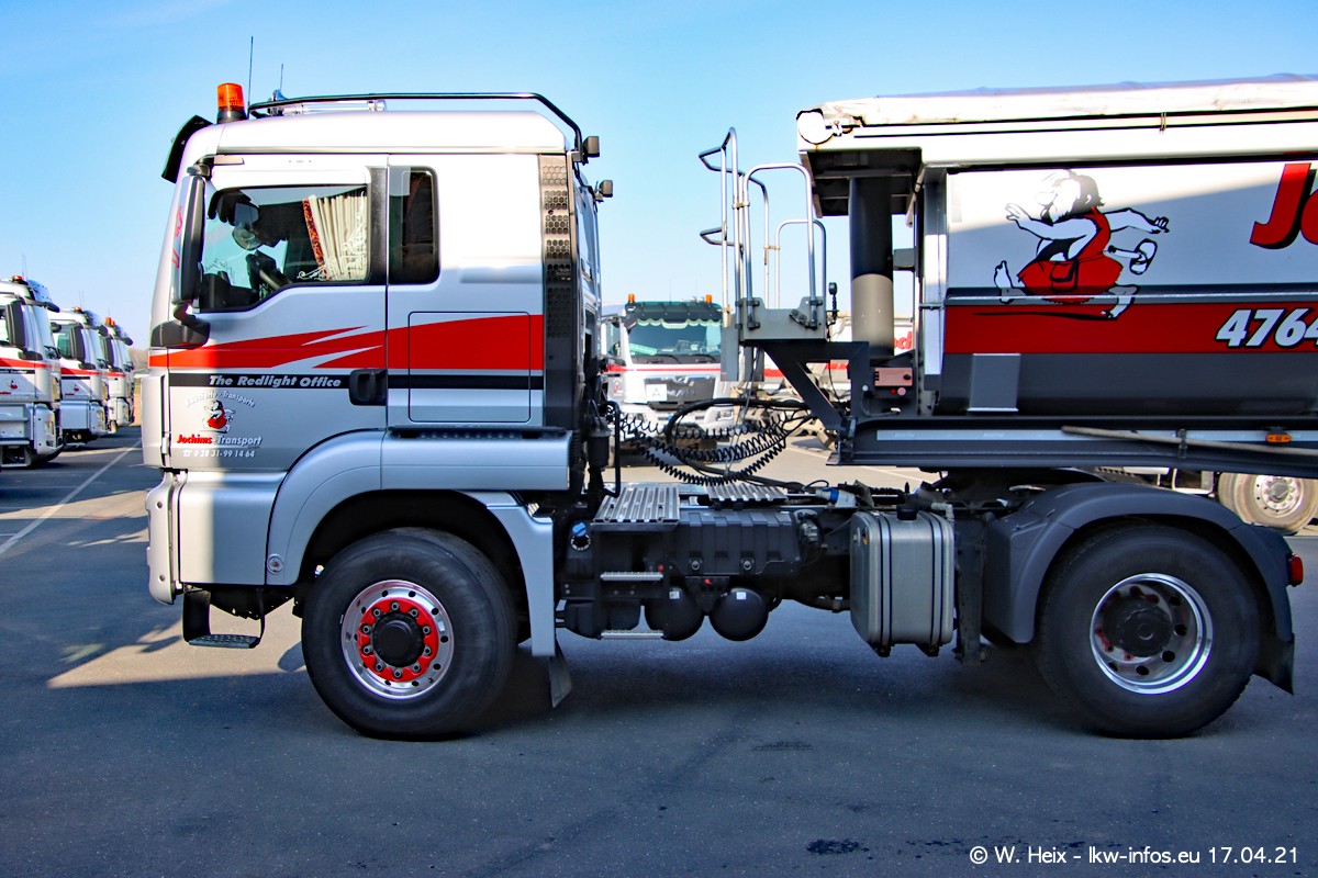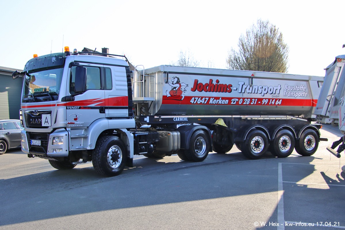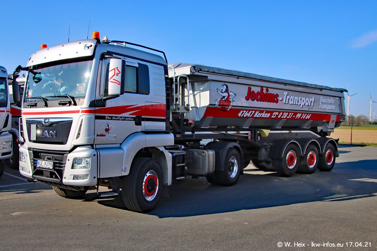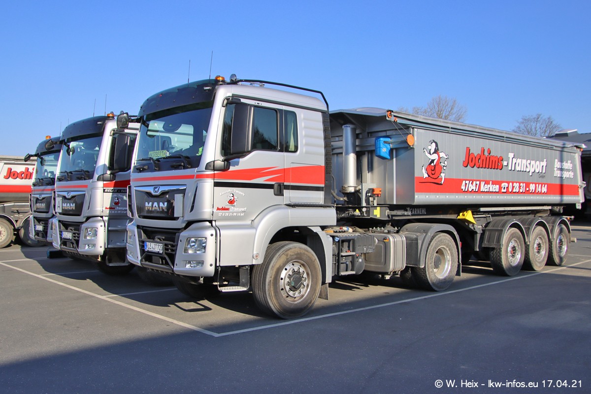 Es sind schon wieder fast 1,5 Jahre vergangen, seit ich zuletzt bei Jochims zu Besuch war. Entsprechend gibt es viele neue LKW. Das sind meines Wissens alles Zugmaschinen von MAN, zu erkennen an den jetzt geänderten Kennzeichen mit der Kombination "KLE JT" und nicht mehr "KLE PJ". Jochims hat in der letzten Zeit noch viele MAN TGS der jetzt alten Baureihe gekauft, aber jetzt ist auch seit einigen Wochen der erste neue MAN TGS im Fuhrpark. Wir haben ein kleines Fotoshooting auf den Gelände gemacht und den alten und den neuen MAN nebeneinander gestellt. Im Sommer kommen voraussichtlich weitere neue LKW. Alle Bilder sind vom Hauptsitz in Kerken, wo ungefähr die Hälfe der Fahrzeuge steht.