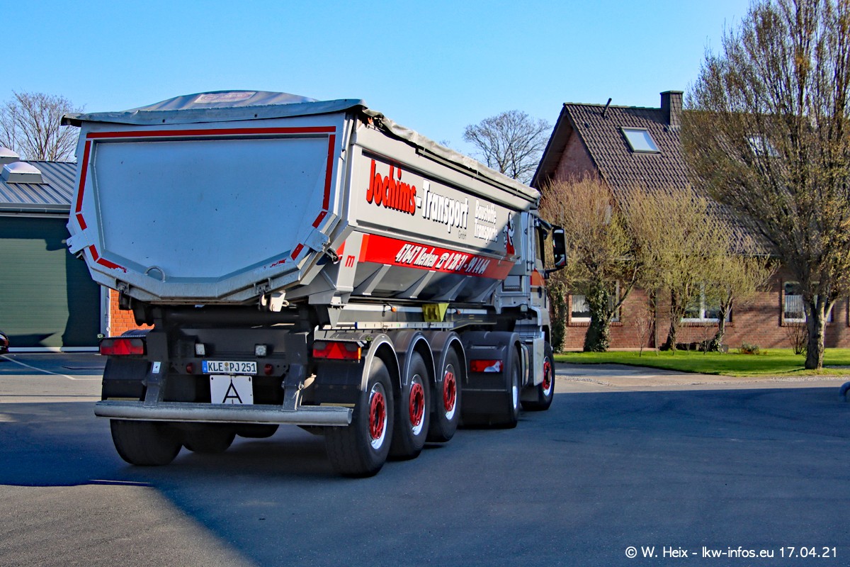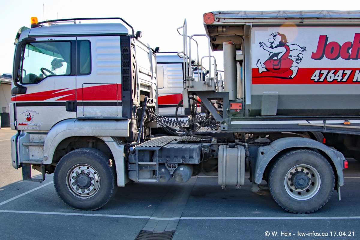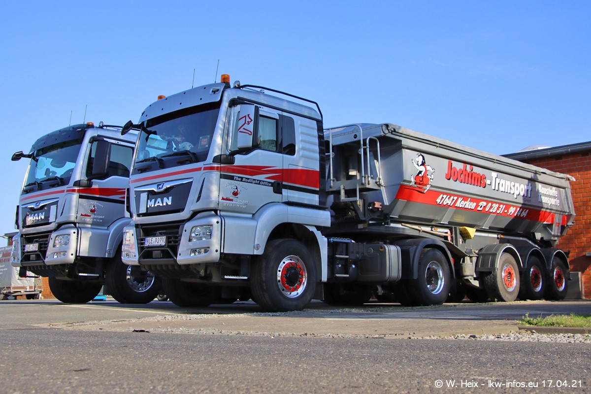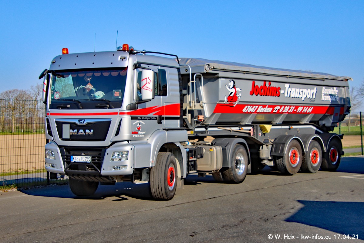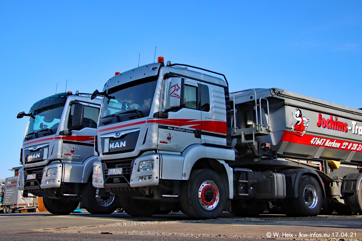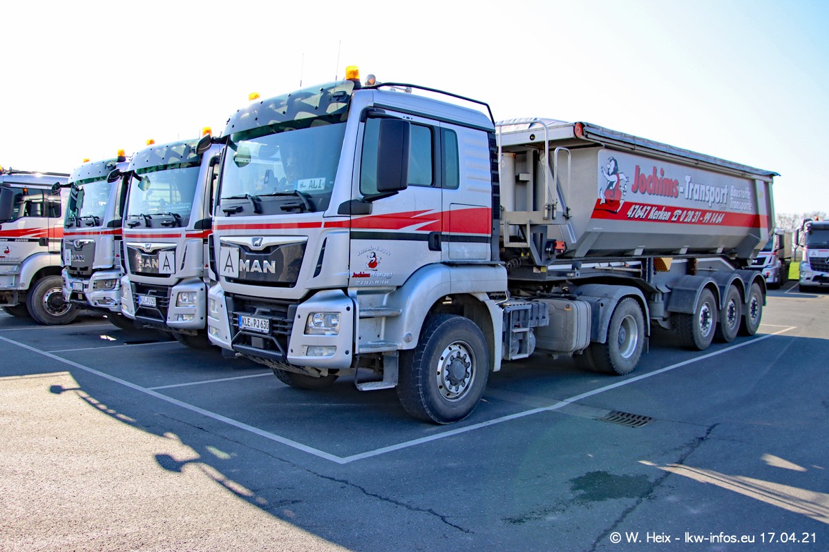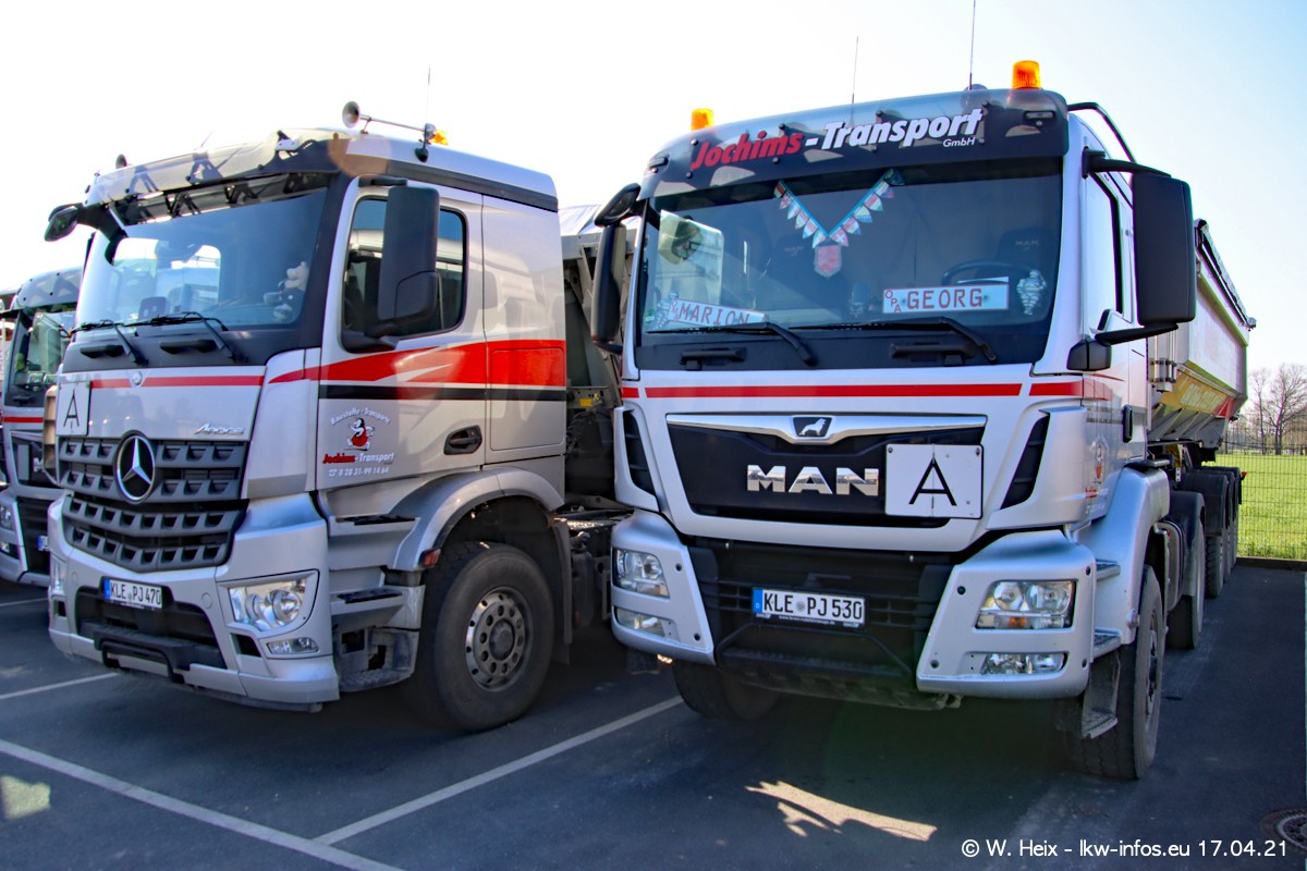 Es sind schon wieder fast 1,5 Jahre vergangen, seit ich zuletzt bei Jochims zu Besuch war. Entsprechend gibt es viele neue LKW. Das sind meines Wissens alles Zugmaschinen von MAN, zu erkennen an den jetzt geänderten Kennzeichen mit der Kombination "KLE JT" und nicht mehr "KLE PJ". Jochims hat in der letzten Zeit noch viele MAN TGS der jetzt alten Baureihe gekauft, aber jetzt ist auch seit einigen Wochen der erste neue MAN TGS im Fuhrpark. Wir haben ein kleines Fotoshooting auf den Gelände gemacht und den alten und den neuen MAN nebeneinander gestellt. Im Sommer kommen voraussichtlich weitere neue LKW. Alle Bilder sind vom Hauptsitz in Kerken, wo ungefähr die Hälfe der Fahrzeuge steht.