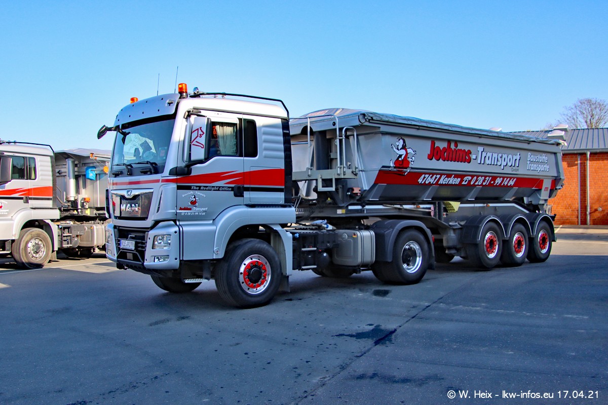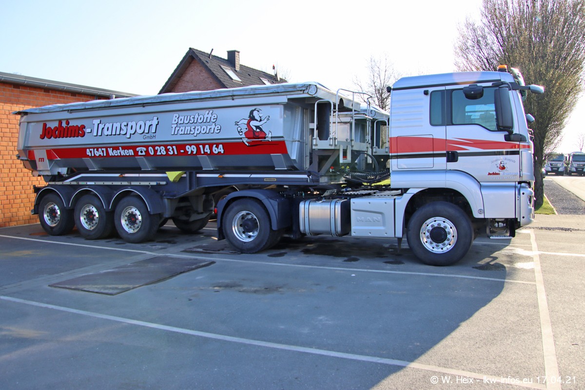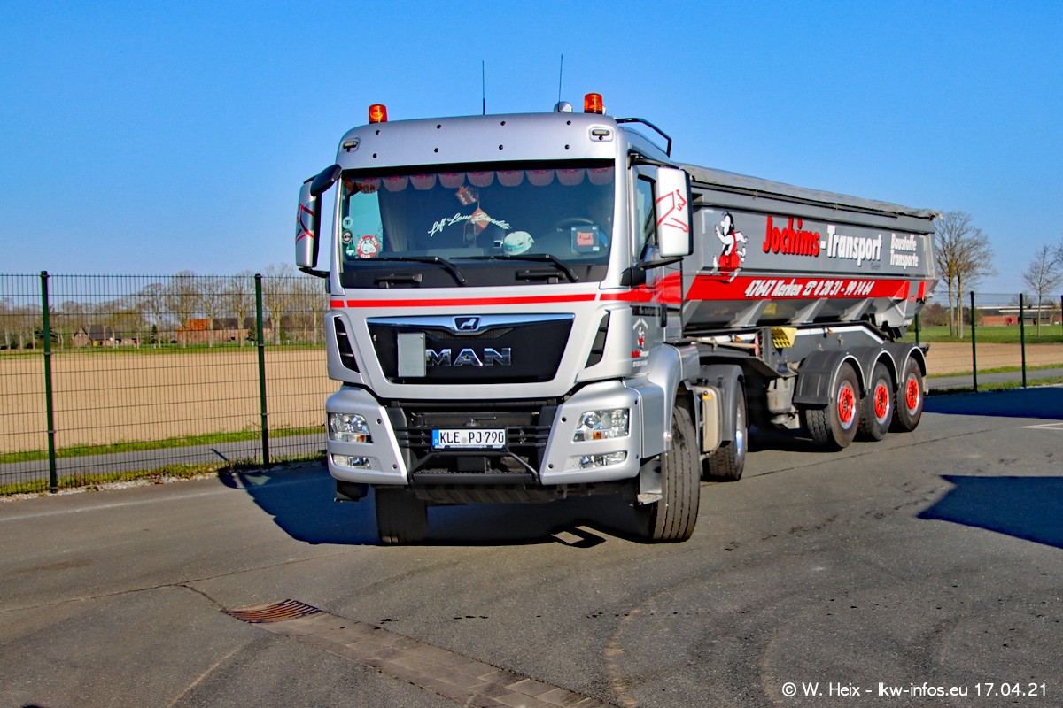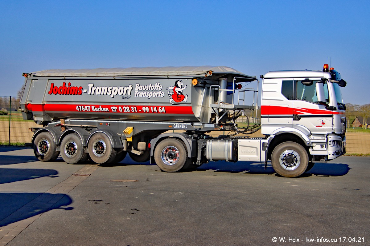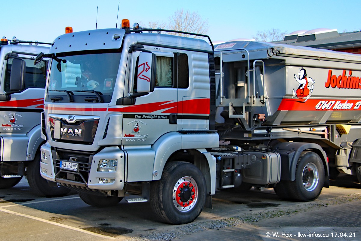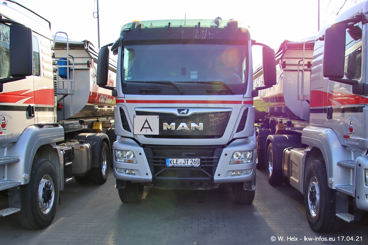 Es sind schon wieder fast 1,5 Jahre vergangen, seit ich zuletzt bei Jochims zu Besuch war. Entsprechend gibt es viele neue LKW. Das sind meines Wissens alles Zugmaschinen von MAN, zu erkennen an den jetzt geänderten Kennzeichen mit der Kombination "KLE JT" und nicht mehr "KLE PJ". Jochims hat in der letzten Zeit noch viele MAN TGS der jetzt alten Baureihe gekauft, aber jetzt ist auch seit einigen Wochen der erste neue MAN TGS im Fuhrpark. Wir haben ein kleines Fotoshooting auf den Gelände gemacht und den alten und den neuen MAN nebeneinander gestellt. Im Sommer kommen voraussichtlich weitere neue LKW. Alle Bilder sind vom Hauptsitz in Kerken, wo ungefähr die Hälfe der Fahrzeuge steht.