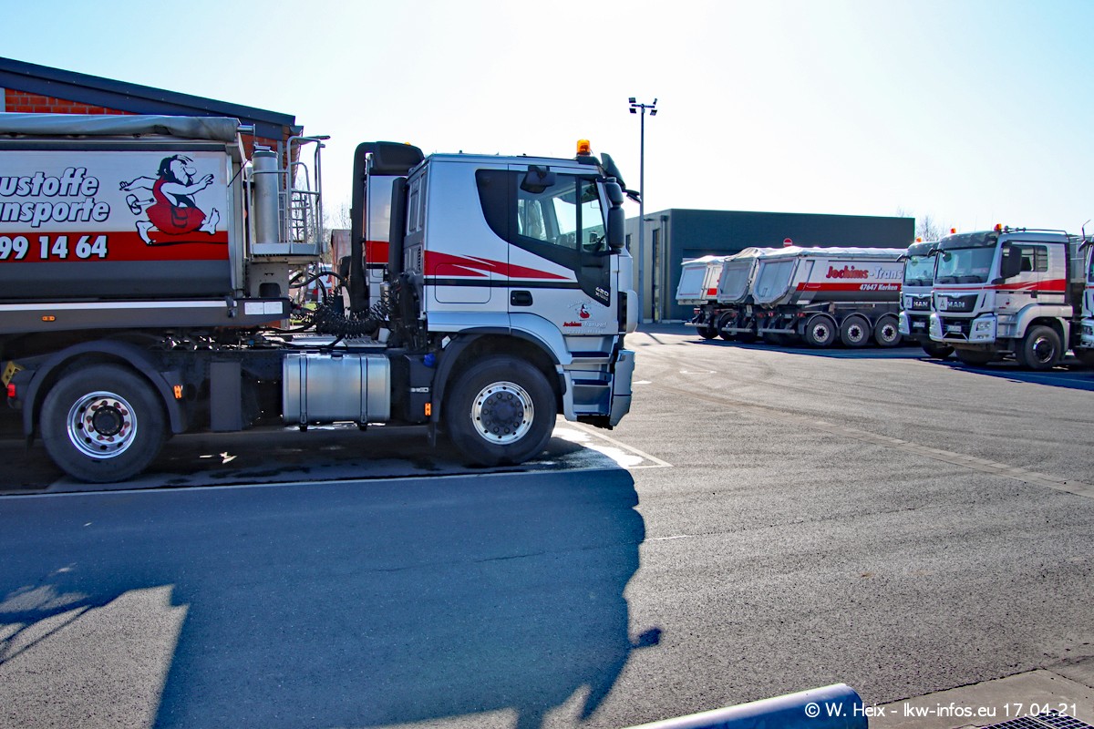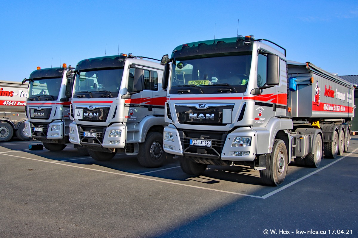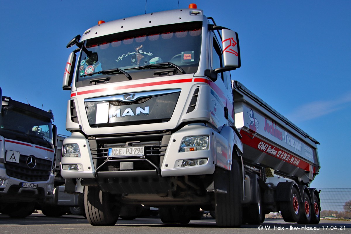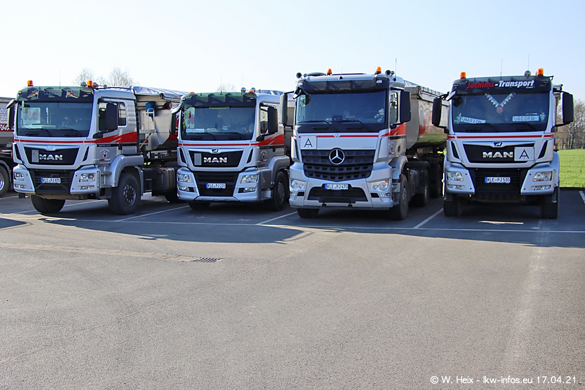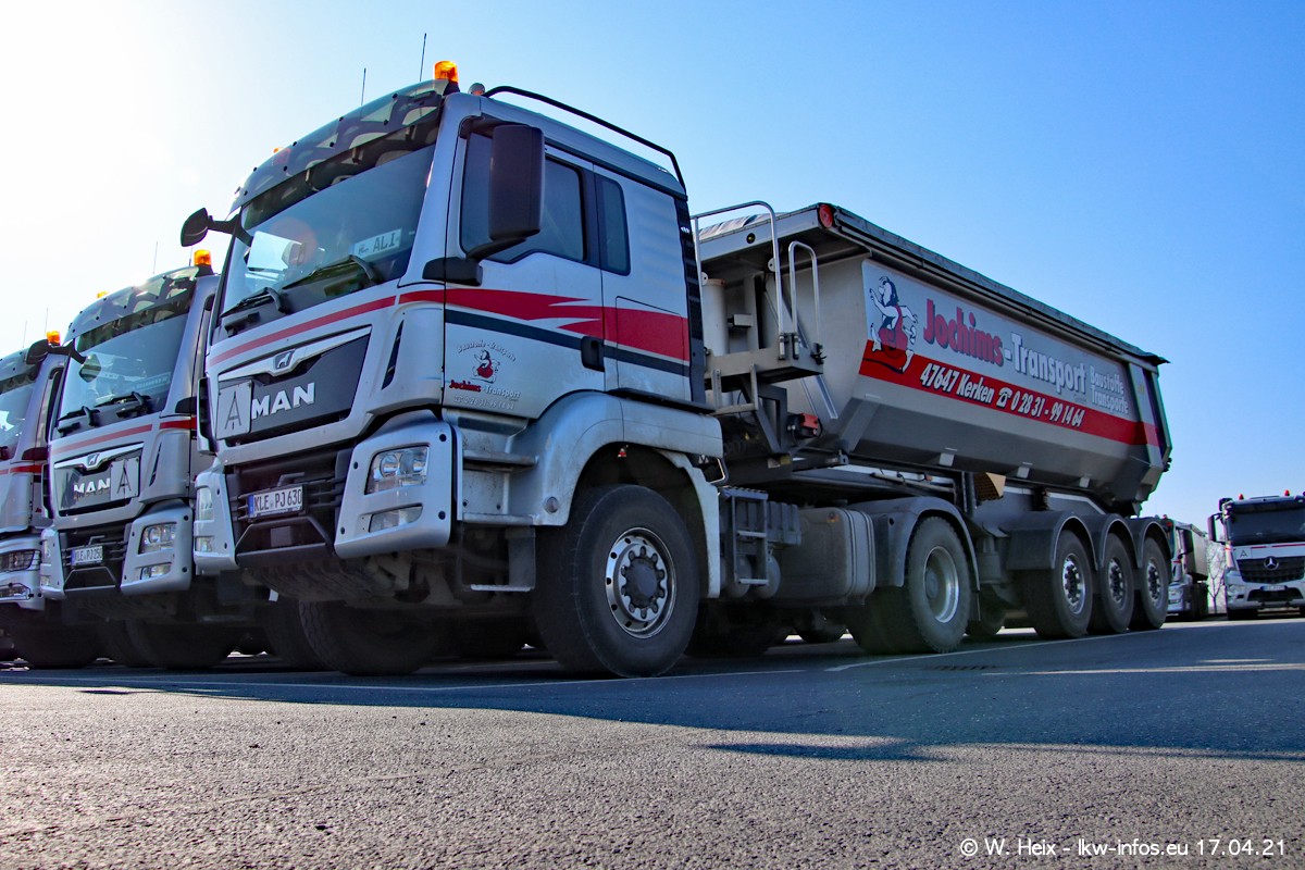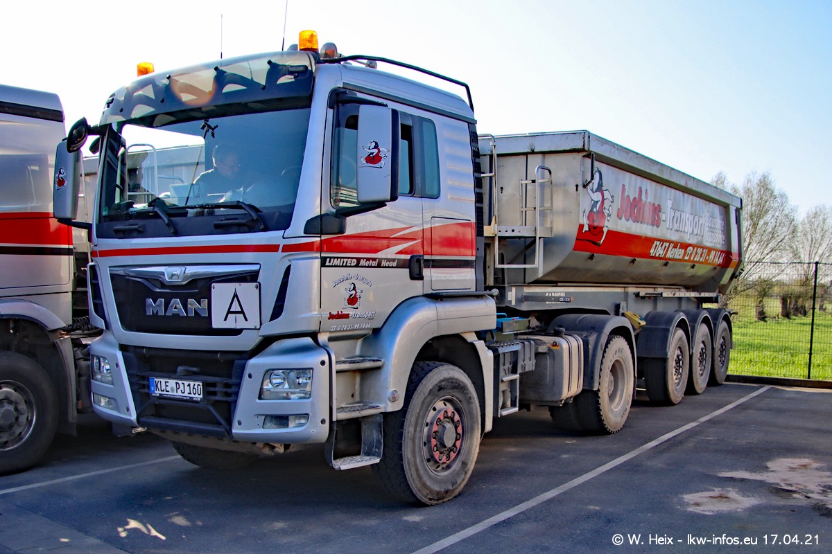 Es sind schon wieder fast 1,5 Jahre vergangen, seit ich zuletzt bei Jochims zu Besuch war. Entsprechend gibt es viele neue LKW. Das sind meines Wissens alles Zugmaschinen von MAN, zu erkennen an den jetzt geänderten Kennzeichen mit der Kombination "KLE JT" und nicht mehr "KLE PJ". Jochims hat in der letzten Zeit noch viele MAN TGS der jetzt alten Baureihe gekauft, aber jetzt ist auch seit einigen Wochen der erste neue MAN TGS im Fuhrpark. Wir haben ein kleines Fotoshooting auf den Gelände gemacht und den alten und den neuen MAN nebeneinander gestellt. Im Sommer kommen voraussichtlich weitere neue LKW. Alle Bilder sind vom Hauptsitz in Kerken, wo ungefähr die Hälfe der Fahrzeuge steht.