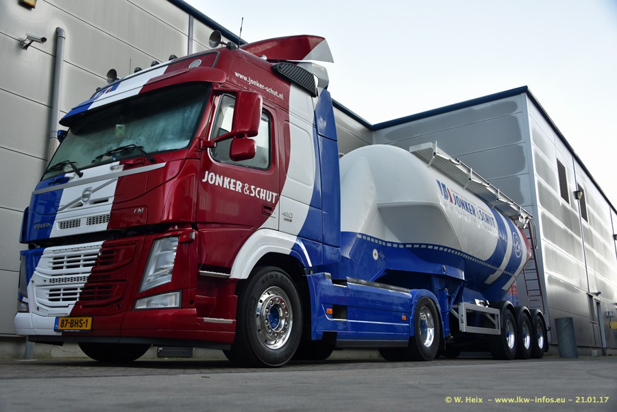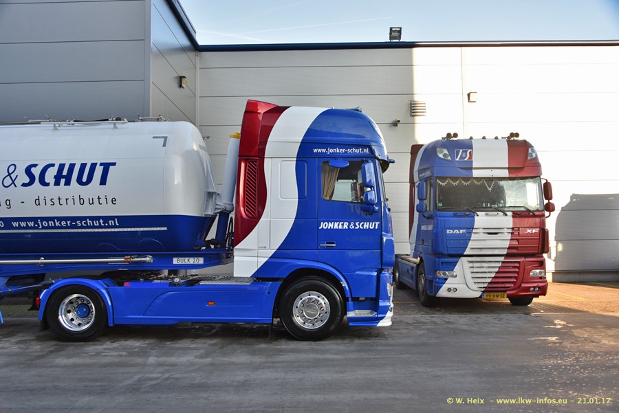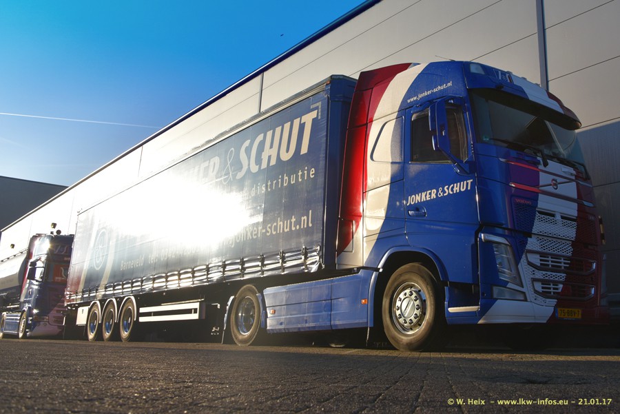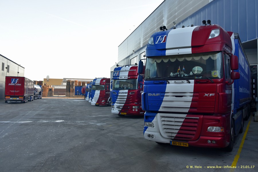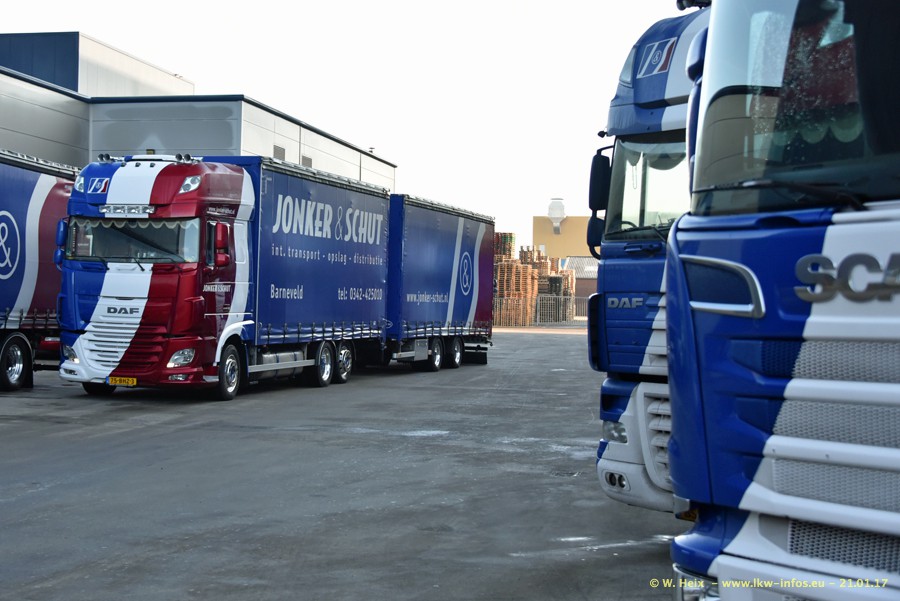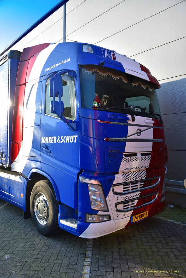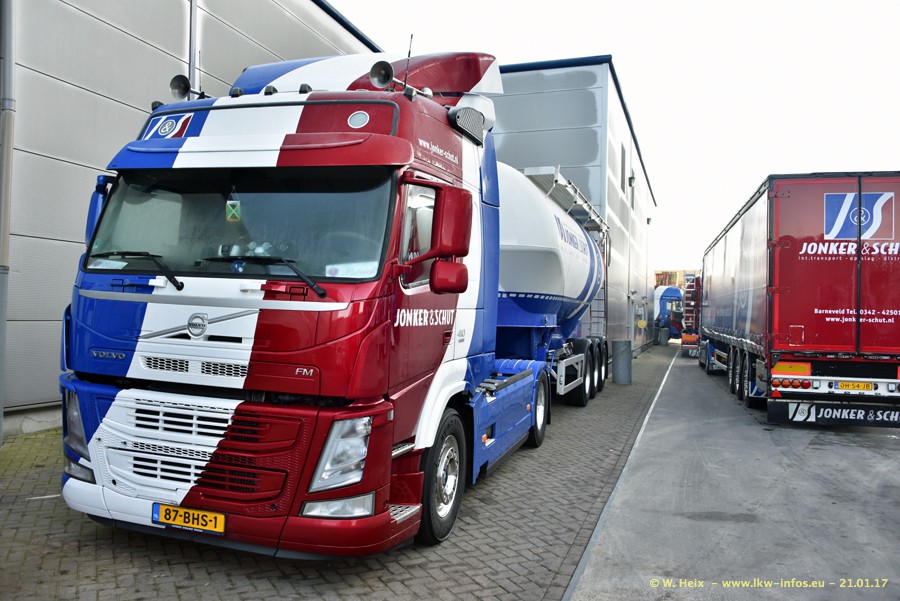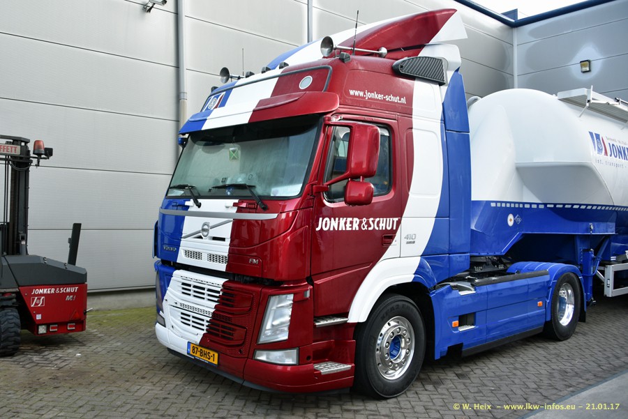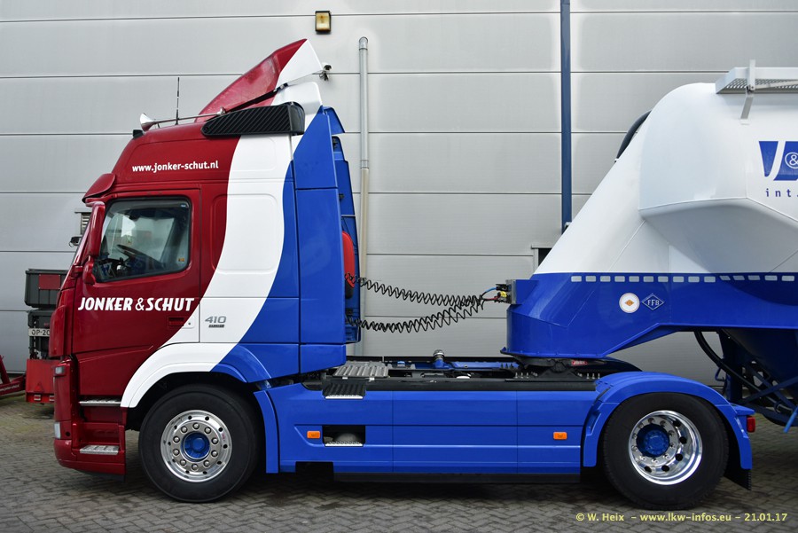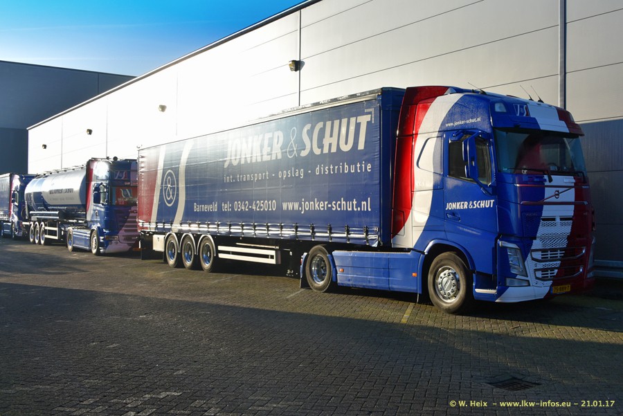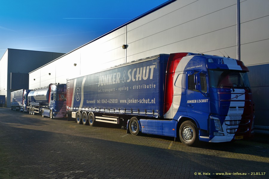 Es gibt wieder neue LKW bei Jonker & Schut: Das sind ein Volvo FM 4 400 mit Siloauflieger und ein DAF XF Euro 6 Planen-Hängerzug. Beides wieder schöne Fahrzeuge. Und auch fast der ganze Fuhrpark war zuhause und konnte fotografiert werden.