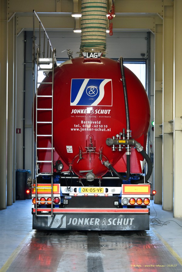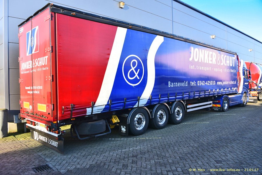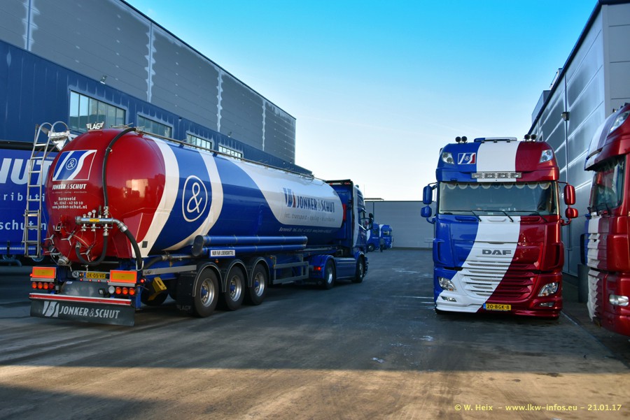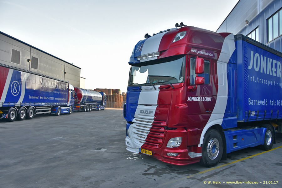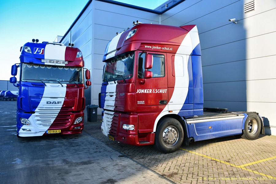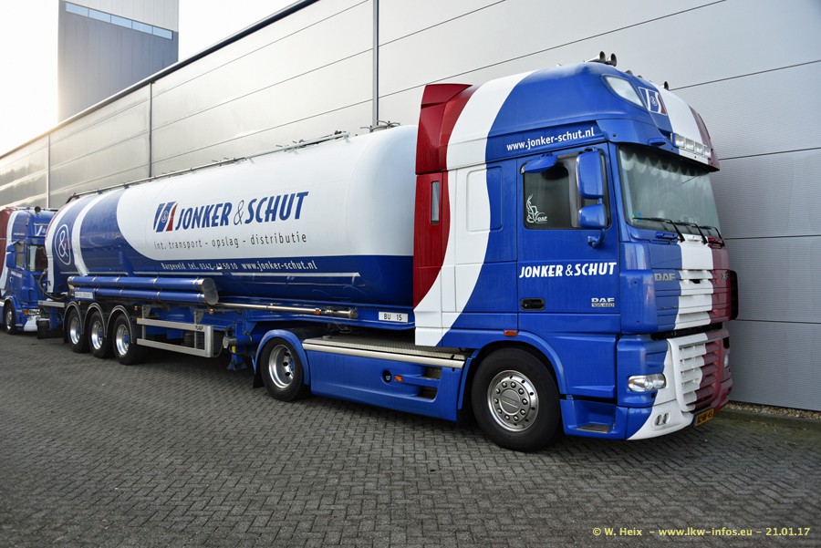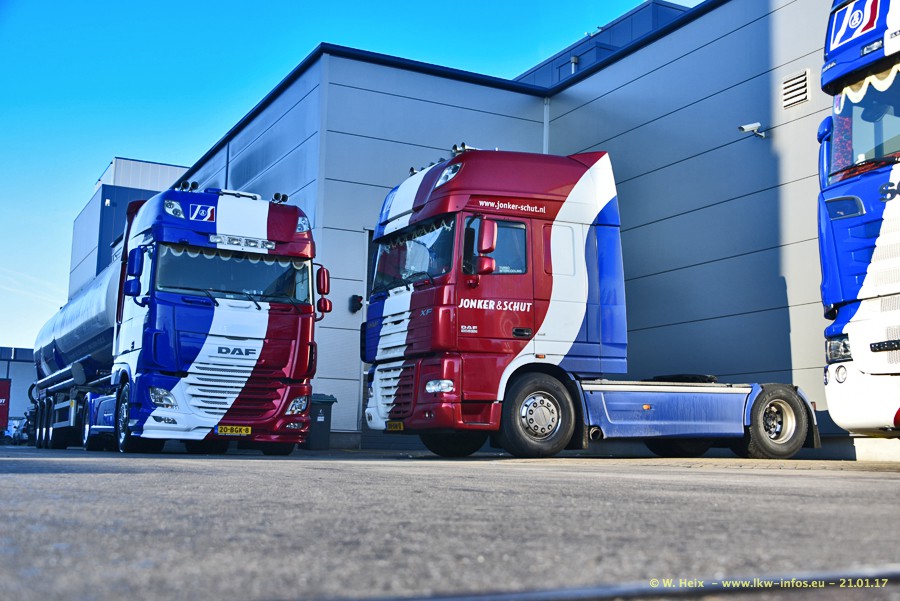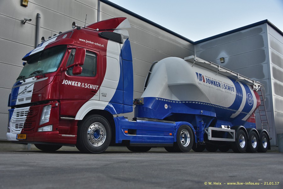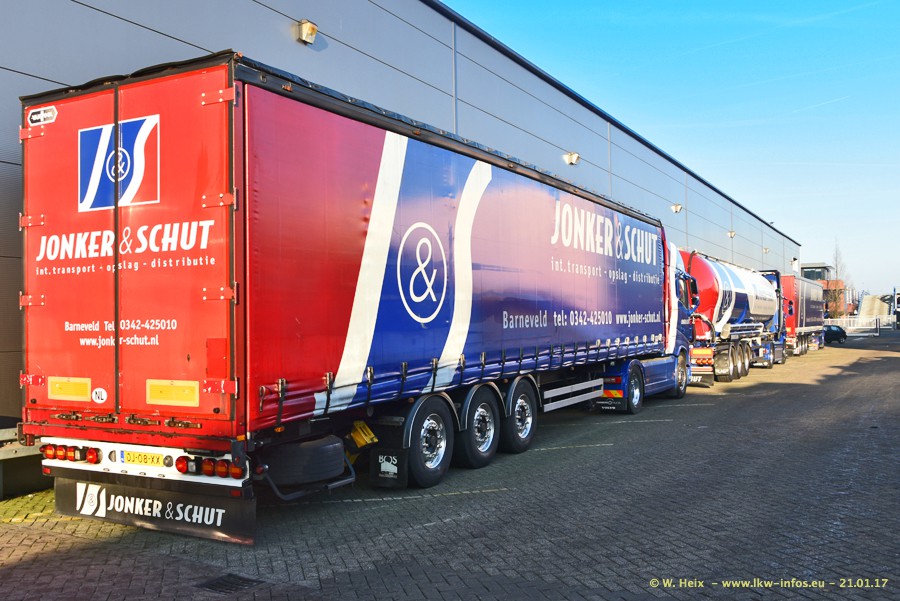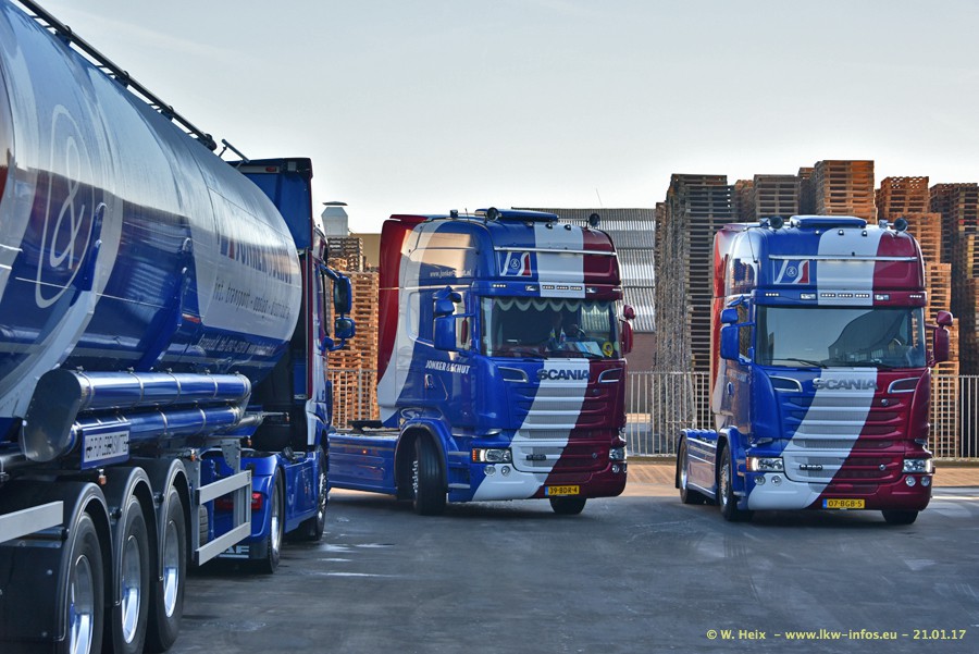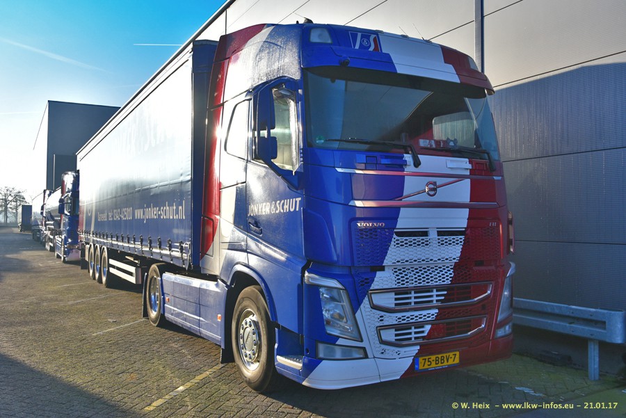 Es gibt wieder neue LKW bei Jonker & Schut: Das sind ein Volvo FM 4 400 mit Siloauflieger und ein DAF XF Euro 6 Planen-Hängerzug. Beides wieder schöne Fahrzeuge. Und auch fast der ganze Fuhrpark war zuhause und konnte fotografiert werden.