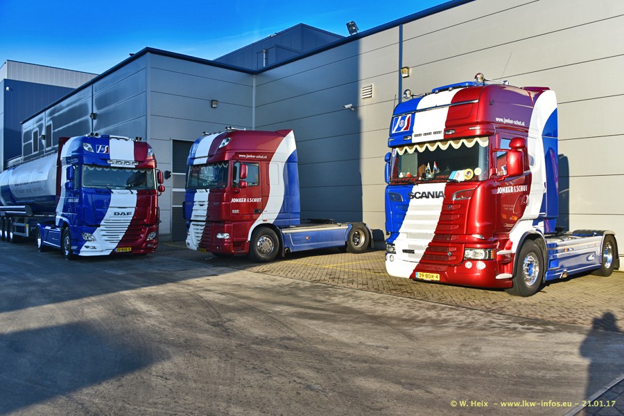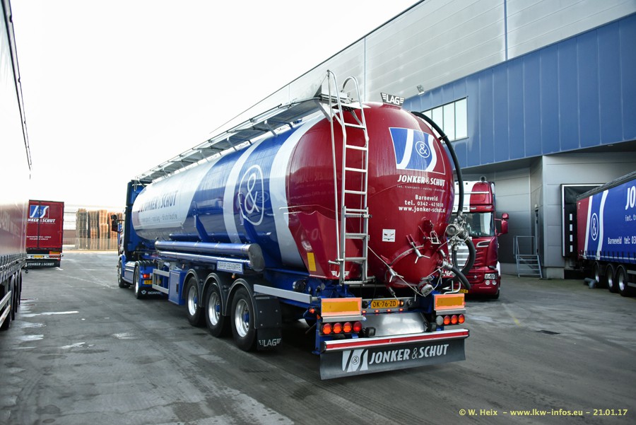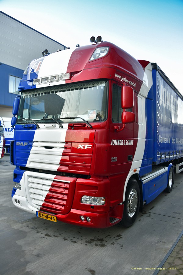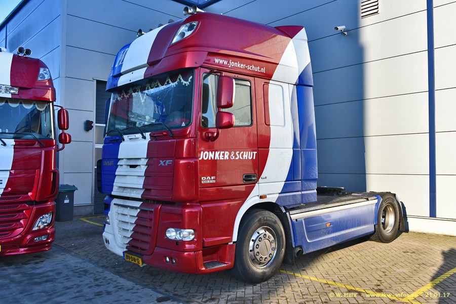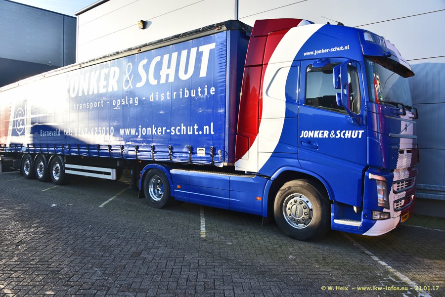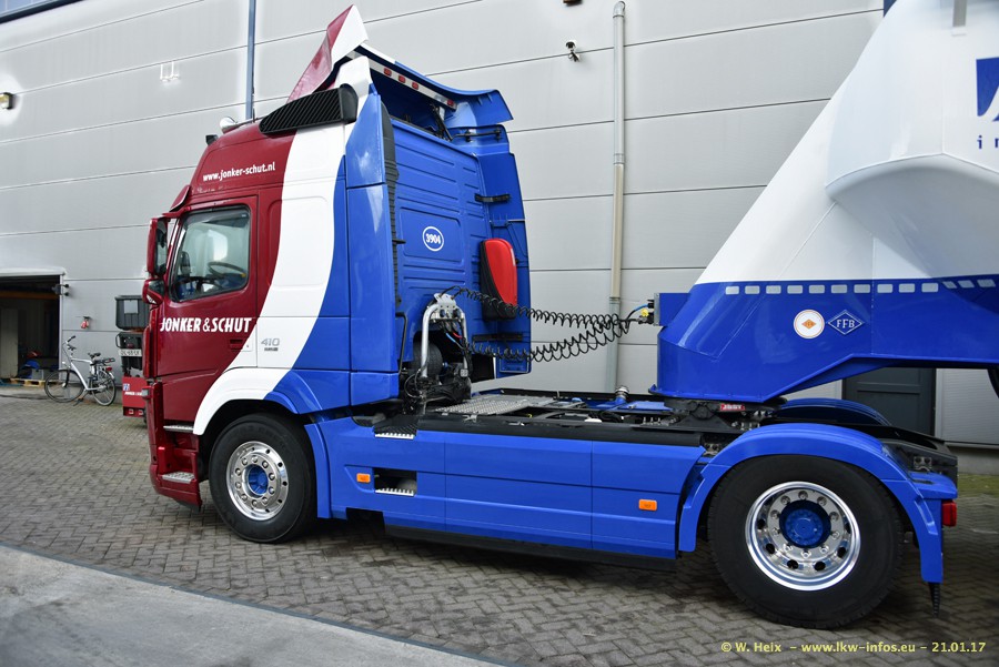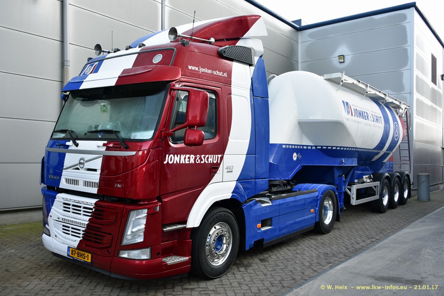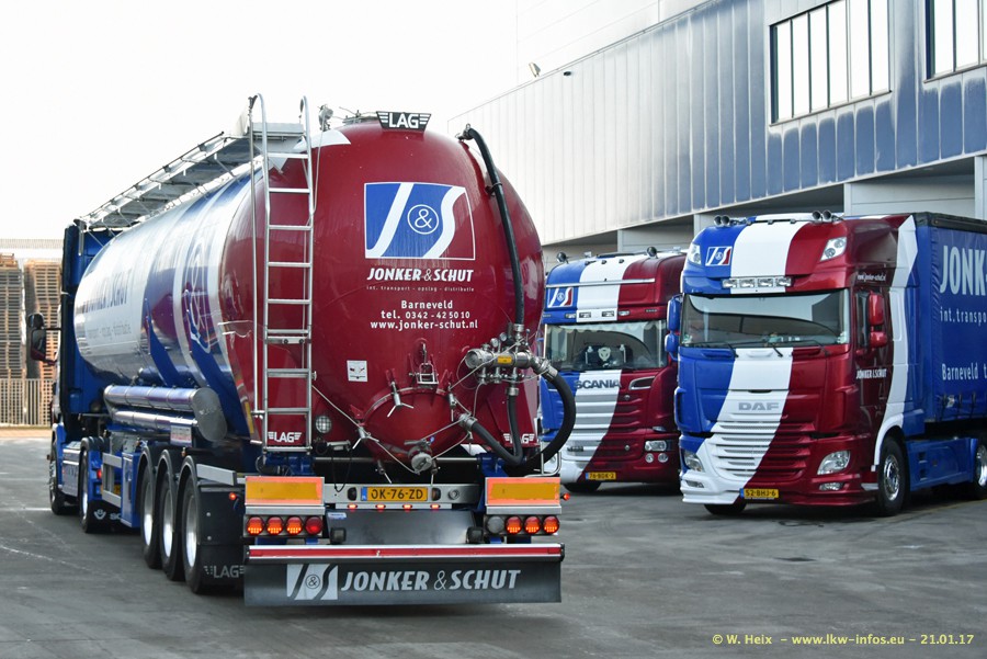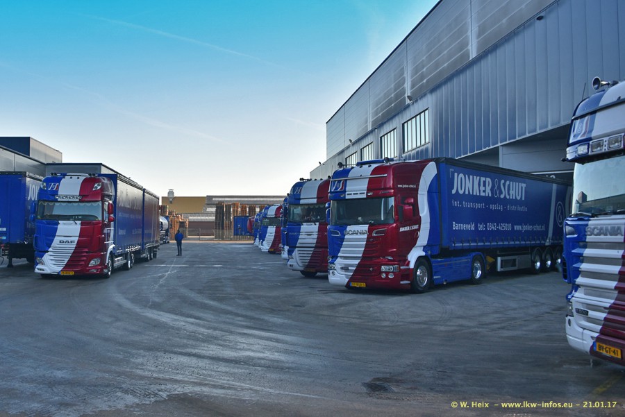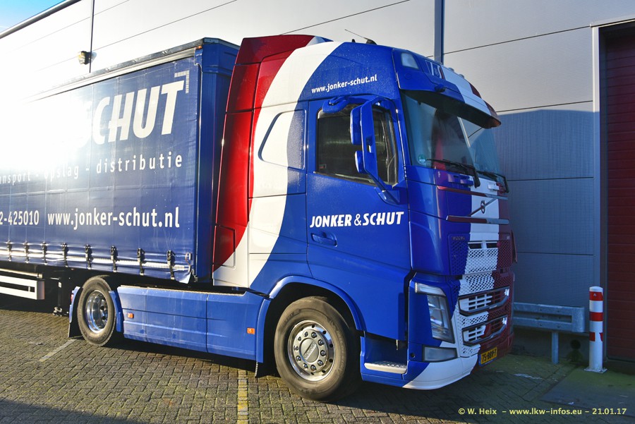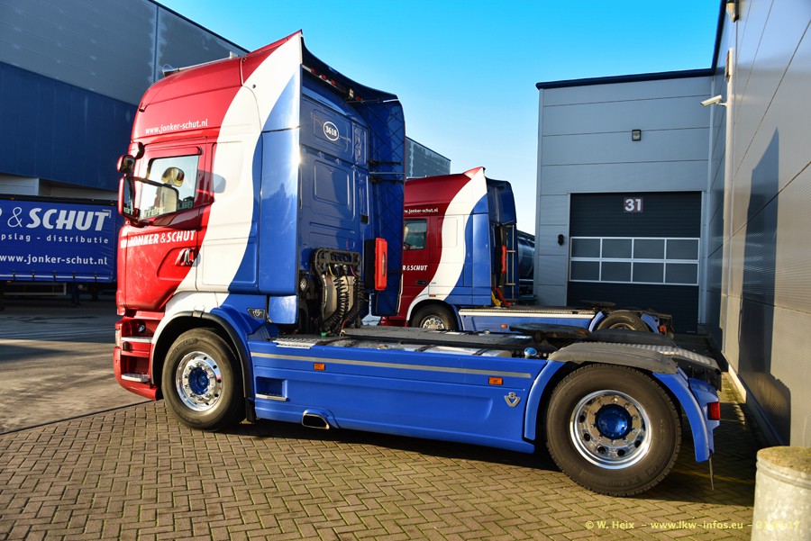 Es gibt wieder neue LKW bei Jonker & Schut: Das sind ein Volvo FM 4 400 mit Siloauflieger und ein DAF XF Euro 6 Planen-Hängerzug. Beides wieder schöne Fahrzeuge. Und auch fast der ganze Fuhrpark war zuhause und konnte fotografiert werden.