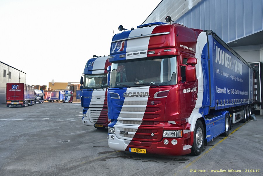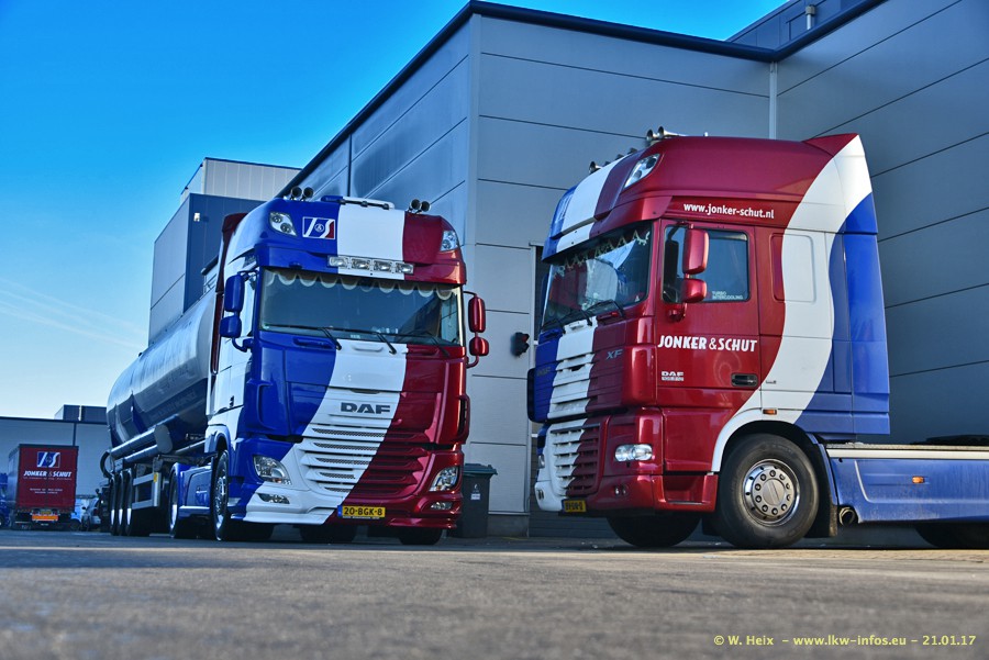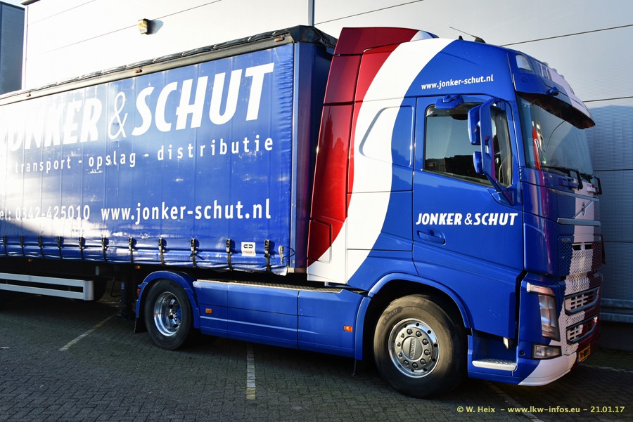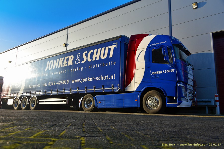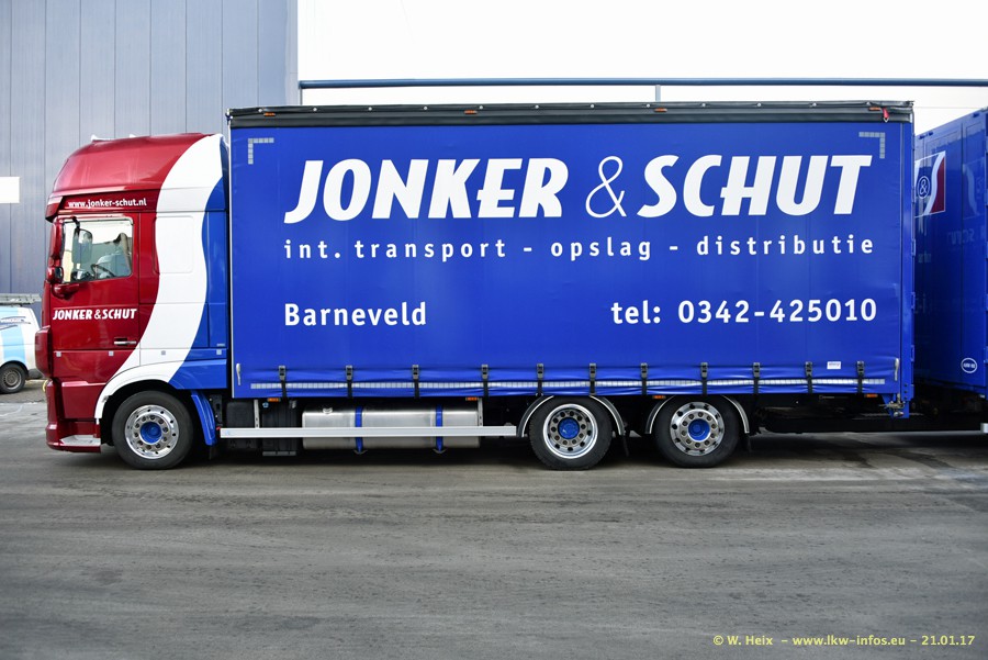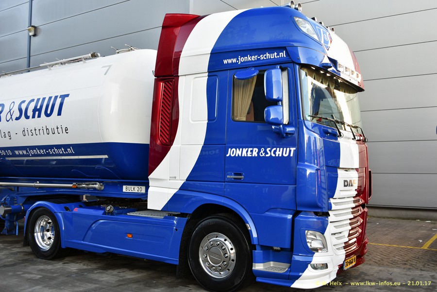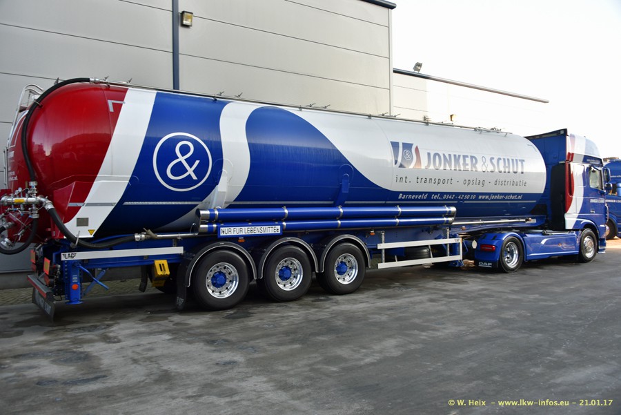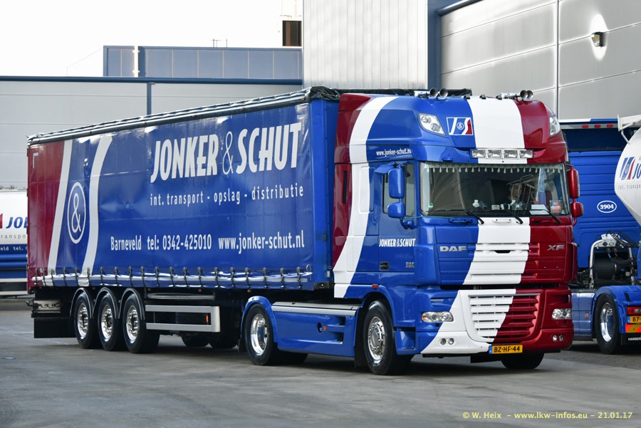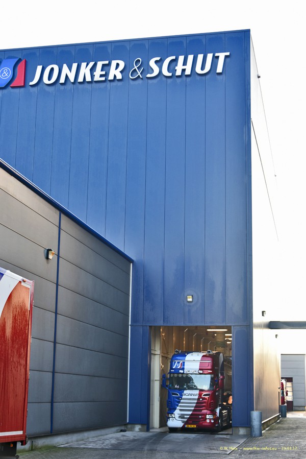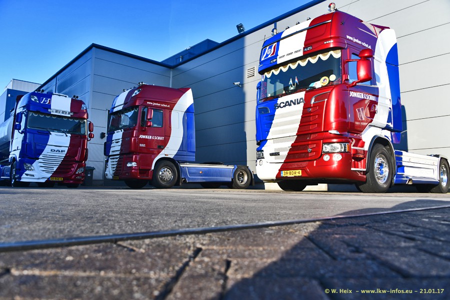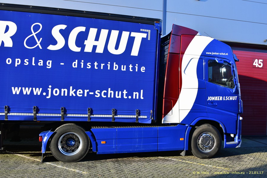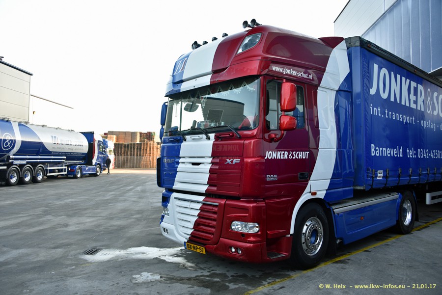 Es gibt wieder neue LKW bei Jonker & Schut: Das sind ein Volvo FM 4 400 mit Siloauflieger und ein DAF XF Euro 6 Planen-Hängerzug. Beides wieder schöne Fahrzeuge. Und auch fast der ganze Fuhrpark war zuhause und konnte fotografiert werden.