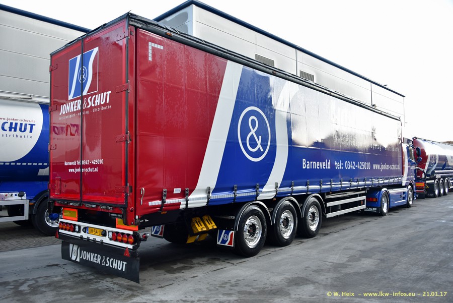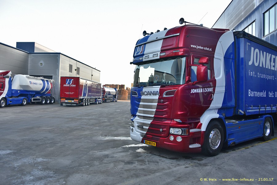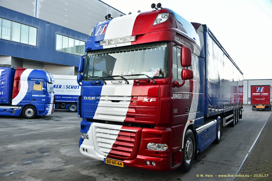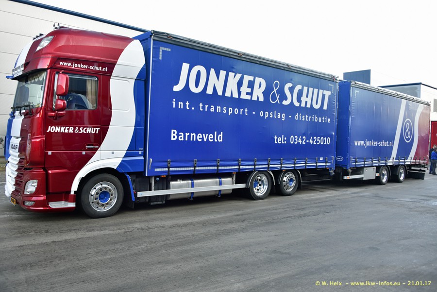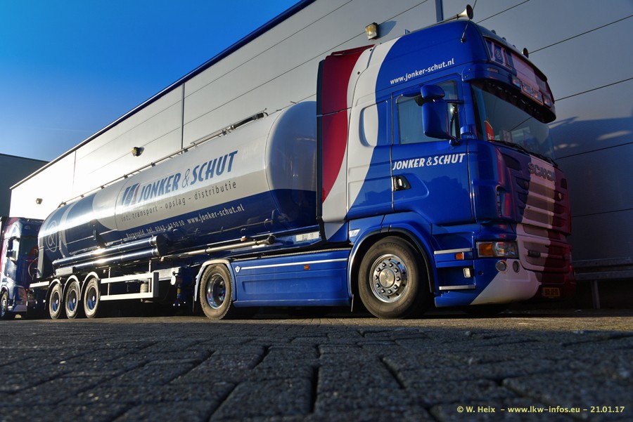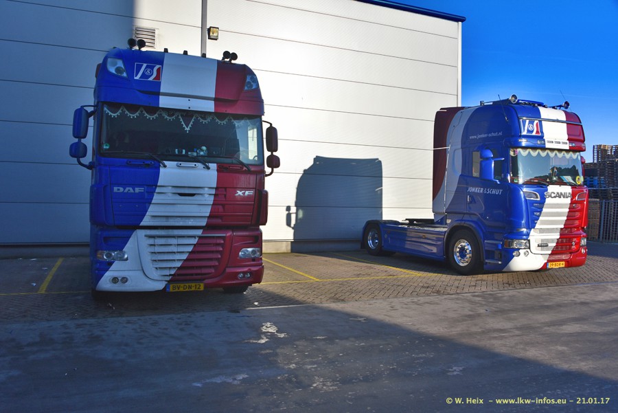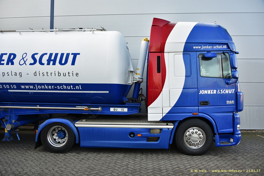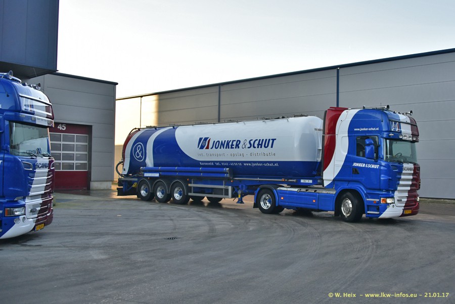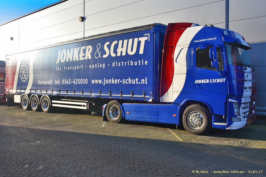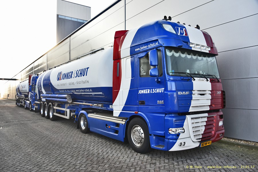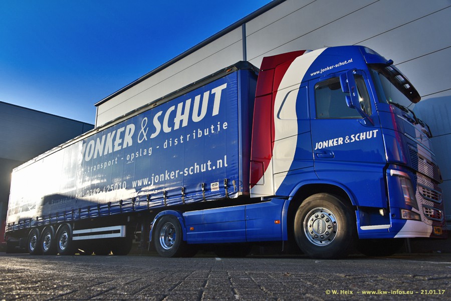 Es gibt wieder neue LKW bei Jonker & Schut: Das sind ein Volvo FM 4 400 mit Siloauflieger und ein DAF XF Euro 6 Planen-Hängerzug. Beides wieder schöne Fahrzeuge. Und auch fast der ganze Fuhrpark war zuhause und konnte fotografiert werden.