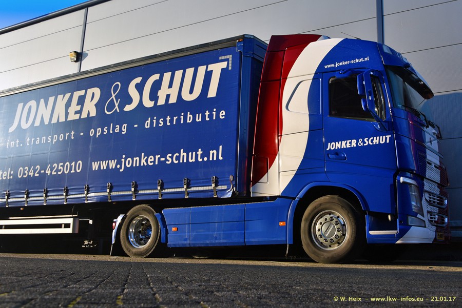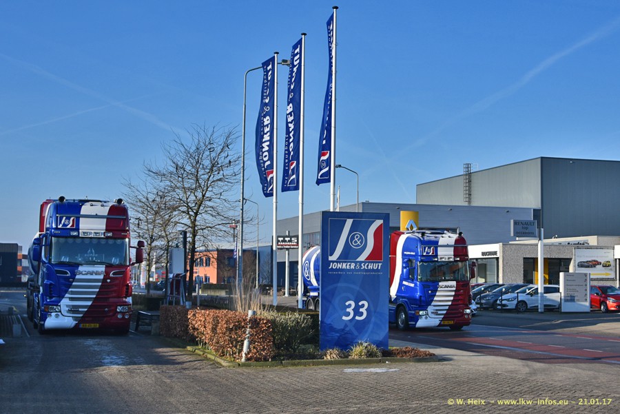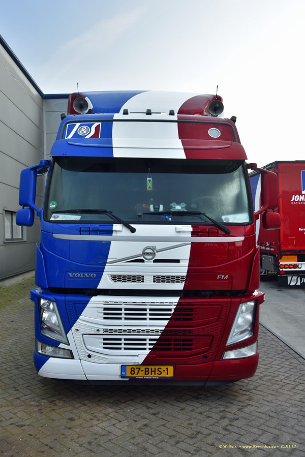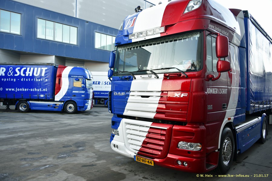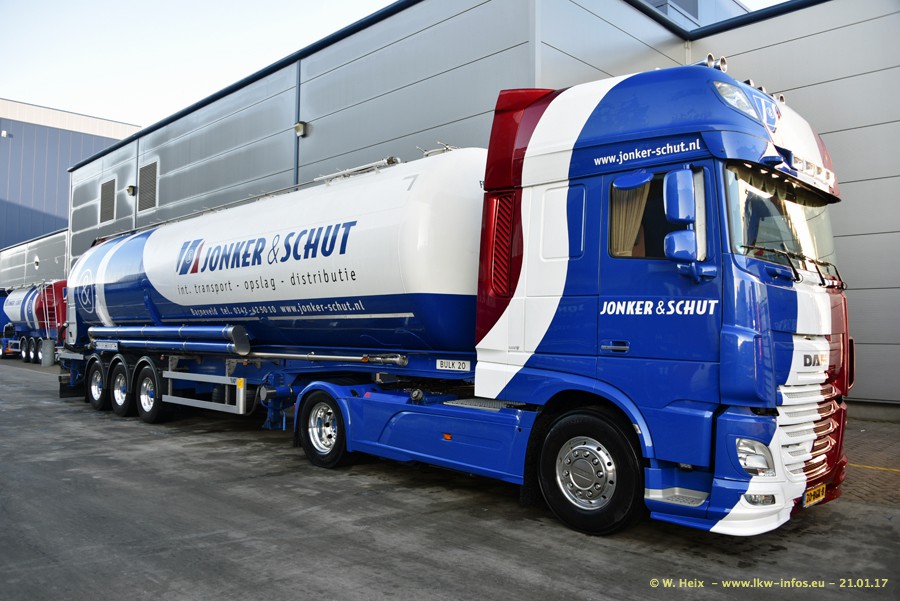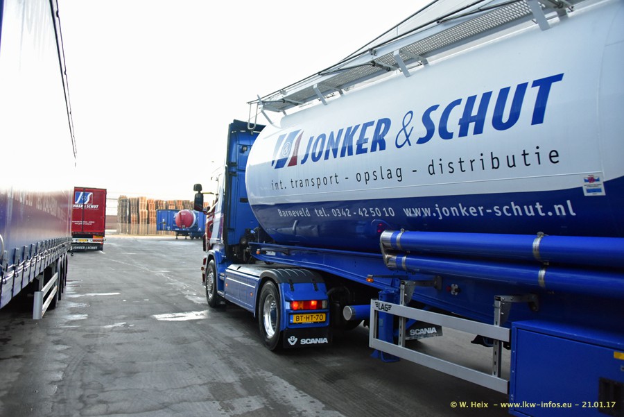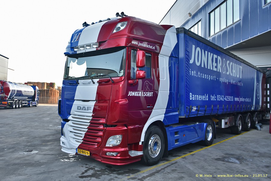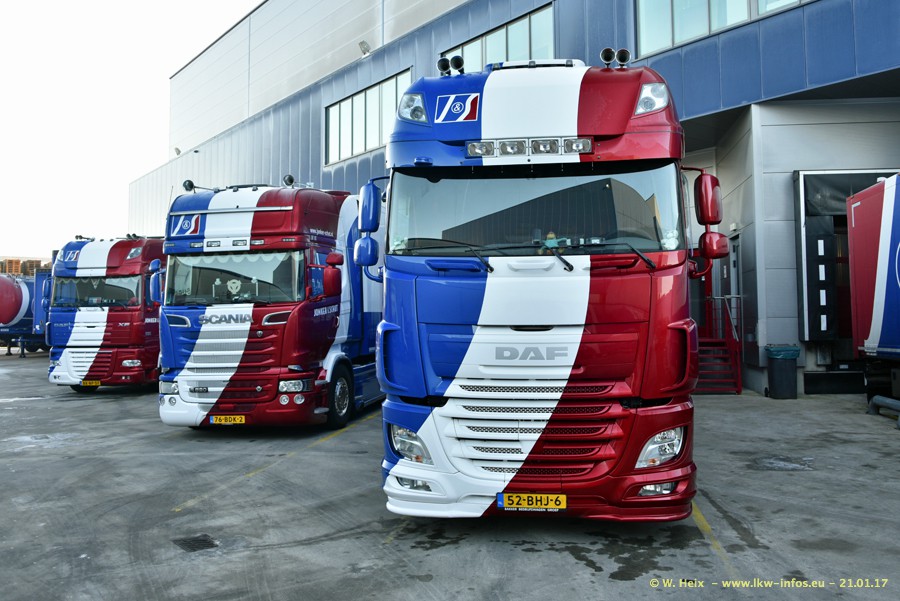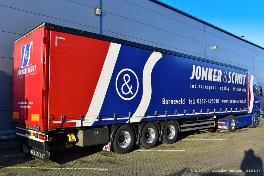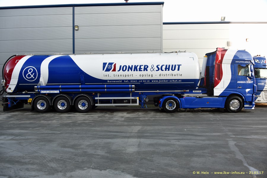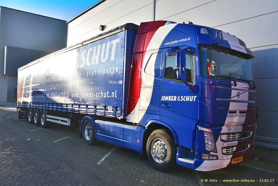 Es gibt wieder neue LKW bei Jonker & Schut: Das sind ein Volvo FM 4 400 mit Siloauflieger und ein DAF XF Euro 6 Planen-Hängerzug. Beides wieder schöne Fahrzeuge. Und auch fast der ganze Fuhrpark war zuhause und konnte fotografiert werden.