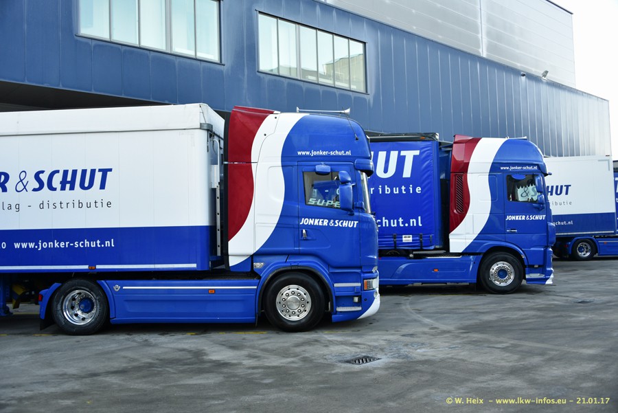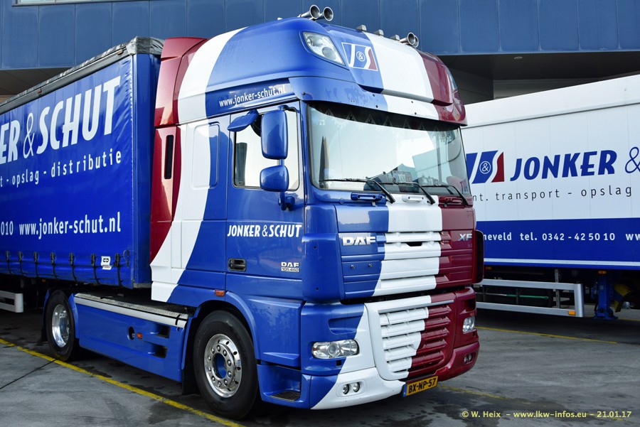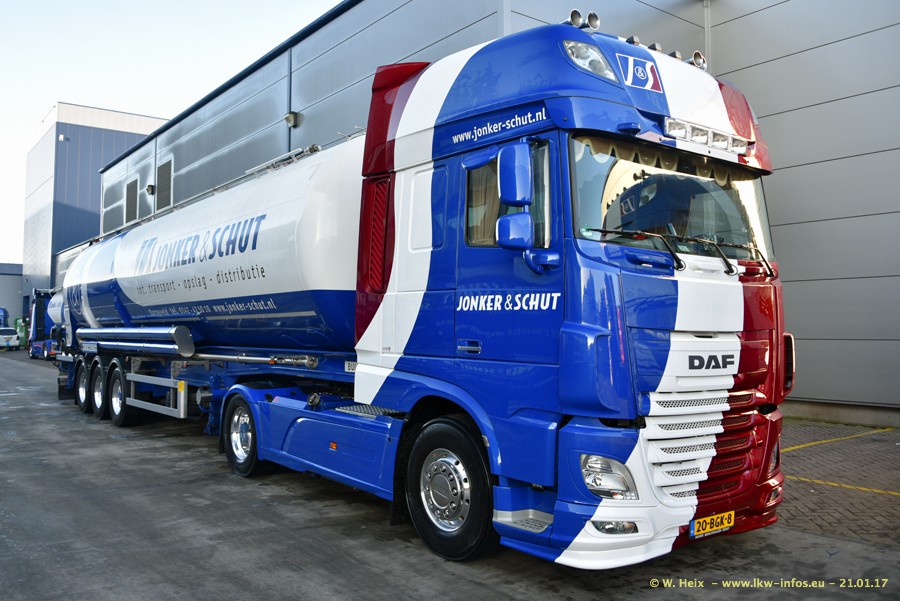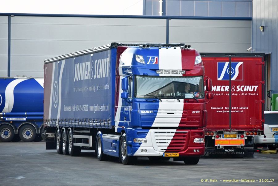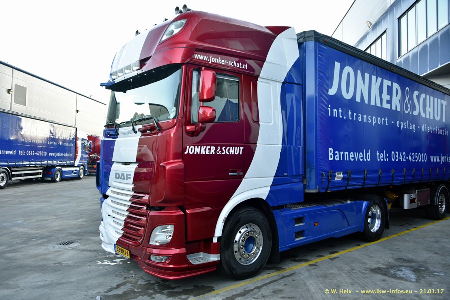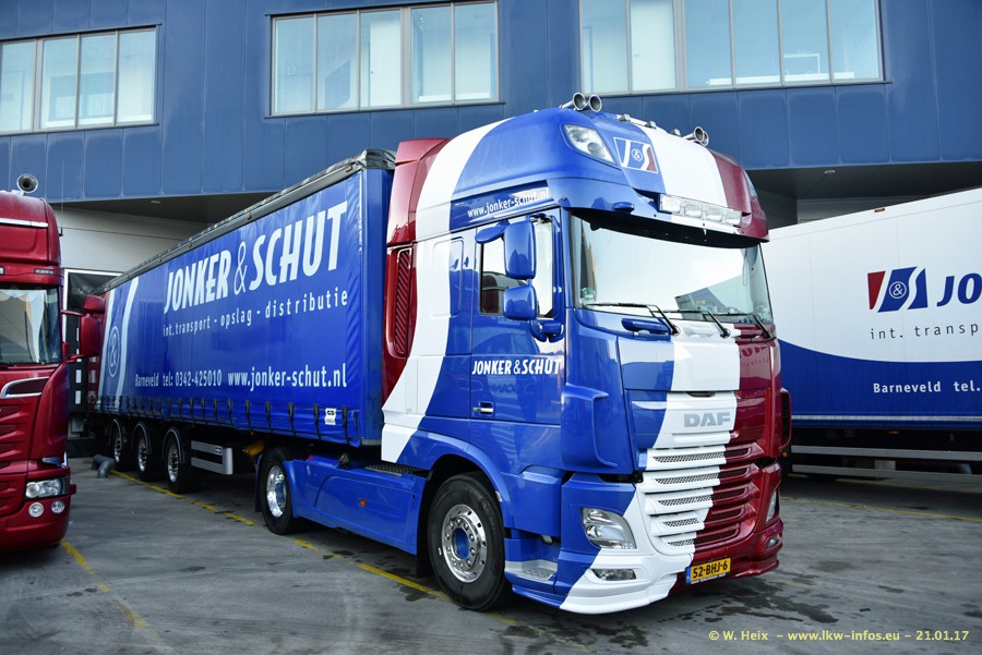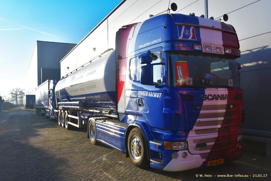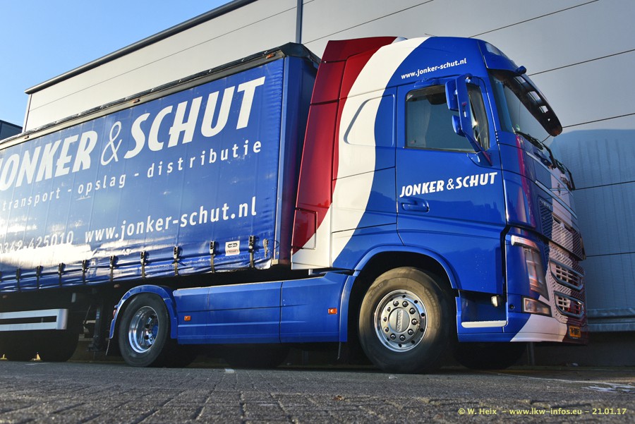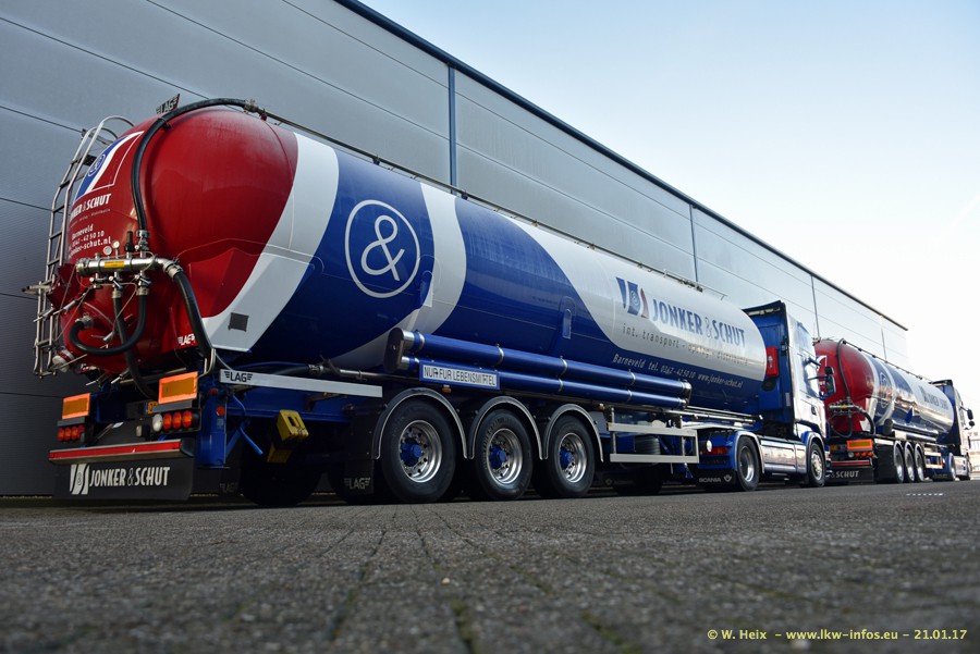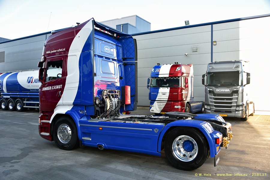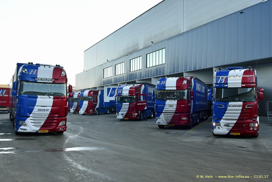 Es gibt wieder neue LKW bei Jonker & Schut: Das sind ein Volvo FM 4 400 mit Siloauflieger und ein DAF XF Euro 6 Planen-Hängerzug. Beides wieder schöne Fahrzeuge. Und auch fast der ganze Fuhrpark war zuhause und konnte fotografiert werden.