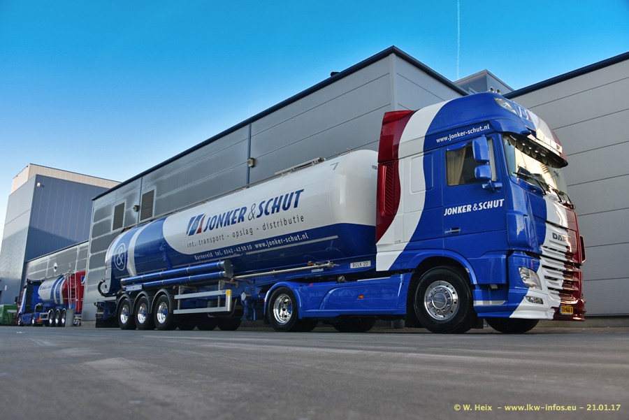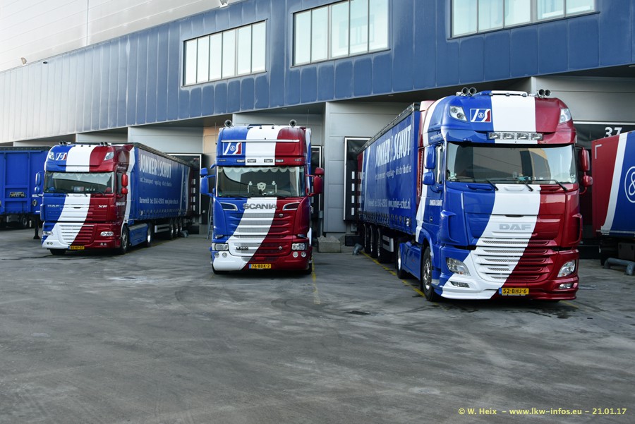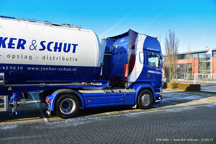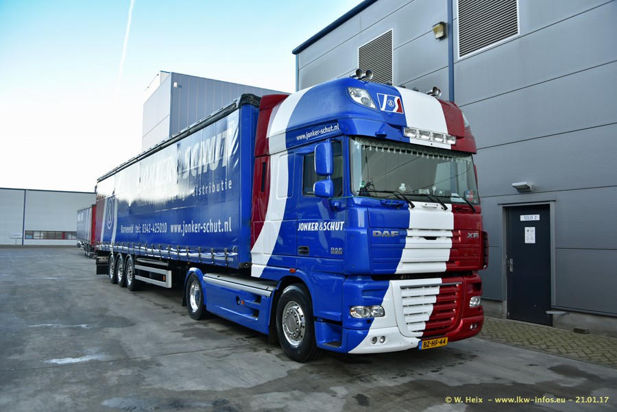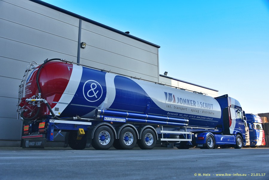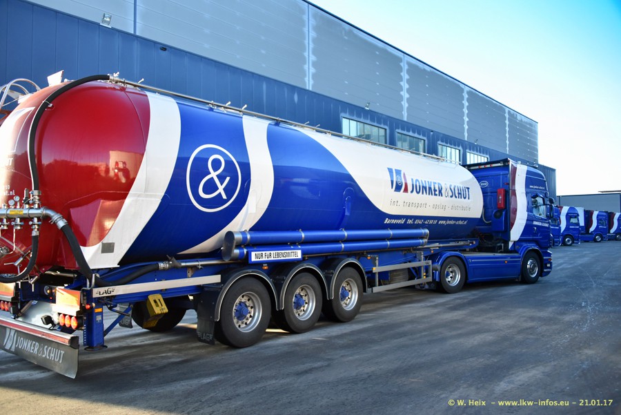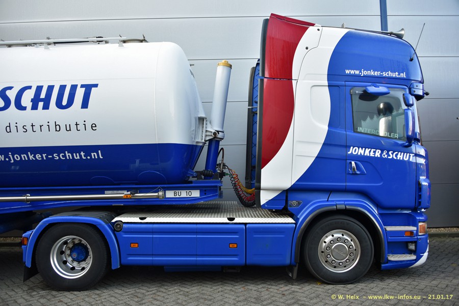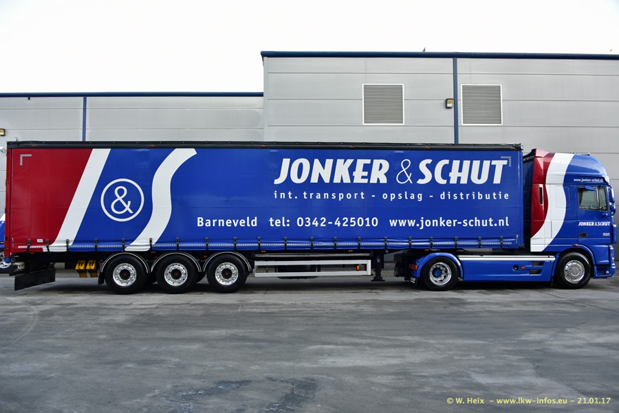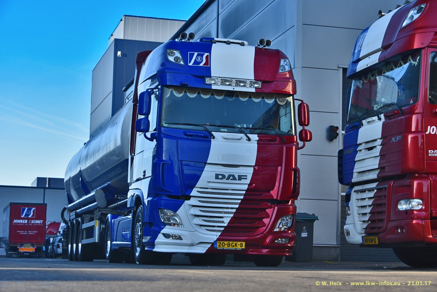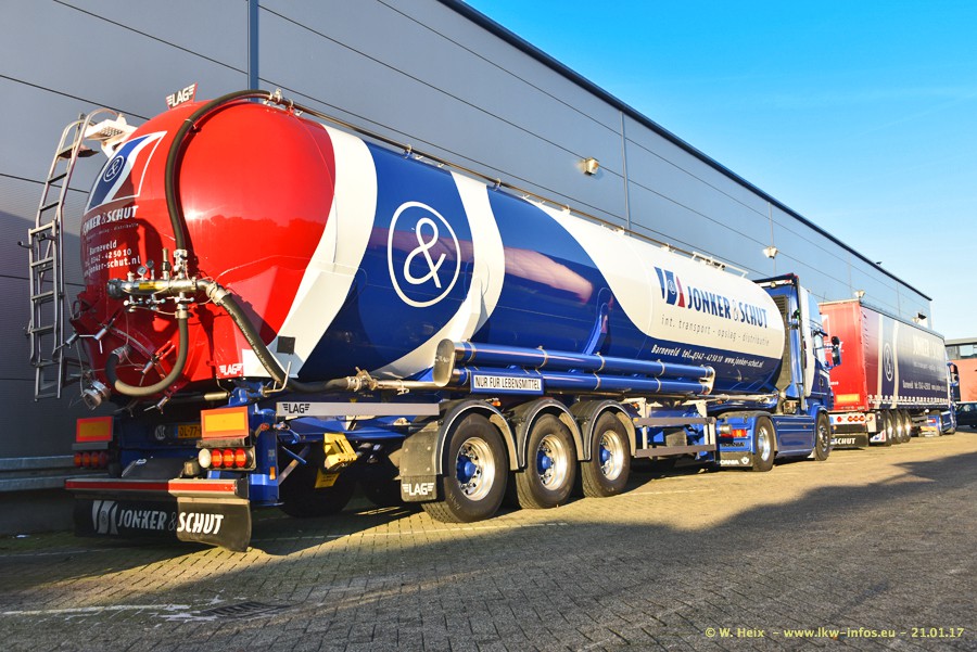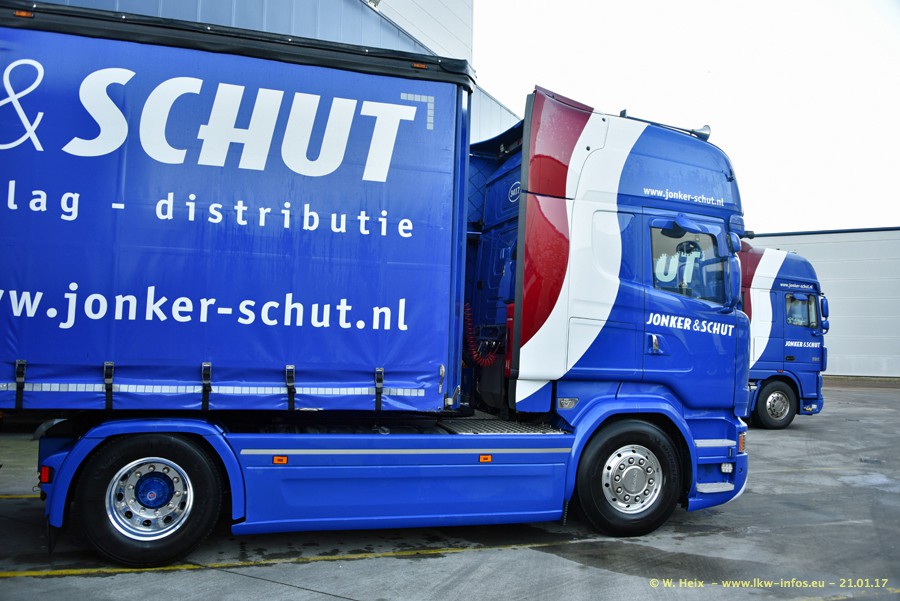 Es gibt wieder neue LKW bei Jonker & Schut: Das sind ein Volvo FM 4 400 mit Siloauflieger und ein DAF XF Euro 6 Planen-Hängerzug. Beides wieder schöne Fahrzeuge. Und auch fast der ganze Fuhrpark war zuhause und konnte fotografiert werden.