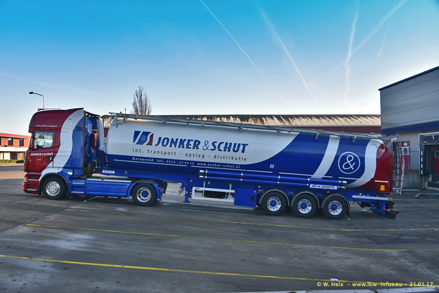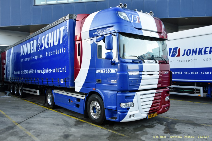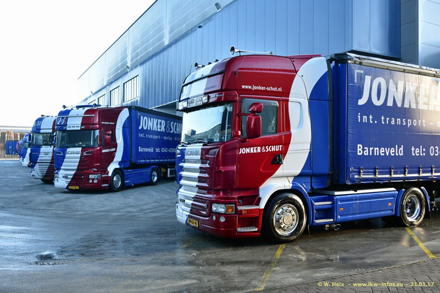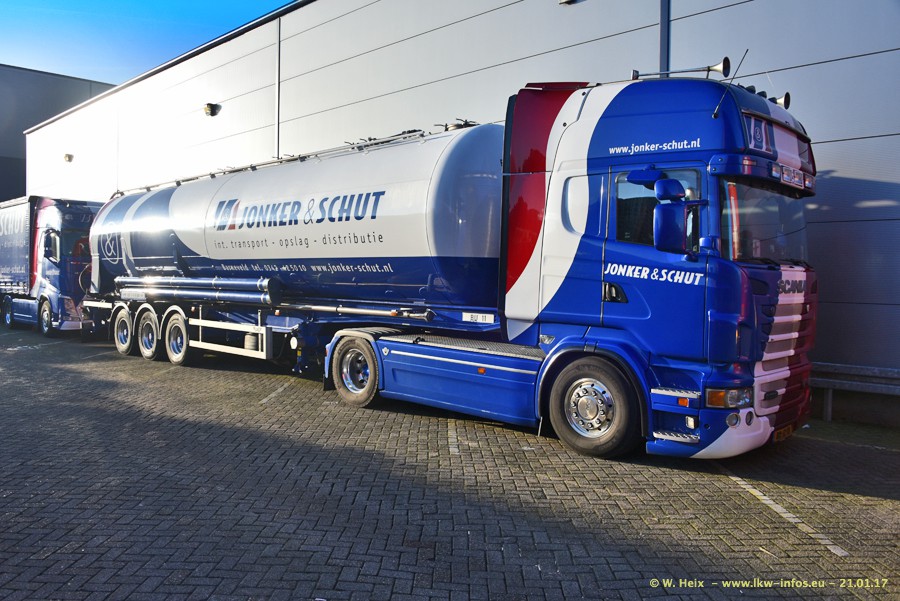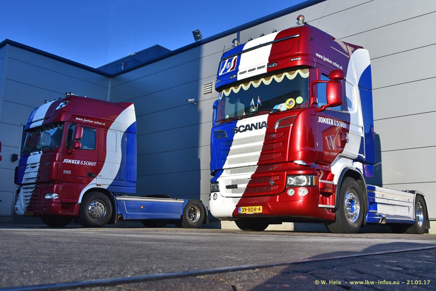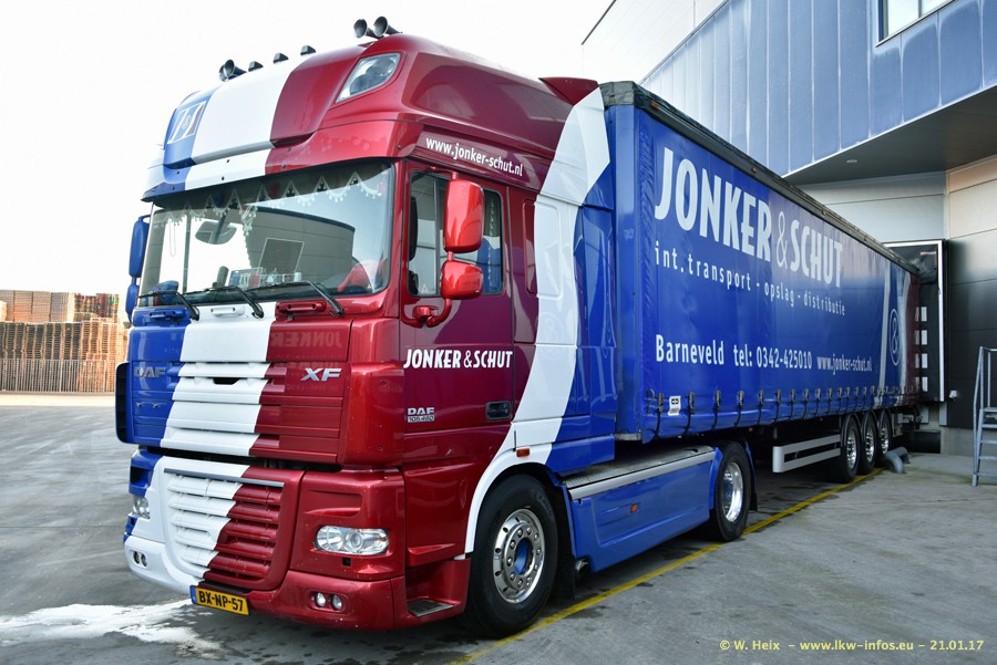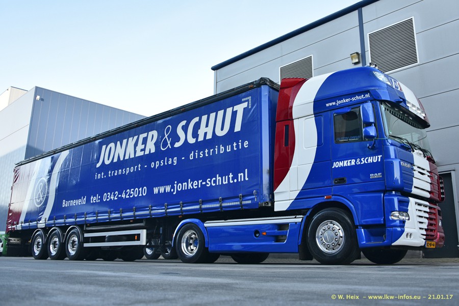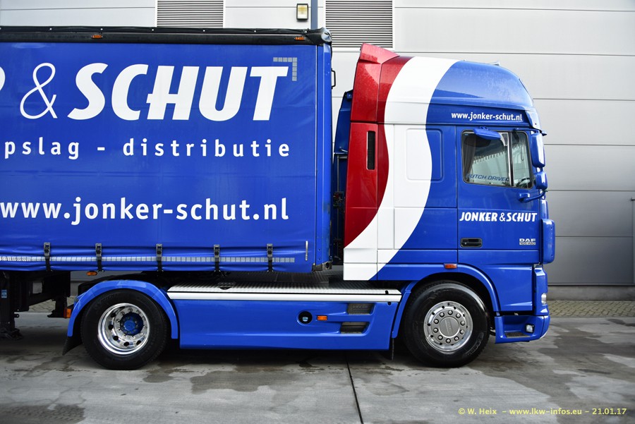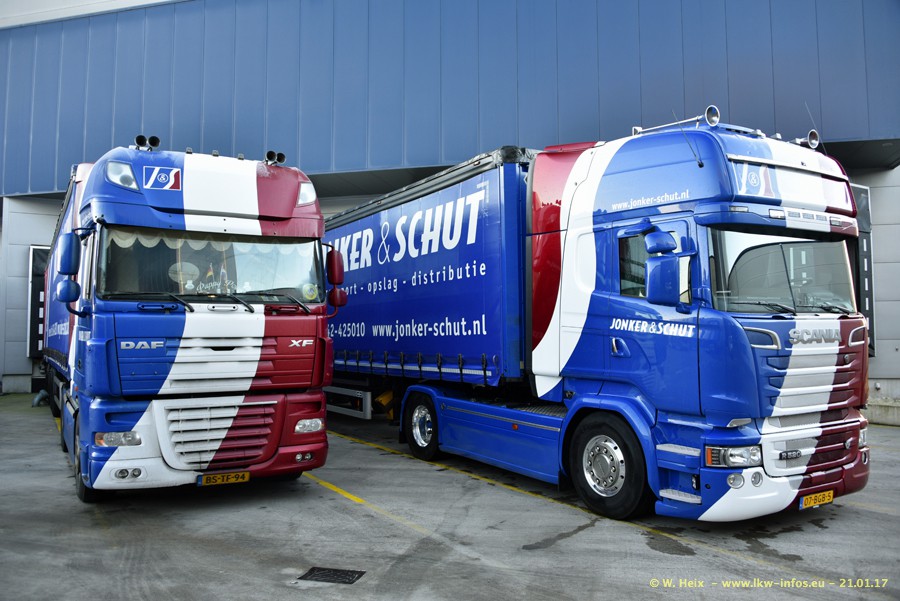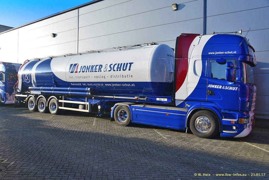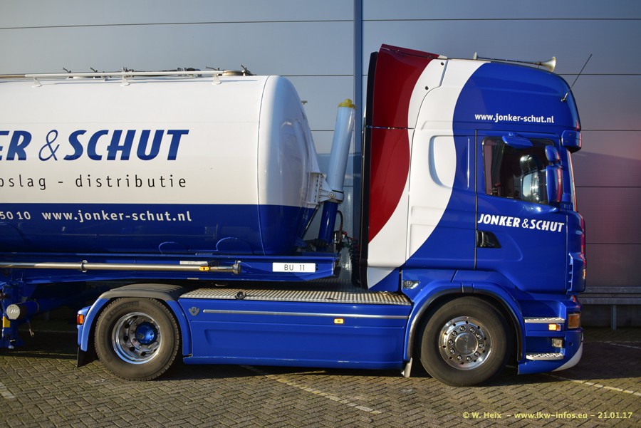 Es gibt wieder neue LKW bei Jonker & Schut: Das sind ein Volvo FM 4 400 mit Siloauflieger und ein DAF XF Euro 6 Planen-Hängerzug. Beides wieder schöne Fahrzeuge. Und auch fast der ganze Fuhrpark war zuhause und konnte fotografiert werden.