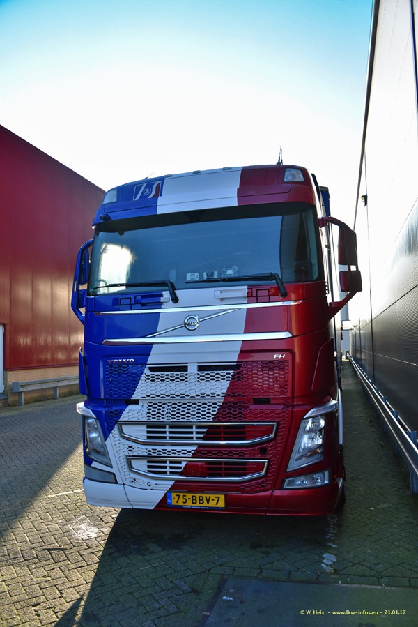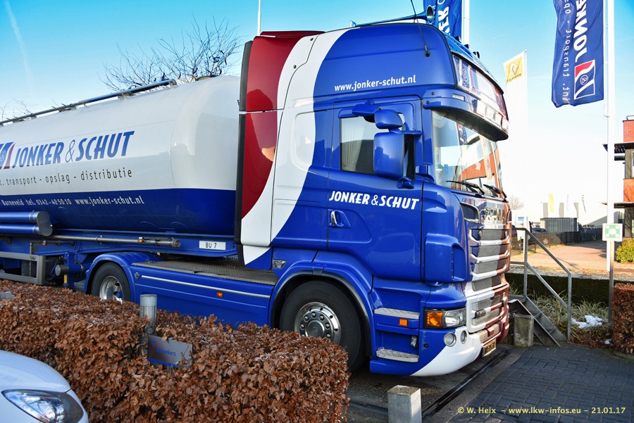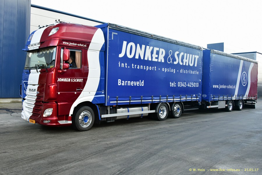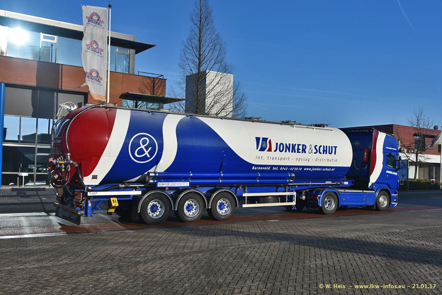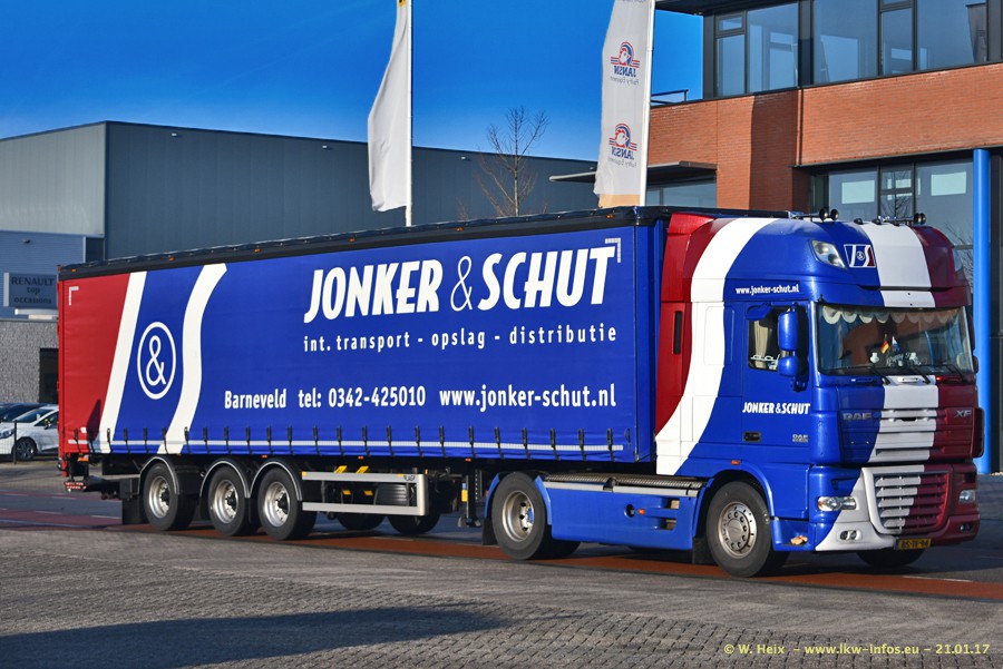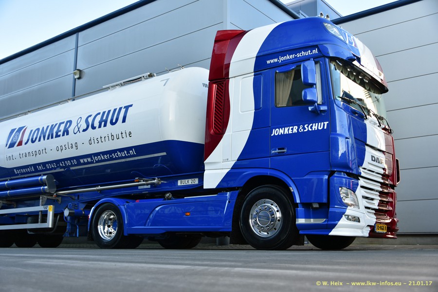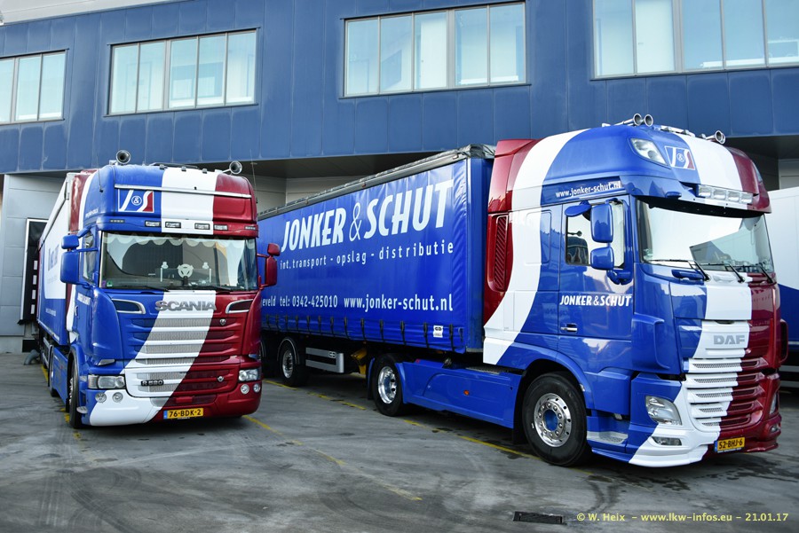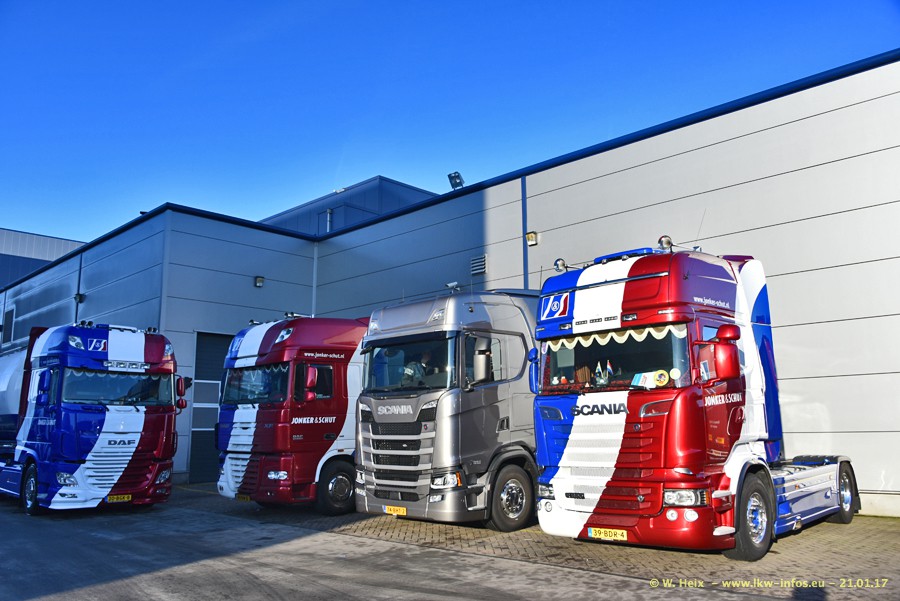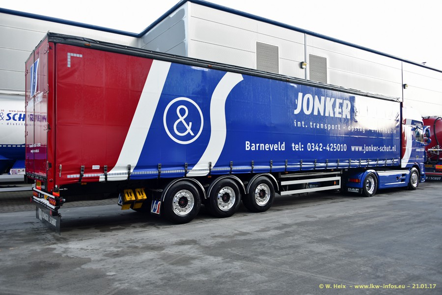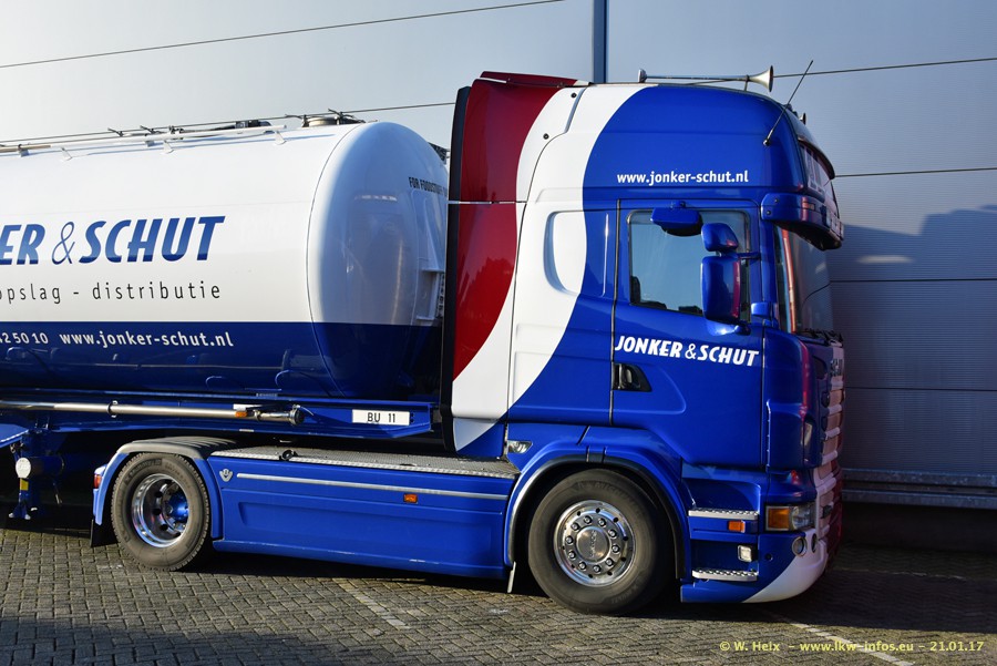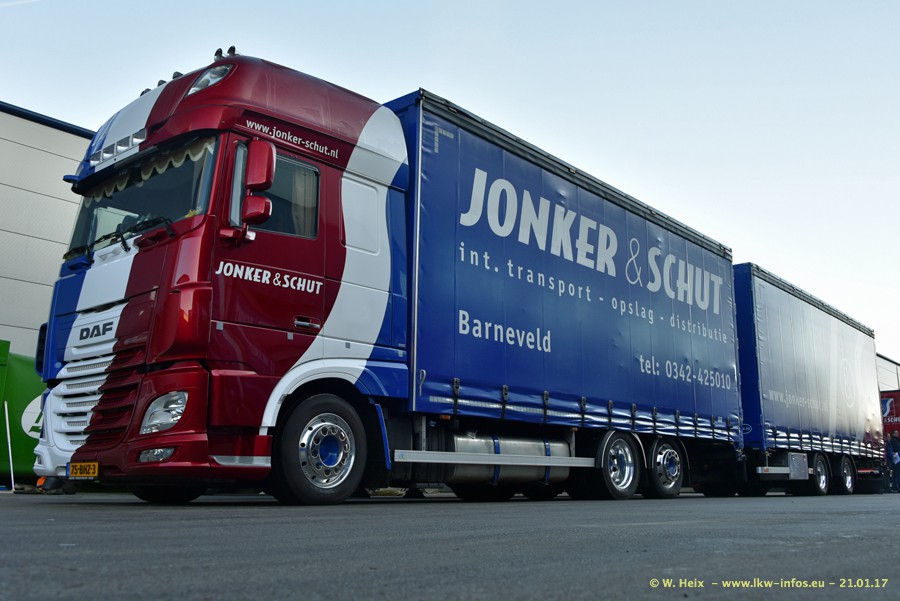 Es gibt wieder neue LKW bei Jonker & Schut: Das sind ein Volvo FM 4 400 mit Siloauflieger und ein DAF XF Euro 6 Planen-Hängerzug. Beides wieder schöne Fahrzeuge. Und auch fast der ganze Fuhrpark war zuhause und konnte fotografiert werden.