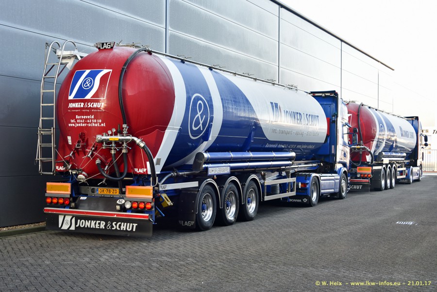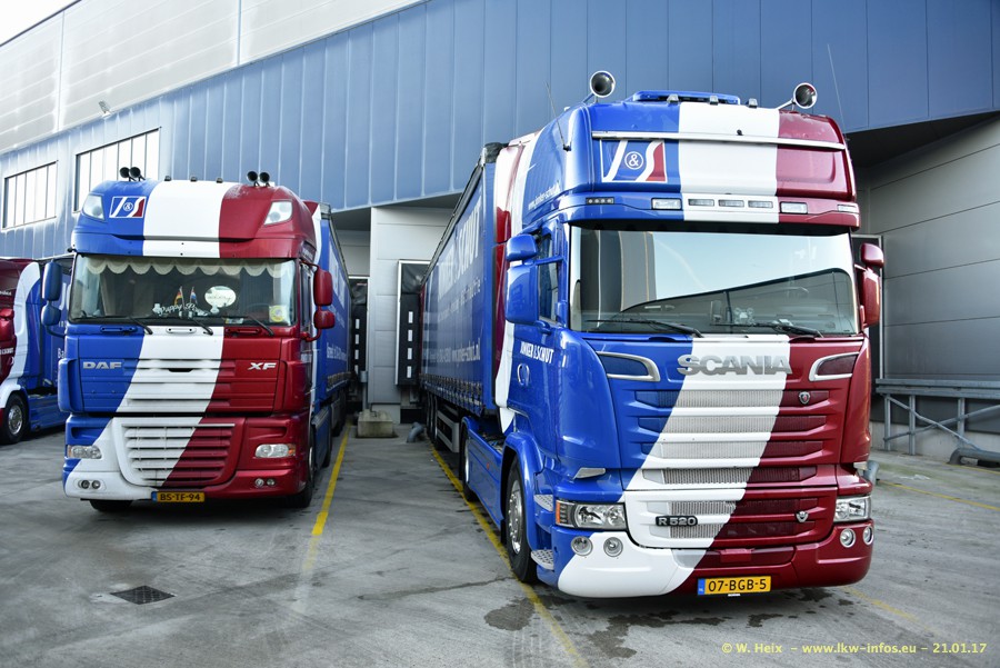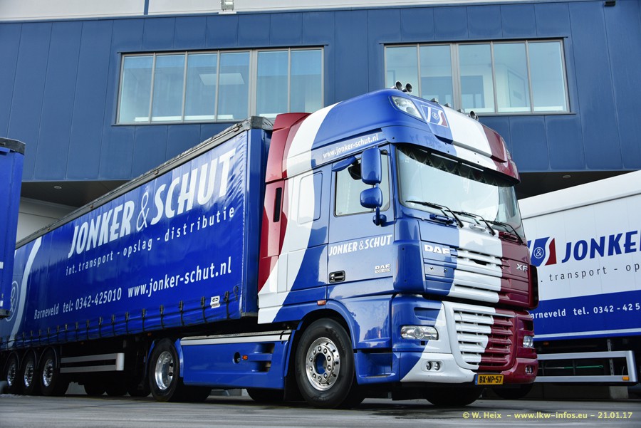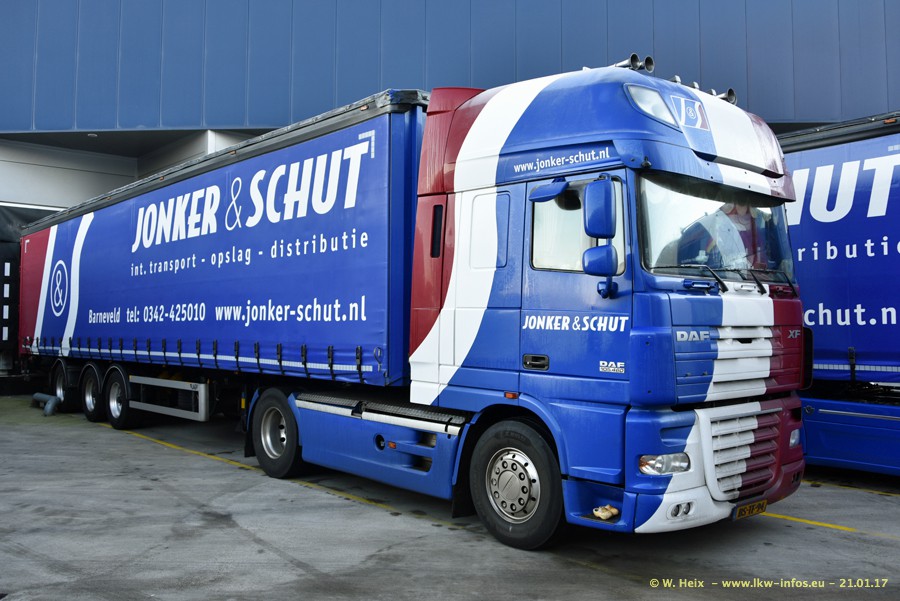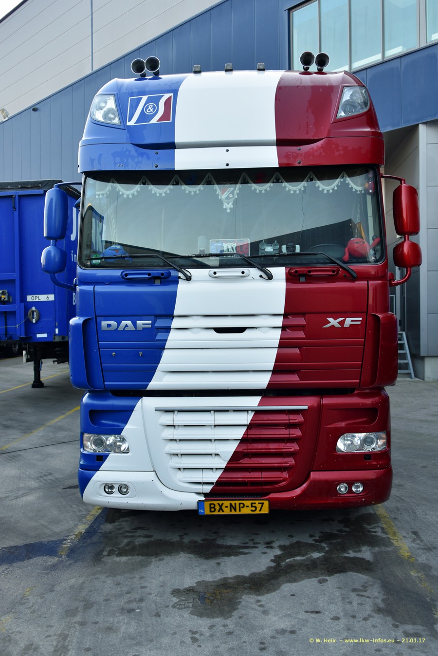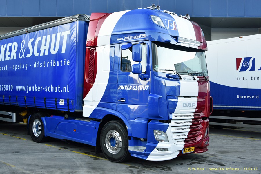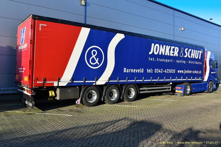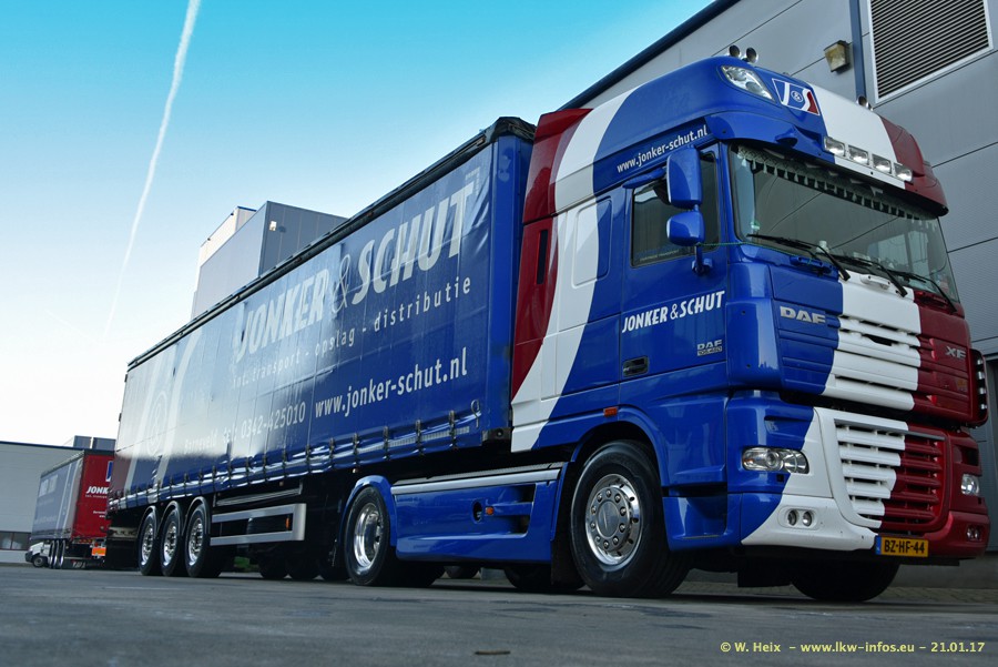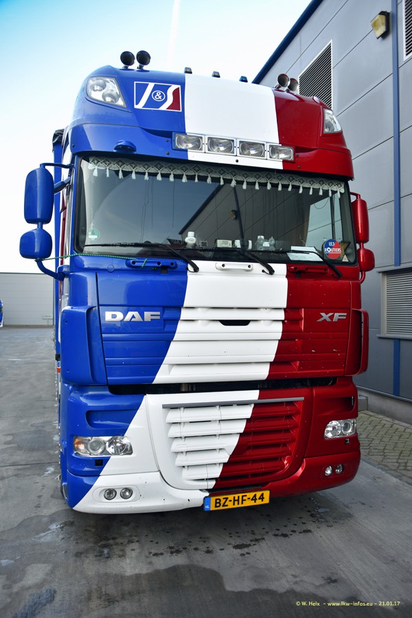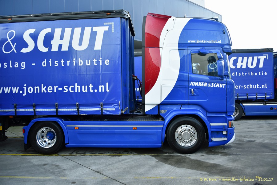Es gibt wieder neue LKW bei Jonker & Schut: Das sind ein Volvo FM 4 400 mit Siloauflieger und ein DAF XF Euro 6 Planen-Hängerzug. Beides wieder schöne Fahrzeuge. Und auch fast der ganze Fuhrpark war zuhause und konnte fotografiert werden.