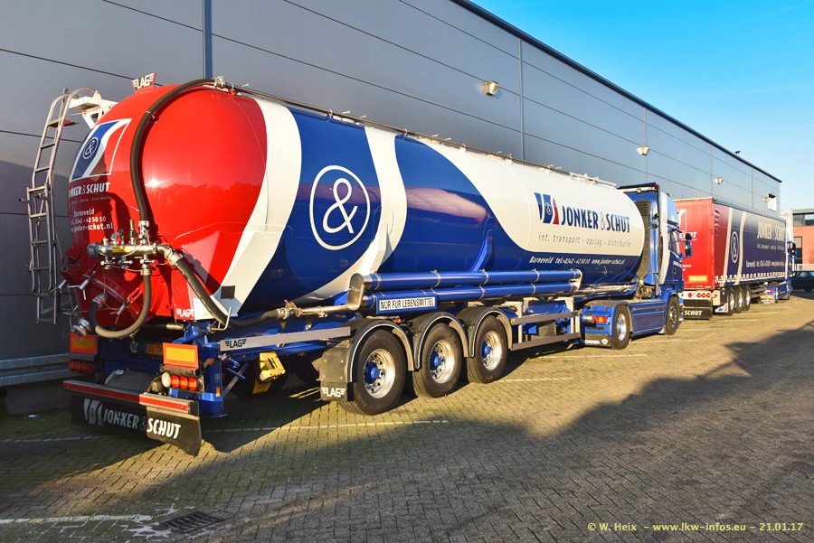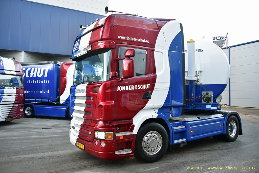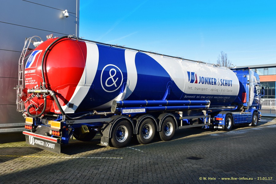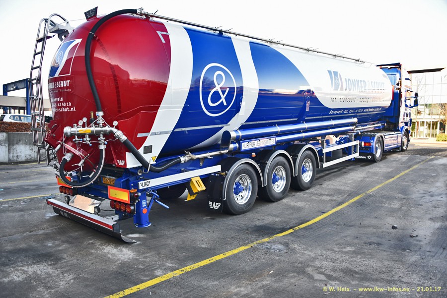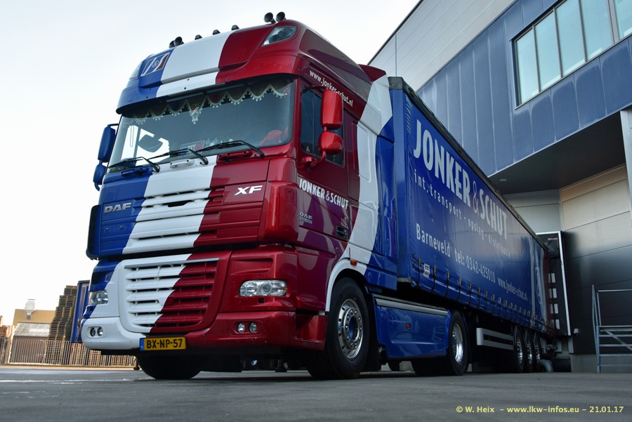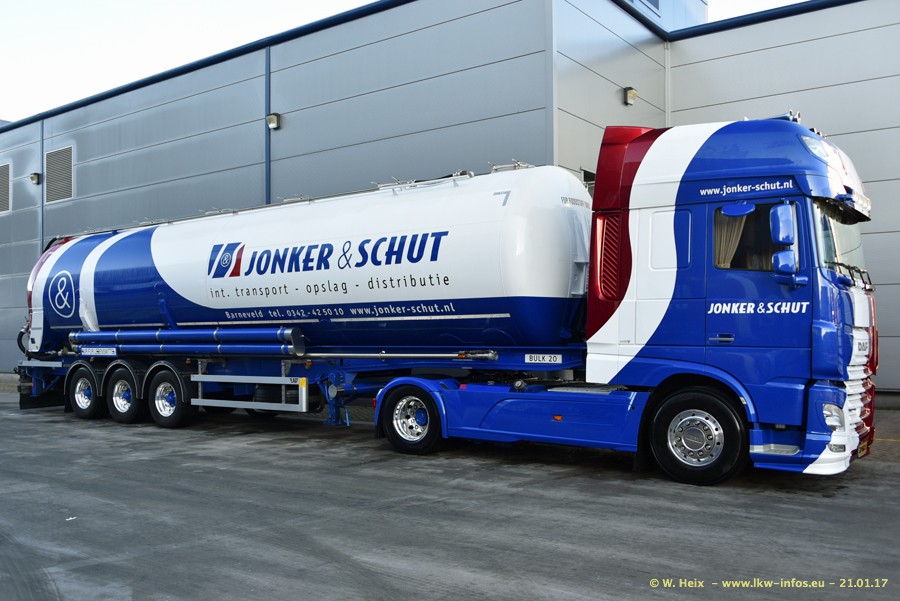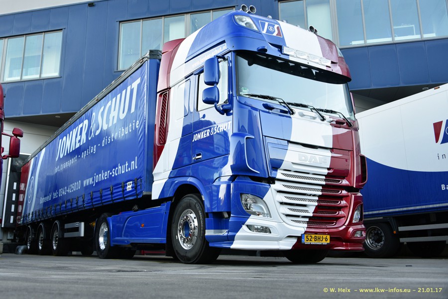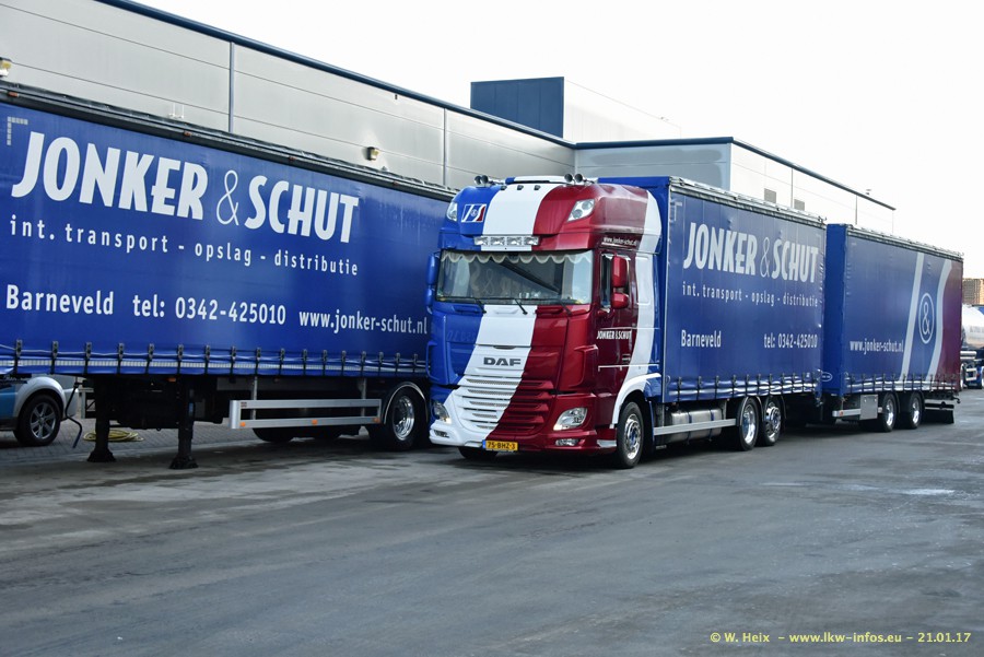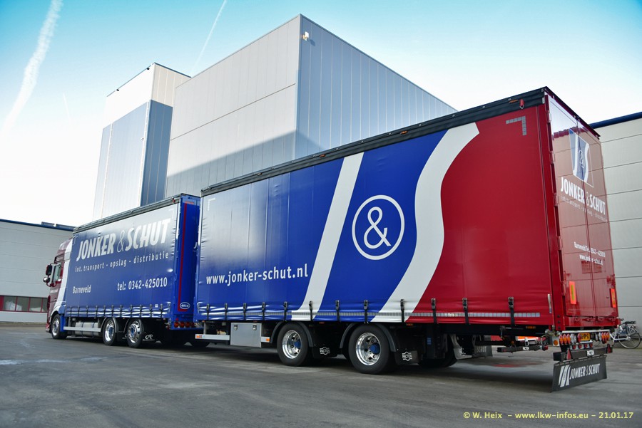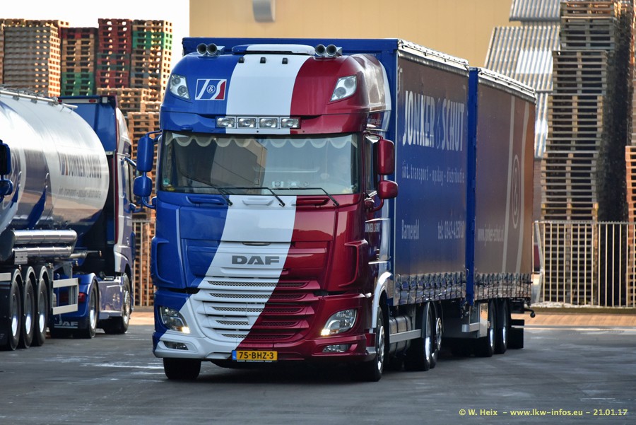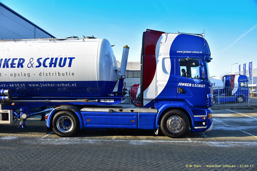 Es gibt wieder neue LKW bei Jonker & Schut: Das sind ein Volvo FM 4 400 mit Siloauflieger und ein DAF XF Euro 6 Planen-Hängerzug. Beides wieder schöne Fahrzeuge. Und auch fast der ganze Fuhrpark war zuhause und konnte fotografiert werden.