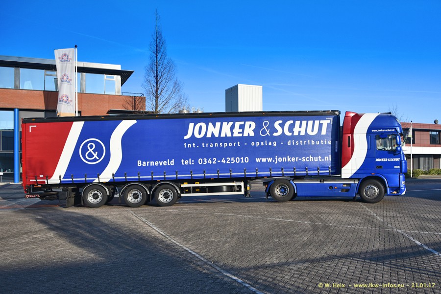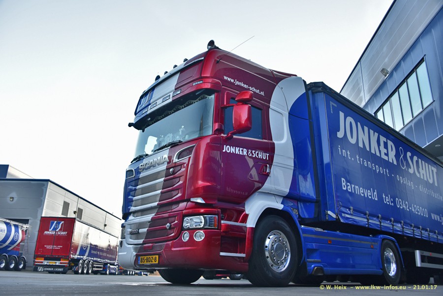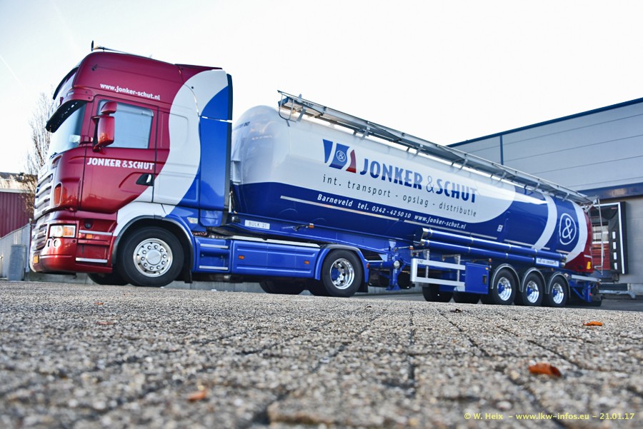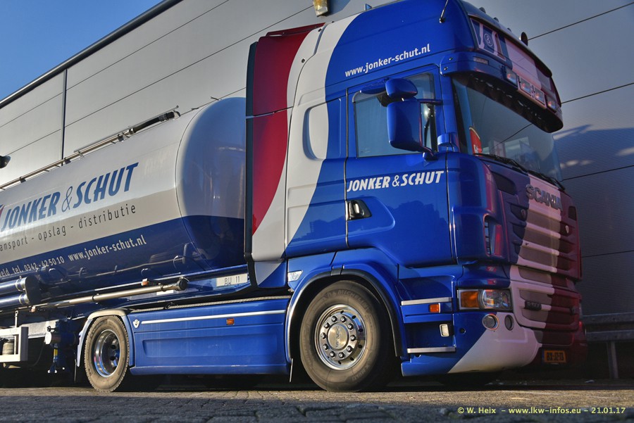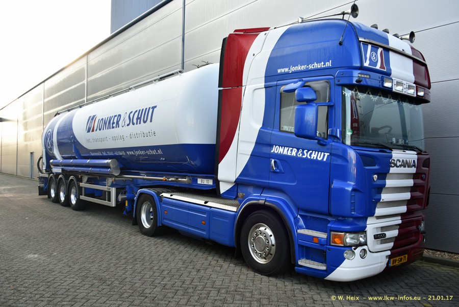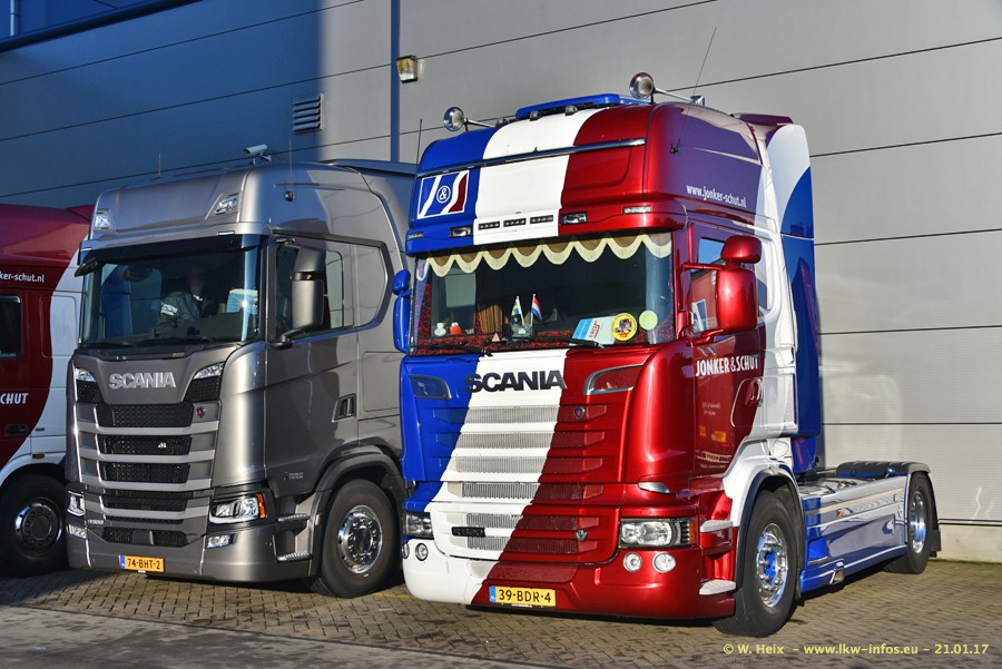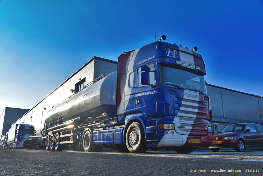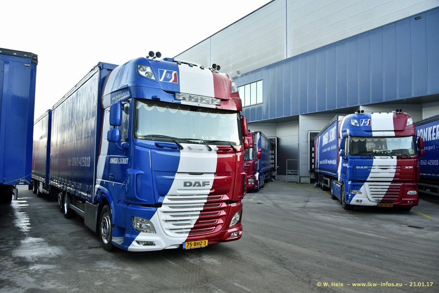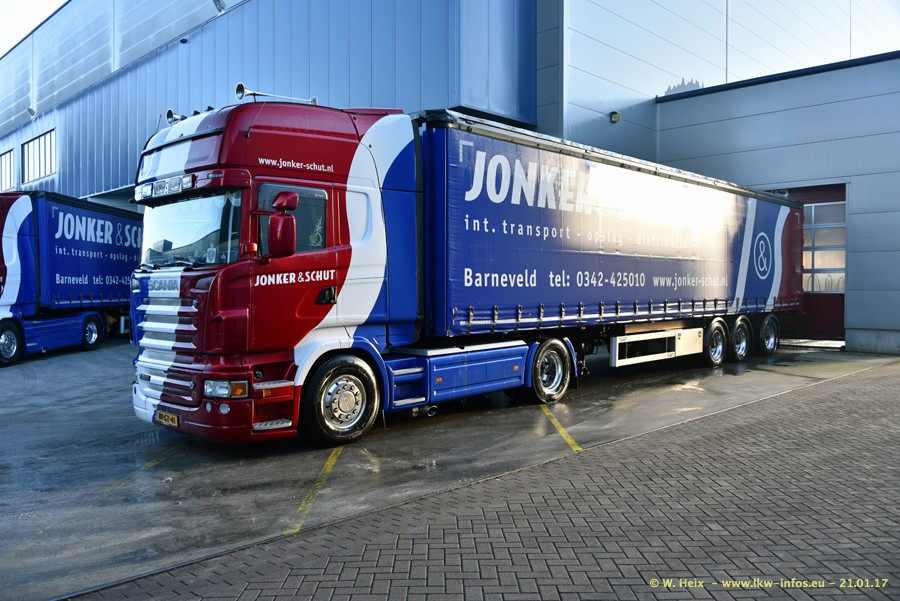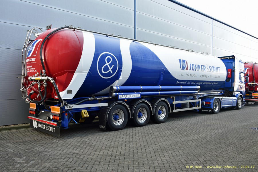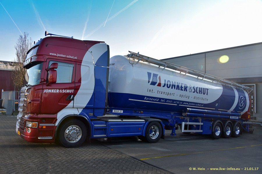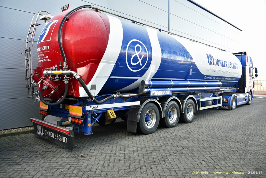 Es gibt wieder neue LKW bei Jonker & Schut: Das sind ein Volvo FM 4 400 mit Siloauflieger und ein DAF XF Euro 6 Planen-Hängerzug. Beides wieder schöne Fahrzeuge. Und auch fast der ganze Fuhrpark war zuhause und konnte fotografiert werden.