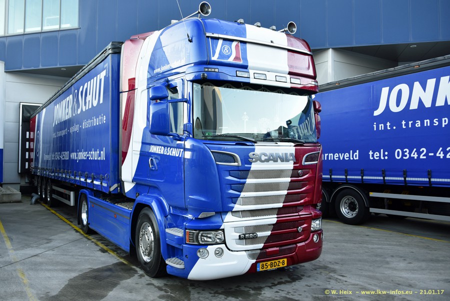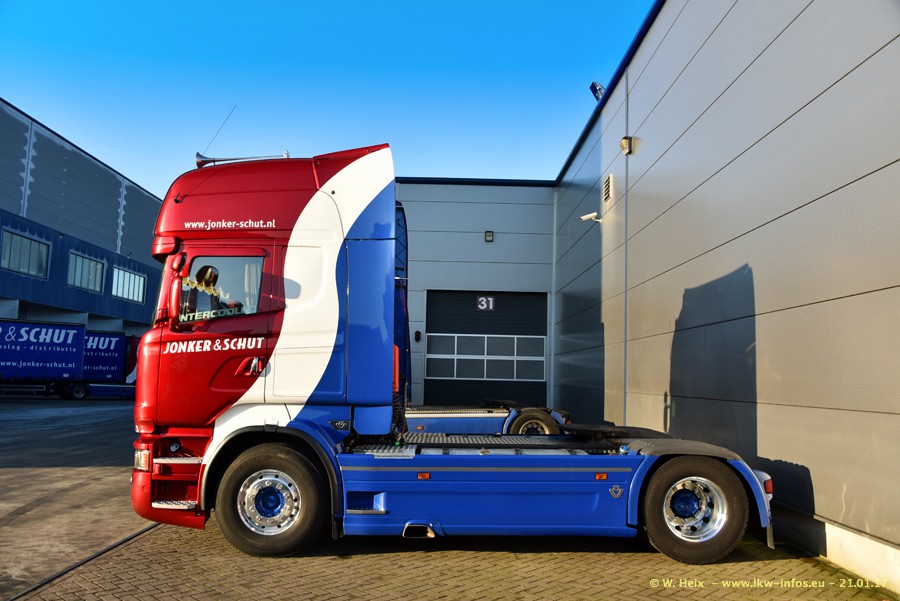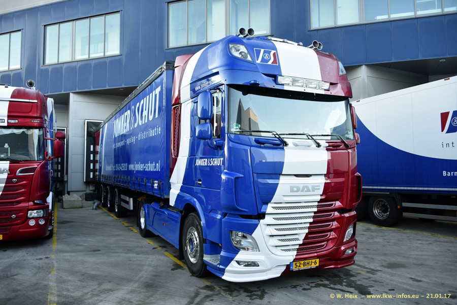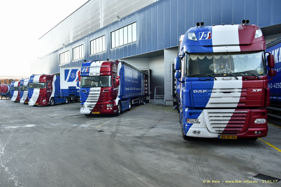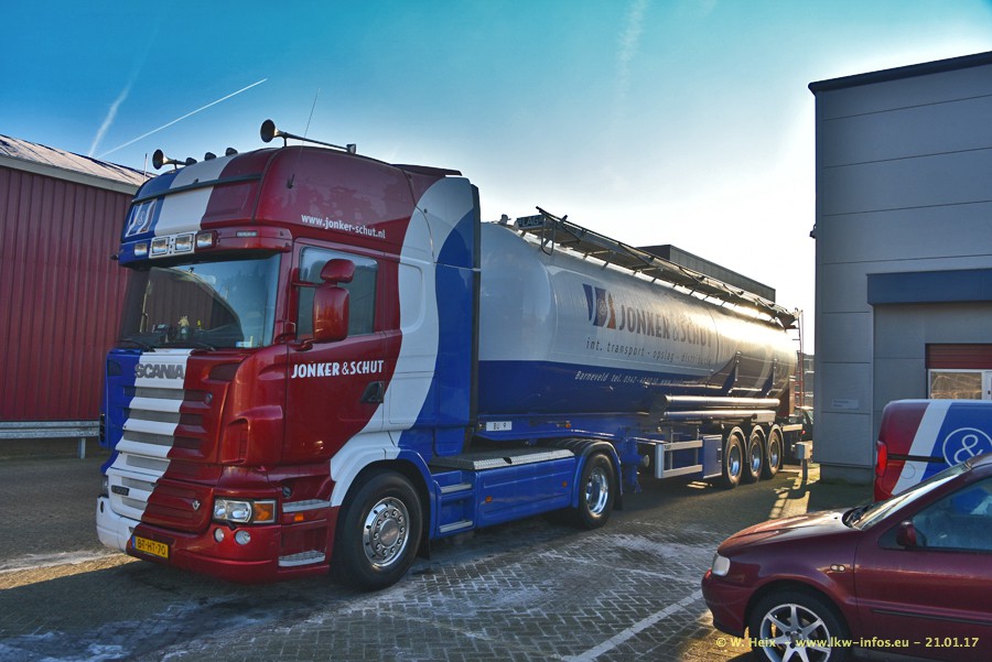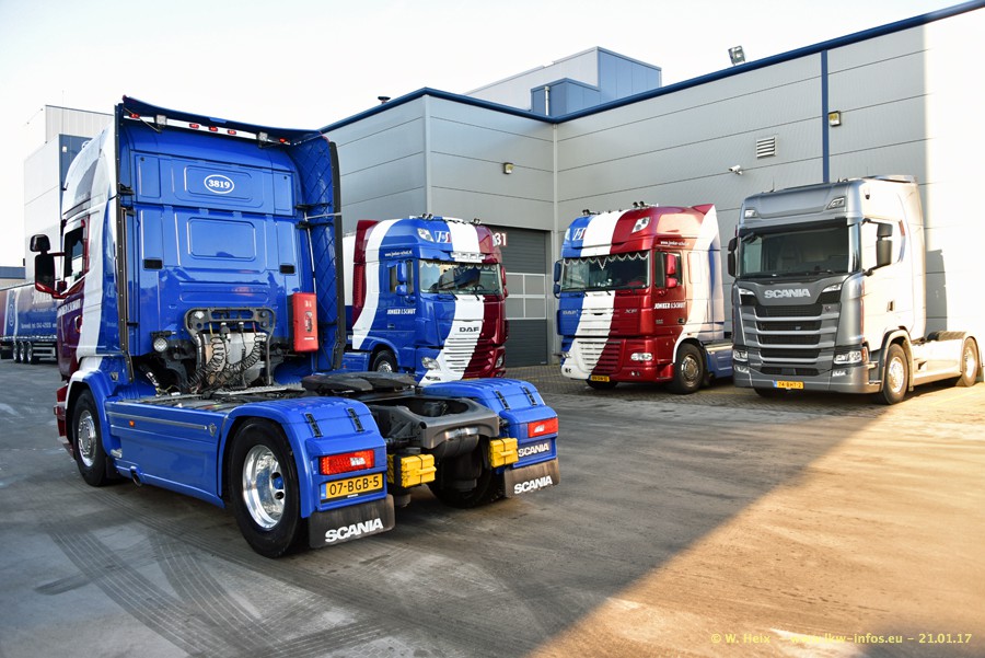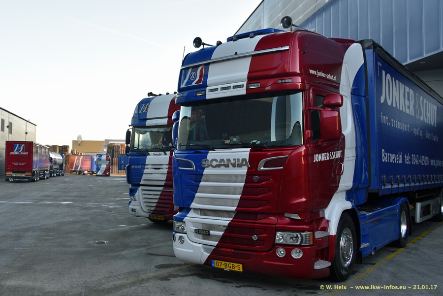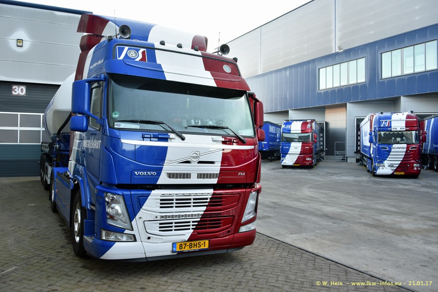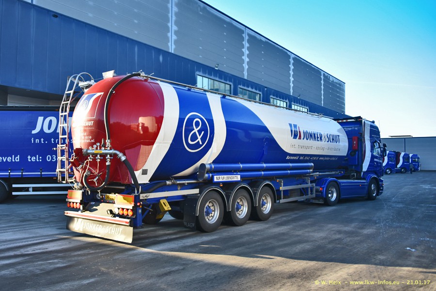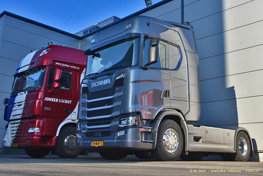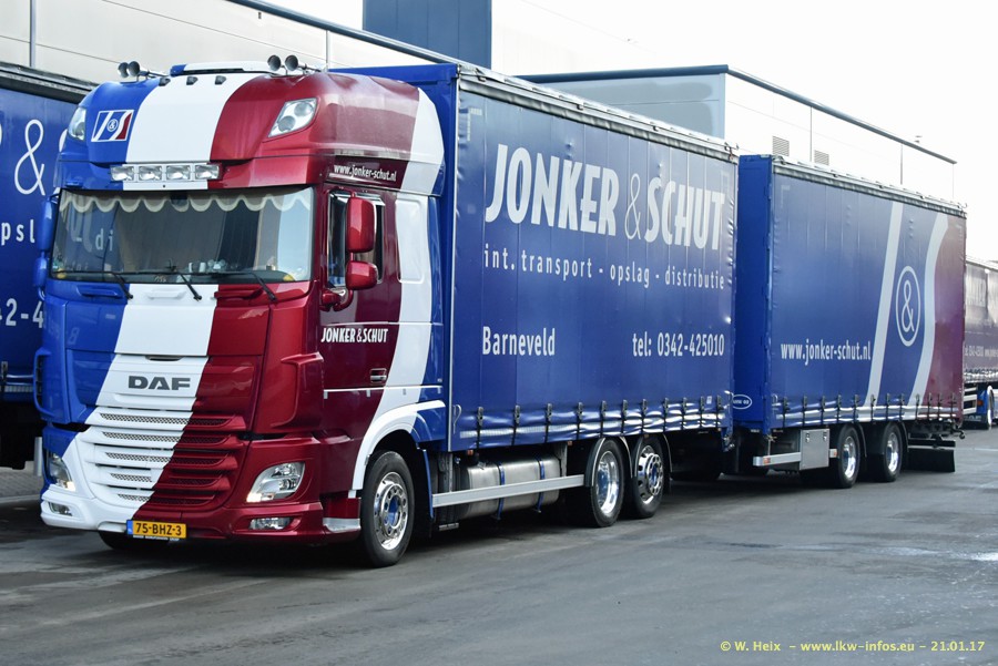 Es gibt wieder neue LKW bei Jonker & Schut: Das sind ein Volvo FM 4 400 mit Siloauflieger und ein DAF XF Euro 6 Planen-Hängerzug. Beides wieder schöne Fahrzeuge. Und auch fast der ganze Fuhrpark war zuhause und konnte fotografiert werden.