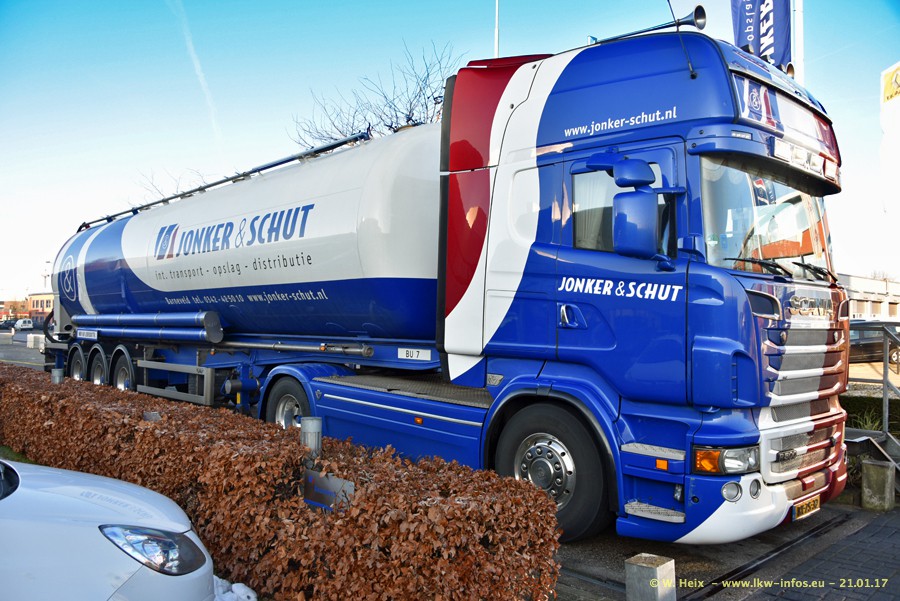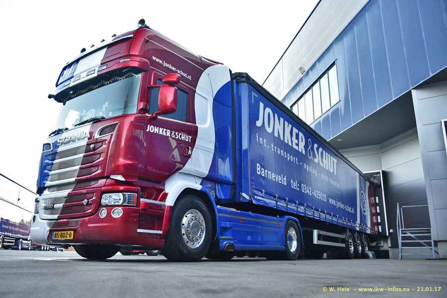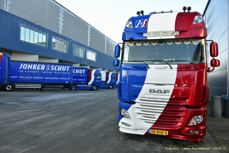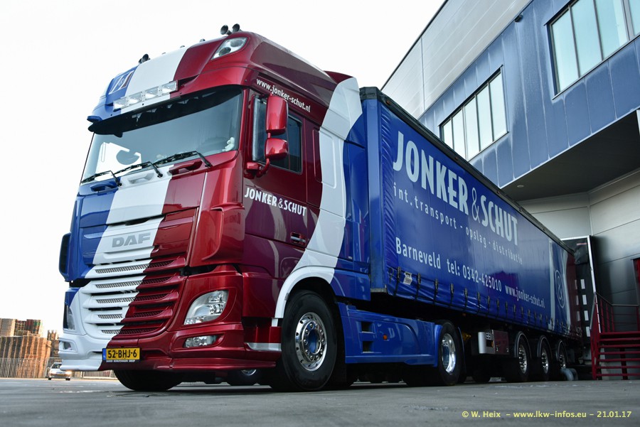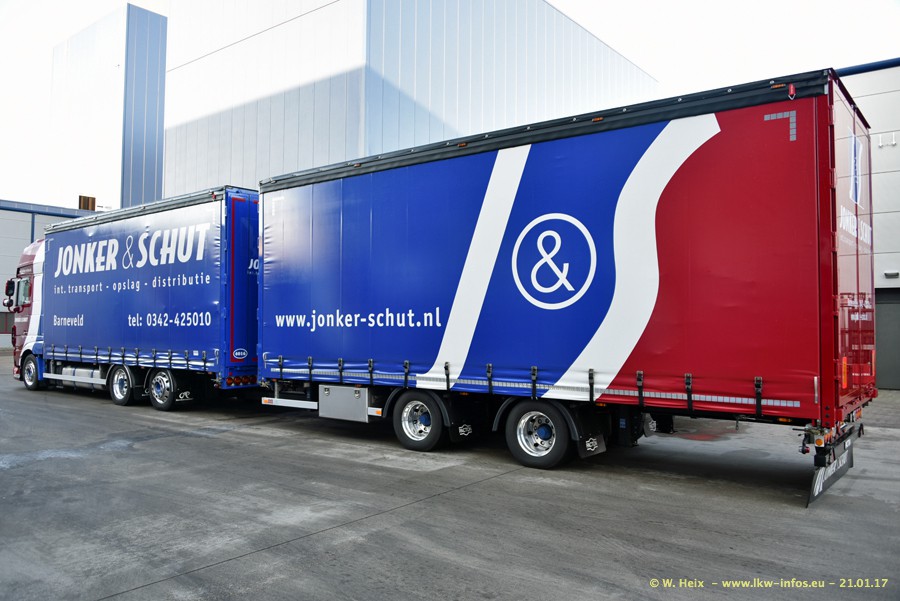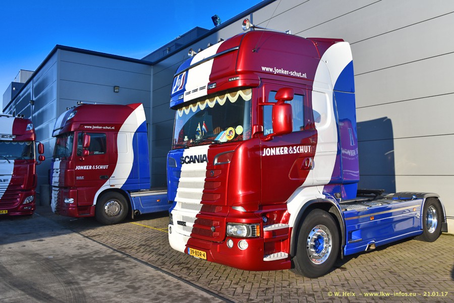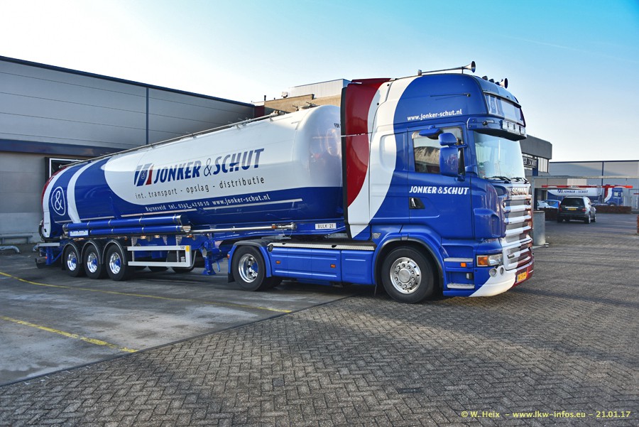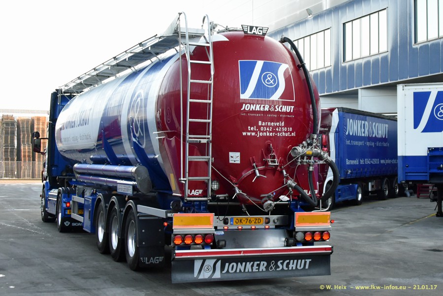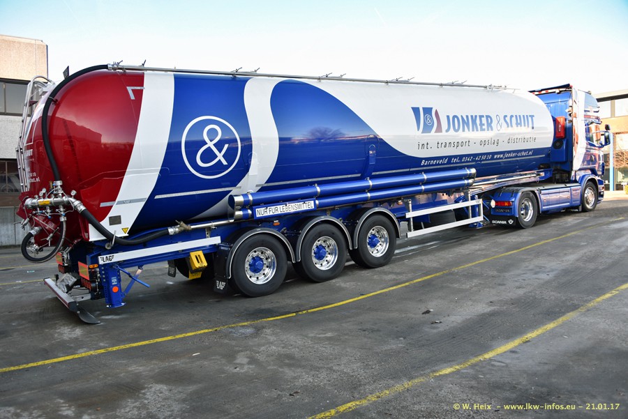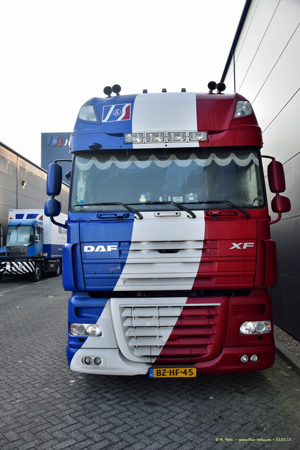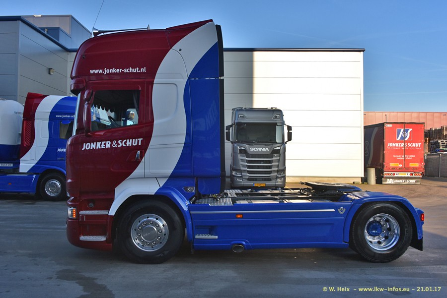 Es gibt wieder neue LKW bei Jonker & Schut: Das sind ein Volvo FM 4 400 mit Siloauflieger und ein DAF XF Euro 6 Planen-Hängerzug. Beides wieder schöne Fahrzeuge. Und auch fast der ganze Fuhrpark war zuhause und konnte fotografiert werden.