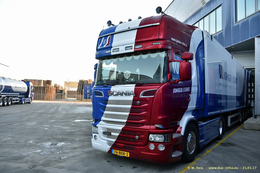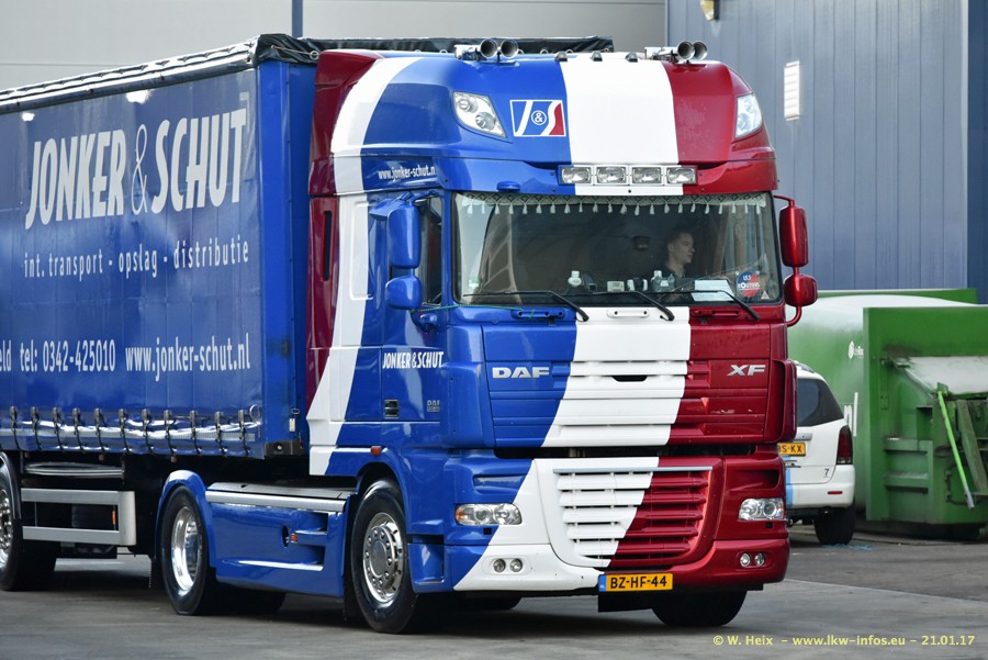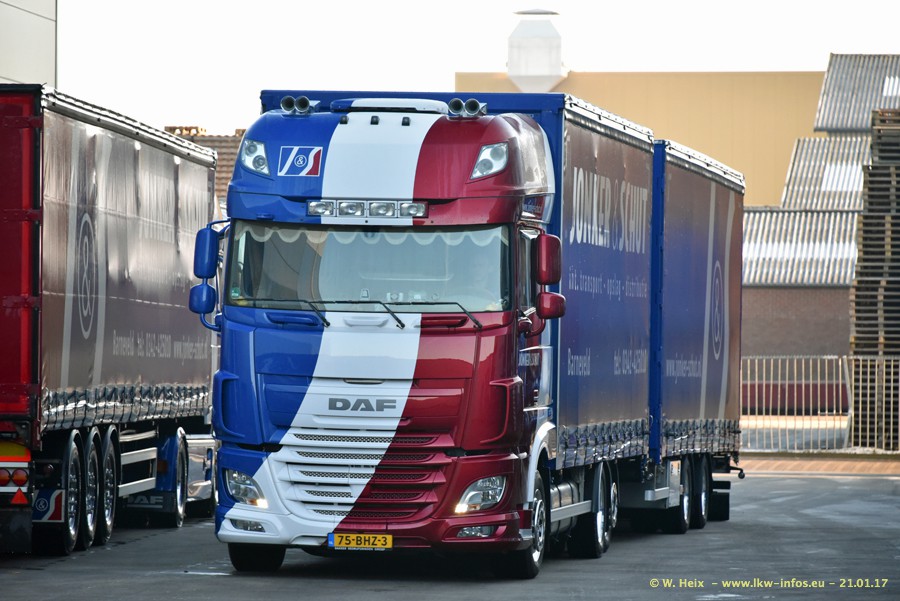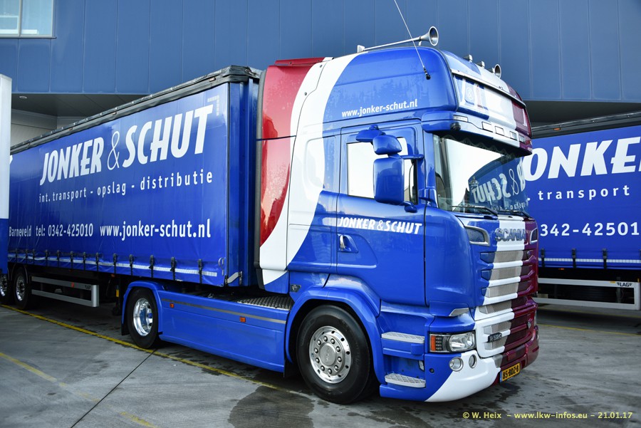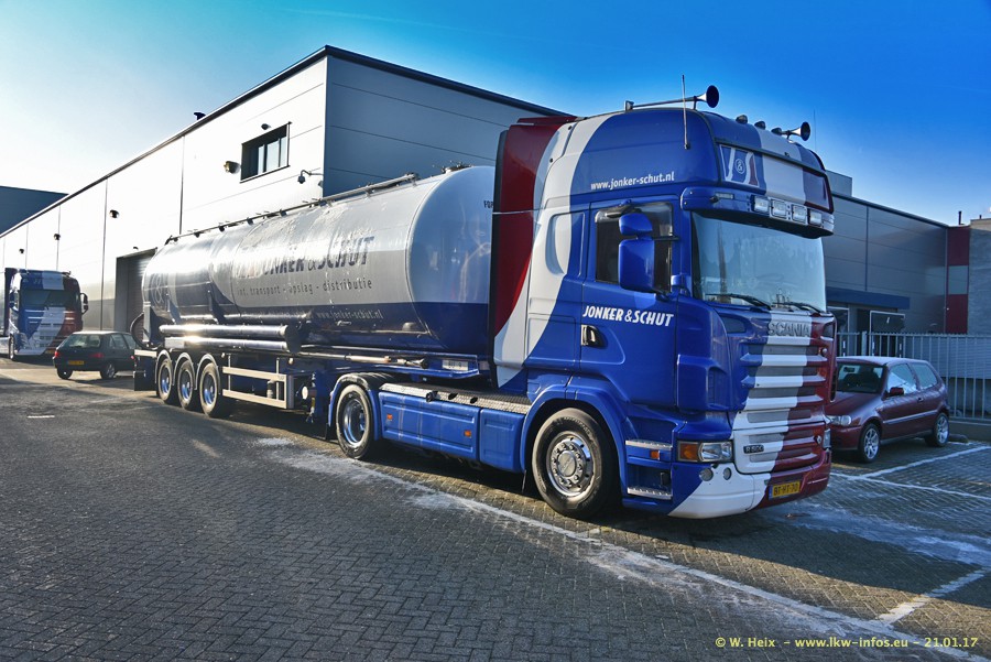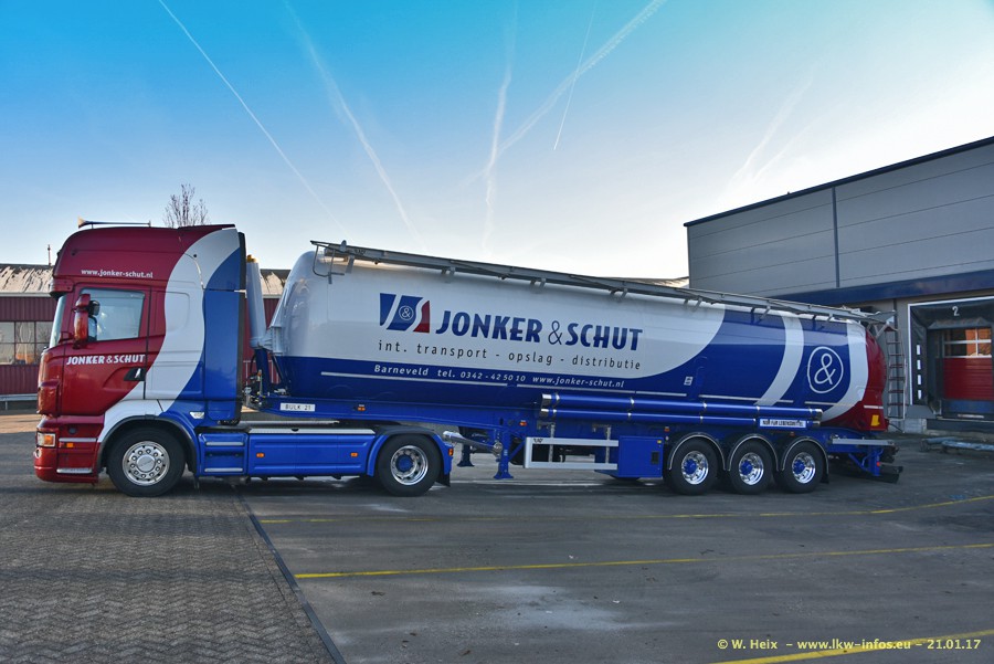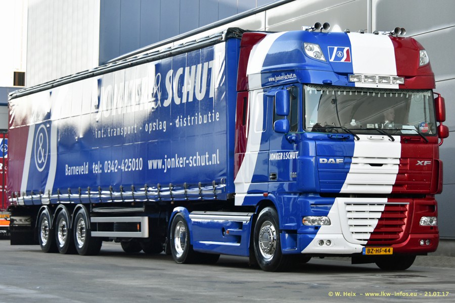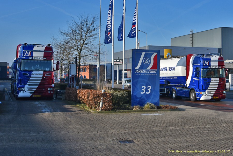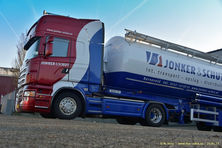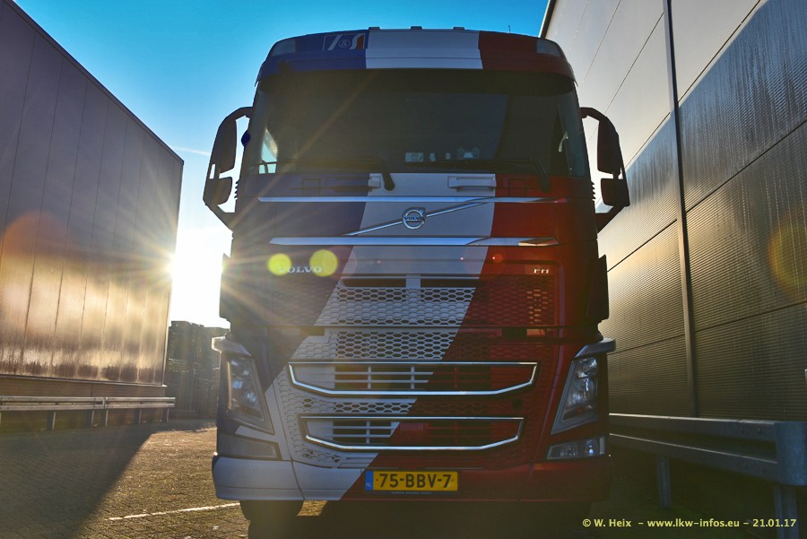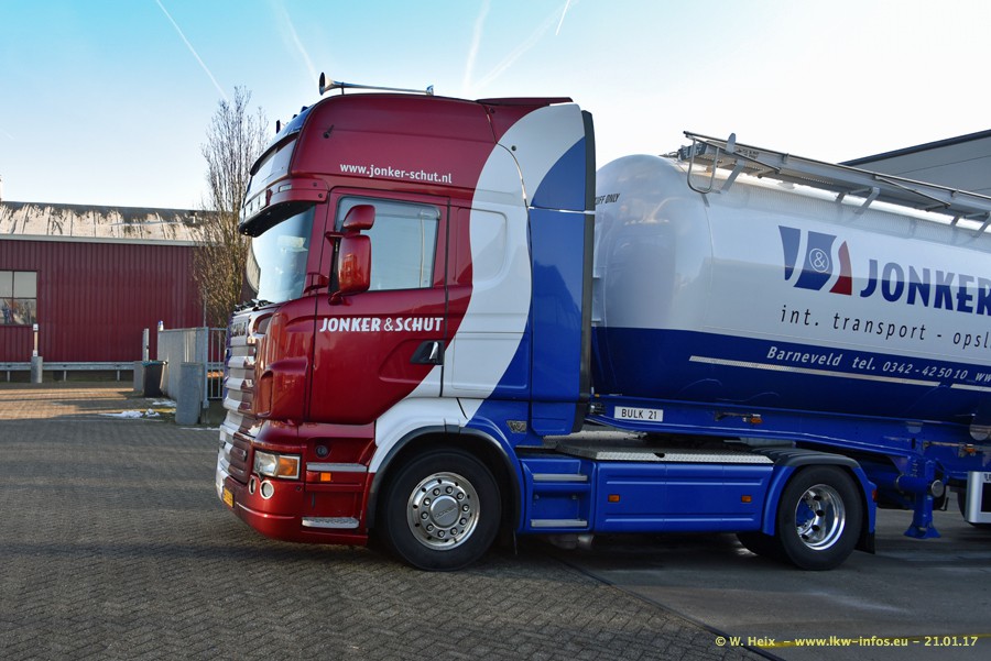 Es gibt wieder neue LKW bei Jonker & Schut: Das sind ein Volvo FM 4 400 mit Siloauflieger und ein DAF XF Euro 6 Planen-Hängerzug. Beides wieder schöne Fahrzeuge. Und auch fast der ganze Fuhrpark war zuhause und konnte fotografiert werden.