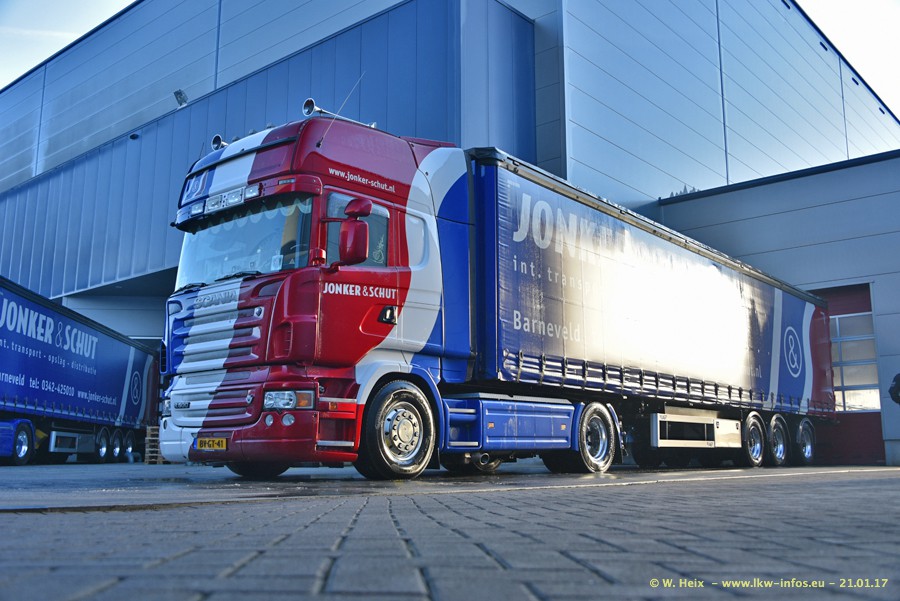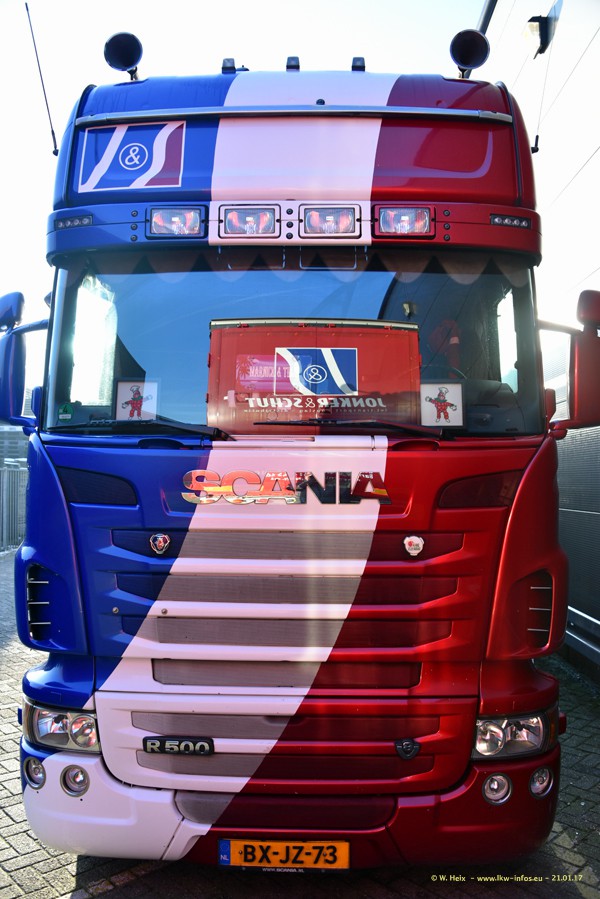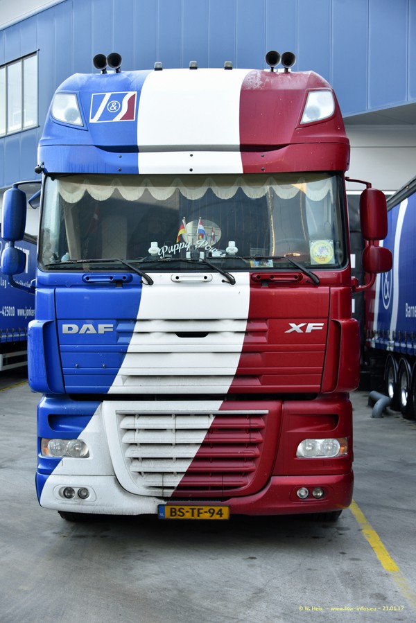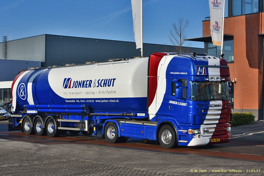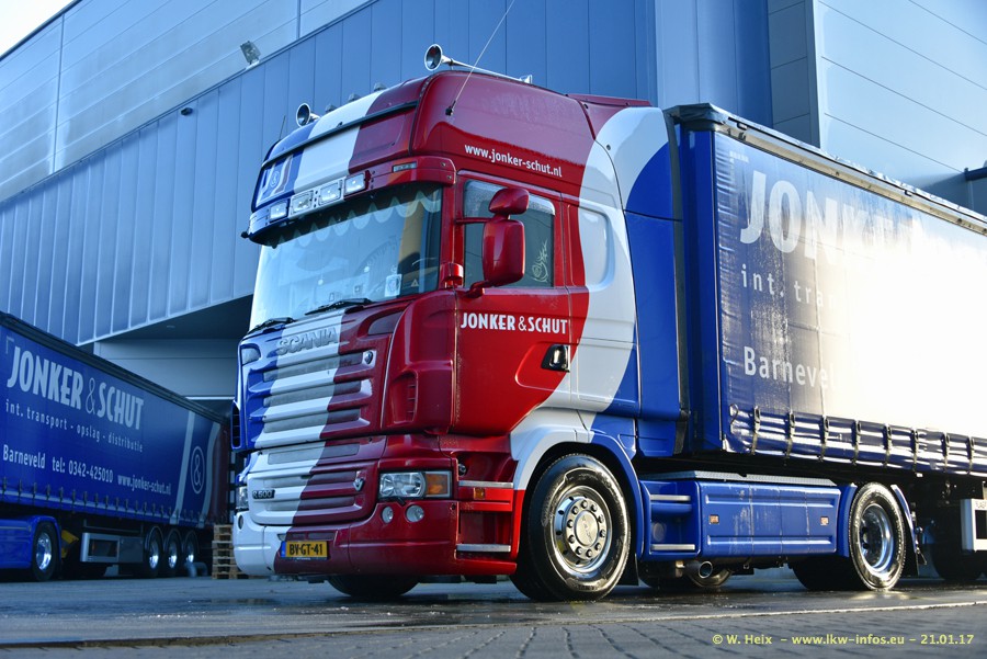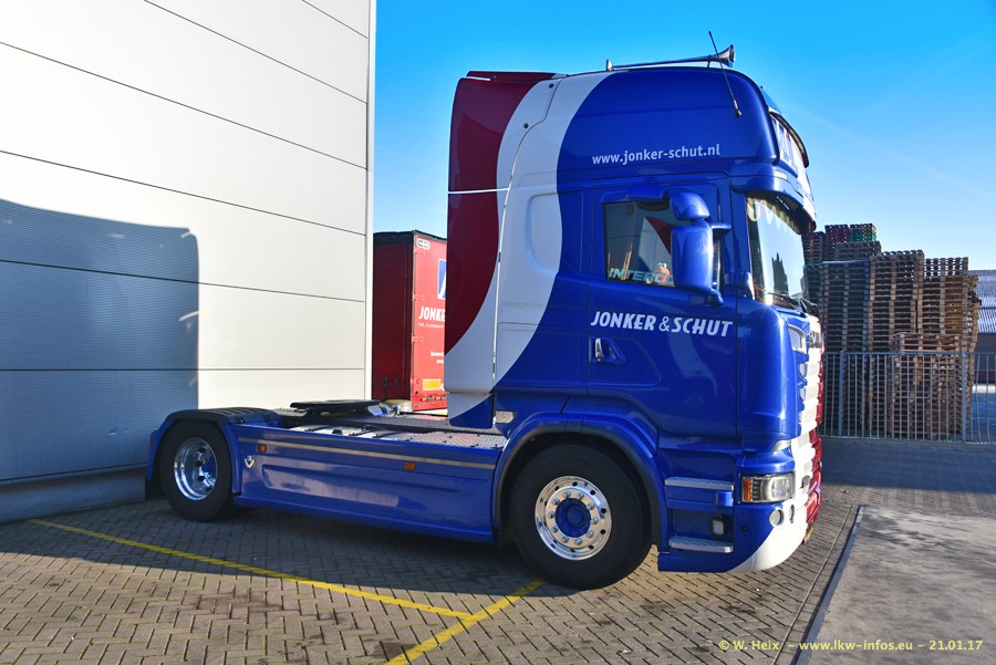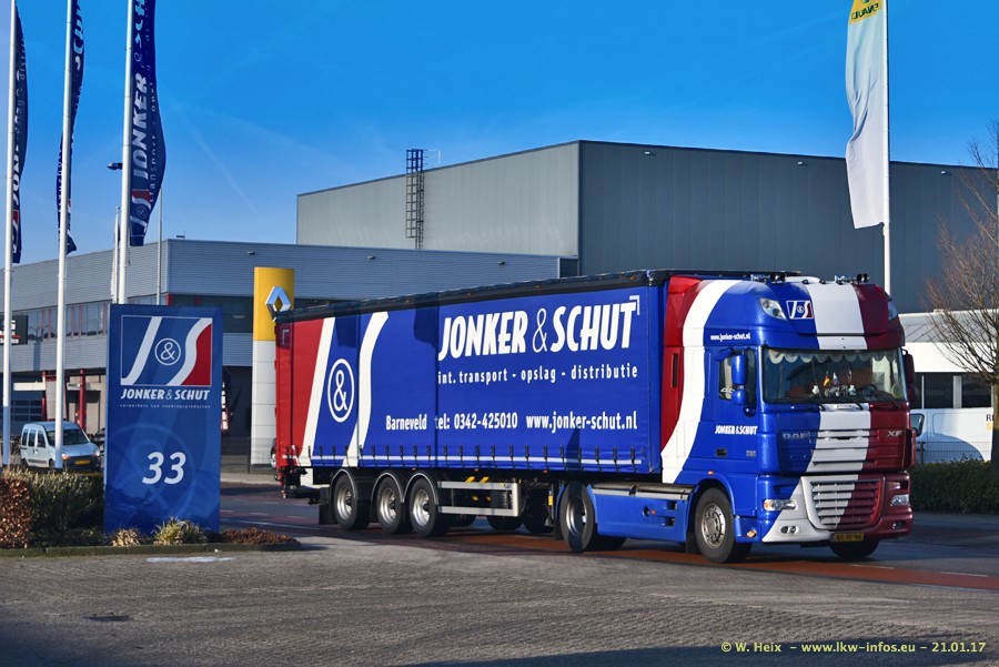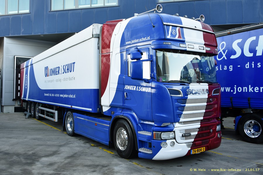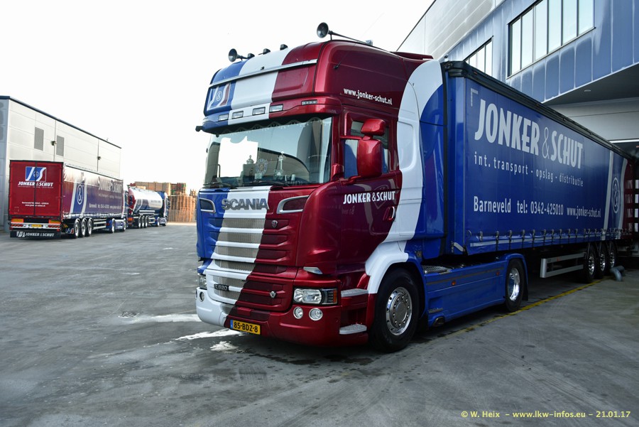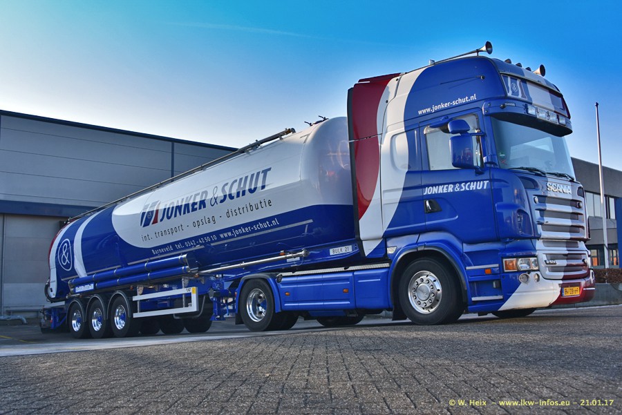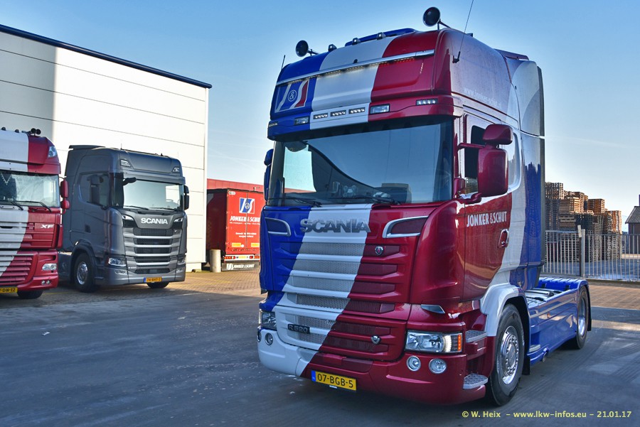 Es gibt wieder neue LKW bei Jonker & Schut: Das sind ein Volvo FM 4 400 mit Siloauflieger und ein DAF XF Euro 6 Planen-Hängerzug. Beides wieder schöne Fahrzeuge. Und auch fast der ganze Fuhrpark war zuhause und konnte fotografiert werden.