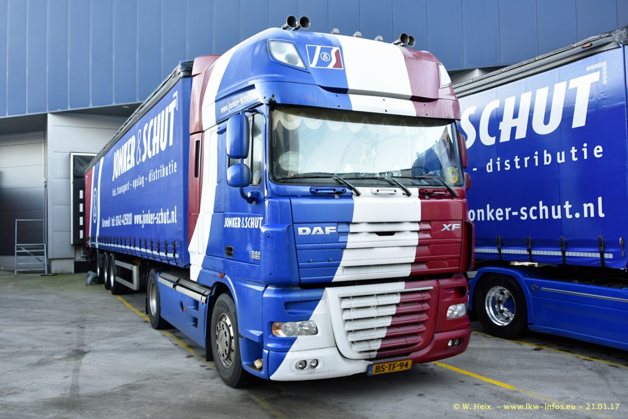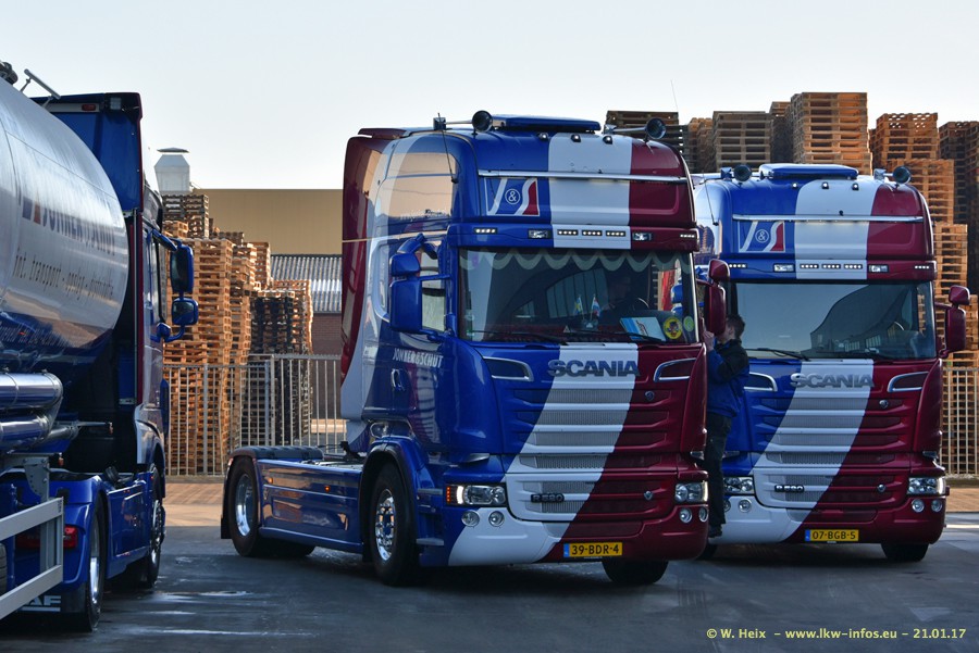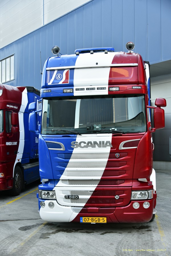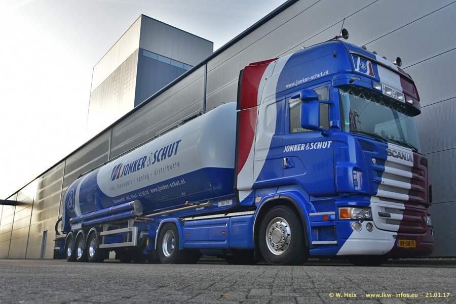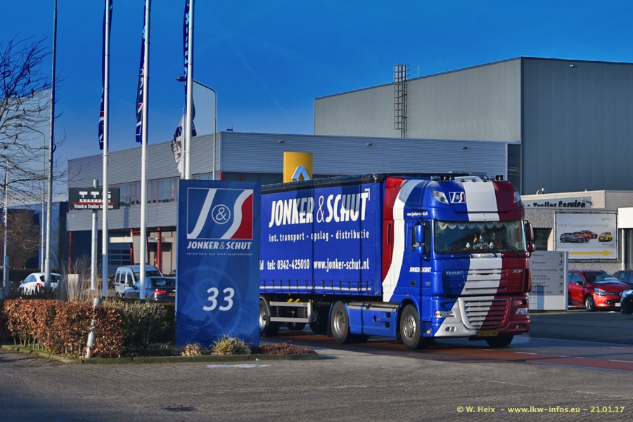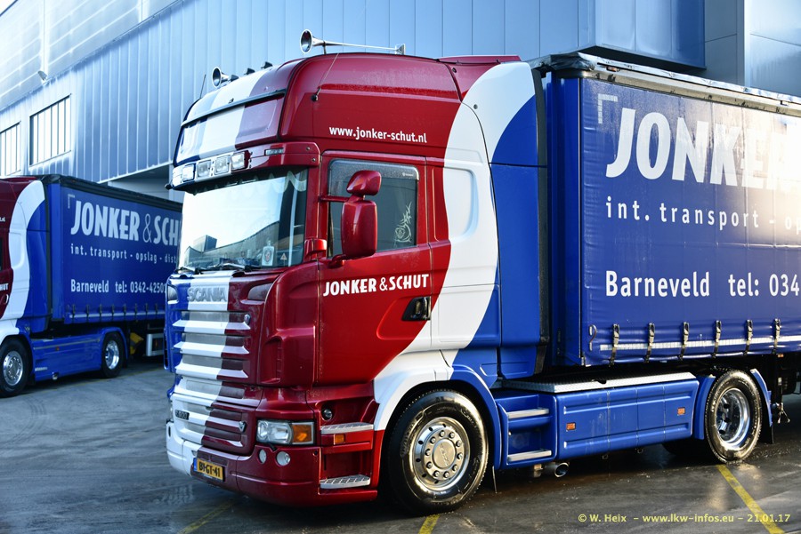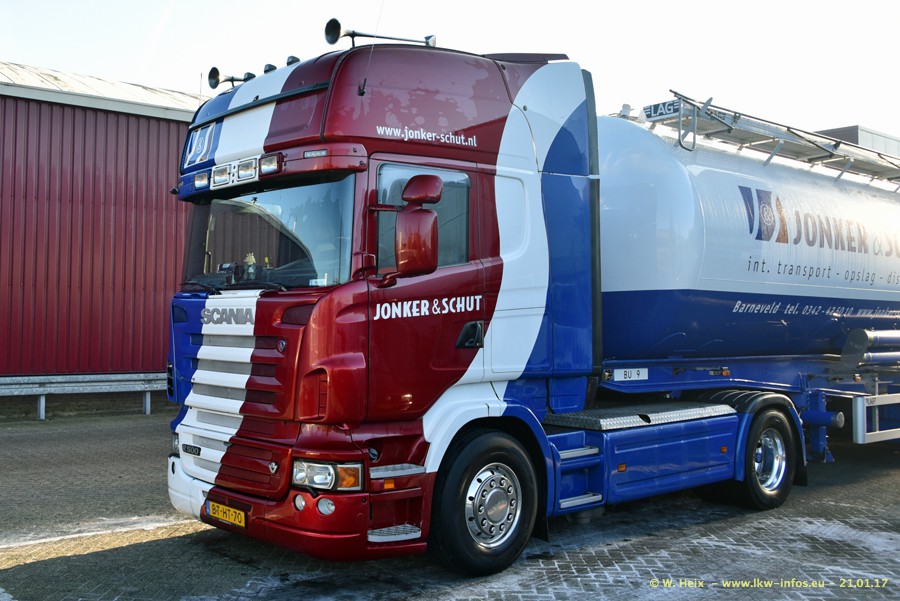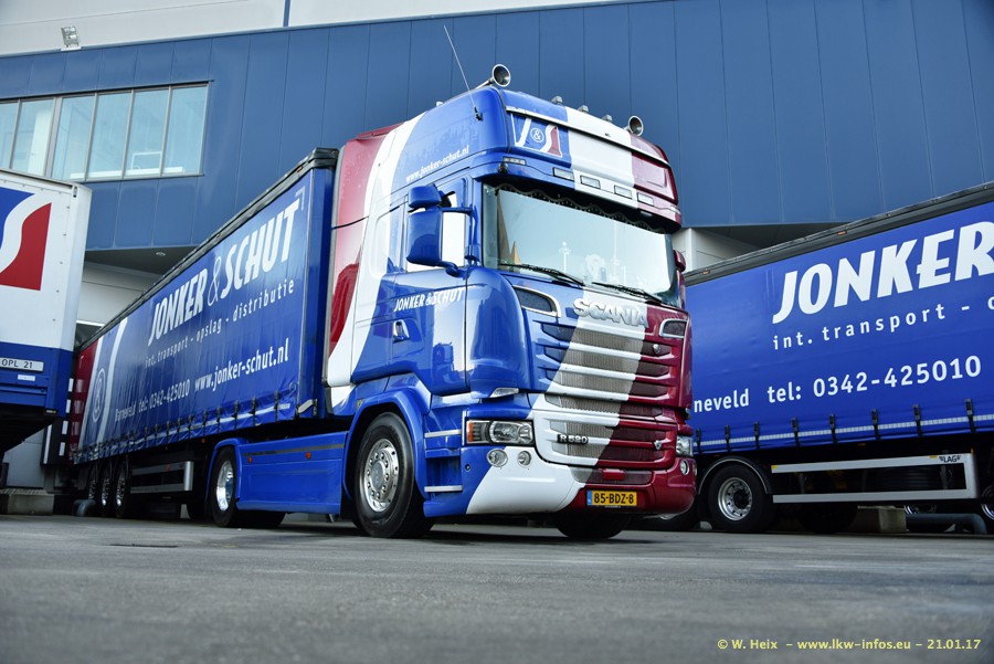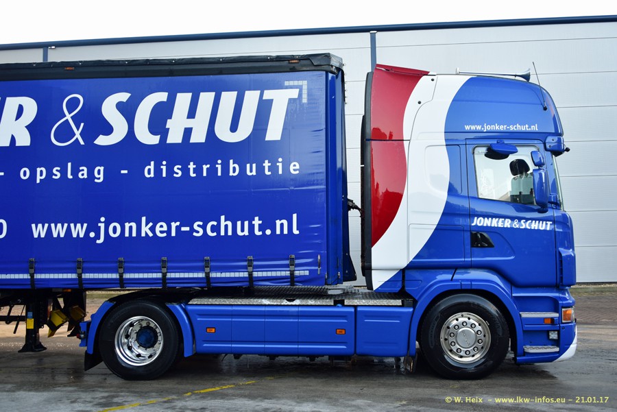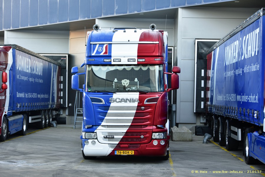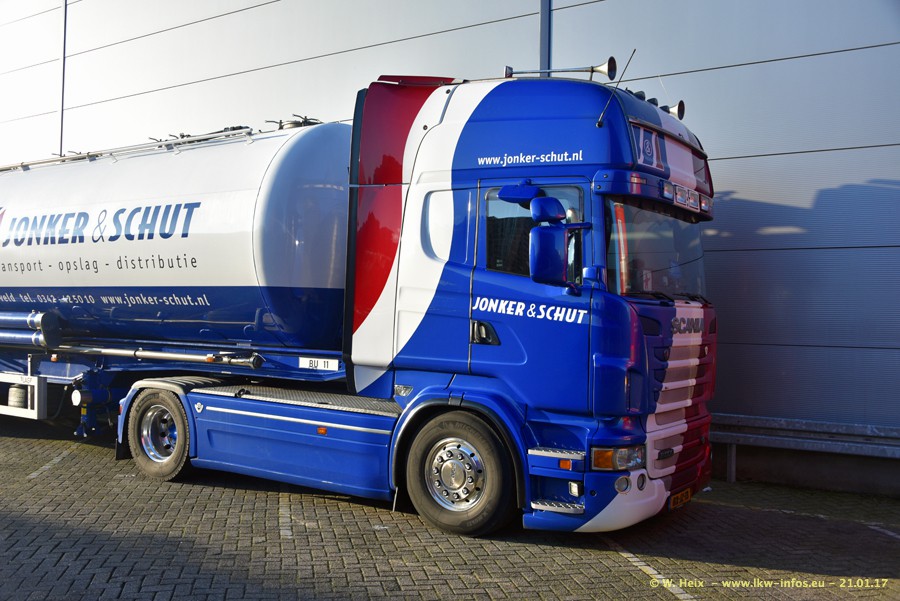 Es gibt wieder neue LKW bei Jonker & Schut: Das sind ein Volvo FM 4 400 mit Siloauflieger und ein DAF XF Euro 6 Planen-Hängerzug. Beides wieder schöne Fahrzeuge. Und auch fast der ganze Fuhrpark war zuhause und konnte fotografiert werden.