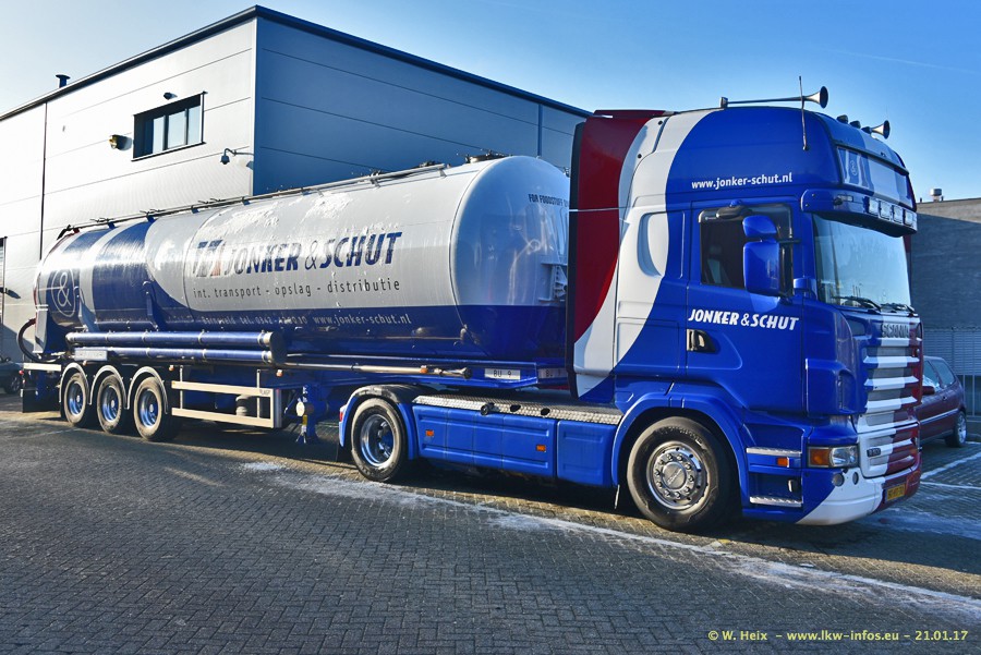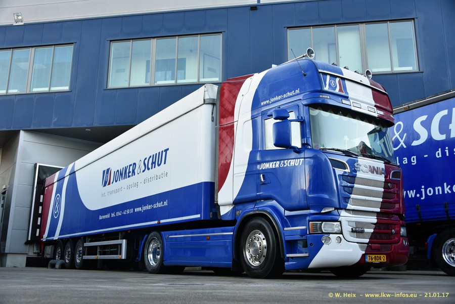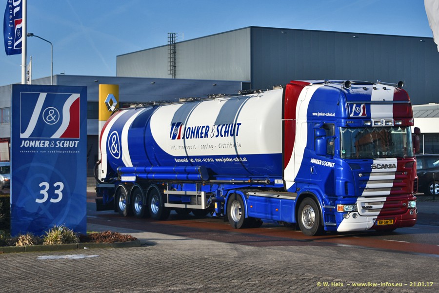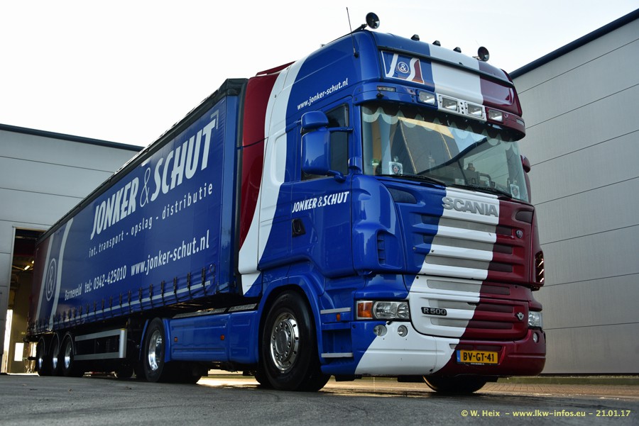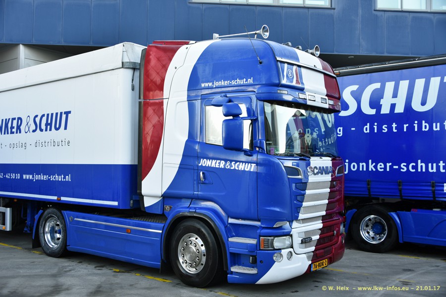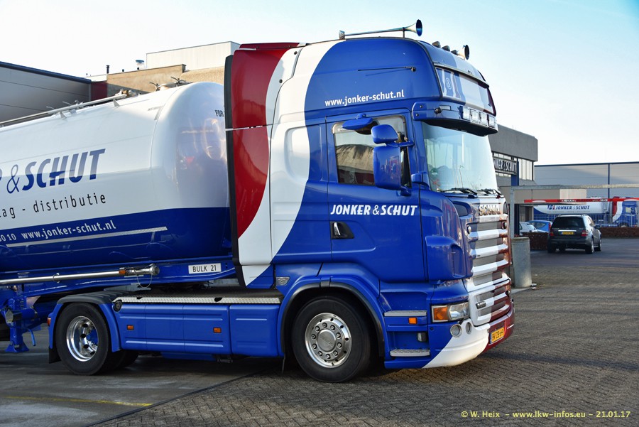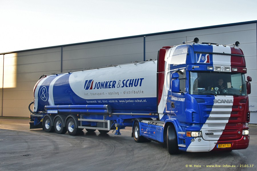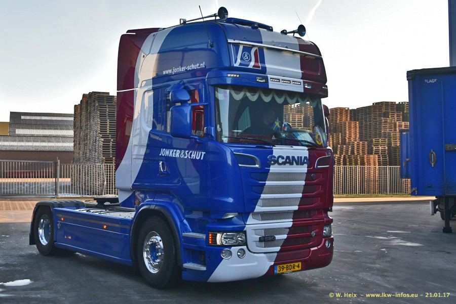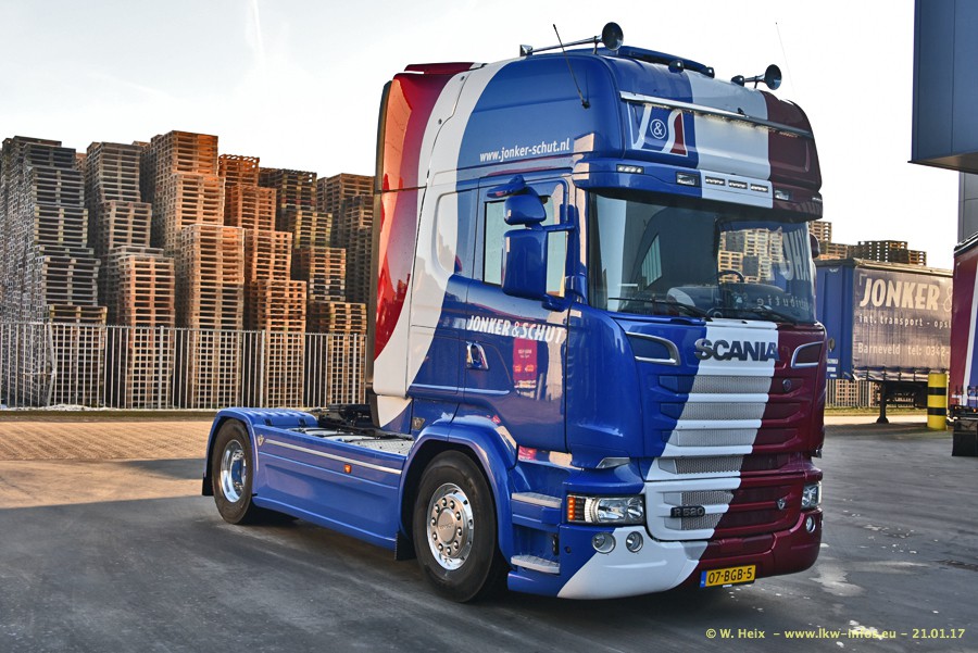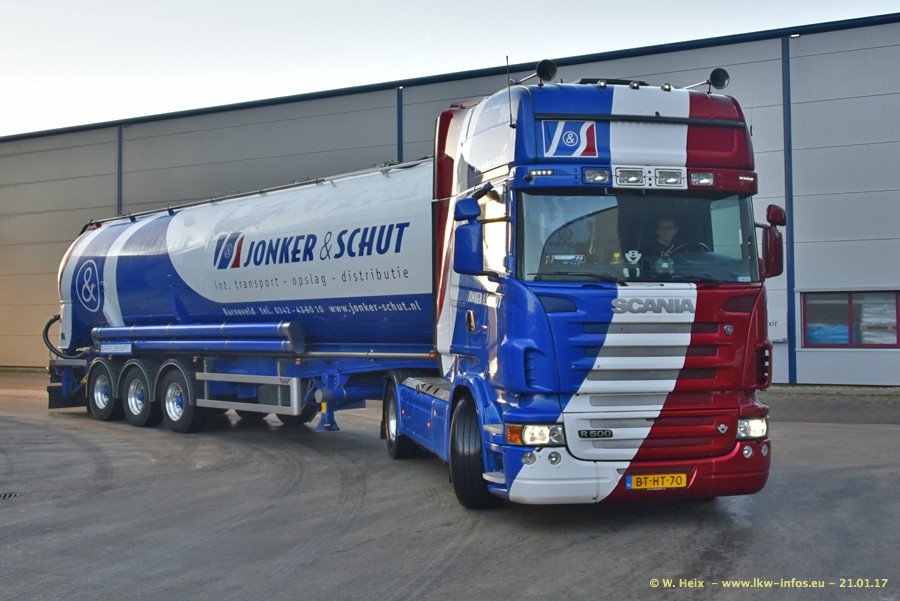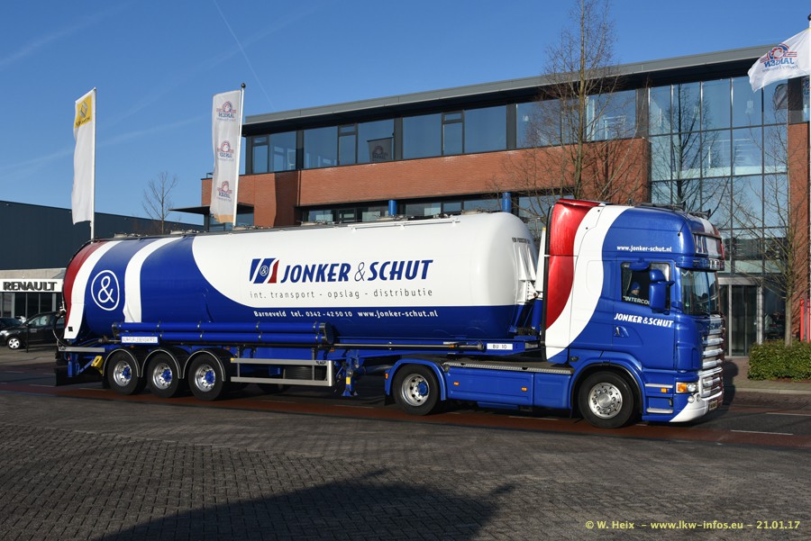 Es gibt wieder neue LKW bei Jonker & Schut: Das sind ein Volvo FM 4 400 mit Siloauflieger und ein DAF XF Euro 6 Planen-Hängerzug. Beides wieder schöne Fahrzeuge. Und auch fast der ganze Fuhrpark war zuhause und konnte fotografiert werden.