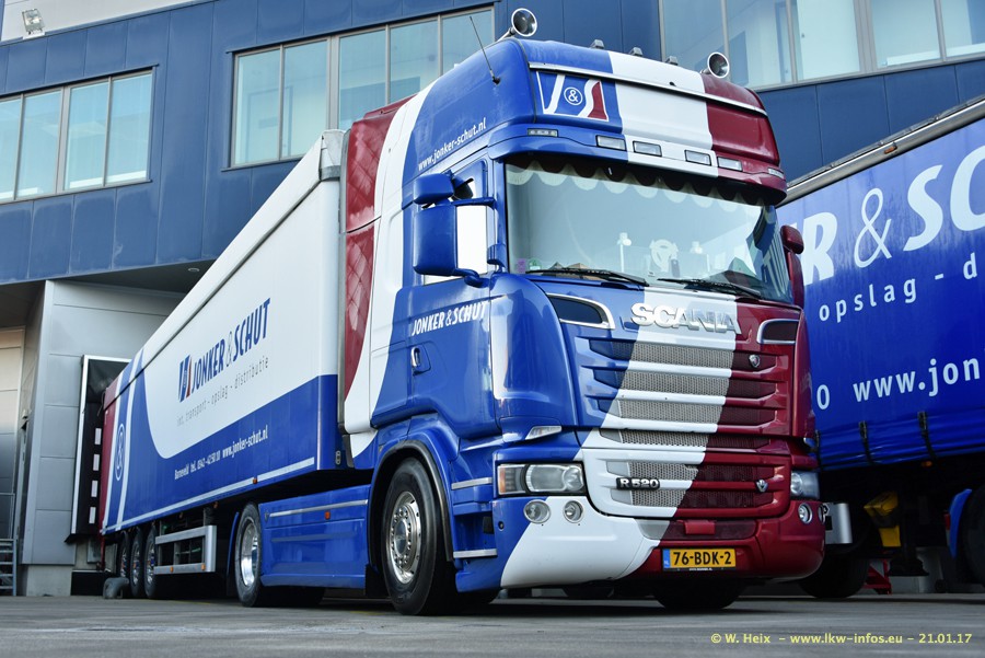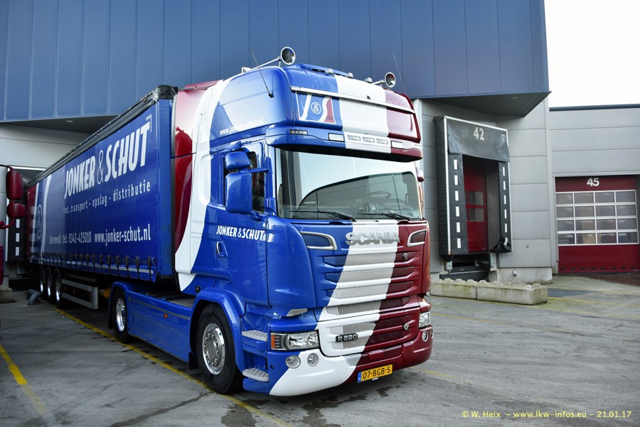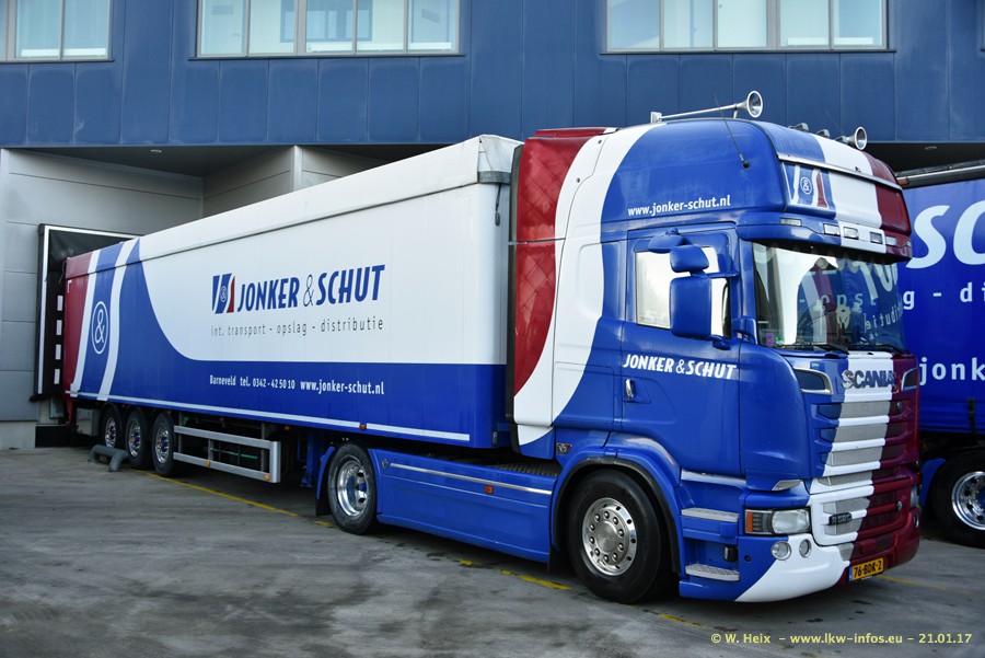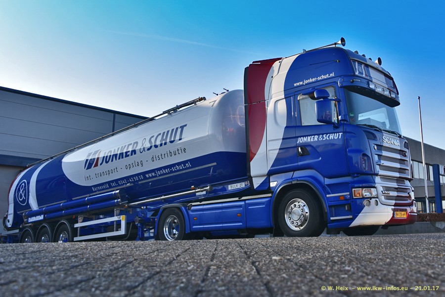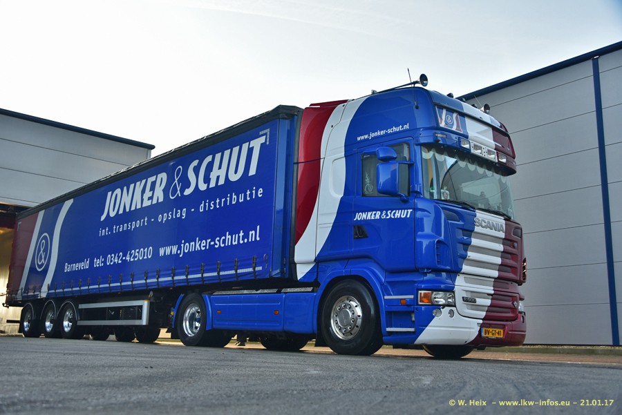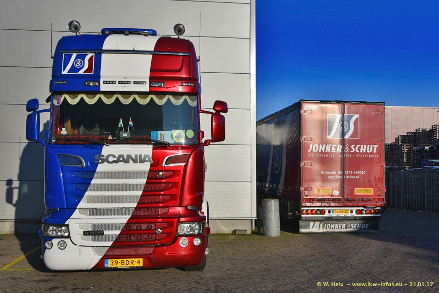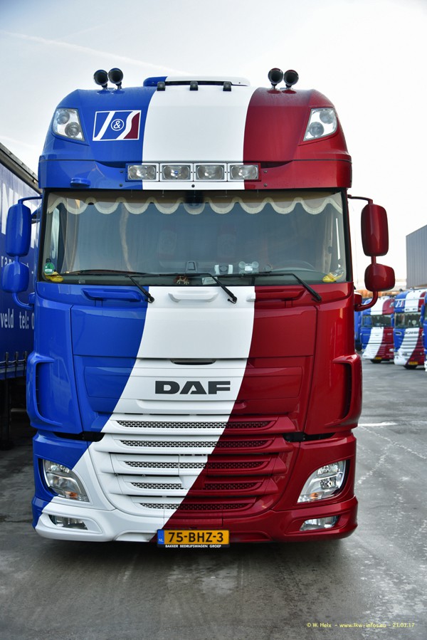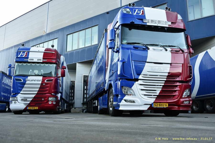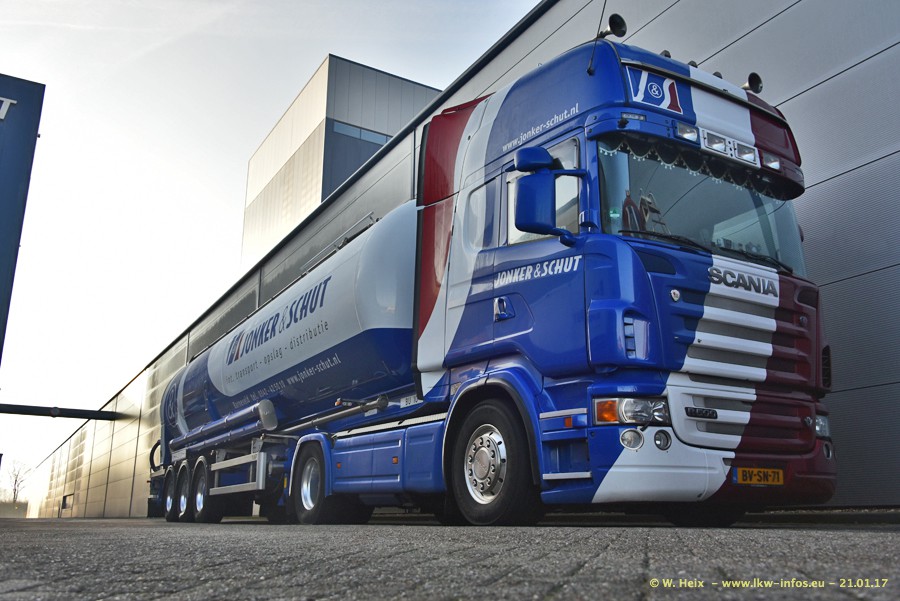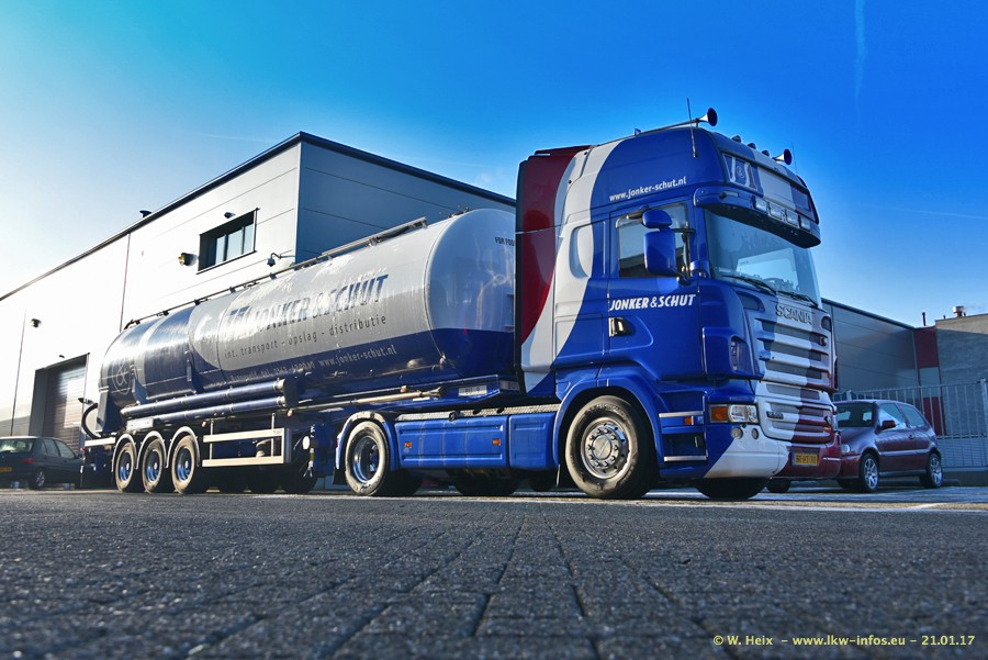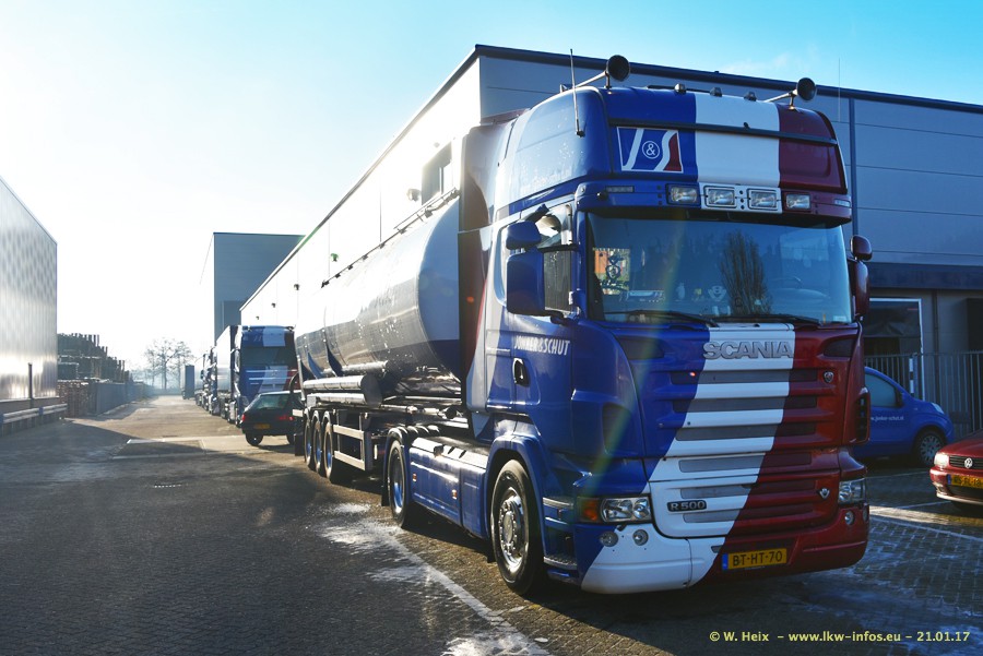 Es gibt wieder neue LKW bei Jonker & Schut: Das sind ein Volvo FM 4 400 mit Siloauflieger und ein DAF XF Euro 6 Planen-Hängerzug. Beides wieder schöne Fahrzeuge. Und auch fast der ganze Fuhrpark war zuhause und konnte fotografiert werden.