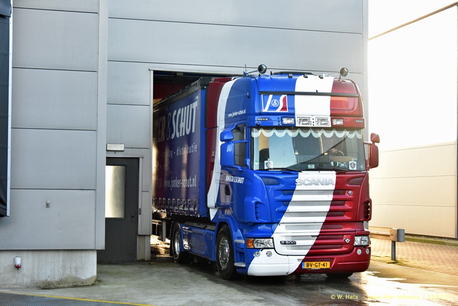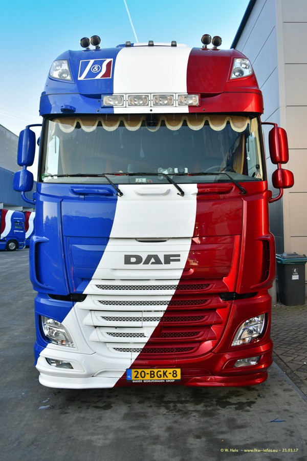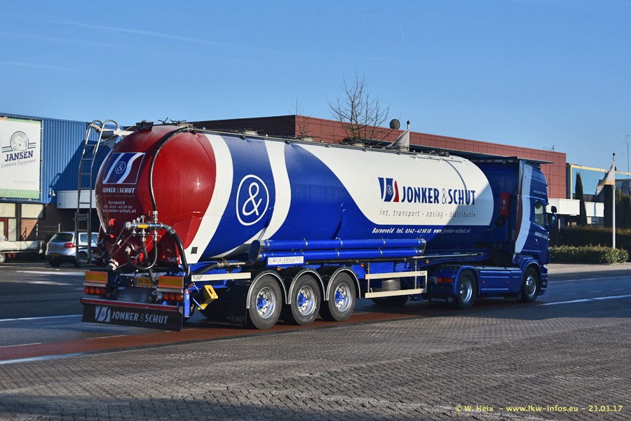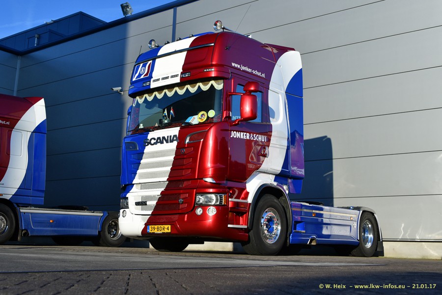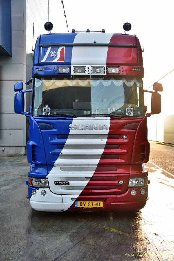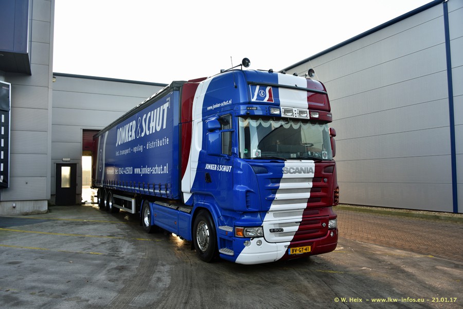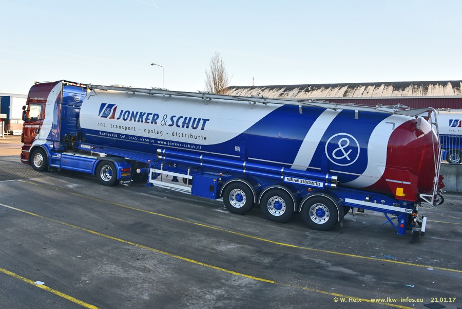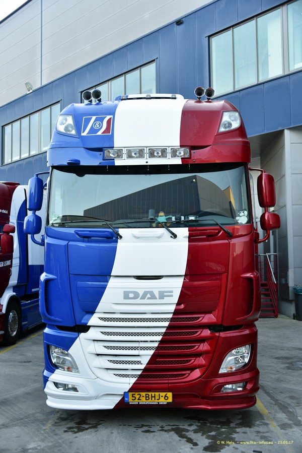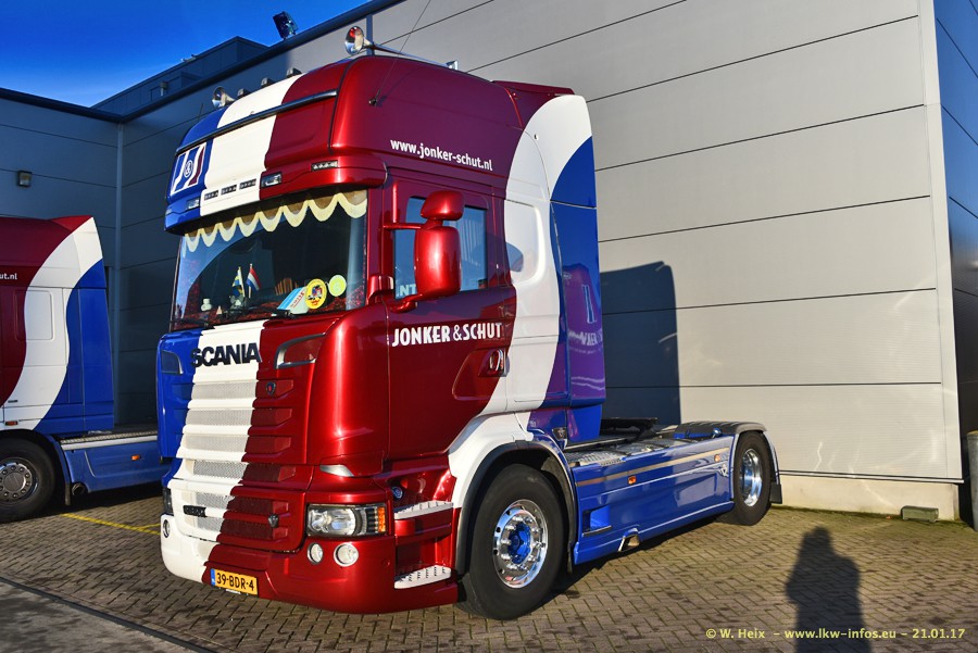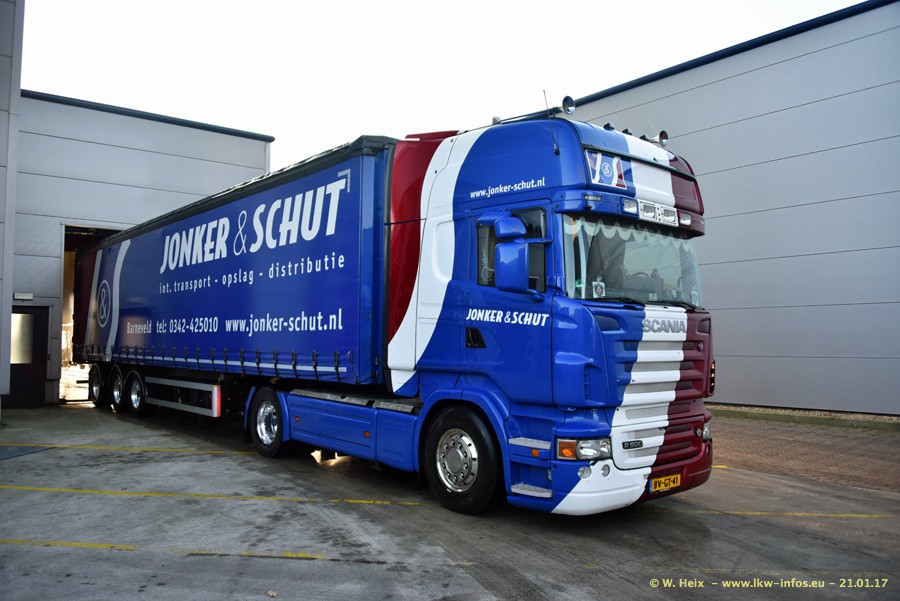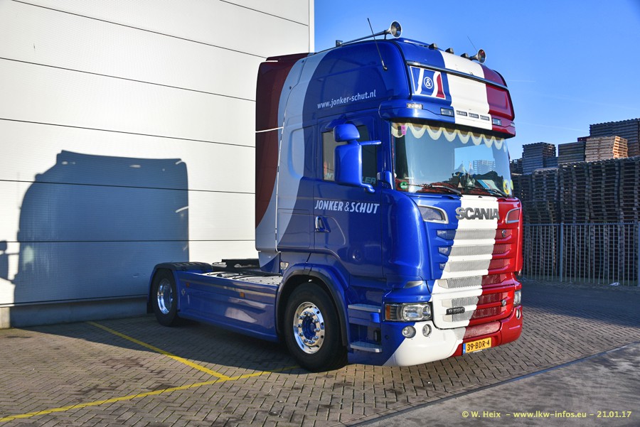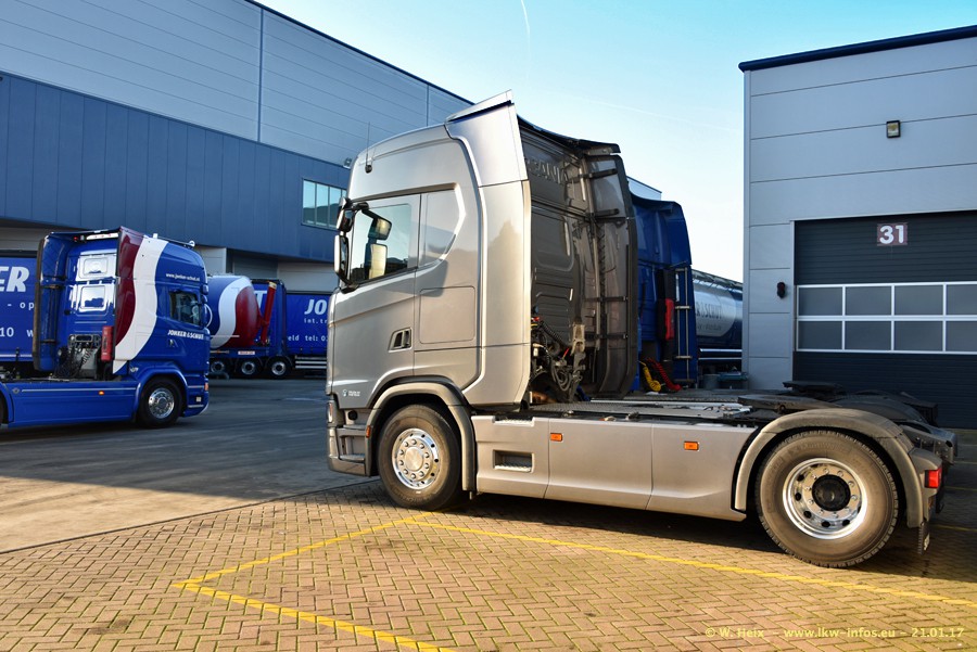 Es gibt wieder neue LKW bei Jonker & Schut: Das sind ein Volvo FM 4 400 mit Siloauflieger und ein DAF XF Euro 6 Planen-Hängerzug. Beides wieder schöne Fahrzeuge. Und auch fast der ganze Fuhrpark war zuhause und konnte fotografiert werden.
