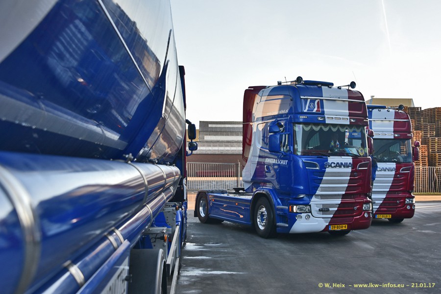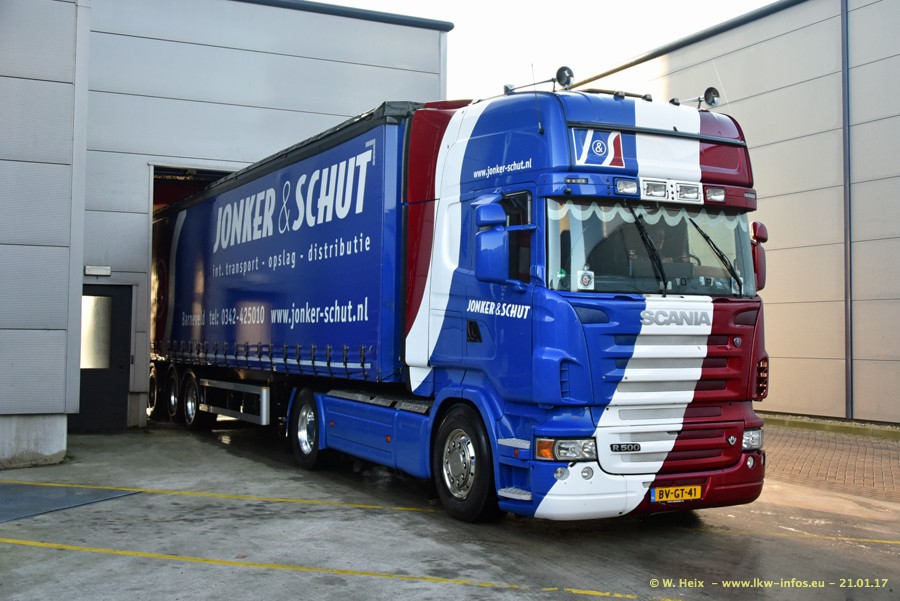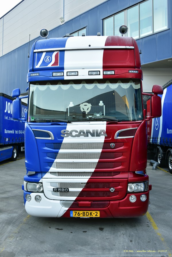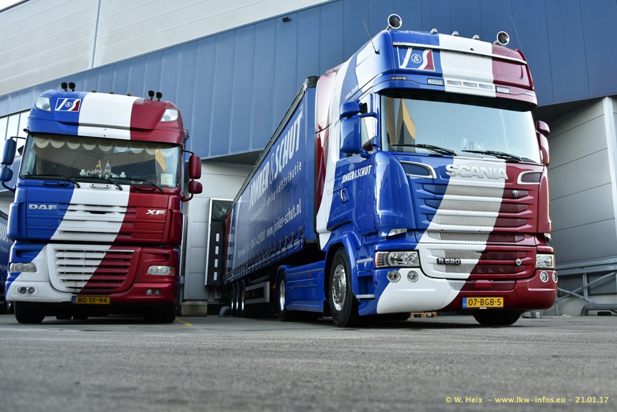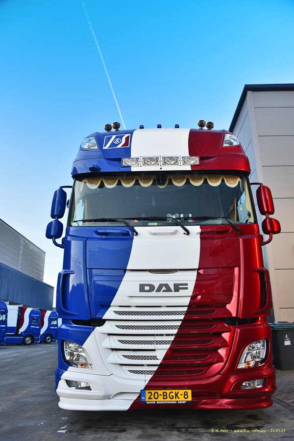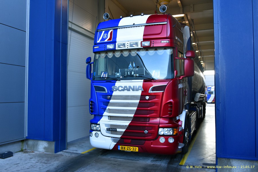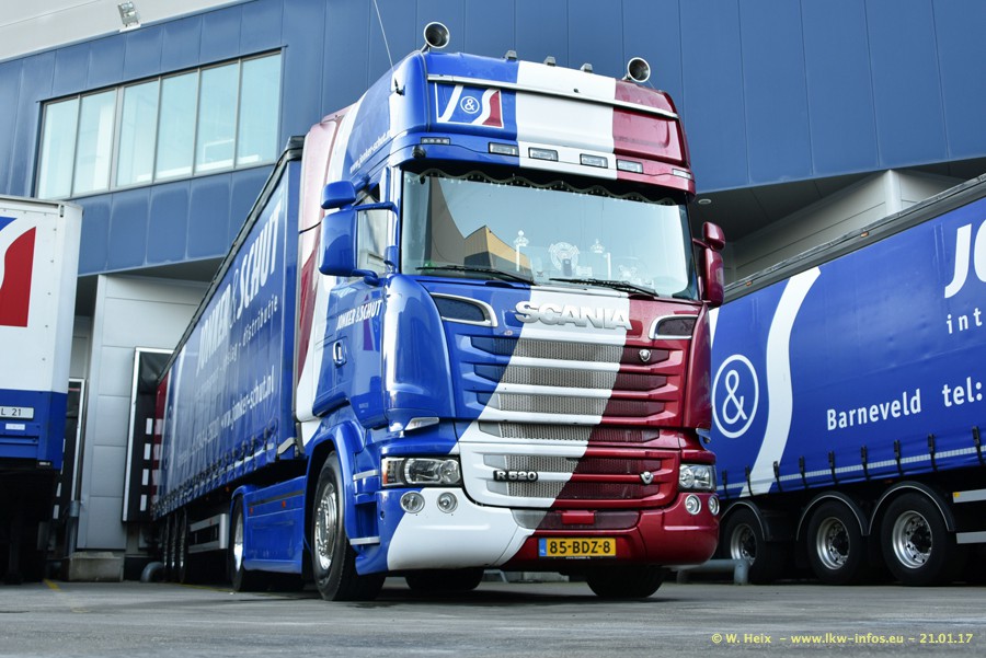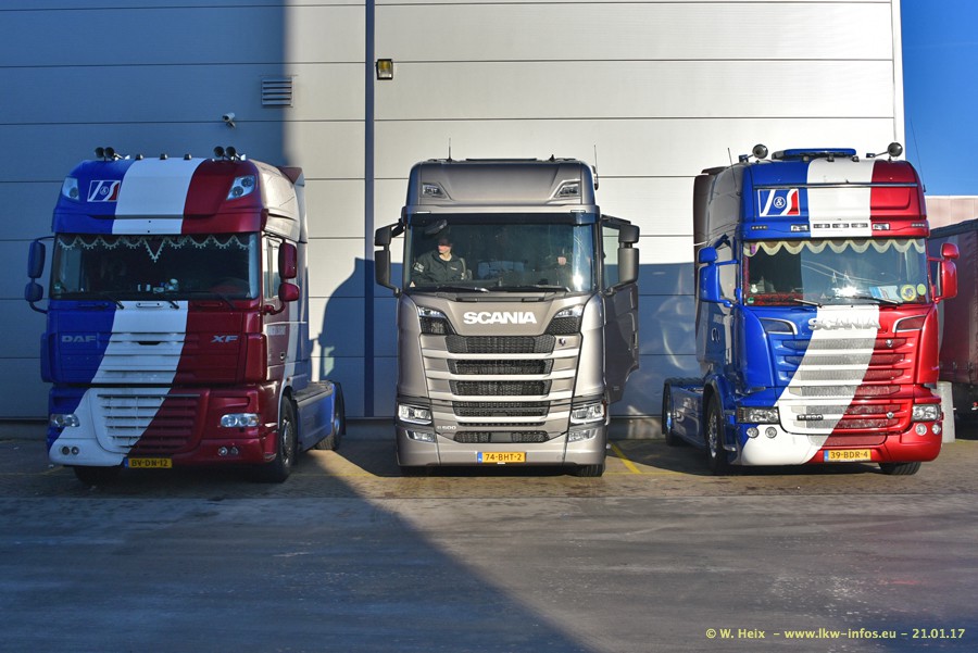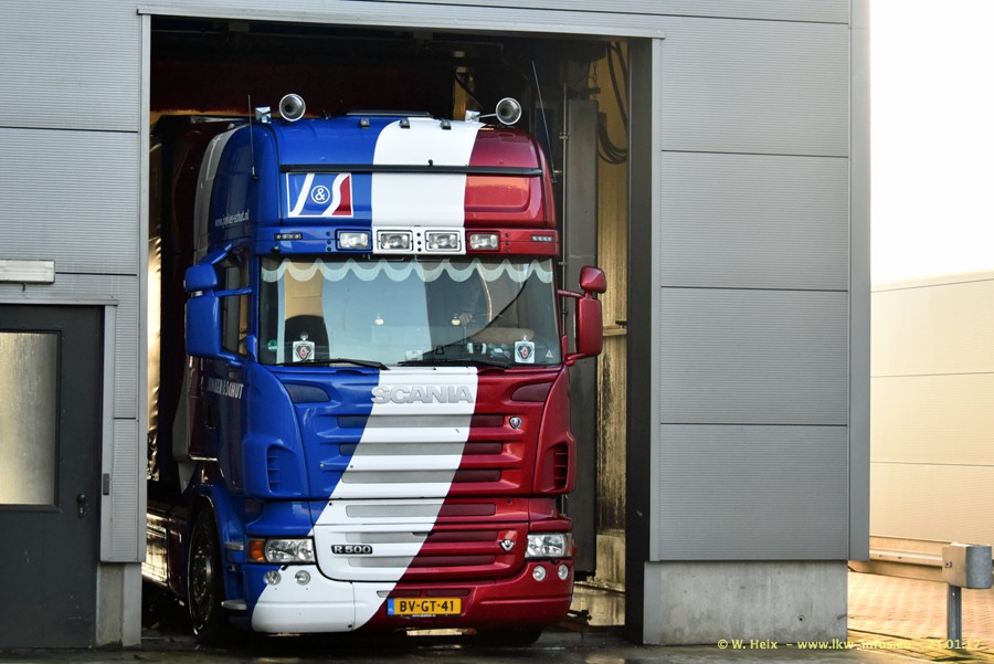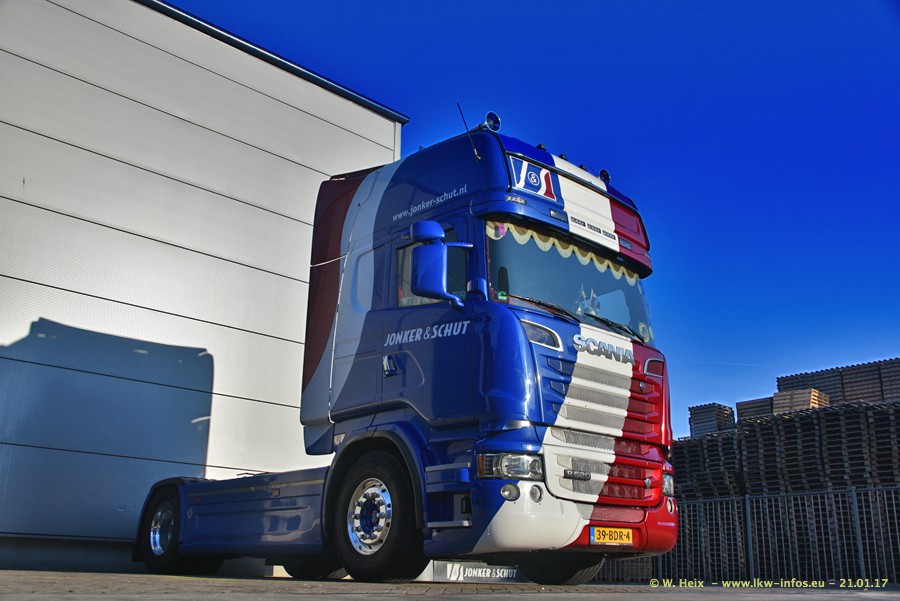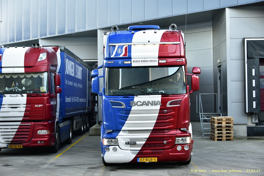 Es gibt wieder neue LKW bei Jonker & Schut: Das sind ein Volvo FM 4 400 mit Siloauflieger und ein DAF XF Euro 6 Planen-Hängerzug. Beides wieder schöne Fahrzeuge. Und auch fast der ganze Fuhrpark war zuhause und konnte fotografiert werden.