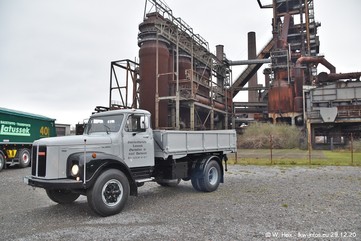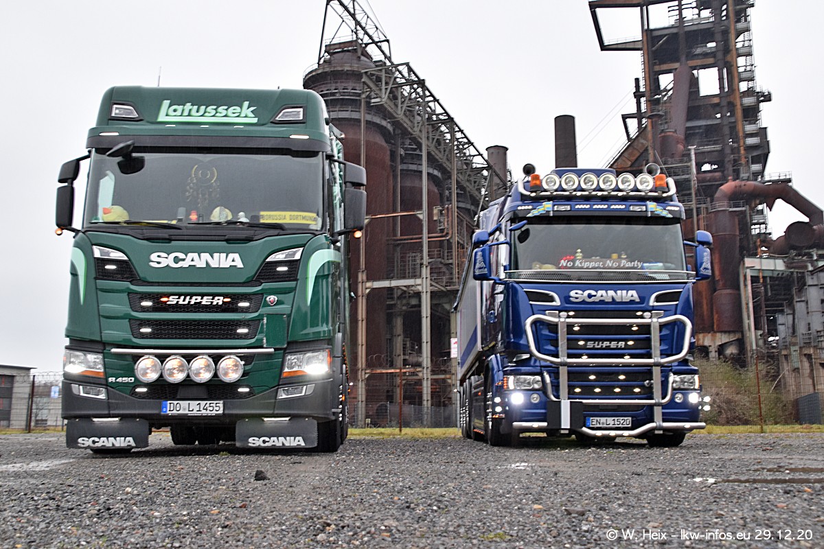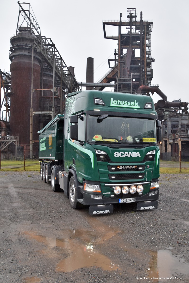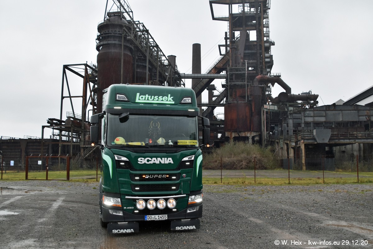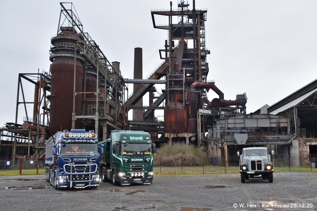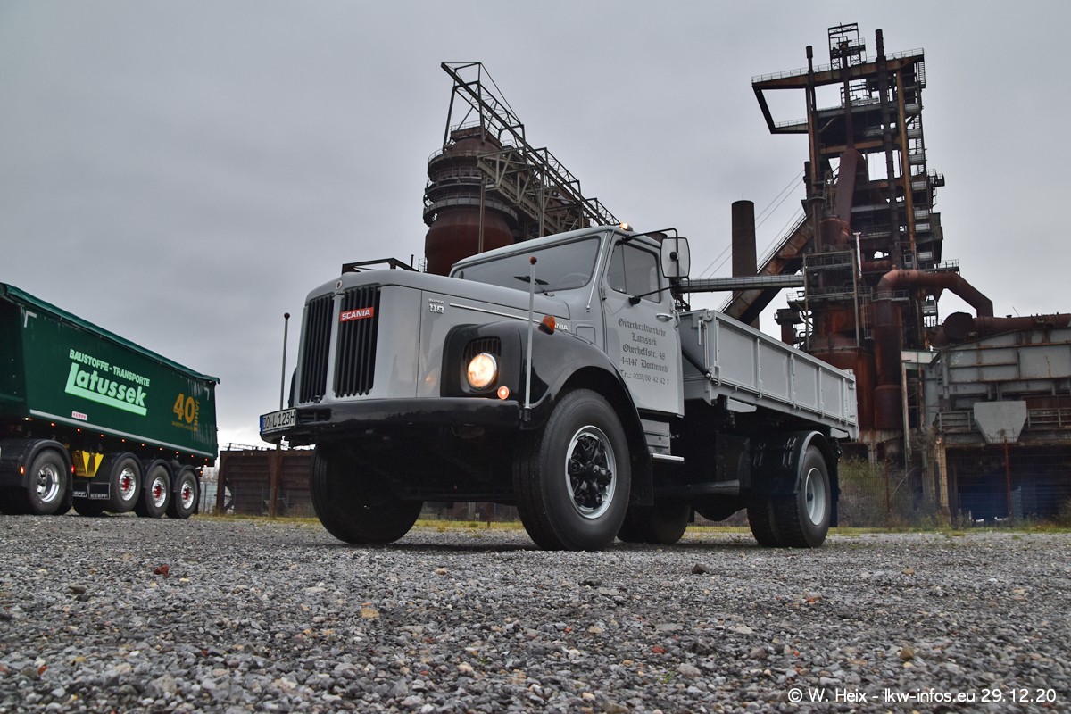 Am 29.12.2020 habe ich erstmals die Firma Latussek in Dortmund besucht. Während des Besuchs ergab sich dann spontan die Idee, im Anschluss an meinen Fotobesuch ein kleines Fotoshooting zu machen. Wir sind dann mit 5 LKW zum ehemaligen Hoesch-Gelände in Dortmund gefahren, das in der Nähe der B54 liegt. Die alte "Industrie-Ruine" ist ein toller Platz für Fotos. Mit dabei waren der graue SCANIA L 110 Kipper (Baujahr 1973, 305 PS), der MAN TGX Euro 6, der blaue SCANIA R 520 V8 Streamline, ein SCANIA R 450 XT NextGen 4x4 und ein SCANIA R 450 NextGen 4x2. Leider begann es während meiner Fotoarbeiten zu regnen sonst wären noch schönere Fotos möglich gewesen. Aber für Anfang 2021 ist schon ein weiteres Fotoshooting geplant, dann mit weiteren neuen LKW aus dem sehenswerten Fuhrpark.