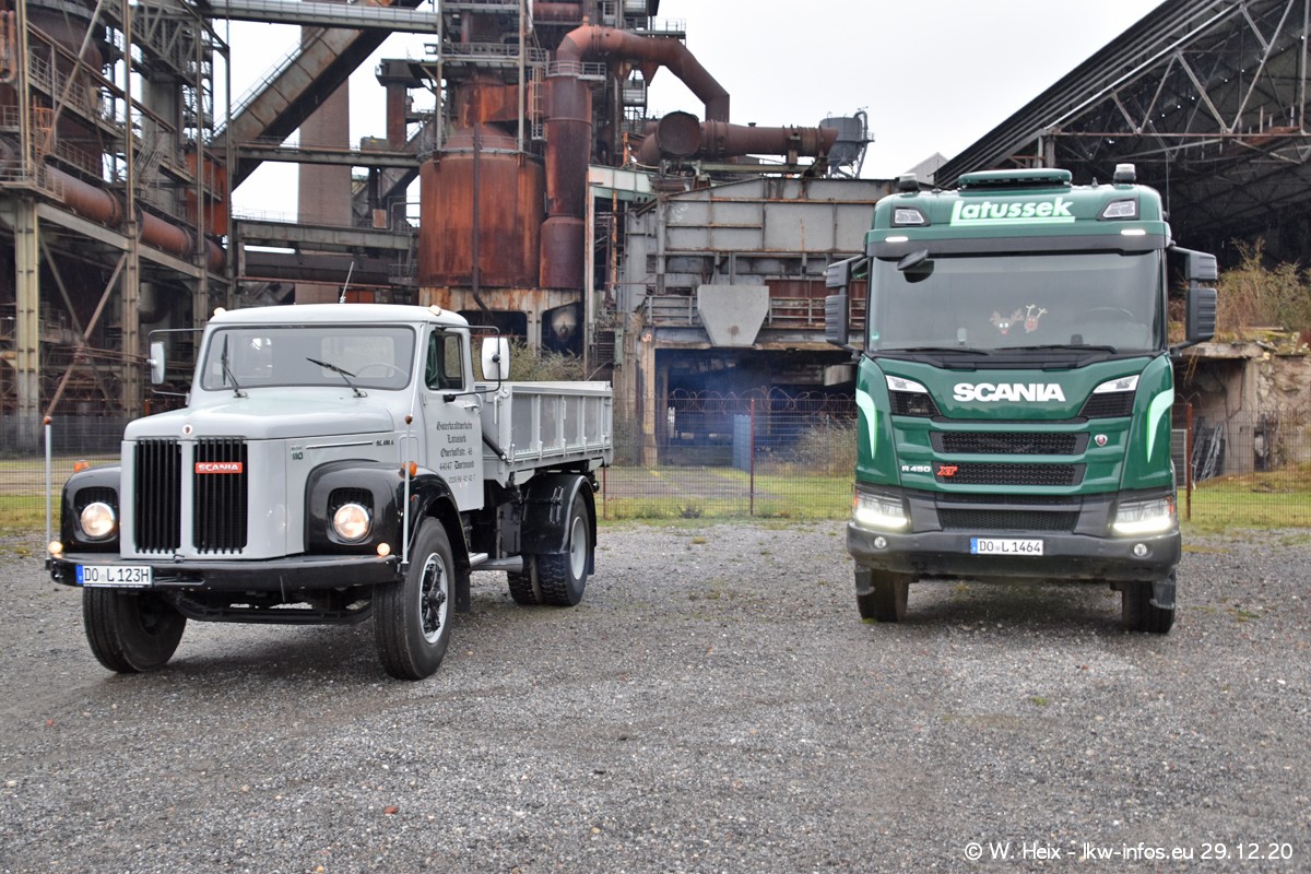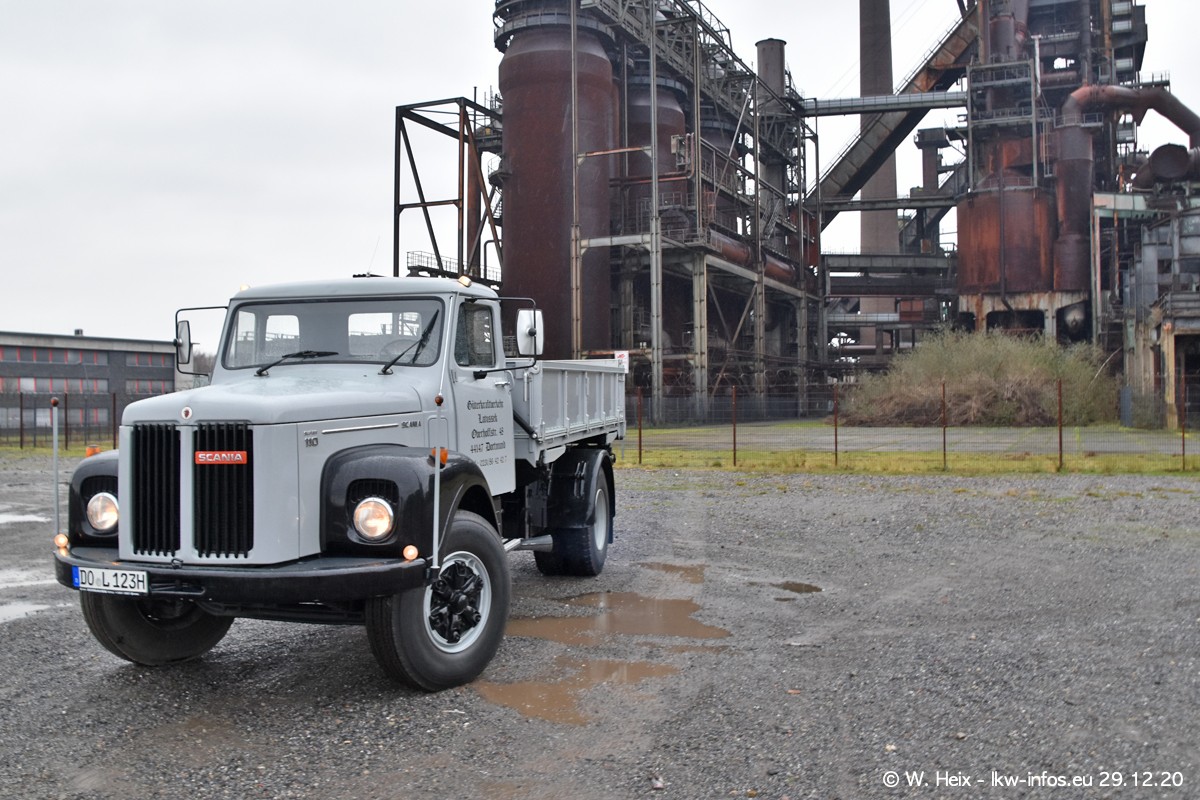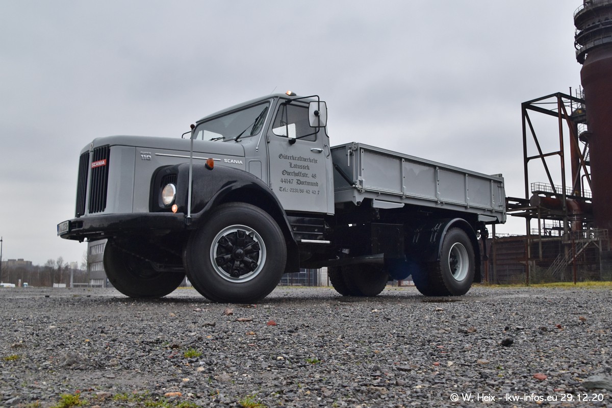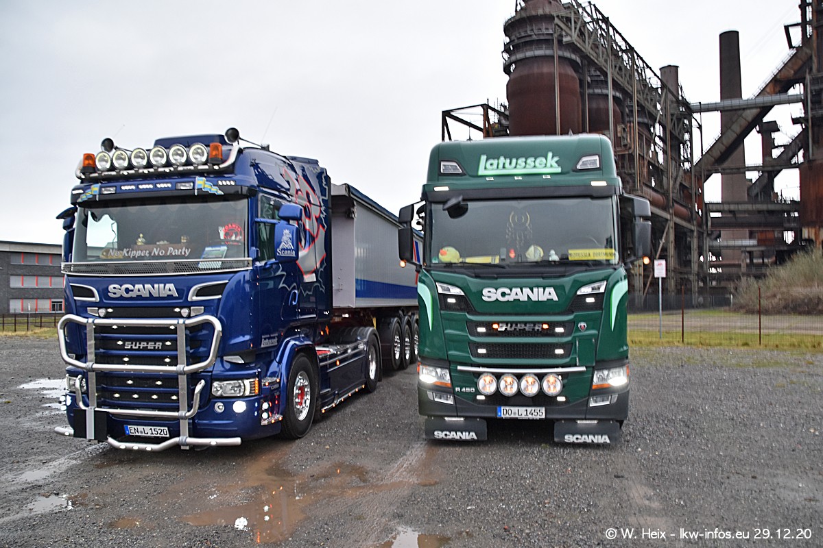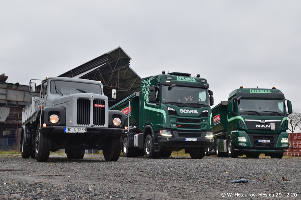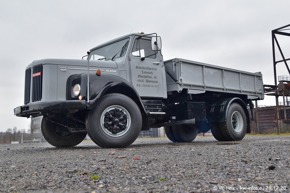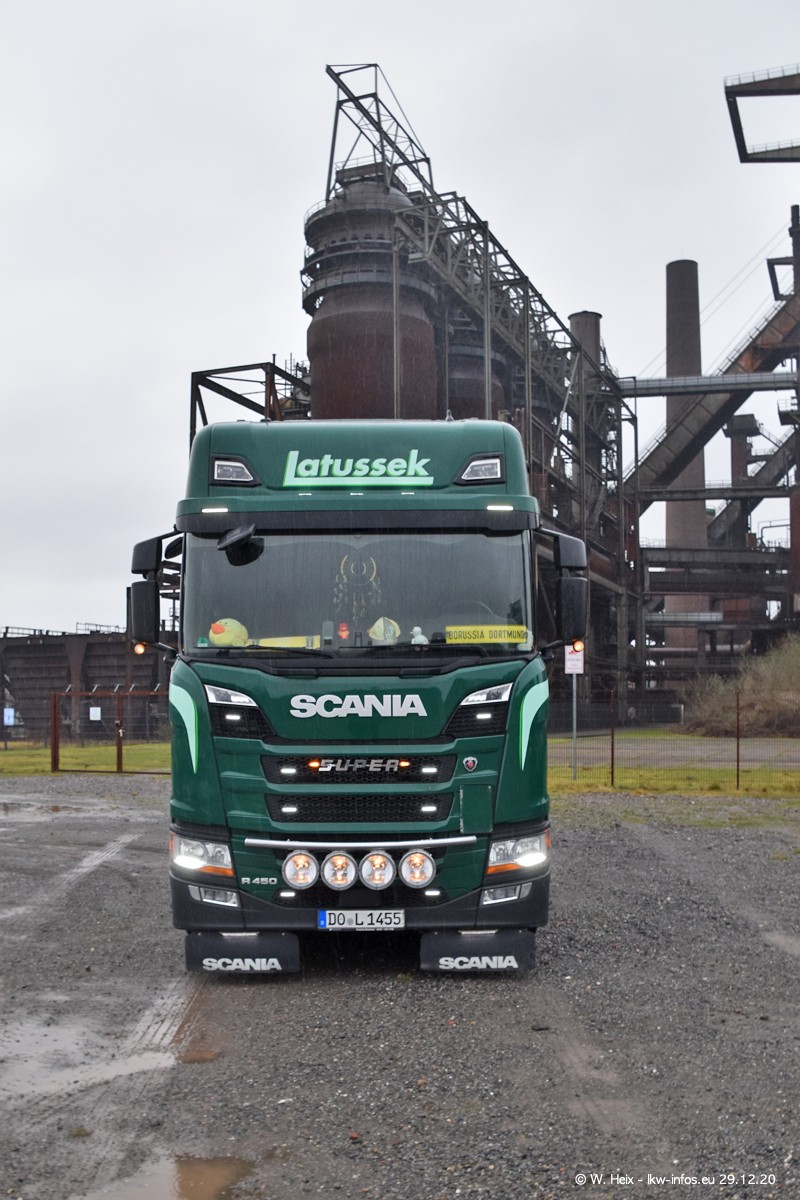 Am 29.12.2020 habe ich erstmals die Firma Latussek in Dortmund besucht. Während des Besuchs ergab sich dann spontan die Idee, im Anschluss an meinen Fotobesuch ein kleines Fotoshooting zu machen. Wir sind dann mit 5 LKW zum ehemaligen Hoesch-Gelände in Dortmund gefahren, das in der Nähe der B54 liegt. Die alte "Industrie-Ruine" ist ein toller Platz für Fotos. Mit dabei waren der graue SCANIA L 110 Kipper (Baujahr 1973, 305 PS), der MAN TGX Euro 6, der blaue SCANIA R 520 V8 Streamline, ein SCANIA R 450 XT NextGen 4x4 und ein SCANIA R 450 NextGen 4x2. Leider begann es während meiner Fotoarbeiten zu regnen sonst wären noch schönere Fotos möglich gewesen. Aber für Anfang 2021 ist schon ein weiteres Fotoshooting geplant, dann mit weiteren neuen LKW aus dem sehenswerten Fuhrpark.