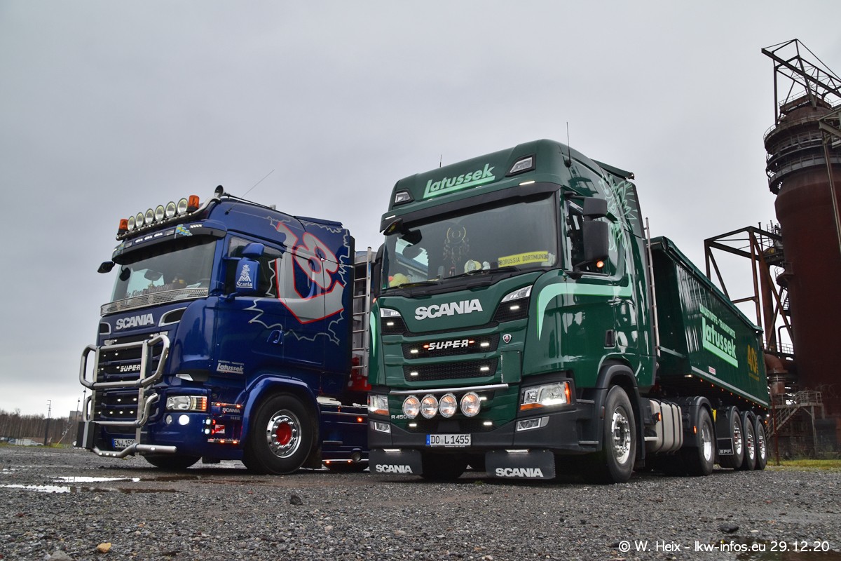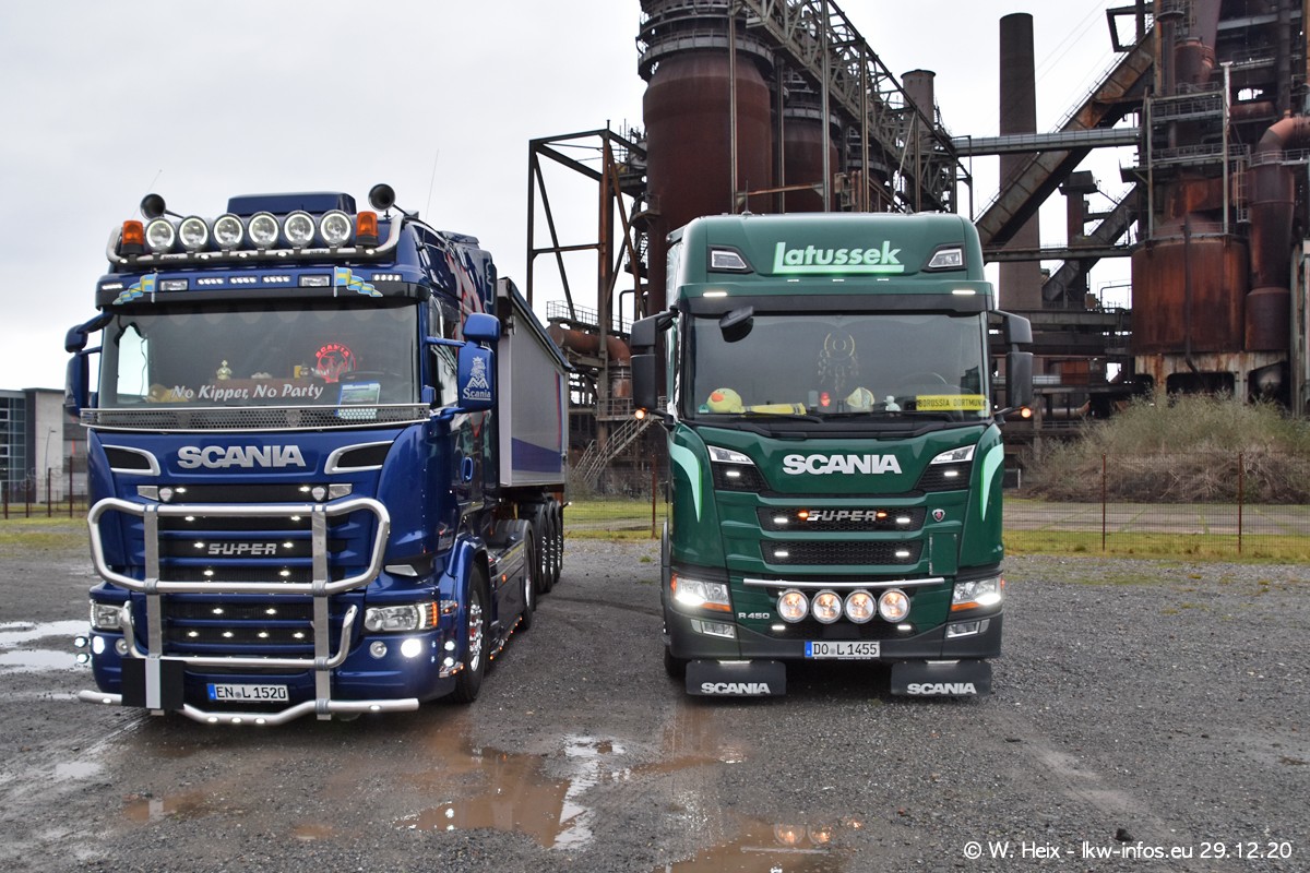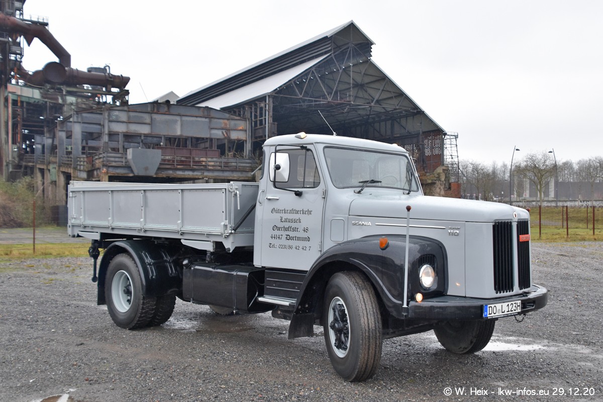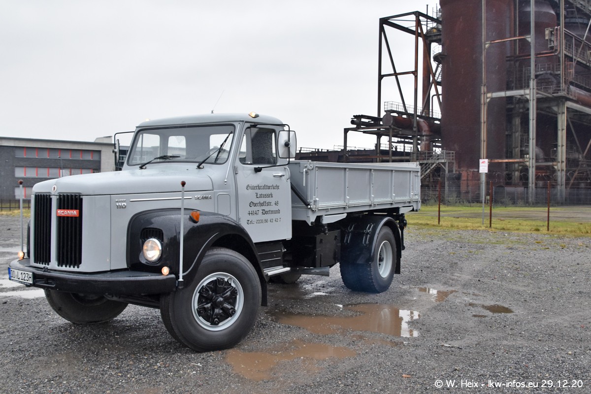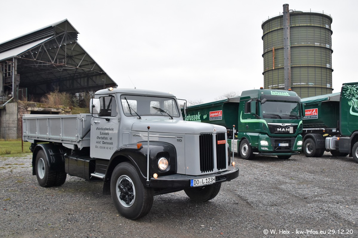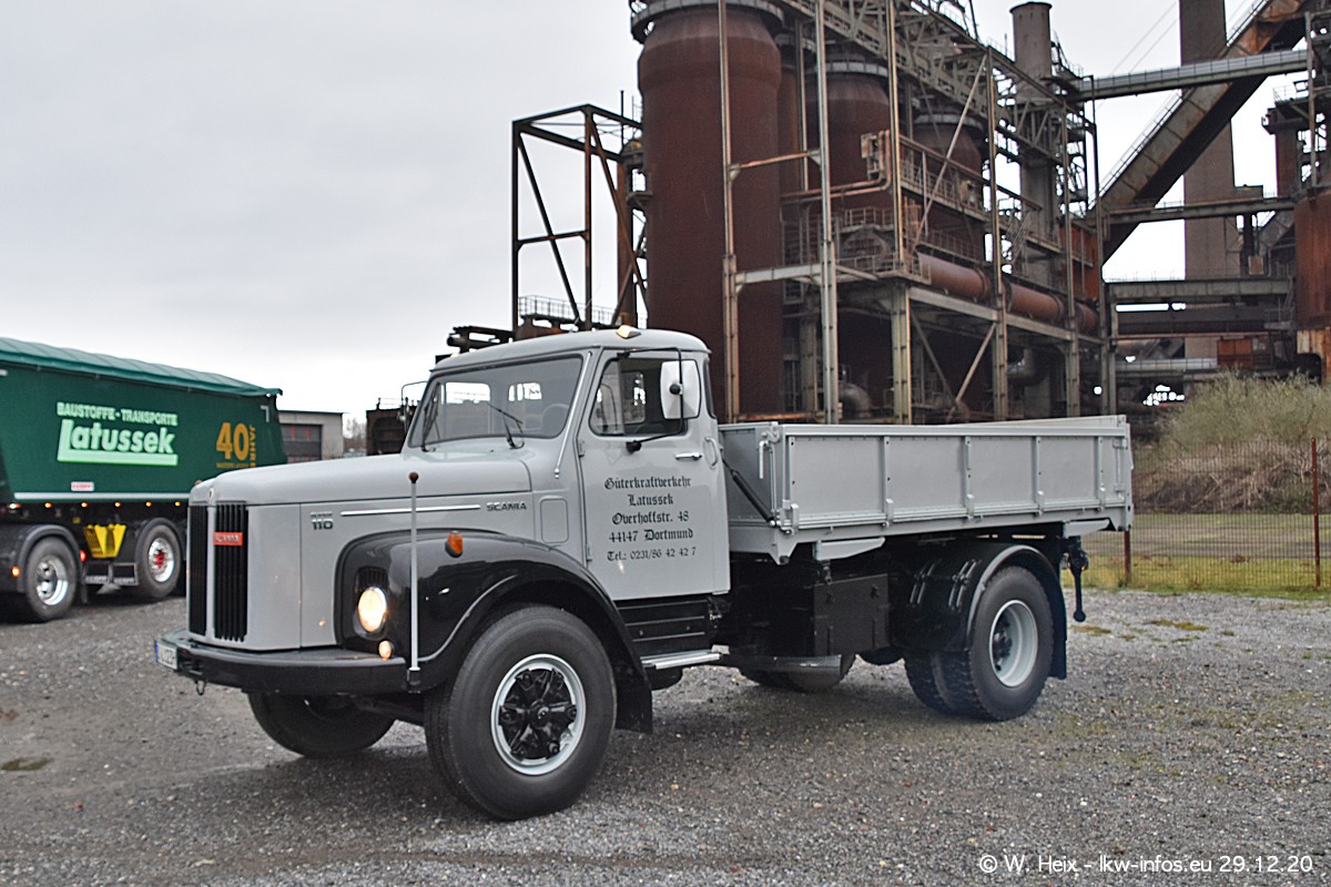 Am 29.12.2020 habe ich erstmals die Firma Latussek in Dortmund besucht. Während des Besuchs ergab sich dann spontan die Idee, im Anschluss an meinen Fotobesuch ein kleines Fotoshooting zu machen. Wir sind dann mit 5 LKW zum ehemaligen Hoesch-Gelände in Dortmund gefahren, das in der Nähe der B54 liegt. Die alte "Industrie-Ruine" ist ein toller Platz für Fotos. Mit dabei waren der graue SCANIA L 110 Kipper (Baujahr 1973, 305 PS), der MAN TGX Euro 6, der blaue SCANIA R 520 V8 Streamline, ein SCANIA R 450 XT NextGen 4x4 und ein SCANIA R 450 NextGen 4x2. Leider begann es während meiner Fotoarbeiten zu regnen sonst wären noch schönere Fotos möglich gewesen. Aber für Anfang 2021 ist schon ein weiteres Fotoshooting geplant, dann mit weiteren neuen LKW aus dem sehenswerten Fuhrpark.
