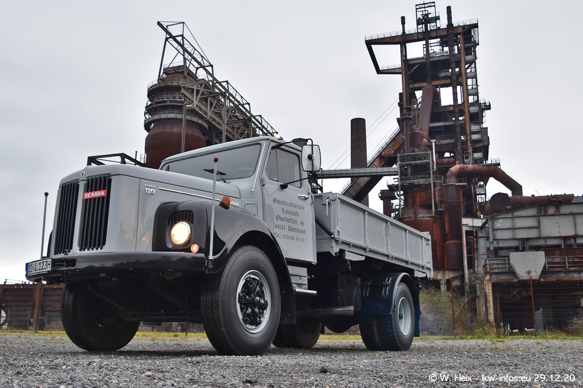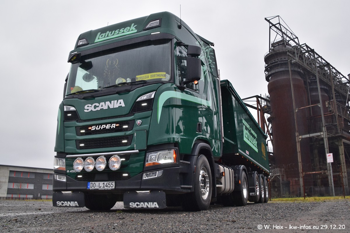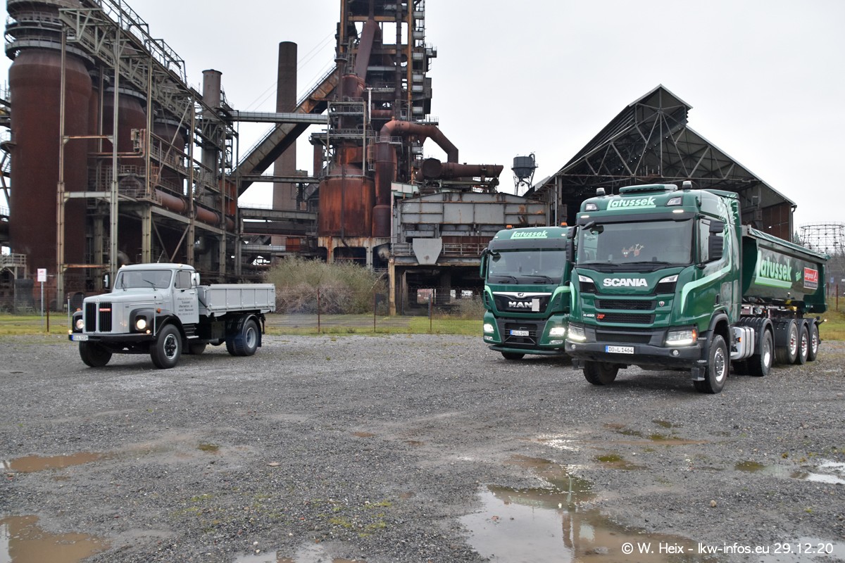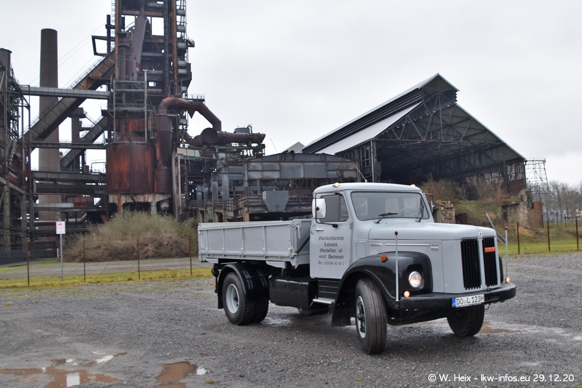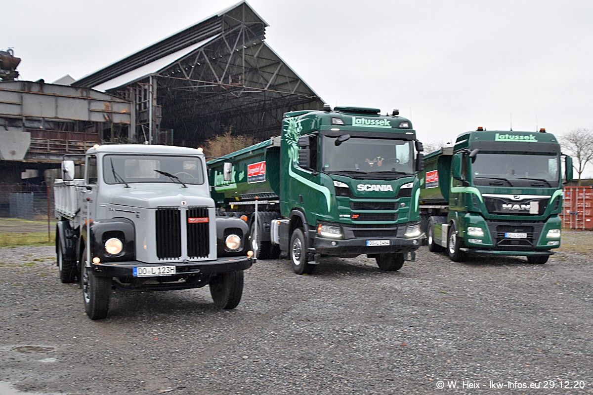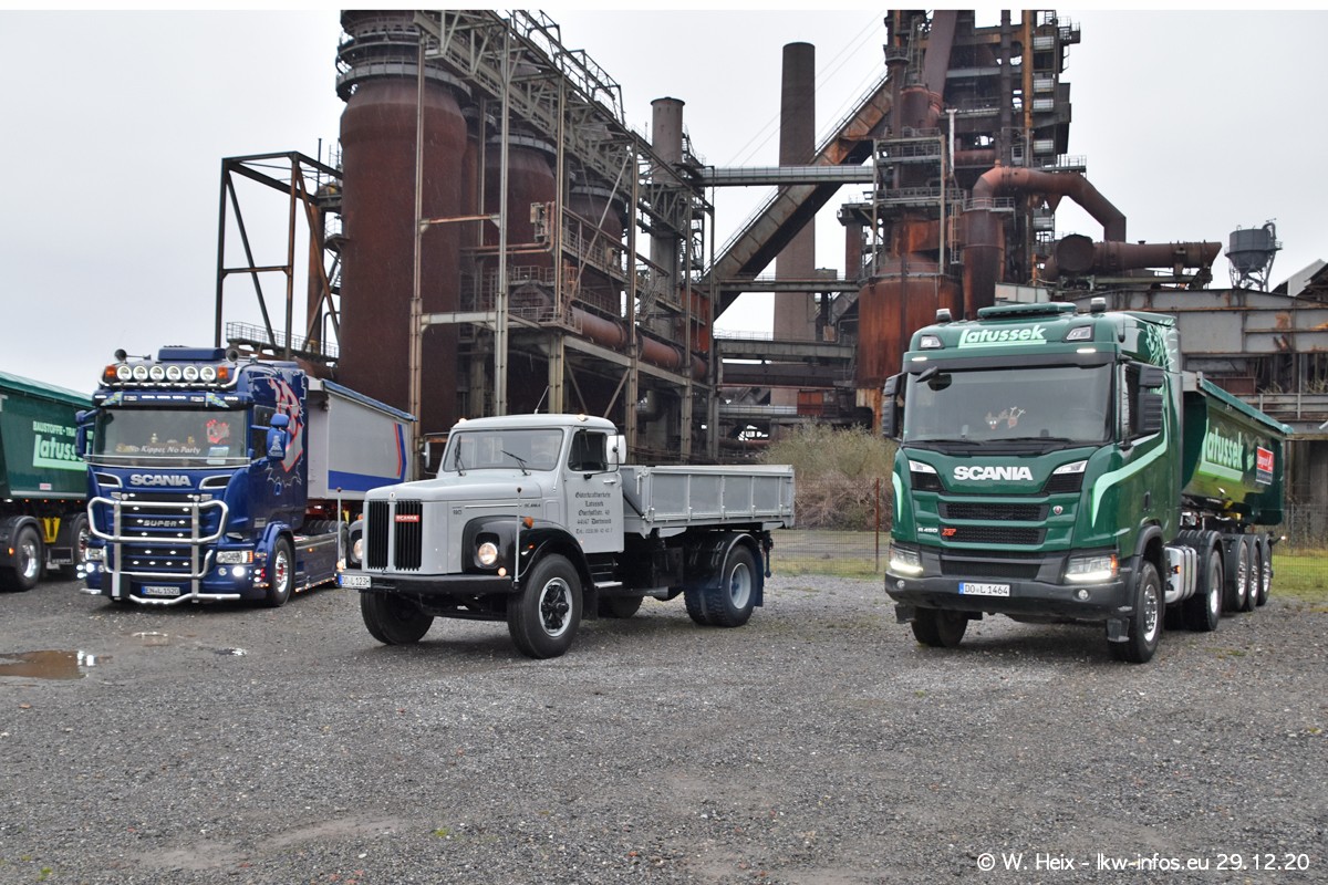 Am 29.12.2020 habe ich erstmals die Firma Latussek in Dortmund besucht. Während des Besuchs ergab sich dann spontan die Idee, im Anschluss an meinen Fotobesuch ein kleines Fotoshooting zu machen. Wir sind dann mit 5 LKW zum ehemaligen Hoesch-Gelände in Dortmund gefahren, das in der Nähe der B54 liegt. Die alte "Industrie-Ruine" ist ein toller Platz für Fotos. Mit dabei waren der graue SCANIA L 110 Kipper (Baujahr 1973, 305 PS), der MAN TGX Euro 6, der blaue SCANIA R 520 V8 Streamline, ein SCANIA R 450 XT NextGen 4x4 und ein SCANIA R 450 NextGen 4x2. Leider begann es während meiner Fotoarbeiten zu regnen sonst wären noch schönere Fotos möglich gewesen. Aber für Anfang 2021 ist schon ein weiteres Fotoshooting geplant, dann mit weiteren neuen LKW aus dem sehenswerten Fuhrpark.