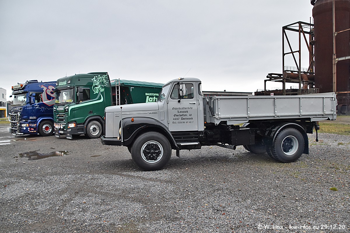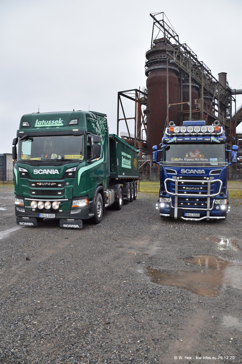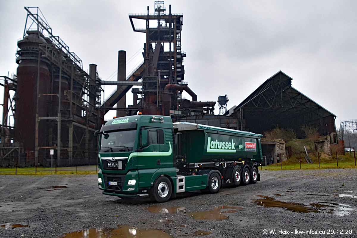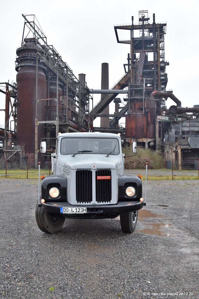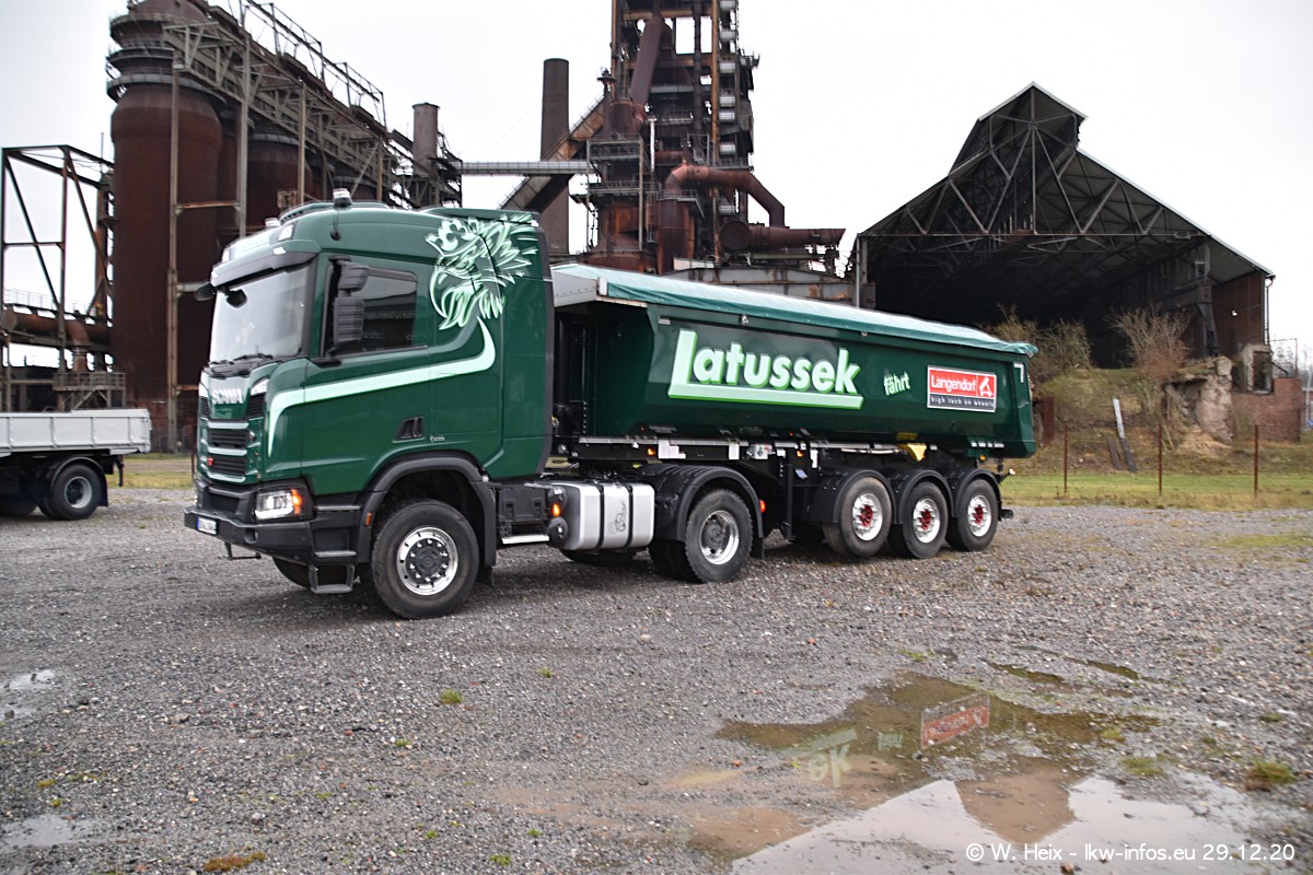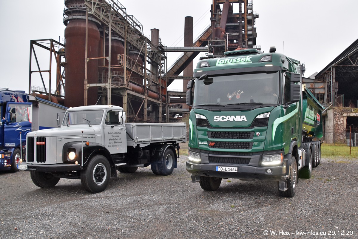 Am 29.12.2020 habe ich erstmals die Firma Latussek in Dortmund besucht. Während des Besuchs ergab sich dann spontan die Idee, im Anschluss an meinen Fotobesuch ein kleines Fotoshooting zu machen. Wir sind dann mit 5 LKW zum ehemaligen Hoesch-Gelände in Dortmund gefahren, das in der Nähe der B54 liegt. Die alte "Industrie-Ruine" ist ein toller Platz für Fotos. Mit dabei waren der graue SCANIA L 110 Kipper (Baujahr 1973, 305 PS), der MAN TGX Euro 6, der blaue SCANIA R 520 V8 Streamline, ein SCANIA R 450 XT NextGen 4x4 und ein SCANIA R 450 NextGen 4x2. Leider begann es während meiner Fotoarbeiten zu regnen sonst wären noch schönere Fotos möglich gewesen. Aber für Anfang 2021 ist schon ein weiteres Fotoshooting geplant, dann mit weiteren neuen LKW aus dem sehenswerten Fuhrpark.
