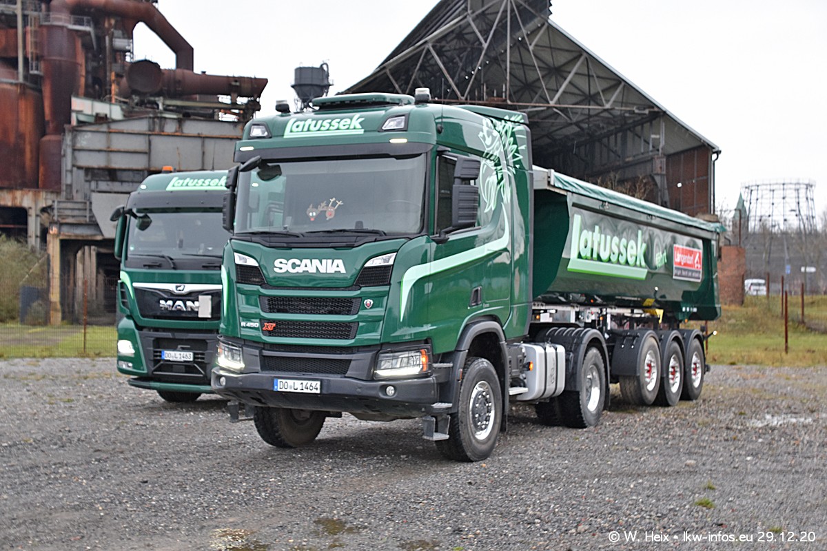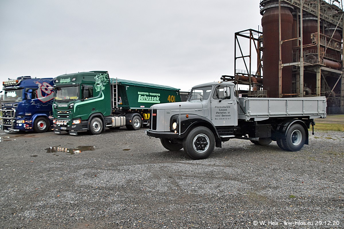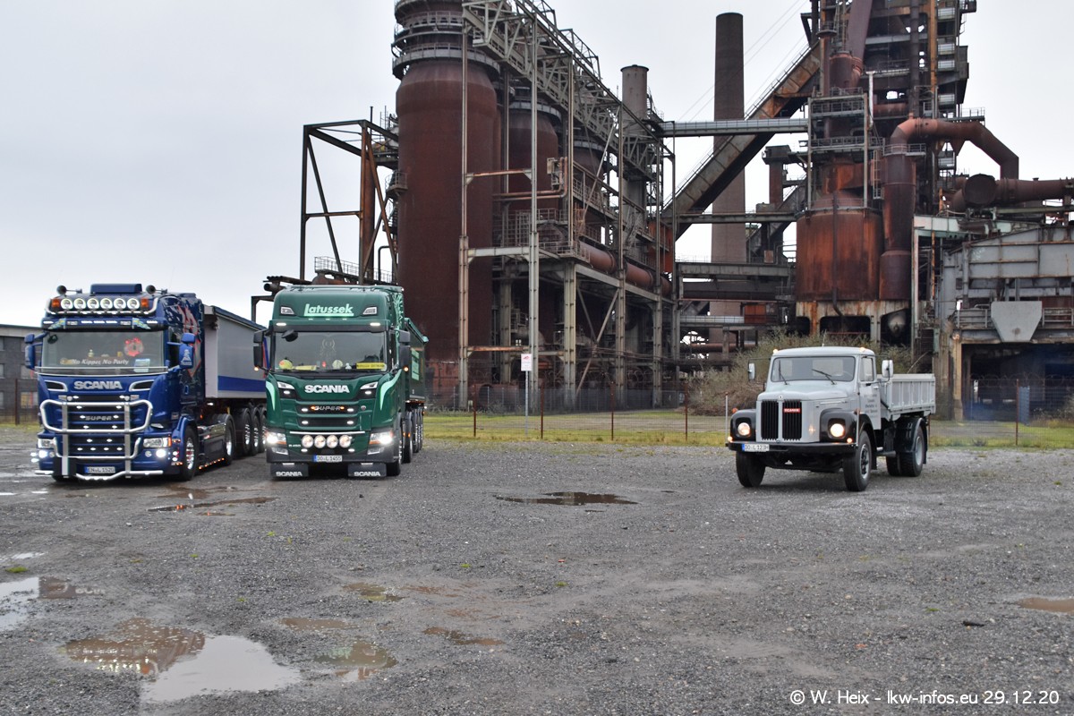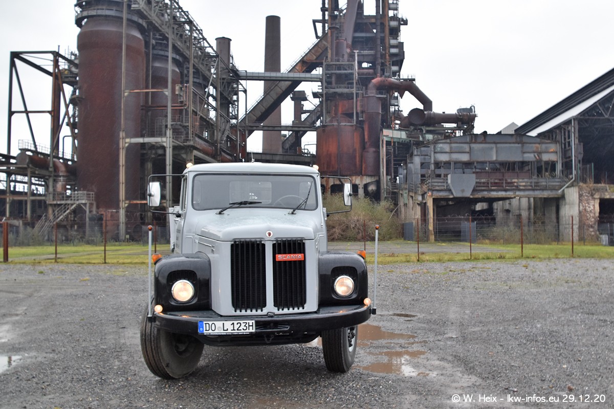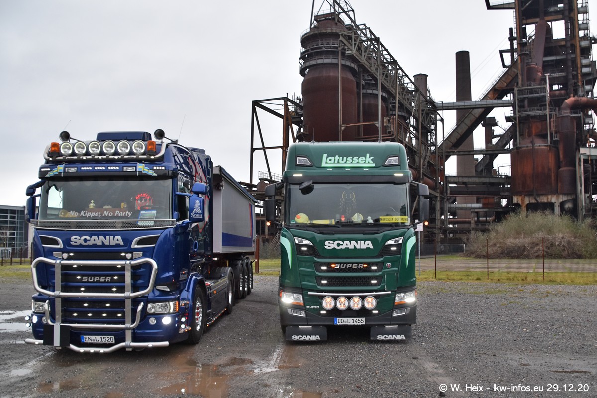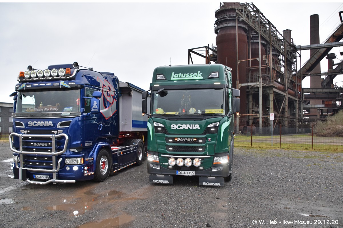 Am 29.12.2020 habe ich erstmals die Firma Latussek in Dortmund besucht. Während des Besuchs ergab sich dann spontan die Idee, im Anschluss an meinen Fotobesuch ein kleines Fotoshooting zu machen. Wir sind dann mit 5 LKW zum ehemaligen Hoesch-Gelände in Dortmund gefahren, das in der Nähe der B54 liegt. Die alte "Industrie-Ruine" ist ein toller Platz für Fotos. Mit dabei waren der graue SCANIA L 110 Kipper (Baujahr 1973, 305 PS), der MAN TGX Euro 6, der blaue SCANIA R 520 V8 Streamline, ein SCANIA R 450 XT NextGen 4x4 und ein SCANIA R 450 NextGen 4x2. Leider begann es während meiner Fotoarbeiten zu regnen sonst wären noch schönere Fotos möglich gewesen. Aber für Anfang 2021 ist schon ein weiteres Fotoshooting geplant, dann mit weiteren neuen LKW aus dem sehenswerten Fuhrpark.