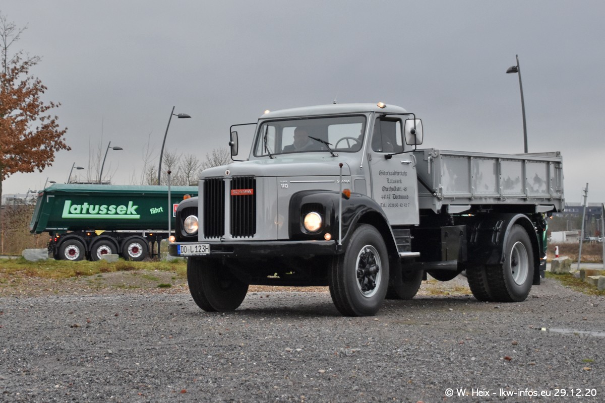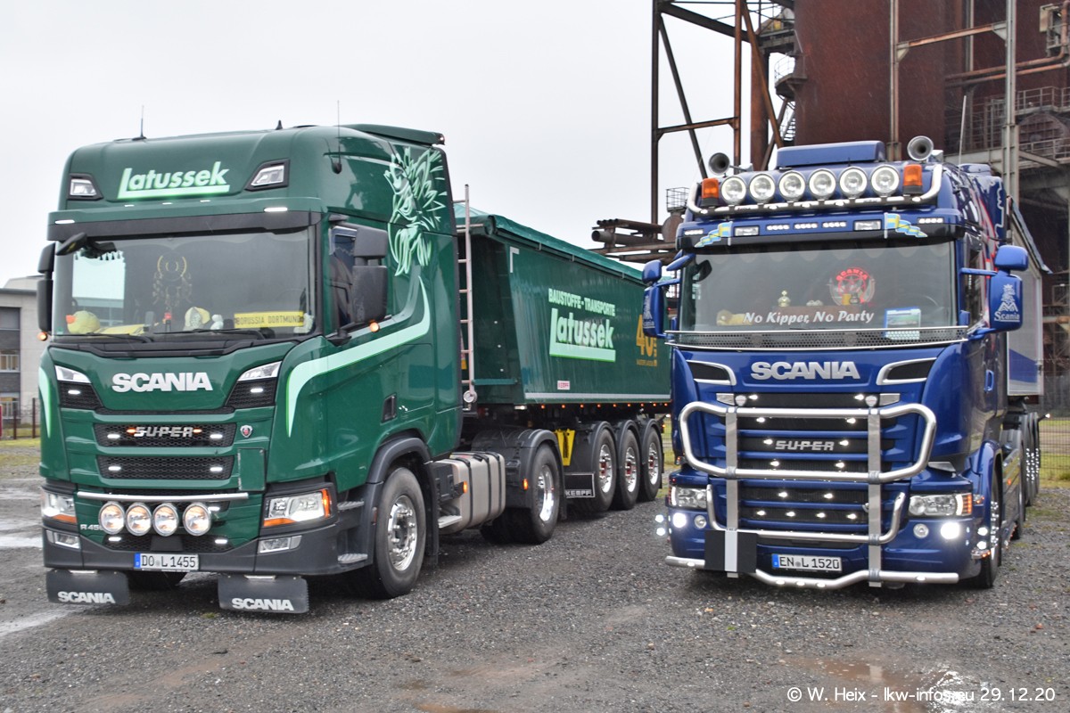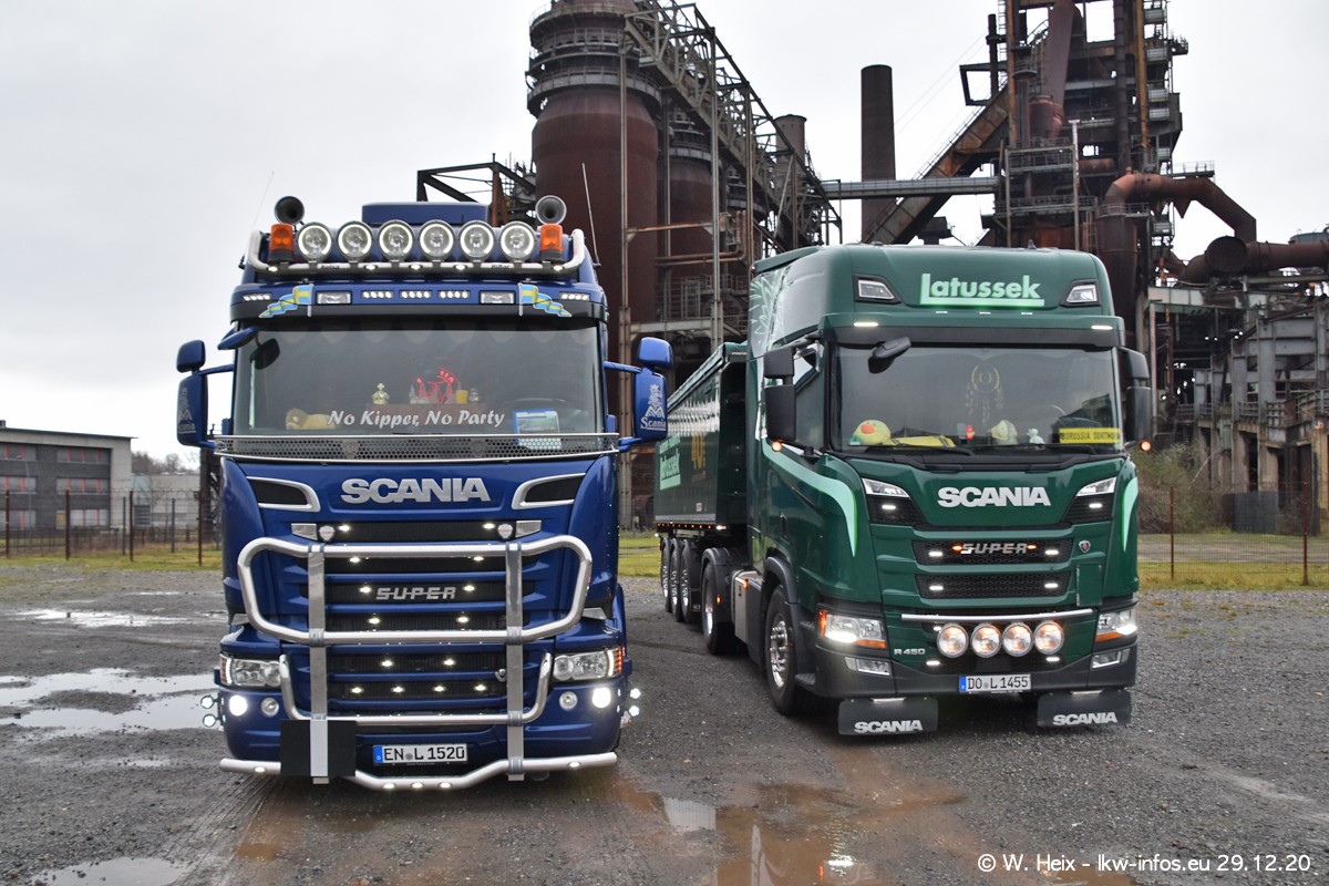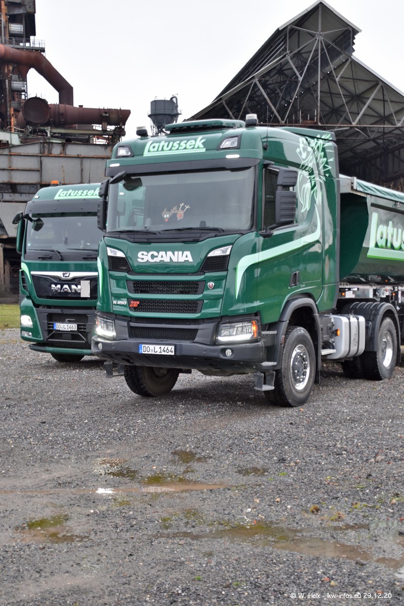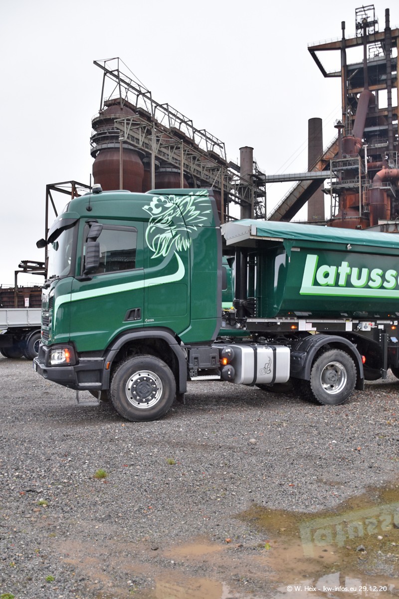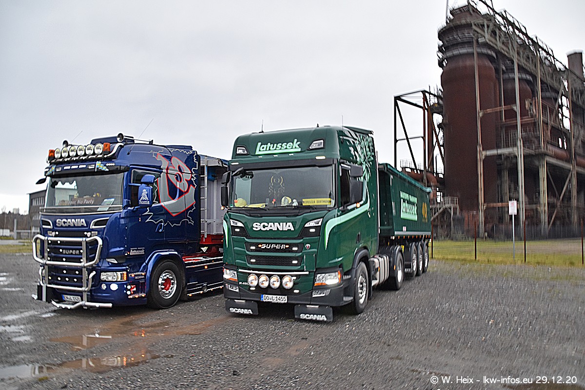 Am 29.12.2020 habe ich erstmals die Firma Latussek in Dortmund besucht. Während des Besuchs ergab sich dann spontan die Idee, im Anschluss an meinen Fotobesuch ein kleines Fotoshooting zu machen. Wir sind dann mit 5 LKW zum ehemaligen Hoesch-Gelände in Dortmund gefahren, das in der Nähe der B54 liegt. Die alte "Industrie-Ruine" ist ein toller Platz für Fotos. Mit dabei waren der graue SCANIA L 110 Kipper (Baujahr 1973, 305 PS), der MAN TGX Euro 6, der blaue SCANIA R 520 V8 Streamline, ein SCANIA R 450 XT NextGen 4x4 und ein SCANIA R 450 NextGen 4x2. Leider begann es während meiner Fotoarbeiten zu regnen sonst wären noch schönere Fotos möglich gewesen. Aber für Anfang 2021 ist schon ein weiteres Fotoshooting geplant, dann mit weiteren neuen LKW aus dem sehenswerten Fuhrpark.