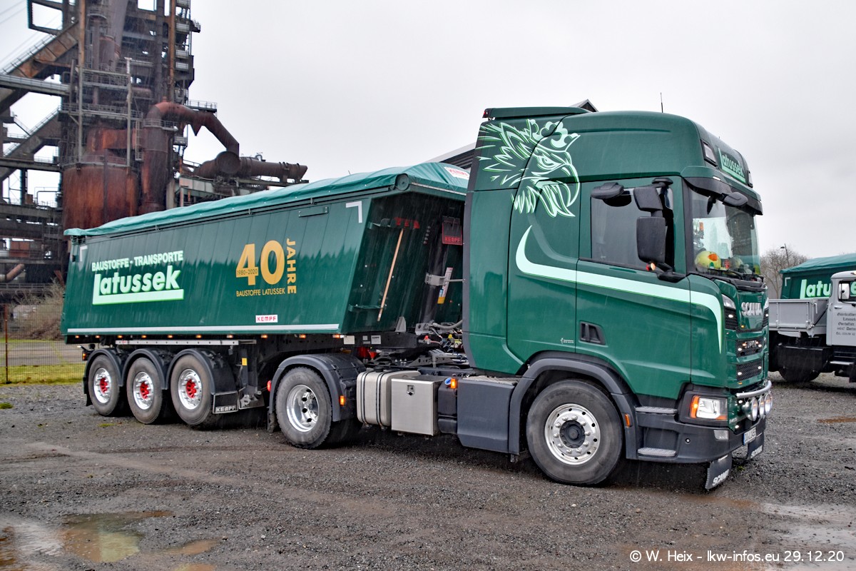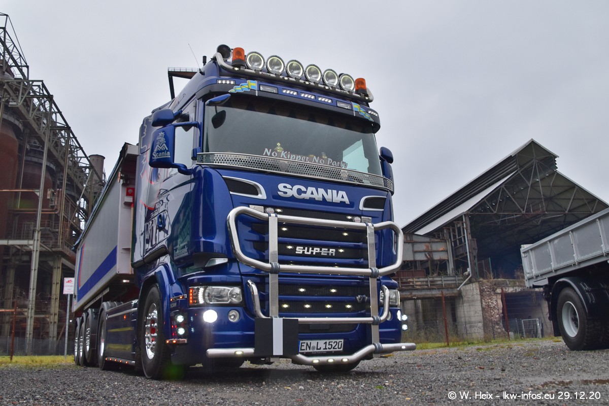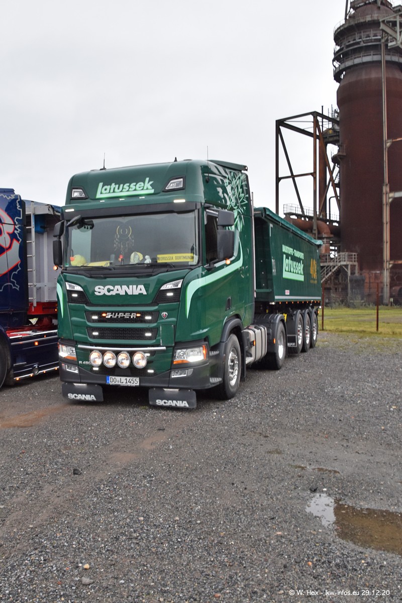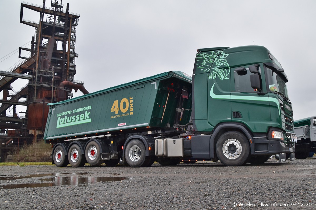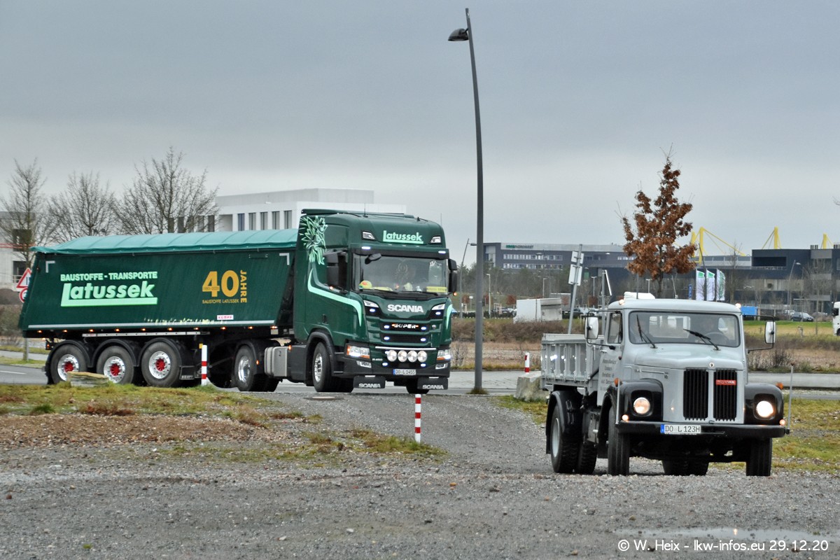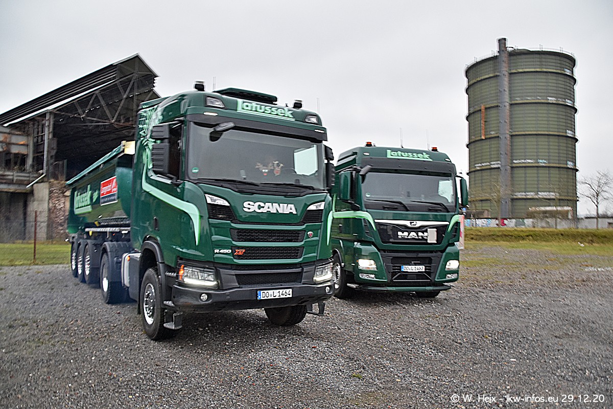 Am 29.12.2020 habe ich erstmals die Firma Latussek in Dortmund besucht. Während des Besuchs ergab sich dann spontan die Idee, im Anschluss an meinen Fotobesuch ein kleines Fotoshooting zu machen. Wir sind dann mit 5 LKW zum ehemaligen Hoesch-Gelände in Dortmund gefahren, das in der Nähe der B54 liegt. Die alte "Industrie-Ruine" ist ein toller Platz für Fotos. Mit dabei waren der graue SCANIA L 110 Kipper (Baujahr 1973, 305 PS), der MAN TGX Euro 6, der blaue SCANIA R 520 V8 Streamline, ein SCANIA R 450 XT NextGen 4x4 und ein SCANIA R 450 NextGen 4x2. Leider begann es während meiner Fotoarbeiten zu regnen sonst wären noch schönere Fotos möglich gewesen. Aber für Anfang 2021 ist schon ein weiteres Fotoshooting geplant, dann mit weiteren neuen LKW aus dem sehenswerten Fuhrpark.