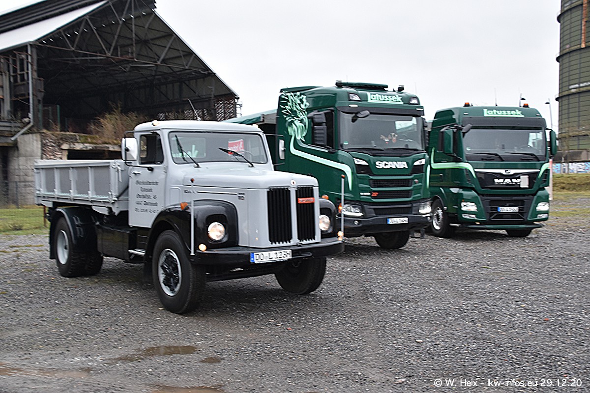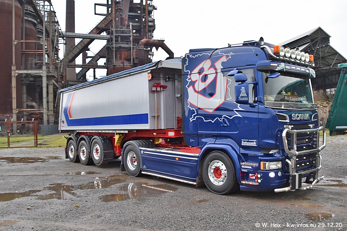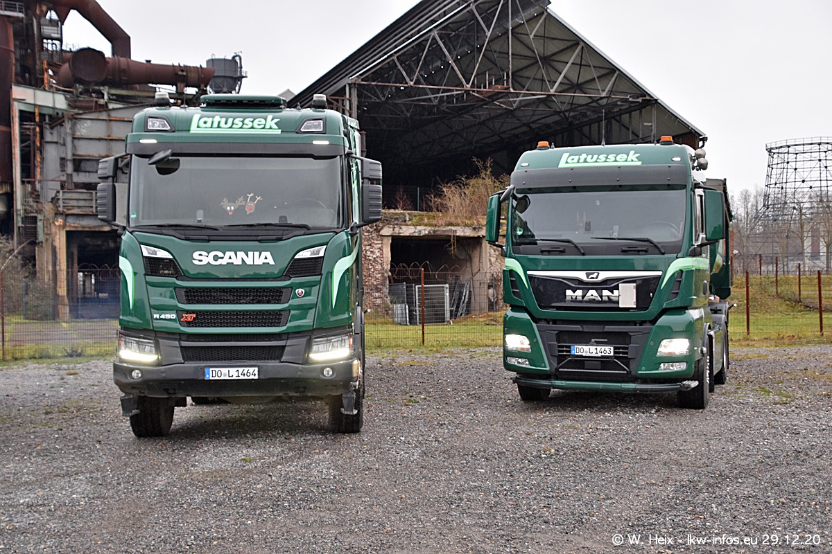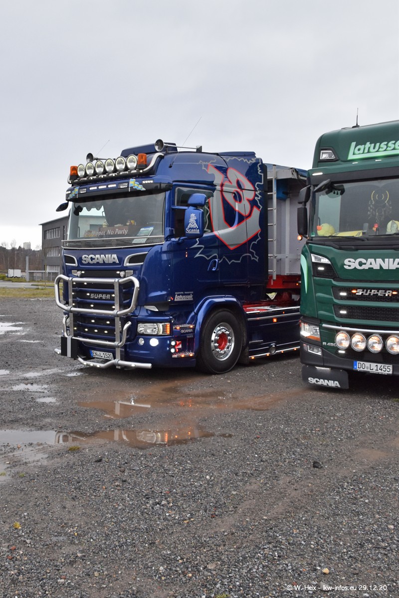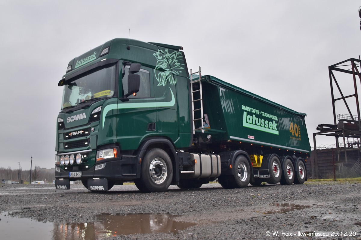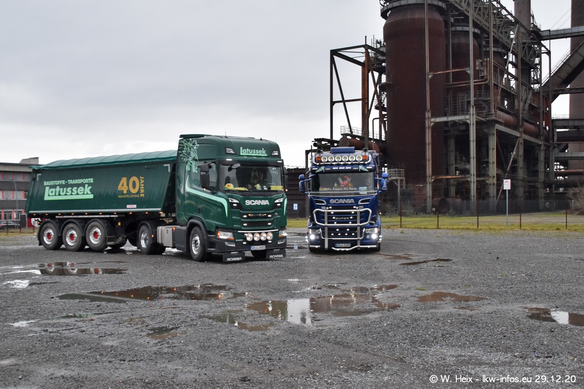 Am 29.12.2020 habe ich erstmals die Firma Latussek in Dortmund besucht. Während des Besuchs ergab sich dann spontan die Idee, im Anschluss an meinen Fotobesuch ein kleines Fotoshooting zu machen. Wir sind dann mit 5 LKW zum ehemaligen Hoesch-Gelände in Dortmund gefahren, das in der Nähe der B54 liegt. Die alte "Industrie-Ruine" ist ein toller Platz für Fotos. Mit dabei waren der graue SCANIA L 110 Kipper (Baujahr 1973, 305 PS), der MAN TGX Euro 6, der blaue SCANIA R 520 V8 Streamline, ein SCANIA R 450 XT NextGen 4x4 und ein SCANIA R 450 NextGen 4x2. Leider begann es während meiner Fotoarbeiten zu regnen sonst wären noch schönere Fotos möglich gewesen. Aber für Anfang 2021 ist schon ein weiteres Fotoshooting geplant, dann mit weiteren neuen LKW aus dem sehenswerten Fuhrpark.