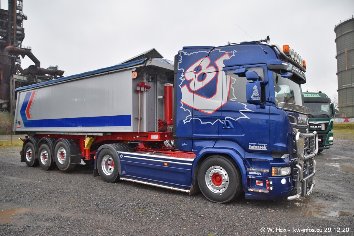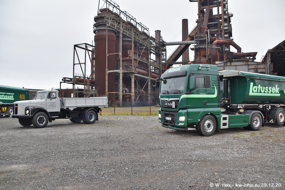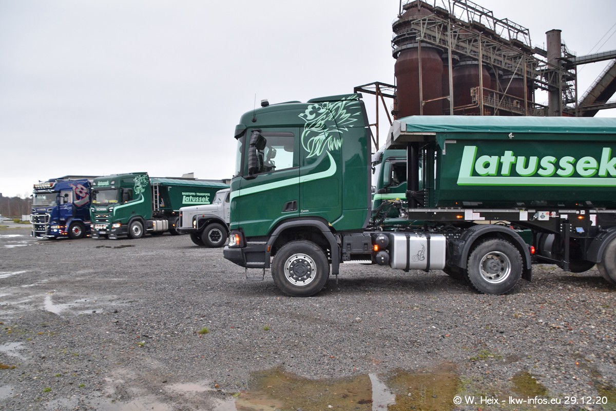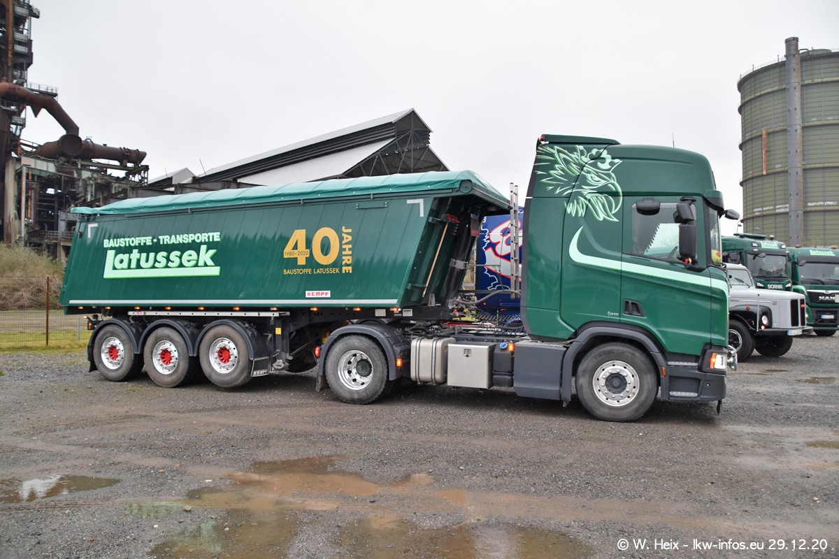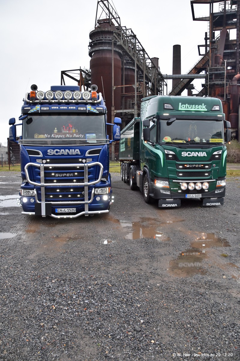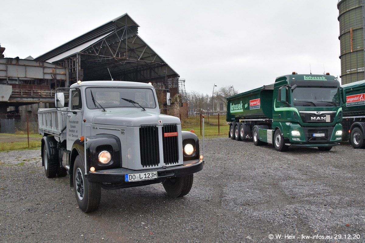 Am 29.12.2020 habe ich erstmals die Firma Latussek in Dortmund besucht. Während des Besuchs ergab sich dann spontan die Idee, im Anschluss an meinen Fotobesuch ein kleines Fotoshooting zu machen. Wir sind dann mit 5 LKW zum ehemaligen Hoesch-Gelände in Dortmund gefahren, das in der Nähe der B54 liegt. Die alte "Industrie-Ruine" ist ein toller Platz für Fotos. Mit dabei waren der graue SCANIA L 110 Kipper (Baujahr 1973, 305 PS), der MAN TGX Euro 6, der blaue SCANIA R 520 V8 Streamline, ein SCANIA R 450 XT NextGen 4x4 und ein SCANIA R 450 NextGen 4x2. Leider begann es während meiner Fotoarbeiten zu regnen sonst wären noch schönere Fotos möglich gewesen. Aber für Anfang 2021 ist schon ein weiteres Fotoshooting geplant, dann mit weiteren neuen LKW aus dem sehenswerten Fuhrpark.