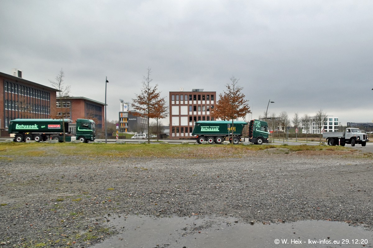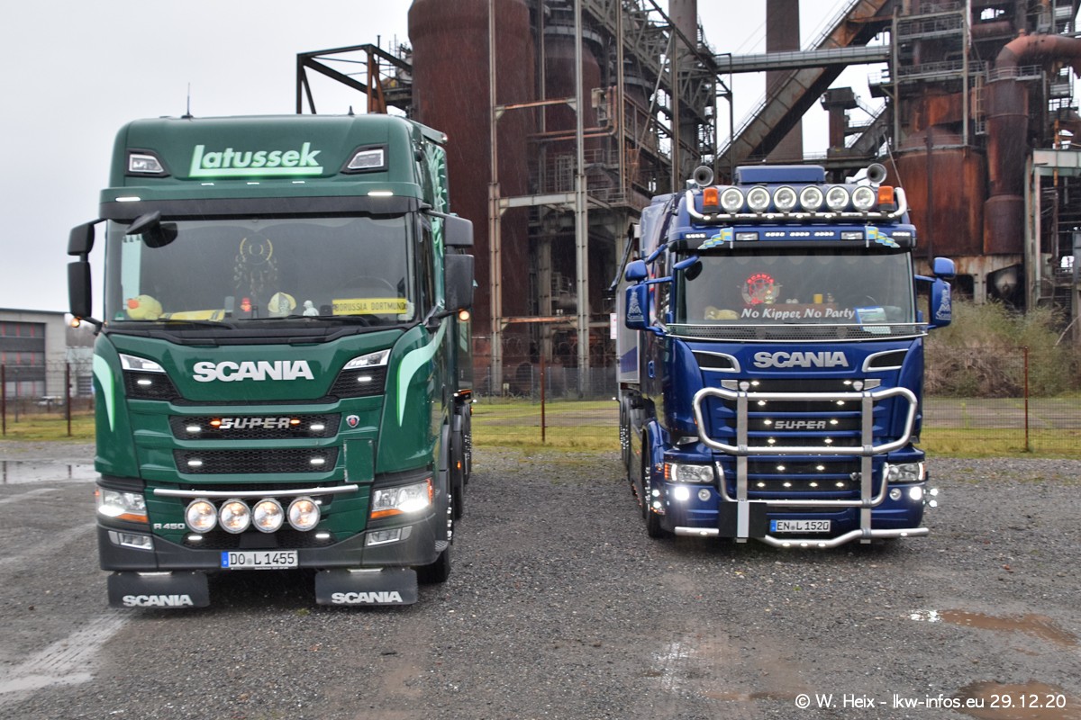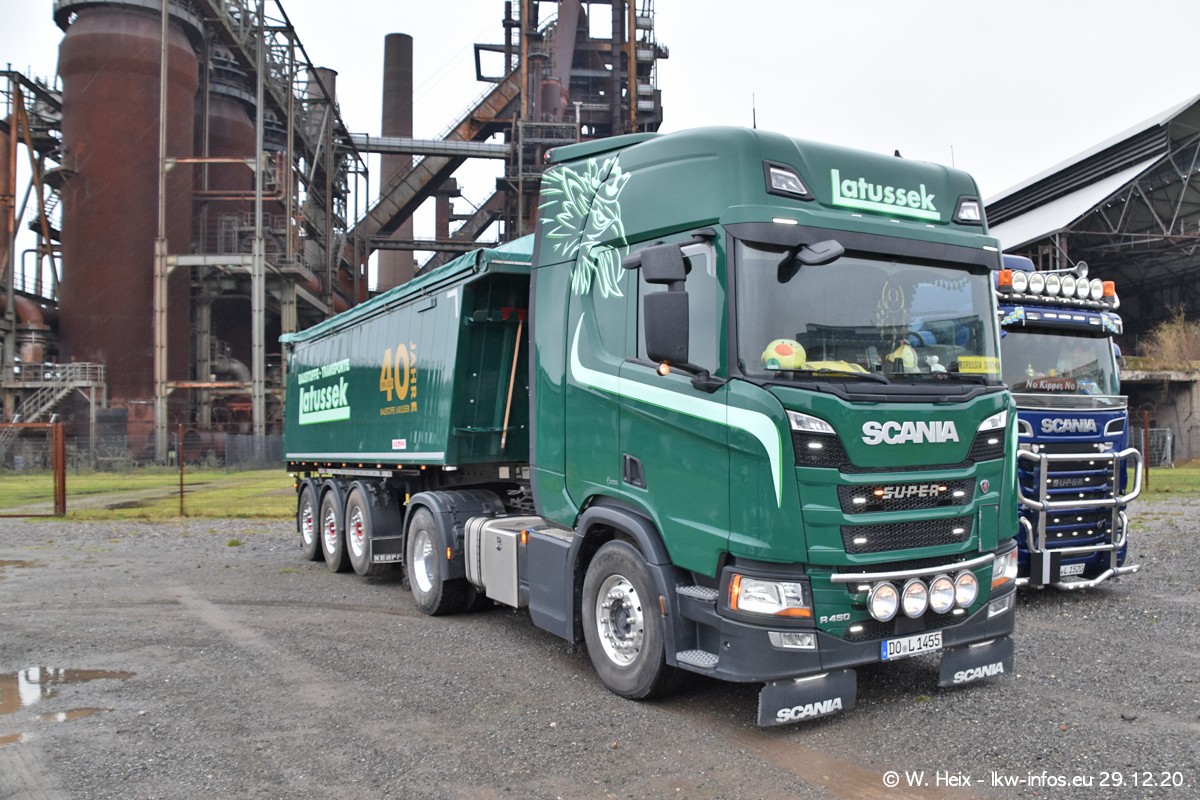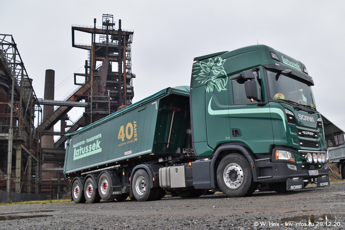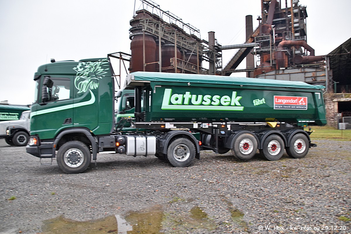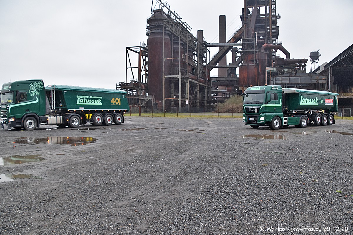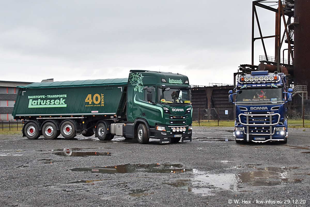 Am 29.12.2020 habe ich erstmals die Firma Latussek in Dortmund besucht. Während des Besuchs ergab sich dann spontan die Idee, im Anschluss an meinen Fotobesuch ein kleines Fotoshooting zu machen. Wir sind dann mit 5 LKW zum ehemaligen Hoesch-Gelände in Dortmund gefahren, das in der Nähe der B54 liegt. Die alte "Industrie-Ruine" ist ein toller Platz für Fotos. Mit dabei waren der graue SCANIA L 110 Kipper (Baujahr 1973, 305 PS), der MAN TGX Euro 6, der blaue SCANIA R 520 V8 Streamline, ein SCANIA R 450 XT NextGen 4x4 und ein SCANIA R 450 NextGen 4x2. Leider begann es während meiner Fotoarbeiten zu regnen sonst wären noch schönere Fotos möglich gewesen. Aber für Anfang 2021 ist schon ein weiteres Fotoshooting geplant, dann mit weiteren neuen LKW aus dem sehenswerten Fuhrpark.