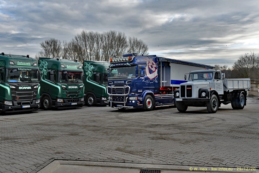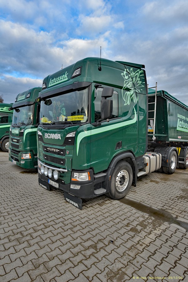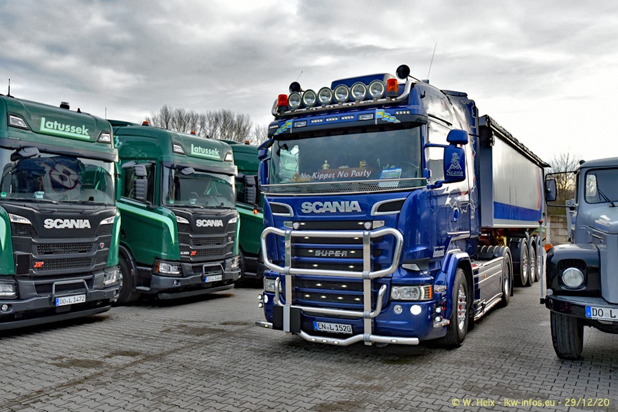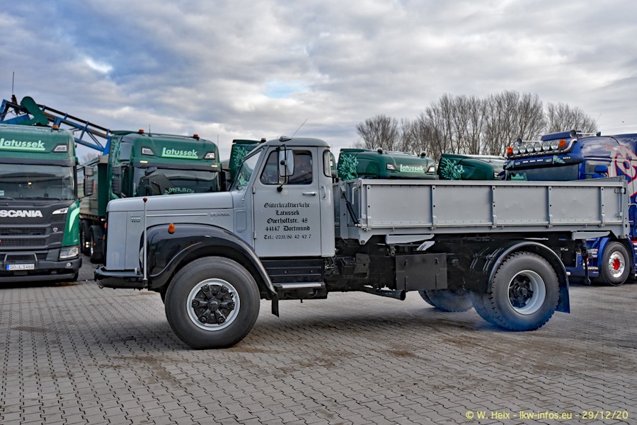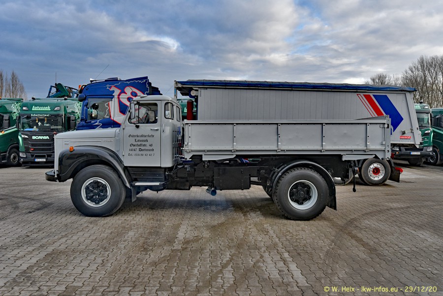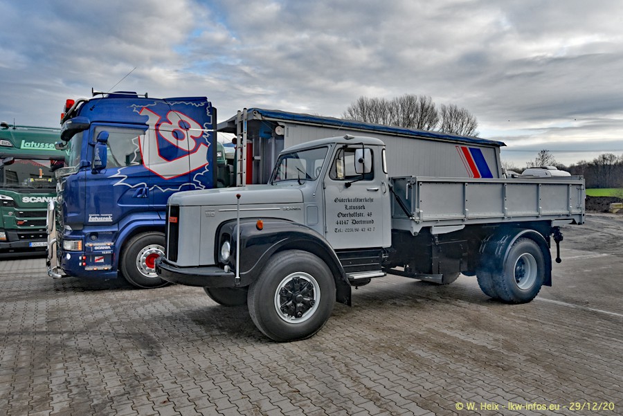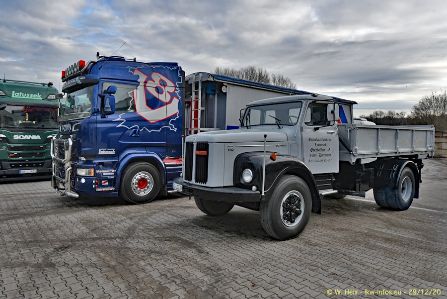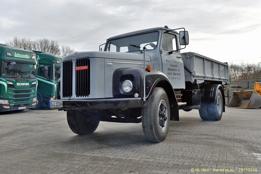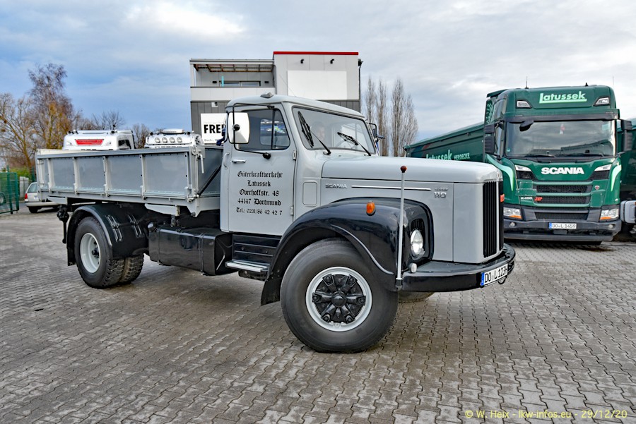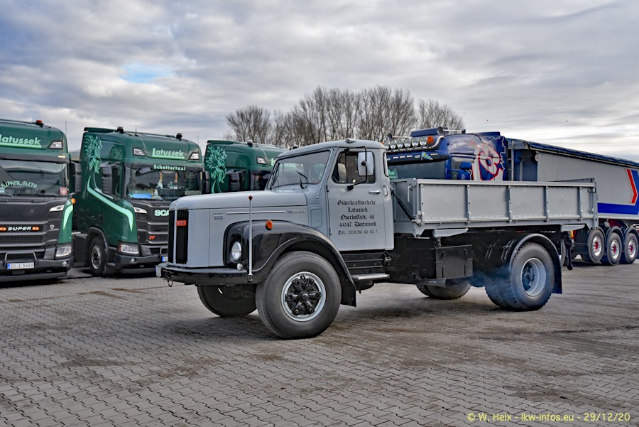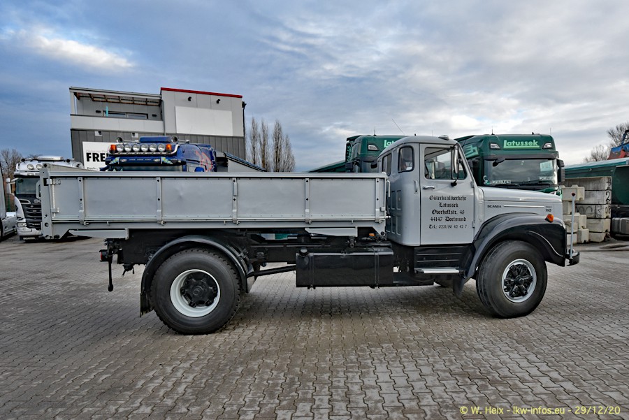Dies war mein erster Besuch bei der Firma Latussek in Dortmund. Der Fuhrpark besteht aus ca. 30 LKW. Das sind IVECO, MAN, SCANIA und VOLVO, wobei der größte Teil Fahrzeuge von SCANIA ist. Der blaue SCANIA R 520 V8 Streamline gehört auch zum Fuhrpark und es gibt noch den schönen SCANIA L 110 Oldtimer, der für den Fotobesuch extra aus der Garage geholt wurde. Der LKW ist von 1973, hat 305 PS und ist in einem guten Zustand, die Restaurierung ist schon über 15 Jahre her. Bei Latussek ist es wie bei vielen Firmen: Nur Weihnachten bzw. zwischen den Feiertagen sind so gut wie alle LKW zuhause. Zwei fehlten, weil diese im Einsatz waren.
