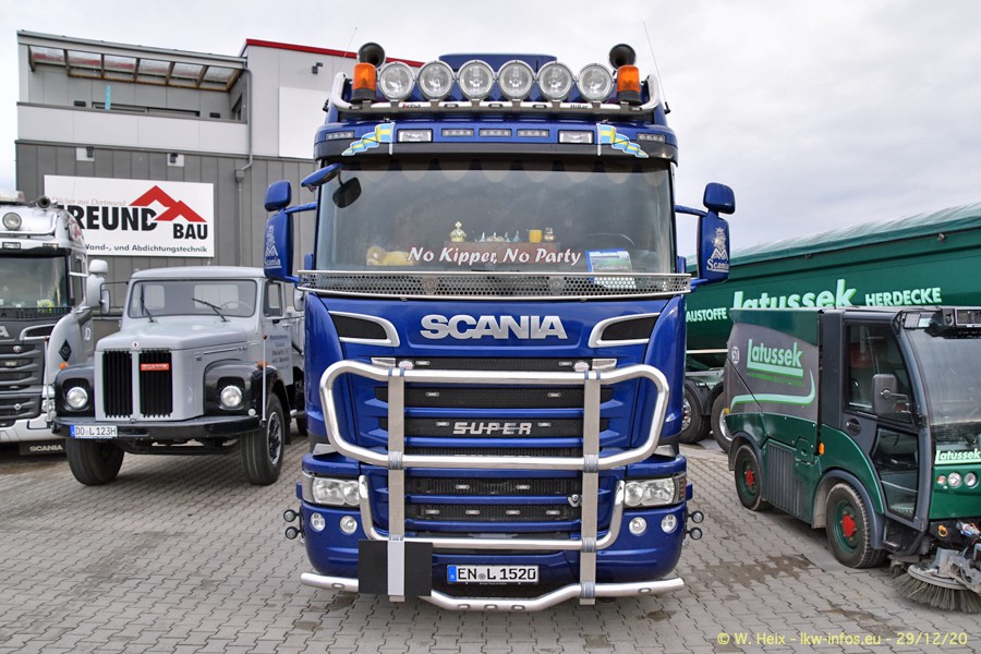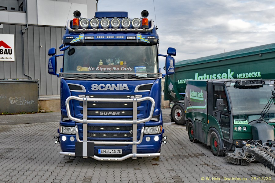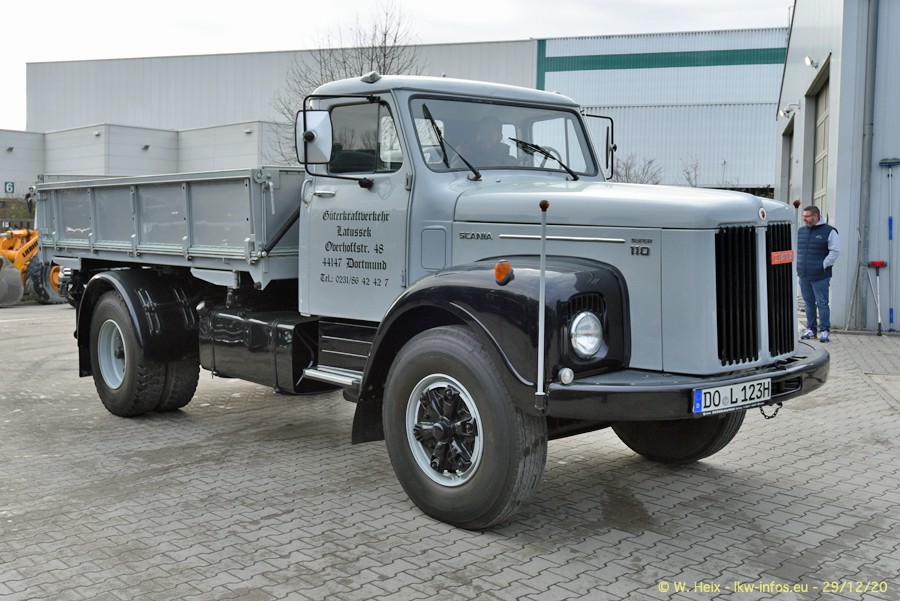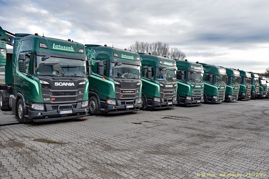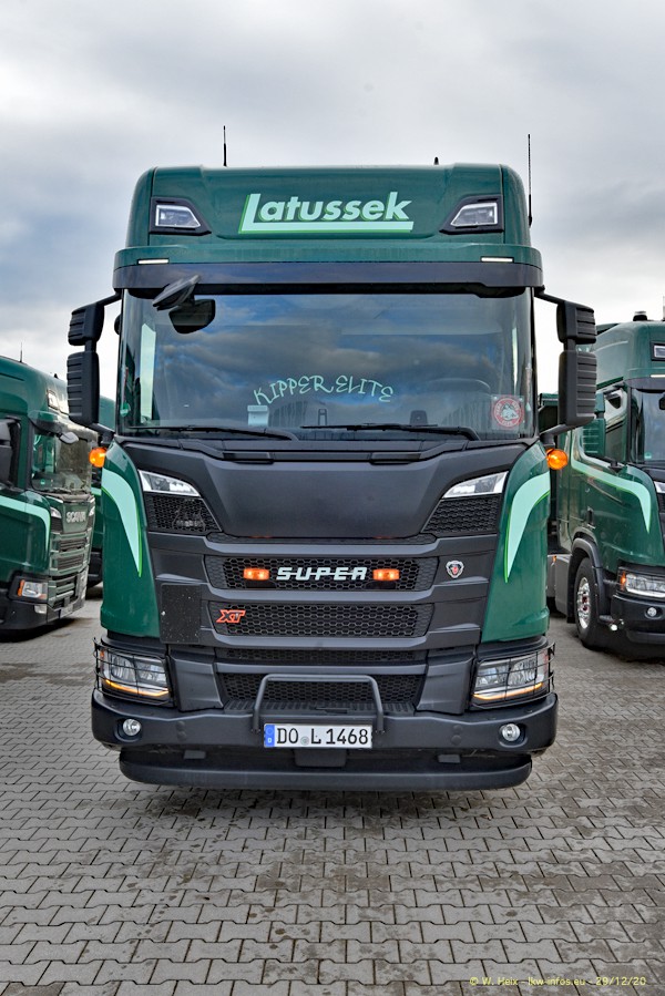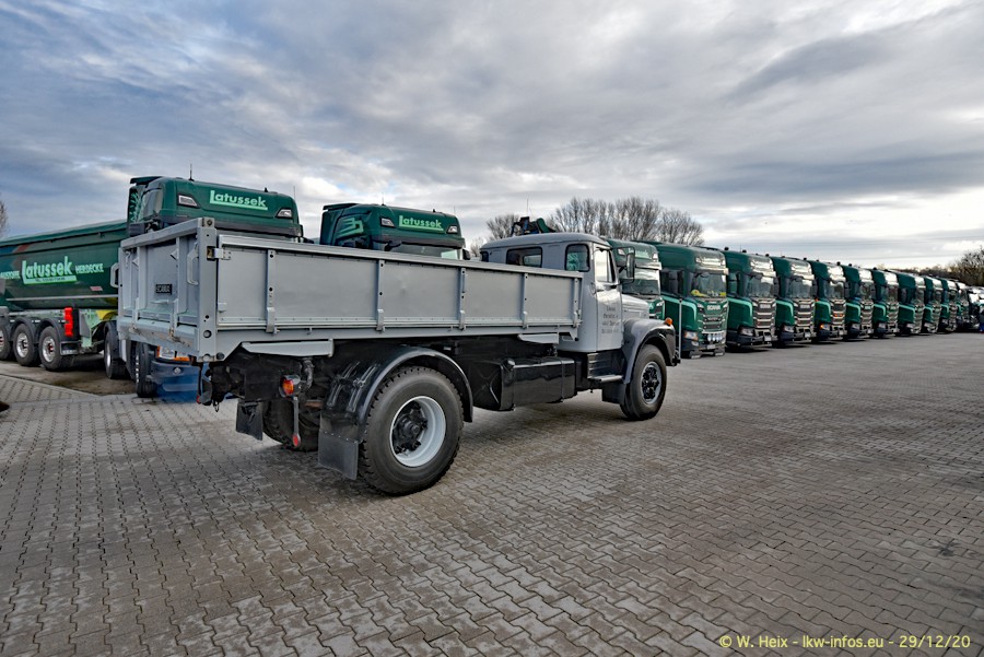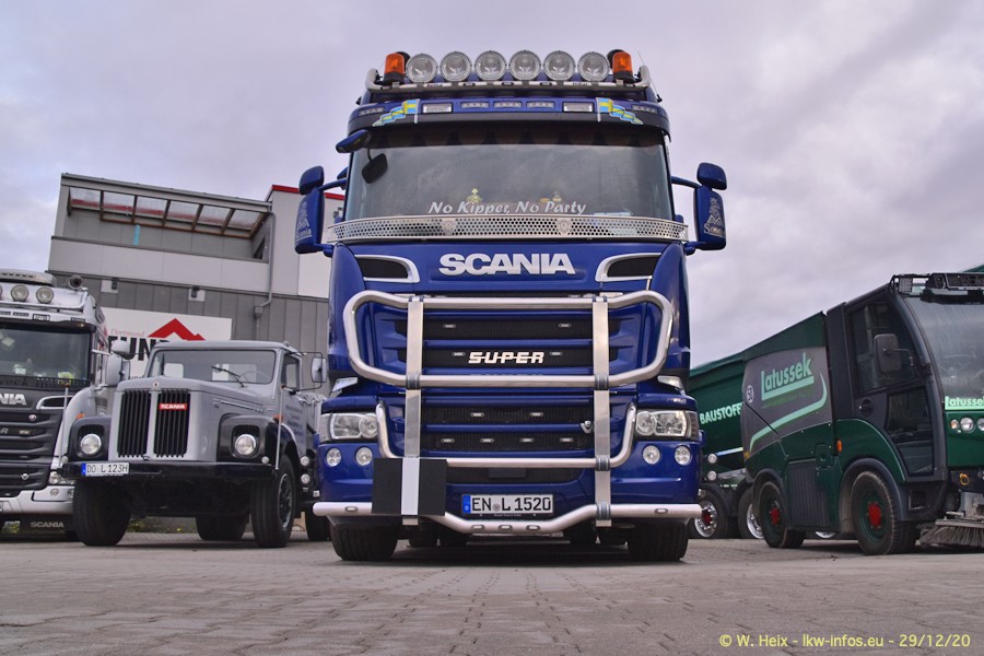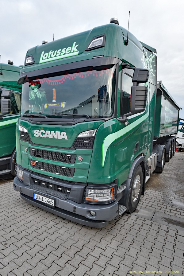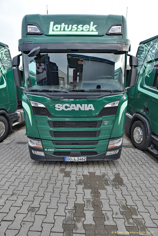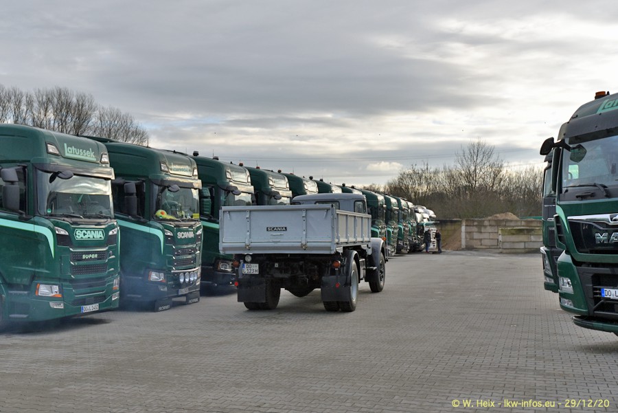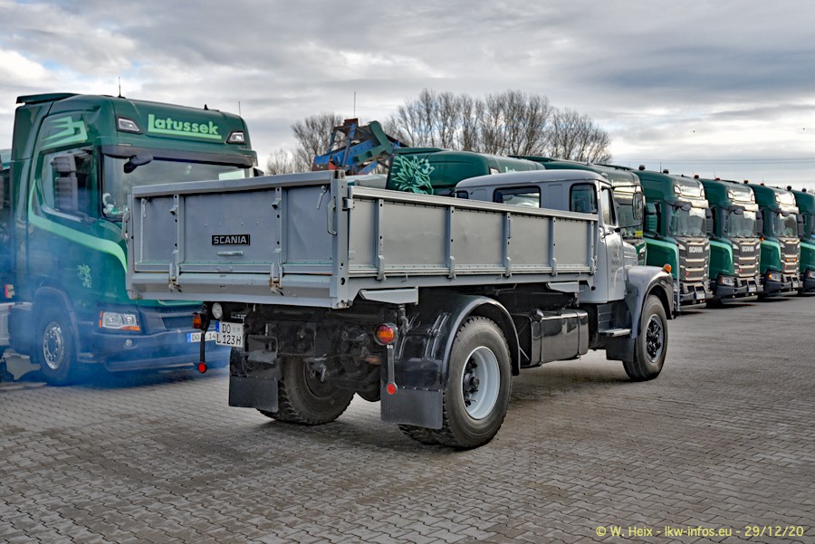 Dies war mein erster Besuch bei der Firma Latussek in Dortmund. Der Fuhrpark besteht aus ca. 30 LKW. Das sind IVECO, MAN, SCANIA und VOLVO, wobei der größte Teil Fahrzeuge von SCANIA ist. Der blaue SCANIA R 520 V8 Streamline gehört auch zum Fuhrpark und es gibt noch den schönen SCANIA L 110 Oldtimer, der für den Fotobesuch extra aus der Garage geholt wurde. Der LKW ist von 1973, hat 305 PS und ist in einem guten Zustand, die Restaurierung ist schon über 15 Jahre her. Bei Latussek ist es wie bei vielen Firmen: Nur Weihnachten bzw. zwischen den Feiertagen sind so gut wie alle LKW zuhause. Zwei fehlten, weil diese im Einsatz waren.