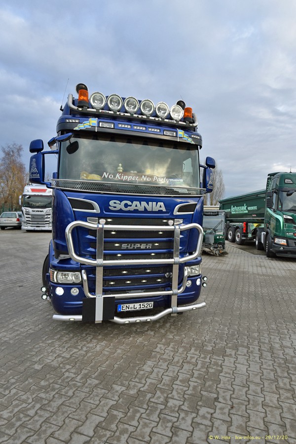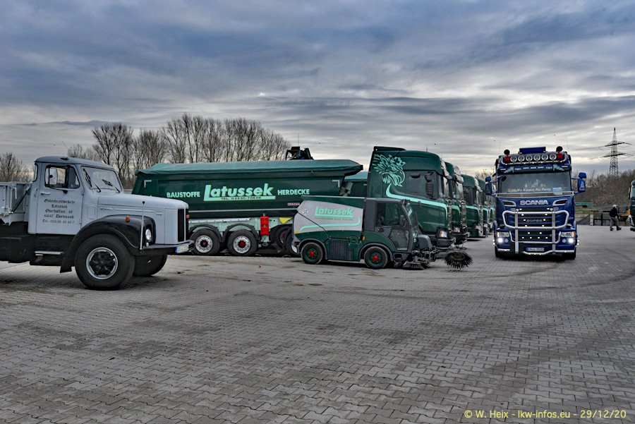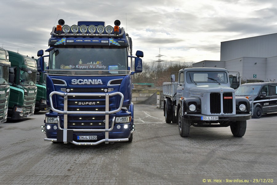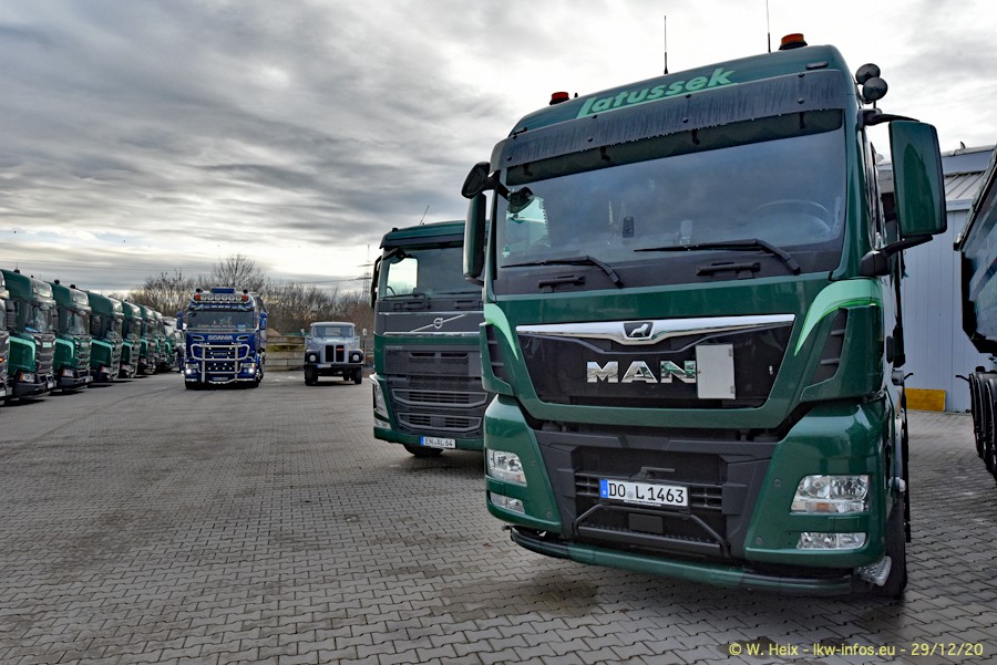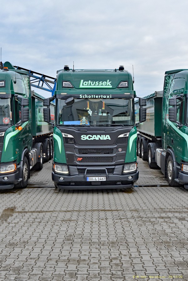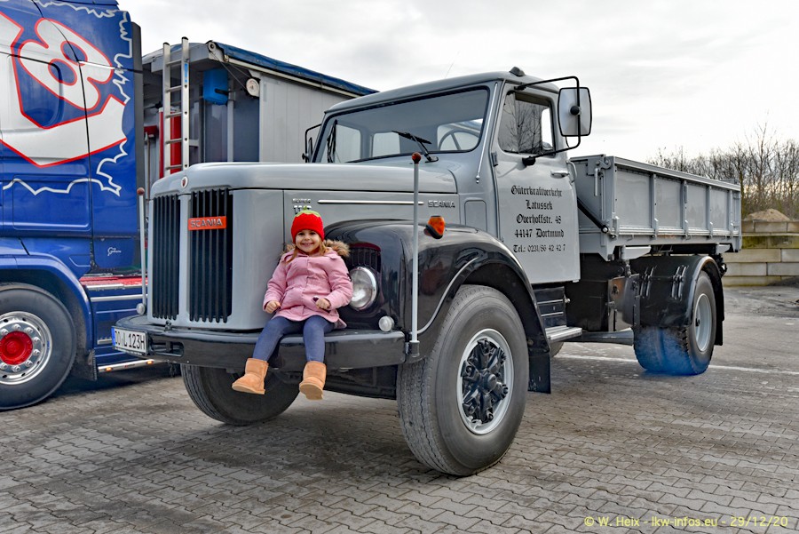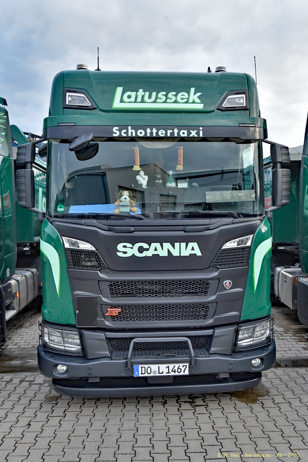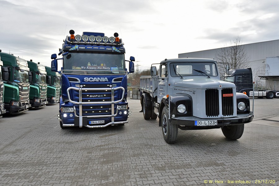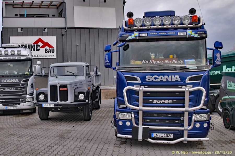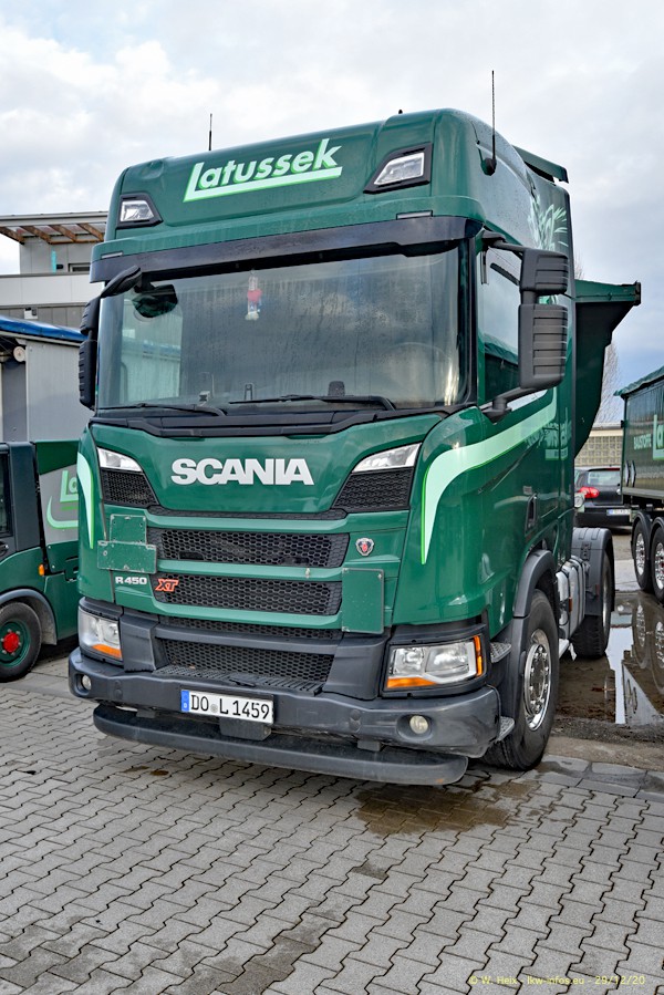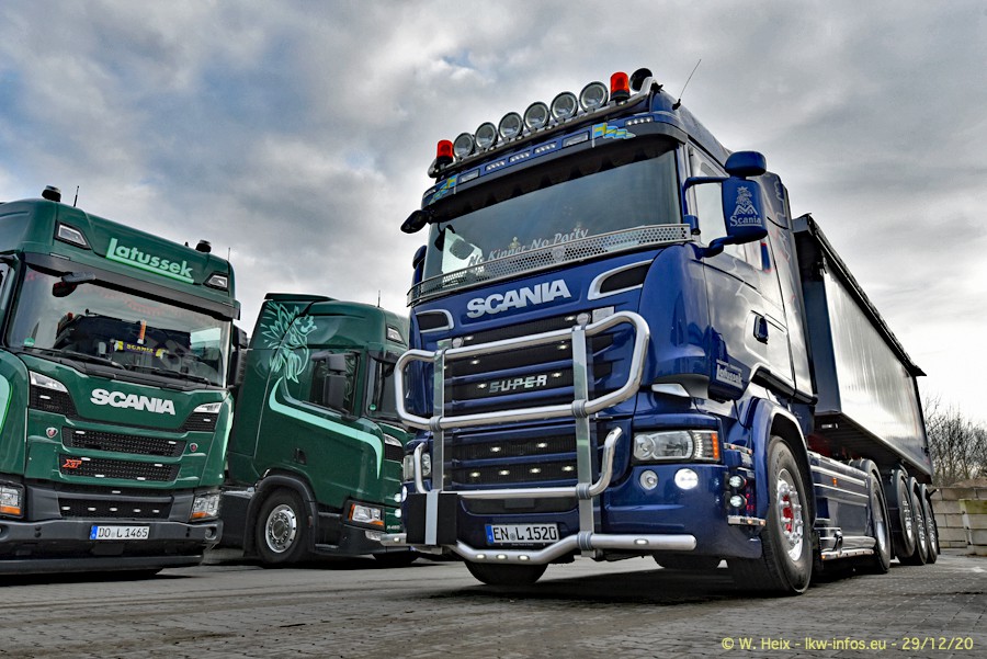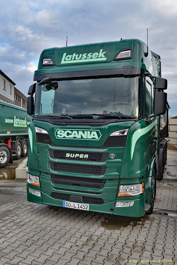 Dies war mein erster Besuch bei der Firma Latussek in Dortmund. Der Fuhrpark besteht aus ca. 30 LKW. Das sind IVECO, MAN, SCANIA und VOLVO, wobei der größte Teil Fahrzeuge von SCANIA ist. Der blaue SCANIA R 520 V8 Streamline gehört auch zum Fuhrpark und es gibt noch den schönen SCANIA L 110 Oldtimer, der für den Fotobesuch extra aus der Garage geholt wurde. Der LKW ist von 1973, hat 305 PS und ist in einem guten Zustand, die Restaurierung ist schon über 15 Jahre her. Bei Latussek ist es wie bei vielen Firmen: Nur Weihnachten bzw. zwischen den Feiertagen sind so gut wie alle LKW zuhause. Zwei fehlten, weil diese im Einsatz waren.