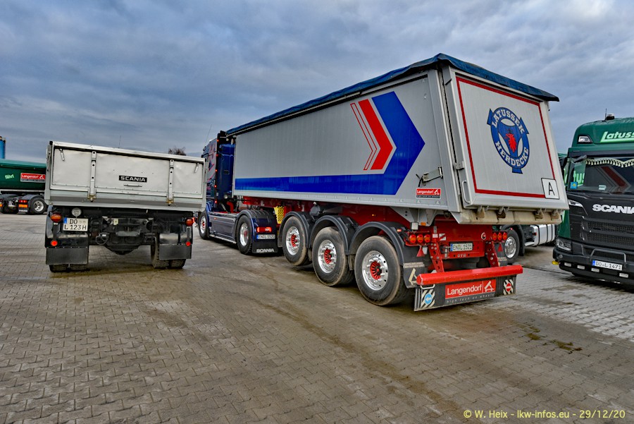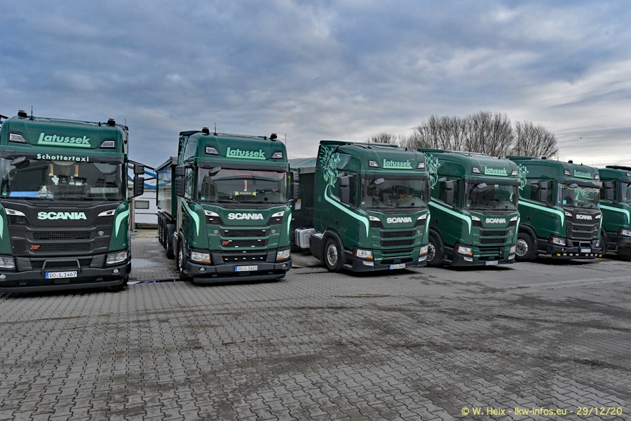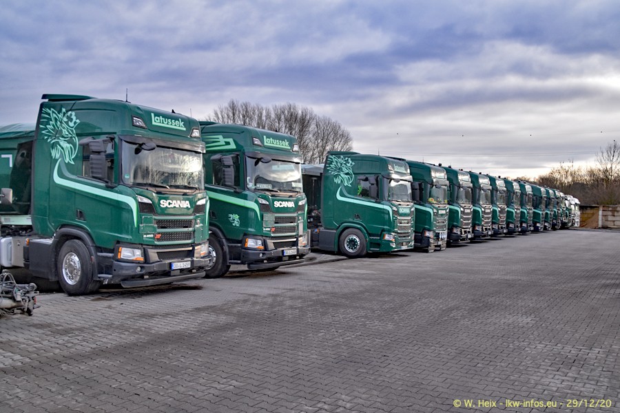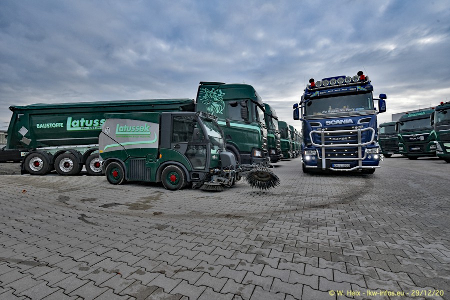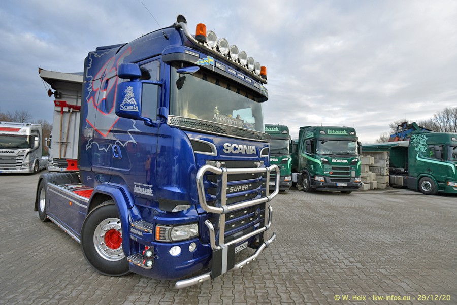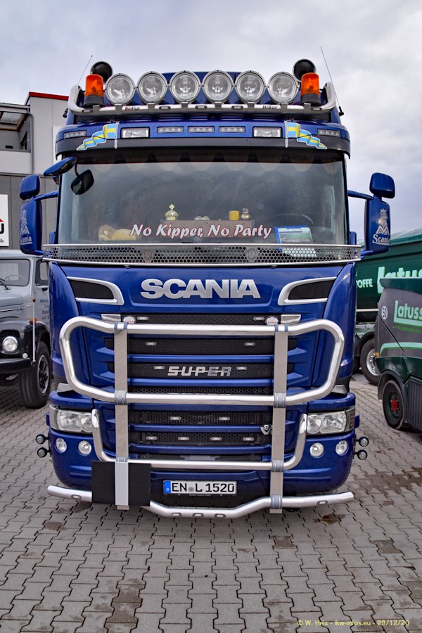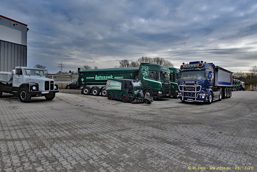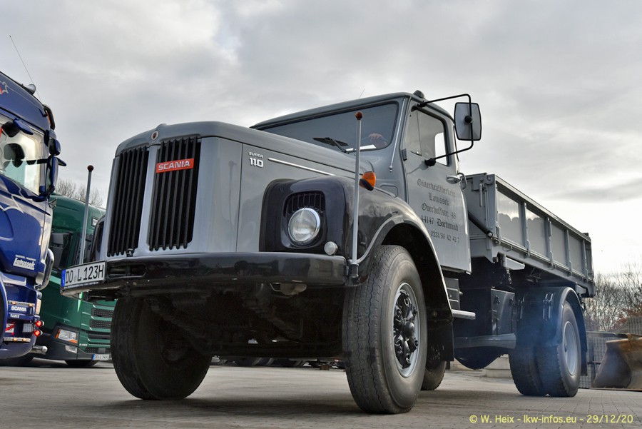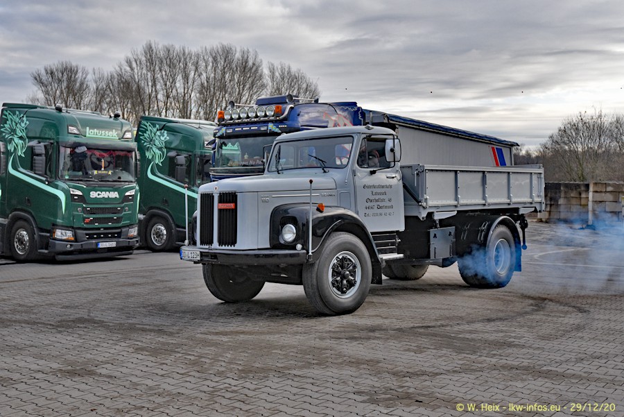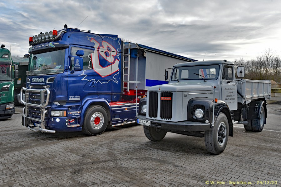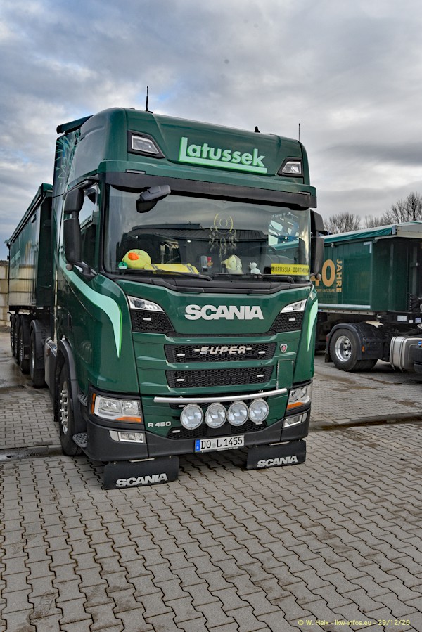 Dies war mein erster Besuch bei der Firma Latussek in Dortmund. Der Fuhrpark besteht aus ca. 30 LKW. Das sind IVECO, MAN, SCANIA und VOLVO, wobei der größte Teil Fahrzeuge von SCANIA ist. Der blaue SCANIA R 520 V8 Streamline gehört auch zum Fuhrpark und es gibt noch den schönen SCANIA L 110 Oldtimer, der für den Fotobesuch extra aus der Garage geholt wurde. Der LKW ist von 1973, hat 305 PS und ist in einem guten Zustand, die Restaurierung ist schon über 15 Jahre her. Bei Latussek ist es wie bei vielen Firmen: Nur Weihnachten bzw. zwischen den Feiertagen sind so gut wie alle LKW zuhause. Zwei fehlten, weil diese im Einsatz waren.