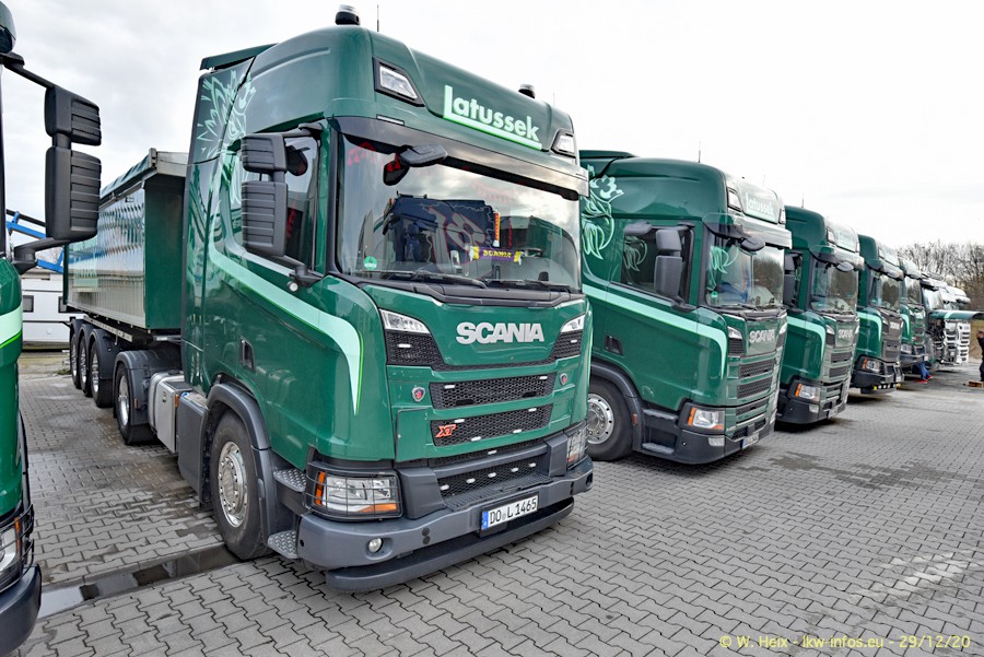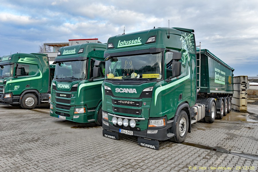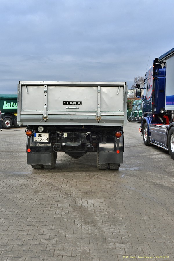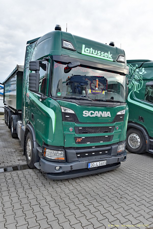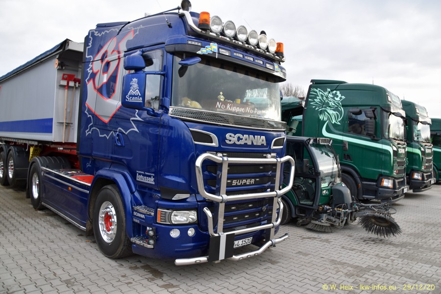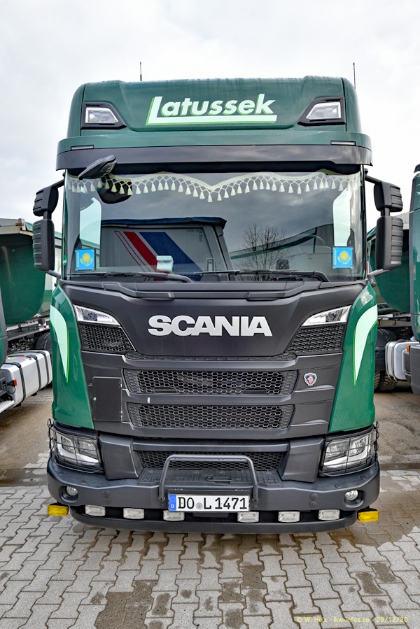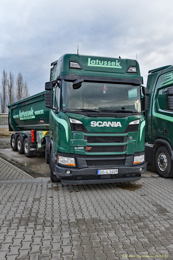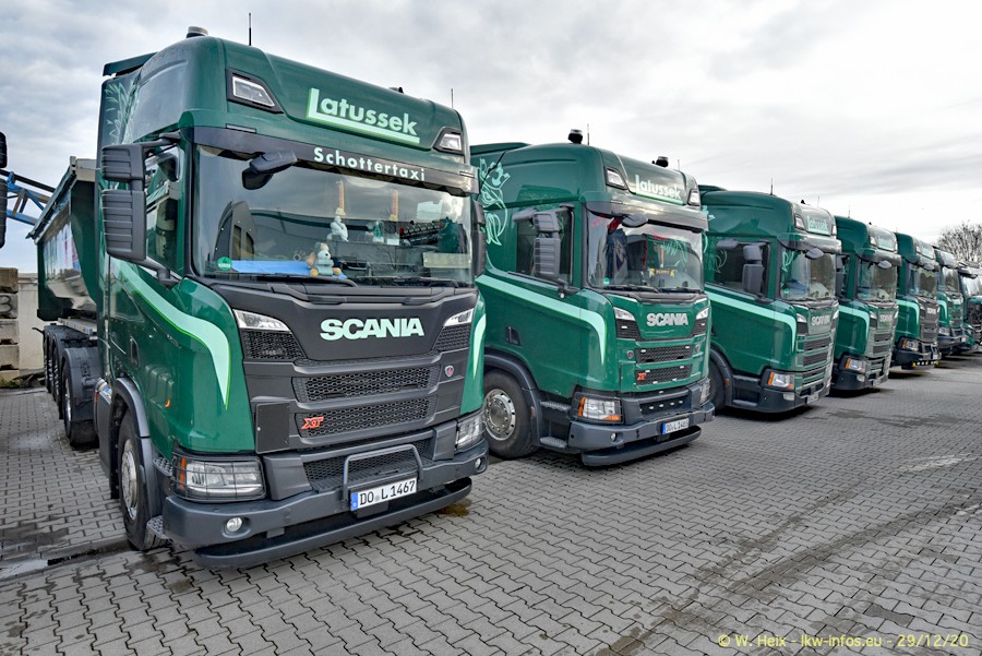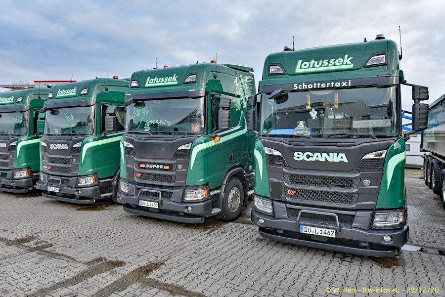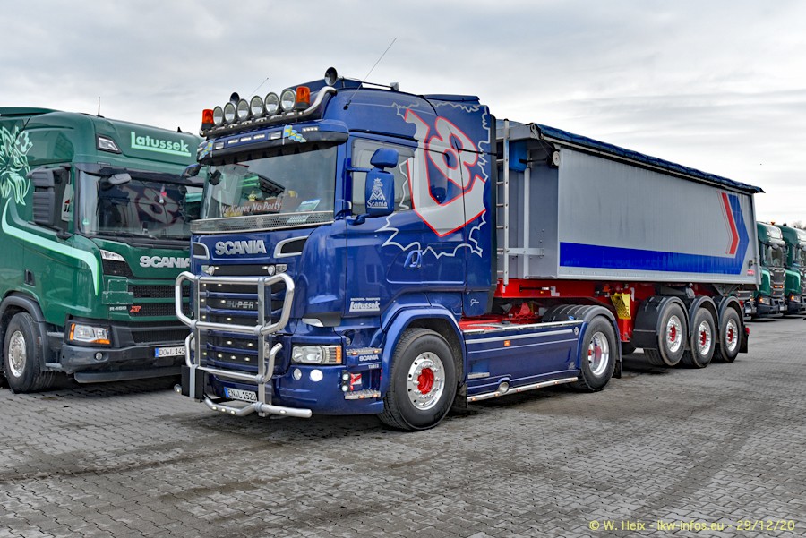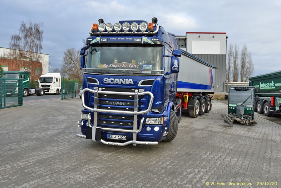Dies war mein erster Besuch bei der Firma Latussek in Dortmund. Der Fuhrpark besteht aus ca. 30 LKW. Das sind IVECO, MAN, SCANIA und VOLVO, wobei der größte Teil Fahrzeuge von SCANIA ist. Der blaue SCANIA R 520 V8 Streamline gehört auch zum Fuhrpark und es gibt noch den schönen SCANIA L 110 Oldtimer, der für den Fotobesuch extra aus der Garage geholt wurde. Der LKW ist von 1973, hat 305 PS und ist in einem guten Zustand, die Restaurierung ist schon über 15 Jahre her. Bei Latussek ist es wie bei vielen Firmen: Nur Weihnachten bzw. zwischen den Feiertagen sind so gut wie alle LKW zuhause. Zwei fehlten, weil diese im Einsatz waren.